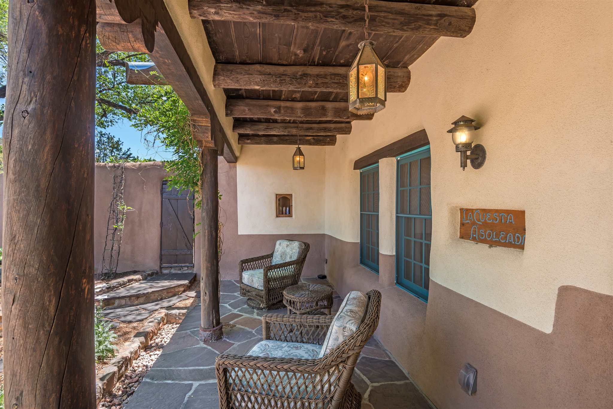 John Gaw Meem's Sunny Slope House, CASA de CUESTA ASOLEADA, on 2.58 acres w/ beautiful views is a rare opportunity to experience fully updated Pueblo Revival architecture. Courtyard w/ fabulous portal takes advantage of southern exposure & has views of Sun & Moon Mts. Originally designed & built for Ed Tatum in 1939 by Meem, faithfully restored & sensitively updated in 2014 by Doug McDowell, this historic home includes archive of original plans, sketches, invoices, & letters between Meem & Tatum. True SF style & tradition, from reproductions of original tin fixtures to rebuilding original fireplace design discovered in archives. Adobe walls made w/ mud bricks created by hand onsite, doors reproduced by local craftsmen from original drawings, interior & exterior hardware salvaged & restored. Unassuming appeal, complete privacy, 2 legal lots on Tatum Lane off Old SF Trail just moments from the Plaza. Master bedroom w/ fireplace, luxurious bath, private portal & courtyard. 2nd bedroom adjoins seating area w/ fireplace & portal. Cozy functional kitchen has portal with great Jemez Mt. views. Lots of natural light enters through beautiful divided-light windows. Office/den w/ fireplace & access to portal. Solar electric array. Courtyard w/ antique millstone water fountain & gas fire pit has full kitchen w/ gas BBQ, wood/charcoal grill, range, oven, refrigerator & dishwasher. Plans for guest house & home on 2nd lot. Amazing historic provenance in great comfort create a perfect oasis!