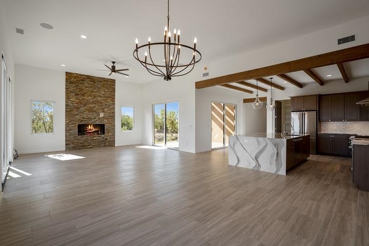 We Have Broken Ground! Right on the Sunset Golf Course Valverde's Sunrise Contemporary floor plan, Elevation A, has 2,732 SF, and is designed for comfort and easy livability. This single-level home has three bedrooms, 3 bathrooms and an open living space. The gourmet kitchen includes solid wood cabinets, stainless-steel Viking appliances, quartz countertops, a huge pantry, and opens to the dining area and great room with 12-foot ceilings, and a low-profile gas fireplace with stone surround. A courtyard connects to the kitchen and great room for outdoor dining. A third portal captures the mountain views. The large master suite has a portal, master bathroom with curbless, walk-in shower, soaking tub, dual sinks, and walk-in closet. The guest bedrooms are on the opposite side of the home, each with their own bathroom. The large two-car garage has plenty of storage. Choose your interior finishes, color choices and other options. A low-maintenance landscape package is included and can be expanded with water features, fire pit, outdoor kitchen/BBQ. HOA fees include road and common area maintenance, 24-hour roaming security, and 24-hour EMTs on site. Membership to The Club at Las Campanas is optional. Amenities include indoor and outdoor swimming, tennis, fitness facility, equestrian, fine dining, and two Jack Nicklaus Signature Golf Courses. (Photos are representational only.)