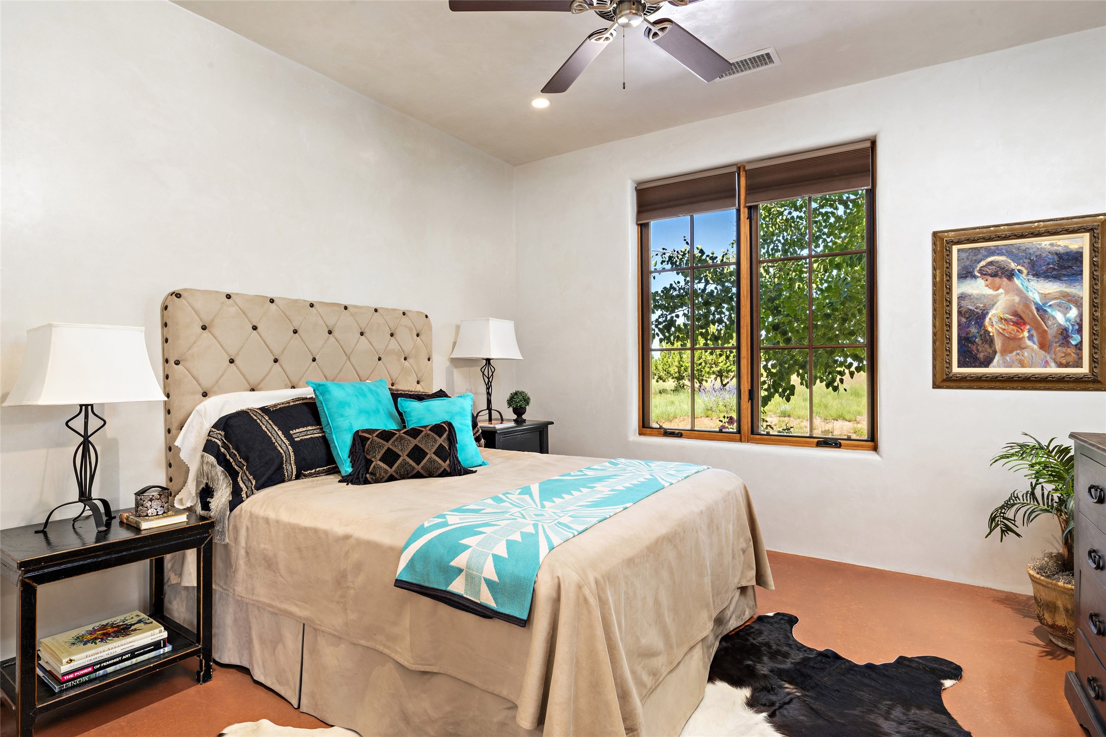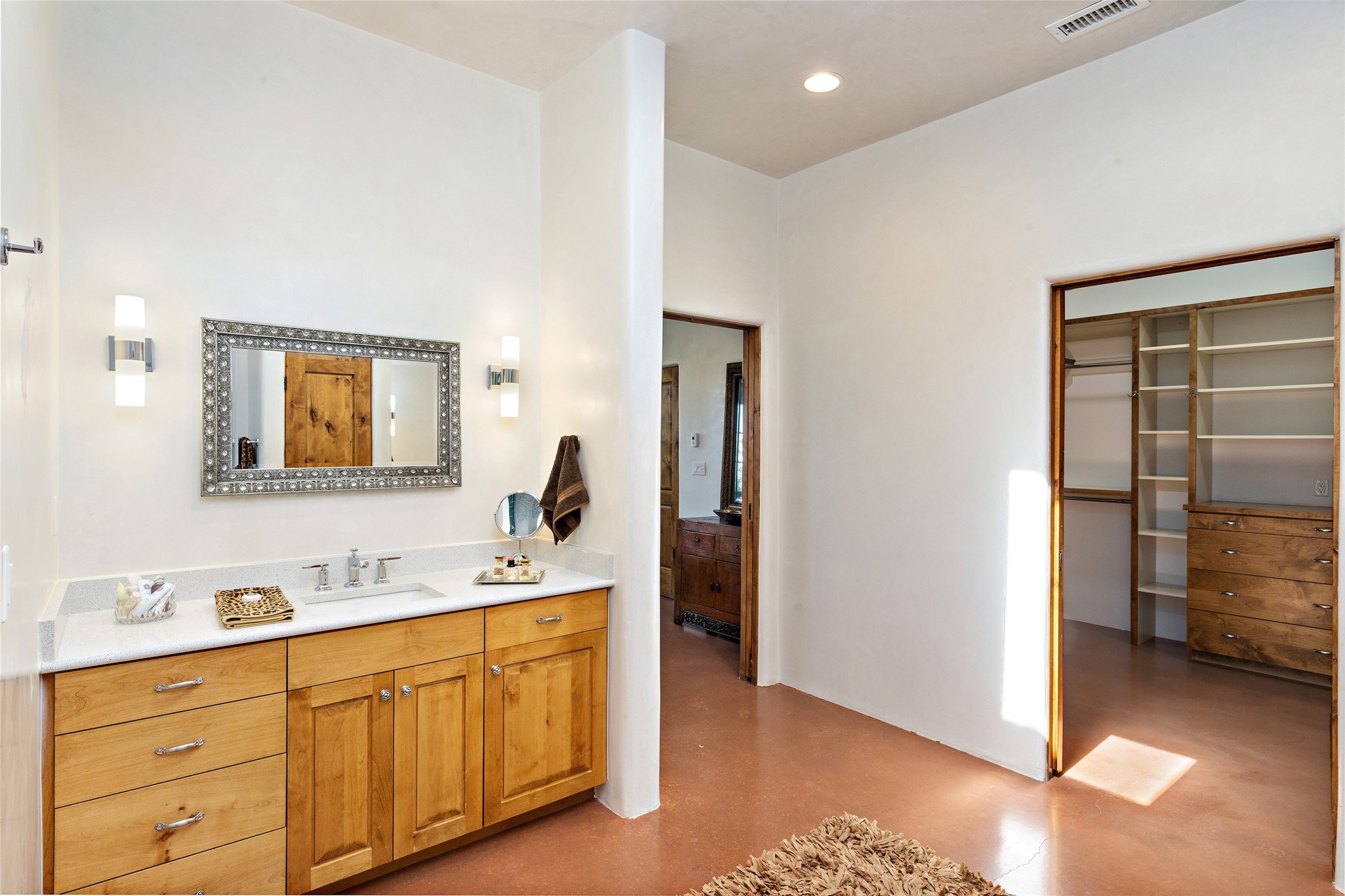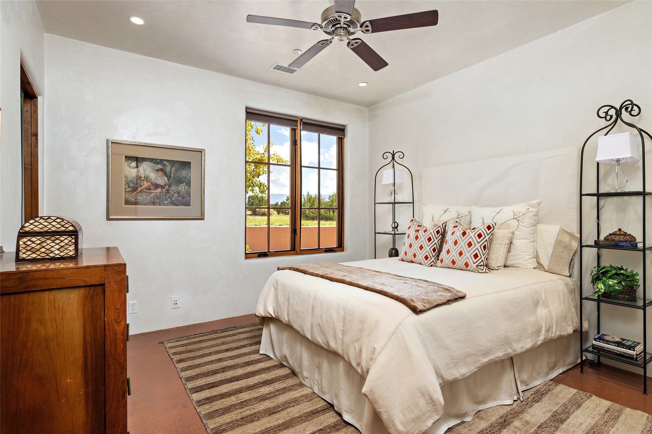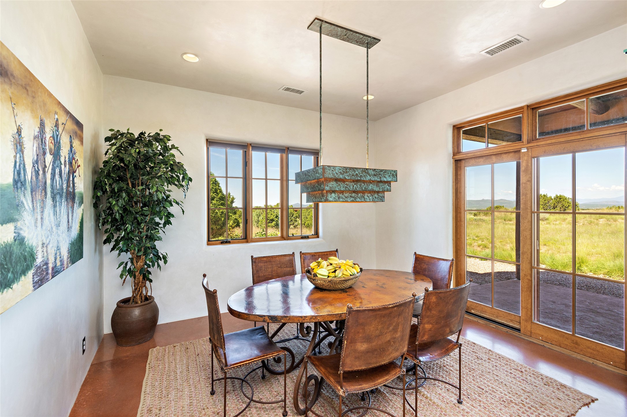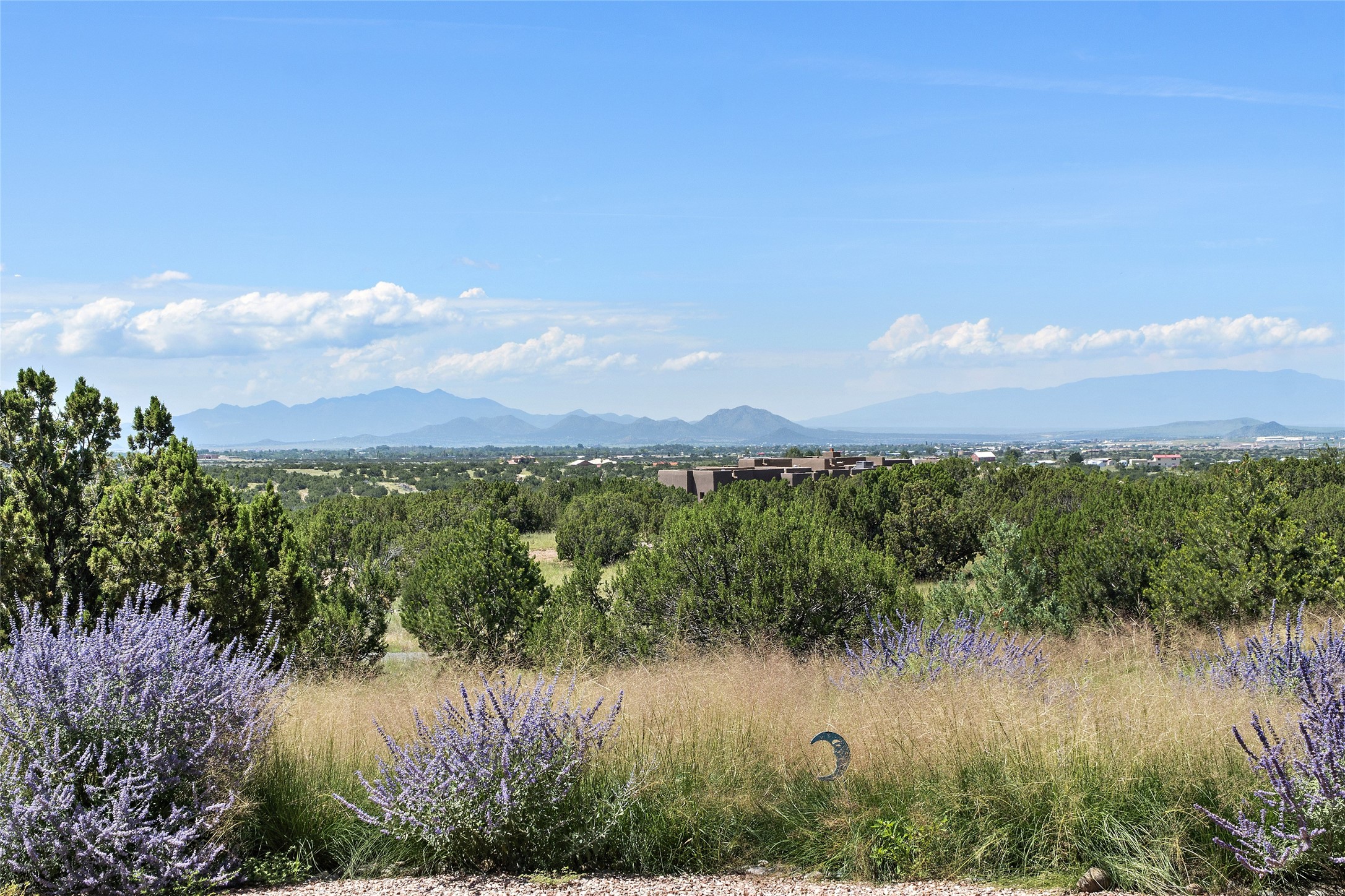 This distinctive 3B/4B Tierra Grande property enjoys sweeping mountain views in all directions with three portals to maximize the enjoyment its unique vantage point. Custom built by Anthony Odai, this home has been carefully maintained by its current owners since its completion in 2015. Clean, open-space living concepts combine with classic Santa Fe architectural details to render a home rich in style and comfort. White plaster walls, custom-built cabinets and doors, all LED lighting, and rich wood beams demonstrate assiduous attention to design detail. A generously-proportioned living room features high coved ceilings with vigas, clerestory windows and skylights over a colored concrete floor with turquoise stone highlights. Sliding doors facing southwest allow for natural light and lead to an expansive exterior covered portal with a kiva fireplace and automatic awnings. A large archway flanked by built-in shelving leads to the sizeable kitchen and dining area with painted wood cabinetry, large center island, quartz countertops, Wolf/Sub Zero appliances, skylights and sliding doors. A separate wing affords the master suite bed chamber and attached sitting room maximum privacy. A coved ceiling, vigas, turquoise bathroom tiles and kiva fire place bring many regional touches to bear upon this setting. Two guest bedrooms, each with its own ensuite bath, provide ample room for family and friends. State-of-the-art utilities are housed in over-sized two-car garage.