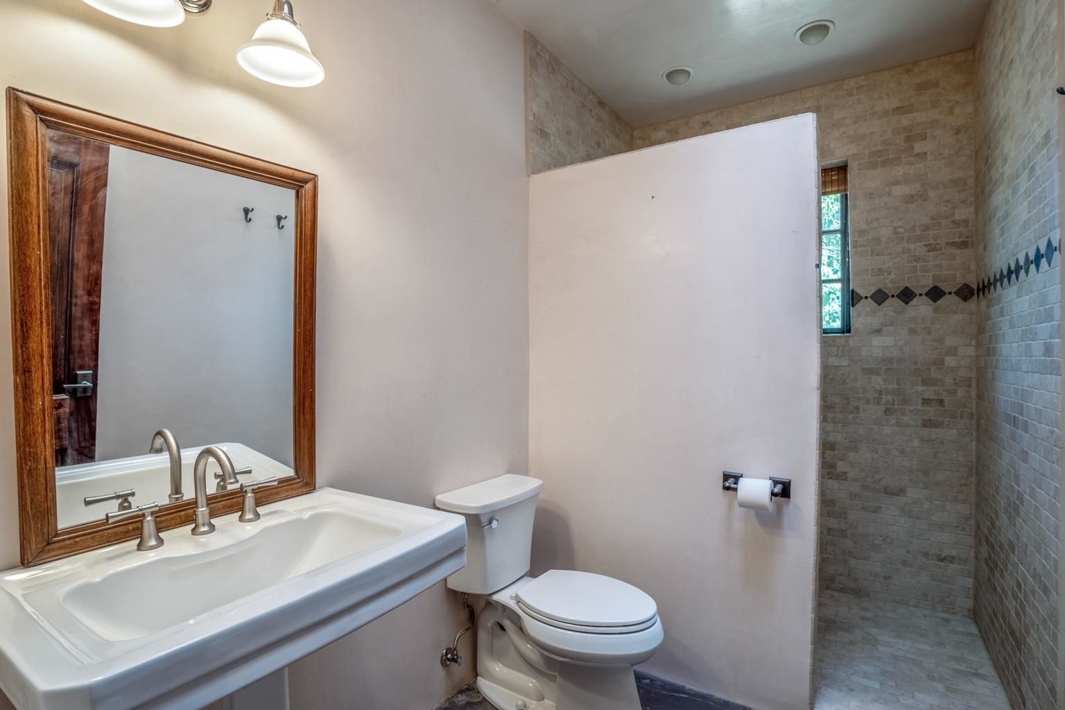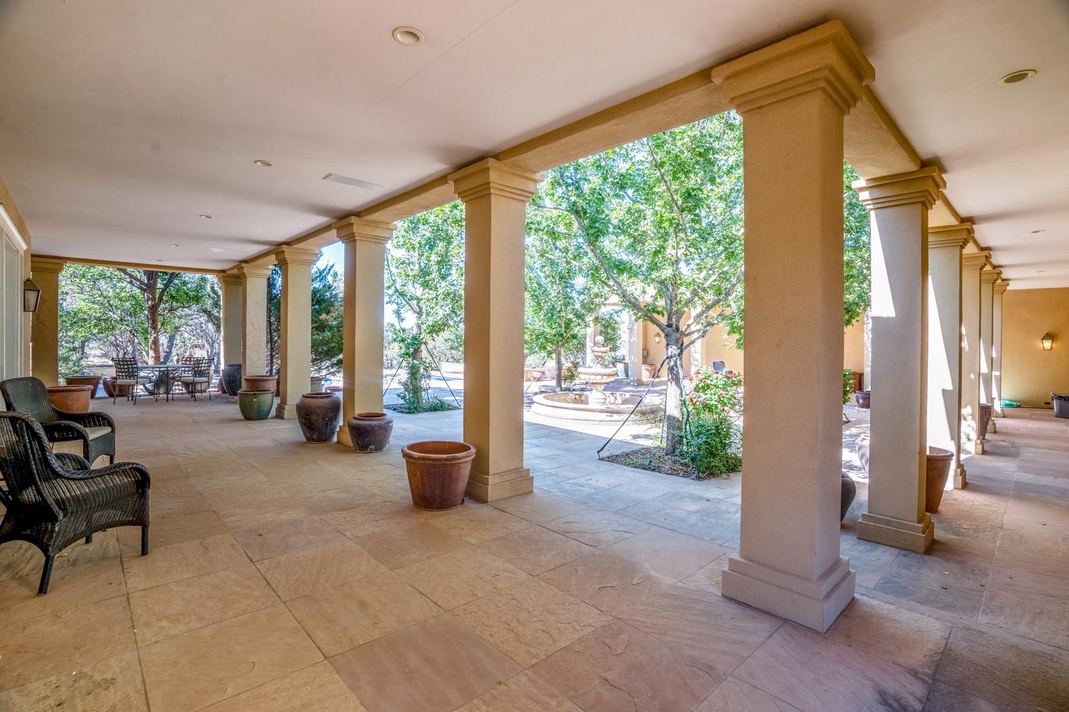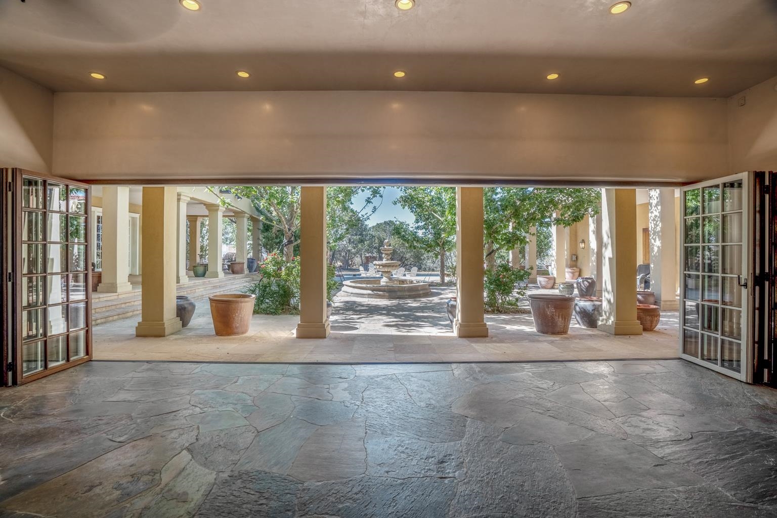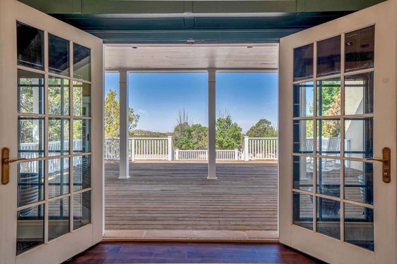 Welcome home to Casa Vistas de Apache. Nestled behind its own gated and walled entrance, This elegant and discerning home was built with only the finest materials. The art gallery entry and living areas are adorned with Mahogany wood doors and slate tile. The Den and library floors are Walnut. This home sits on ten juniper and pinon tree-covered acres consisting of two separately deeded 5-acre parcels, each with its own well, just twenty minutes south of the Historic Santa Fe Plaza. Unlike many homes of this stature in the Santa Fe area, there are no covenants, restrictions, or Hoa, meaning you can do as you wish with the land and home. This home is your own private estate behind your own gate. There are three courtyards with almost 9000 square feet of sandstone tile patio for entertaining poolside or simply enjoying the southwestern sun. The New Mexico sunset views from the library deck are indescribably vibrant and will leave you breathless. The main home features two bedrooms plus other living quarters over the garage that could be perfect for a live-in nanny, in-laws, or simply another guest space, making it a three-bedroom. The pool house, with its fold-away wall of windows to the patio, is an open floor plan primarily for entertaining but may also be used as a separate studio or living space. With something for everyone, see what living at Casa Vistas de Apache may have to offer you.