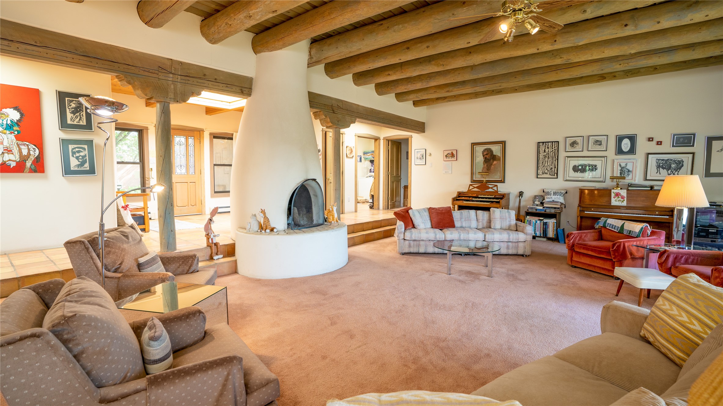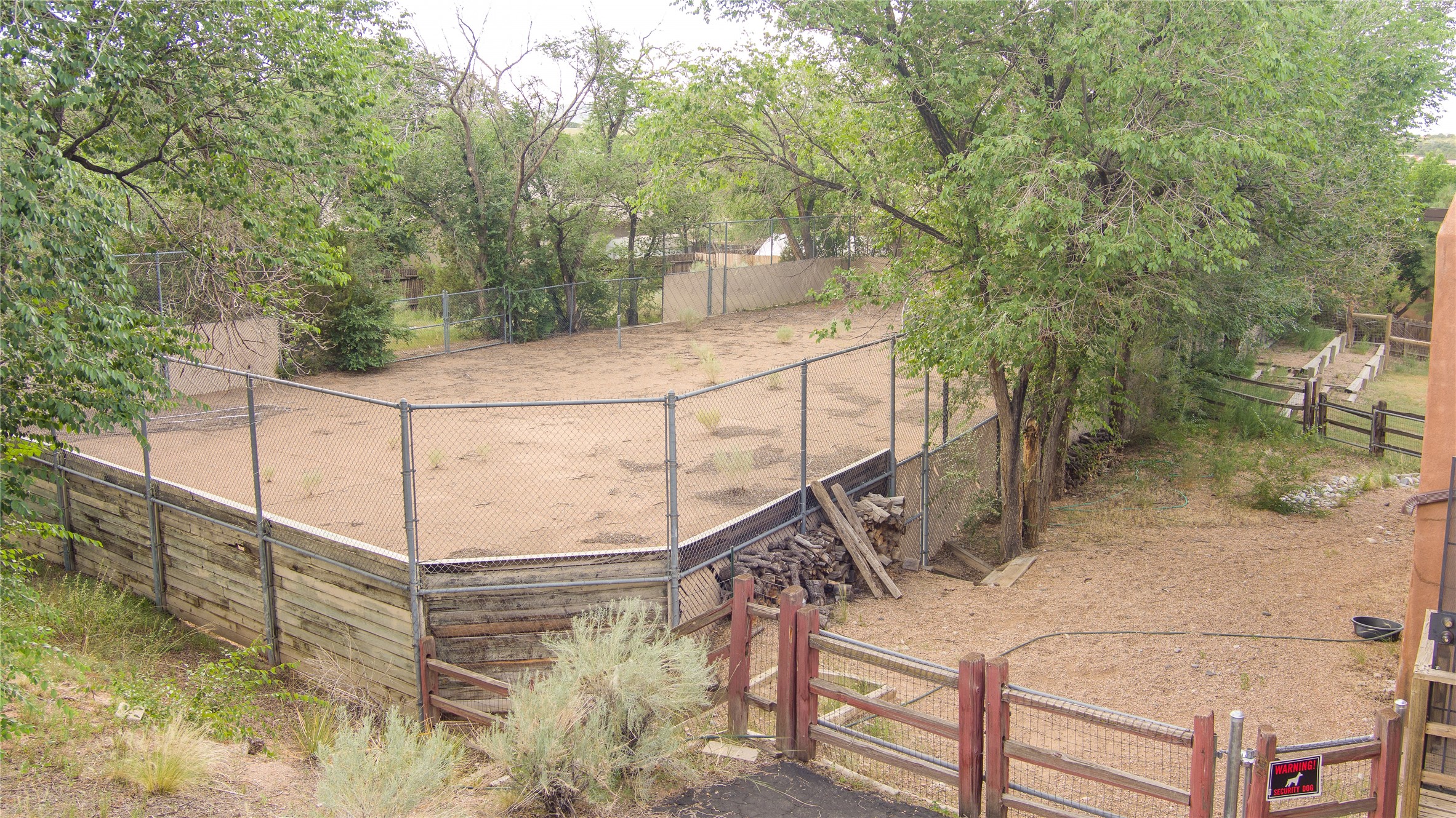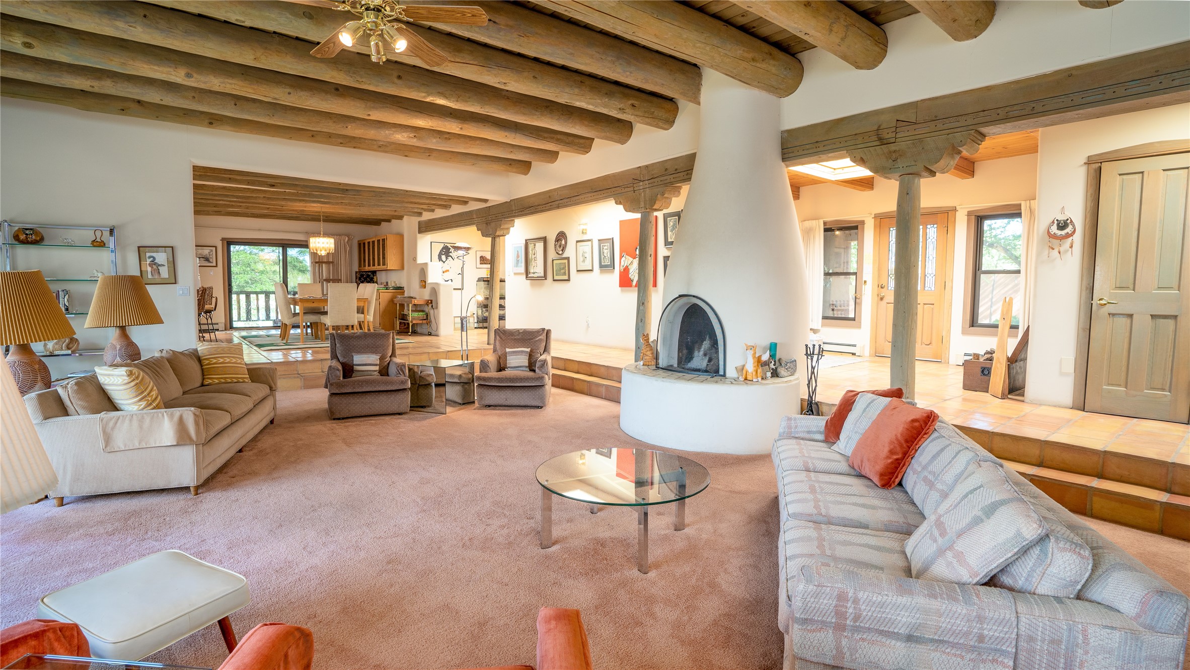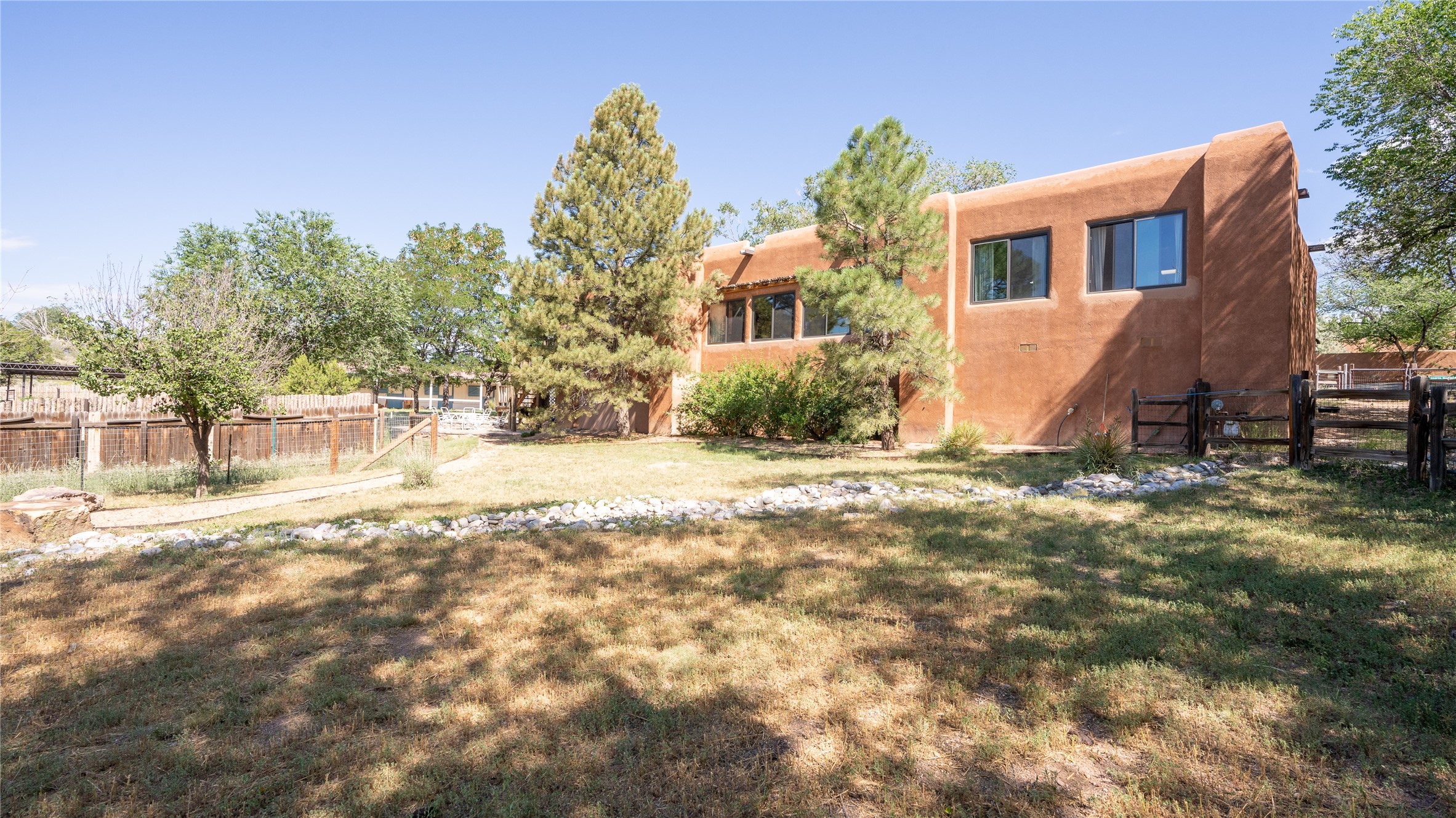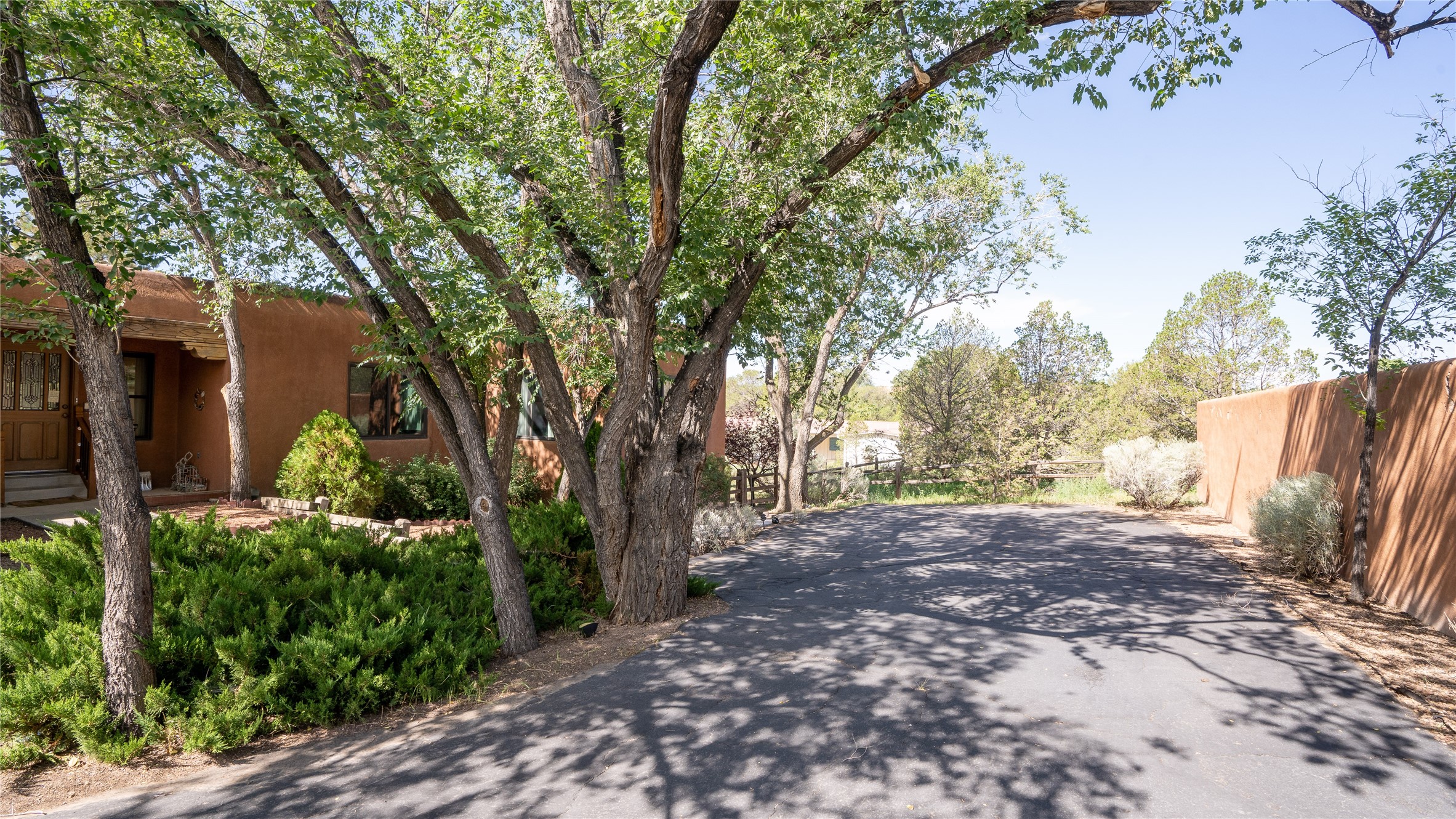 Sol Y Lomas 4 Bed/2Bath Home on 1.244 acre lot with mature trees. Large Sunken Living Room for lots of entertaining with beautiful wood burning Kiva Fireplace in the center including Vigas and Beams with T&G. Home has great separation of the primary suite from the guest rooms. Primary Suite is roomy with the ductless mini-split for your comfort along with an oversized tub, separate shower, dual sinks and large walk-in closet. At the other end of the home are the 3 bedrooms and full bath with double sinks. Kitchen includes 2 ovens with newer refrigerator, dishwasher, microwave, trash compactor and electric stove top. Dining Room has built-in buffet with Niches. The sliding glass door heads out to the patio deck and just down a few steps is the gas line for your grill. Outside is the brick patio and the outdoor water feature. The Stables now houses the trains with tracks. The approx. 1,500 sq ft stables also includes gas, electric, and a half bath with plumbing already installed for a shower. On the other side of the home was a tennis court. The 2 car garage is oversized with a tub for your pets and leads into the large laundry room. Minutes to Downtown Santa Fe, hospital, shopping, and I-25.