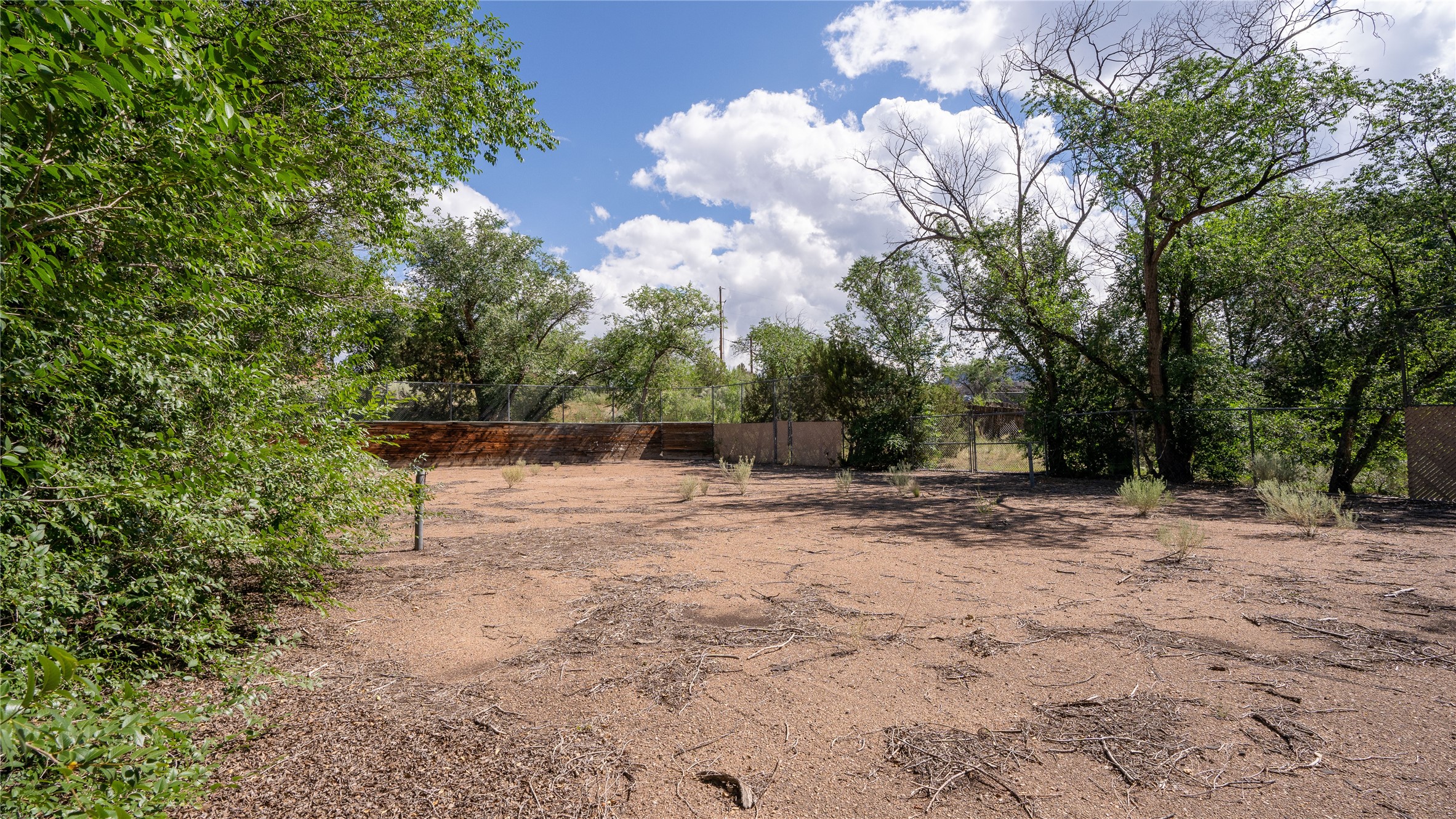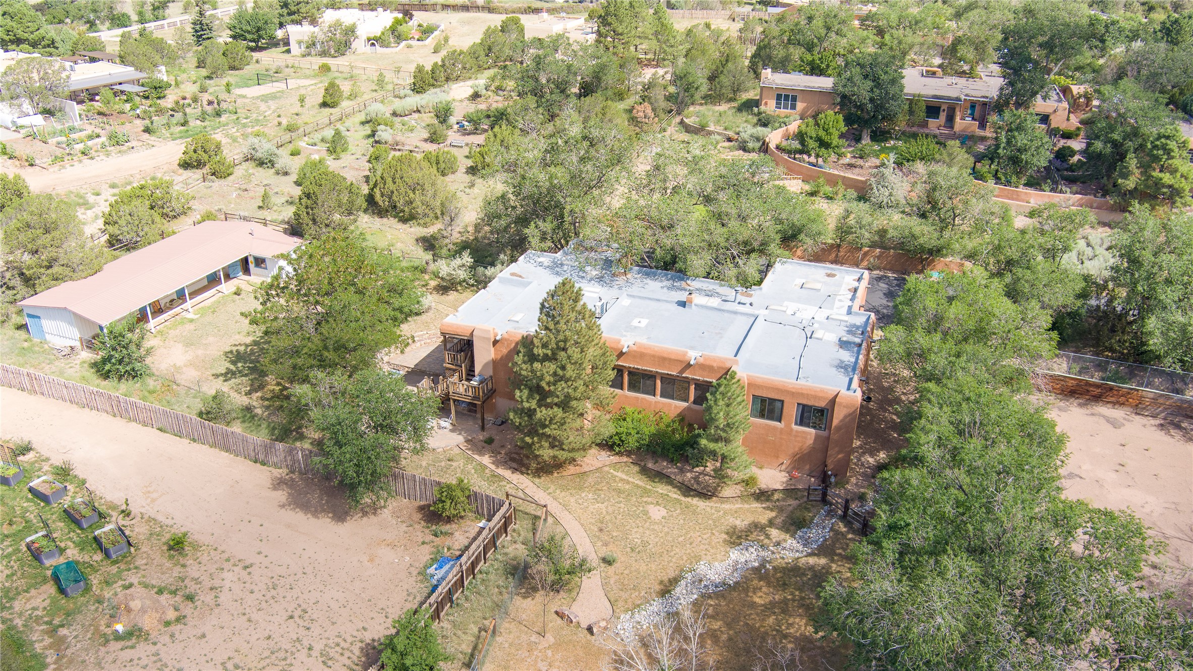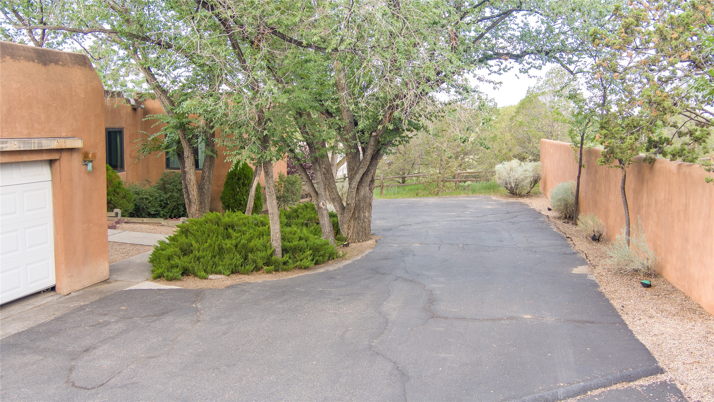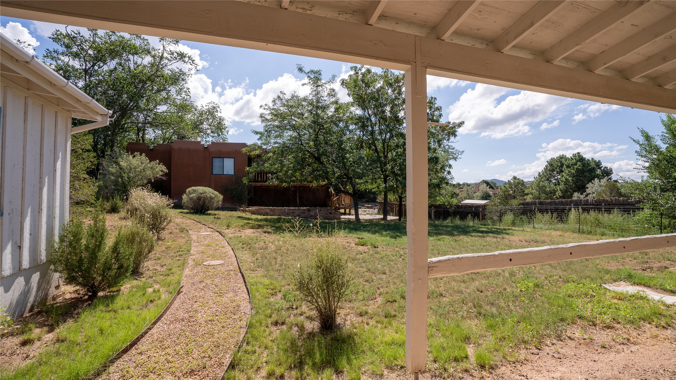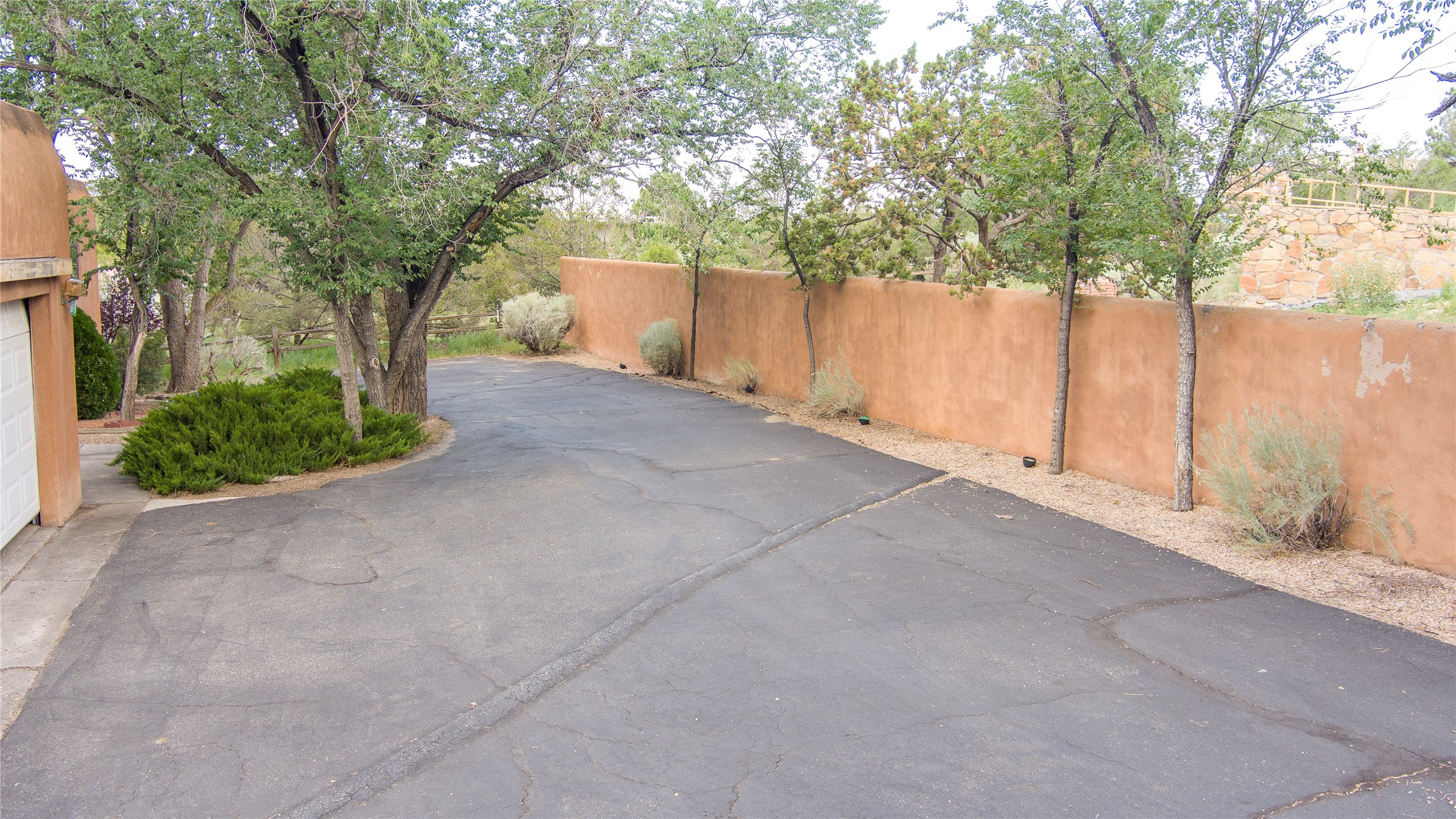 Sol Y Lomas 4 Bed/2Bath Home on 1.244 acre lot with mature trees. Large Sunken Living Room for lots of entertaining with beautiful wood burning Kiva Fireplace in the center including Vigas and Beams with T&G. Home has great separation of the primary suite from the guest rooms. Primary Suite is roomy with the ductless mini-split for your comfort along with an oversized tub, separate shower, dual sinks and large walk-in closet. At the other end of the home are the 3 bedrooms and full bath with double sinks. Kitchen includes 2 ovens with newer refrigerator, dishwasher, microwave, trash compactor and electric stove top. Dining Room has built-in buffet with Niches. The sliding glass door heads out to the patio deck and just down a few steps is the gas line for your grill. Outside is the brick patio and the outdoor water feature. The Stables now houses the trains with tracks. The approx. 1,500 sq ft stables also includes gas, electric, and a half bath with plumbing already installed for a shower. On the other side of the home was a tennis court. The 2 car garage is oversized with a tub for your pets and leads into the large laundry room. Minutes to Downtown Santa Fe, hospital, shopping, and I-25.