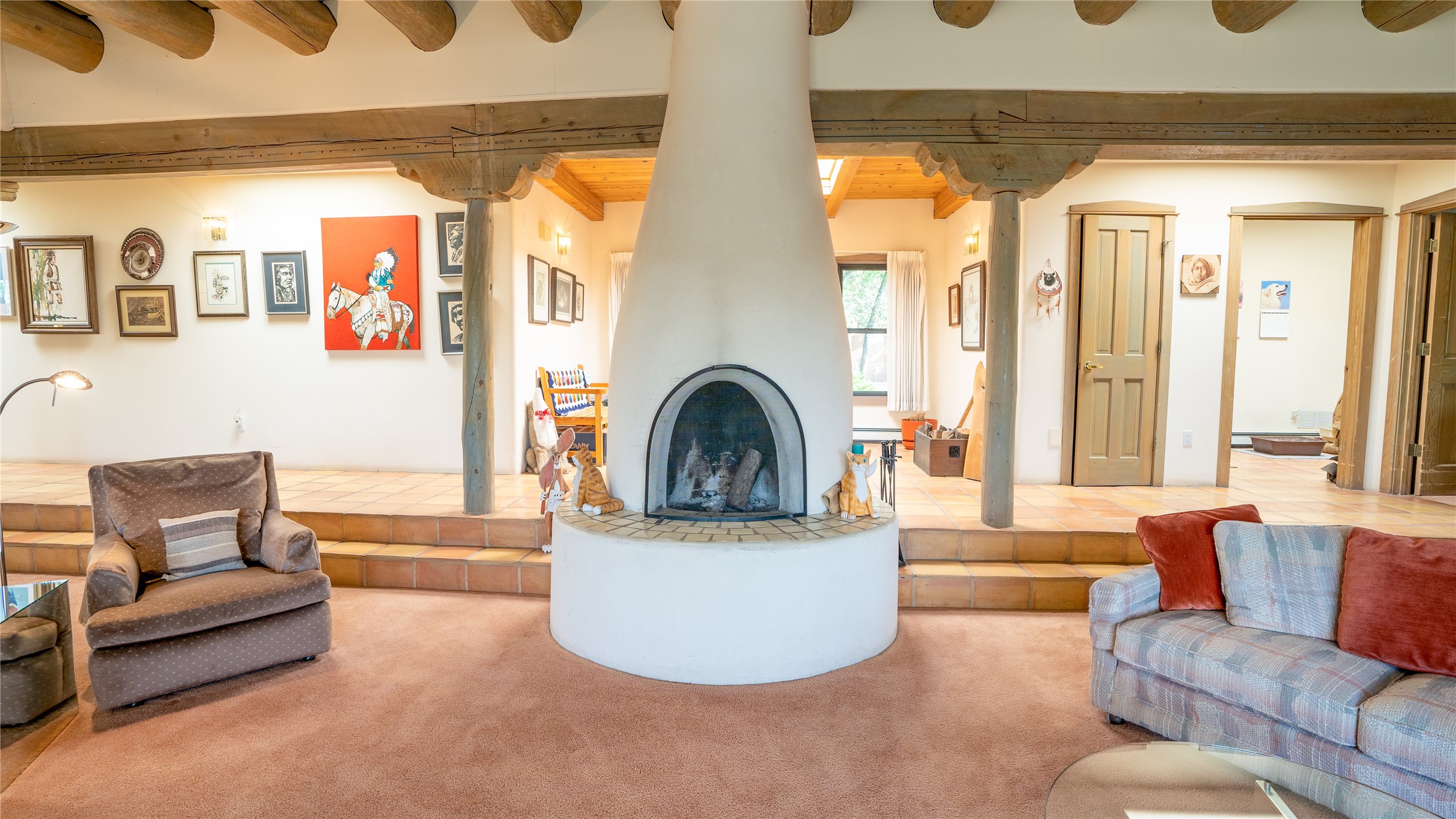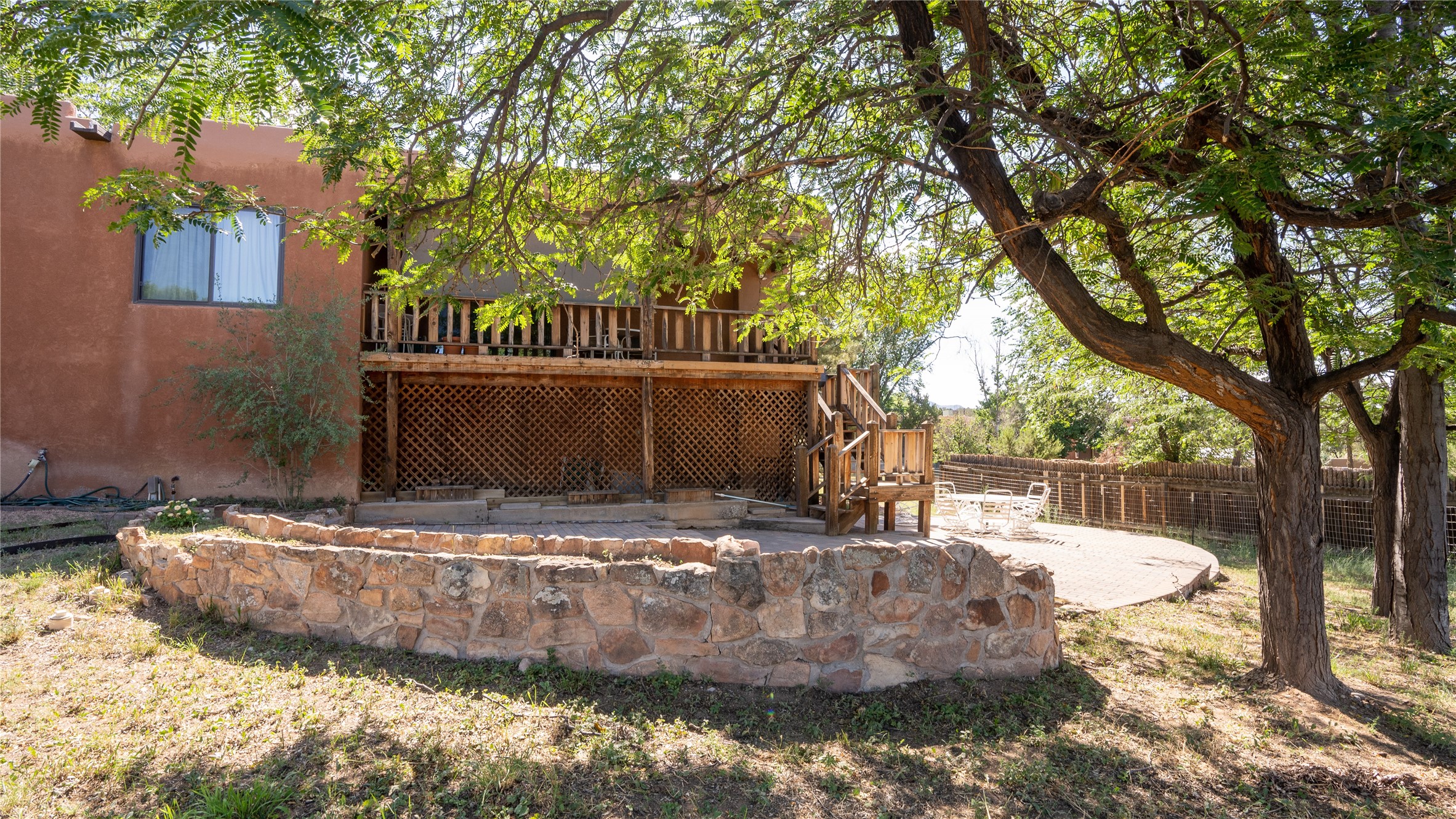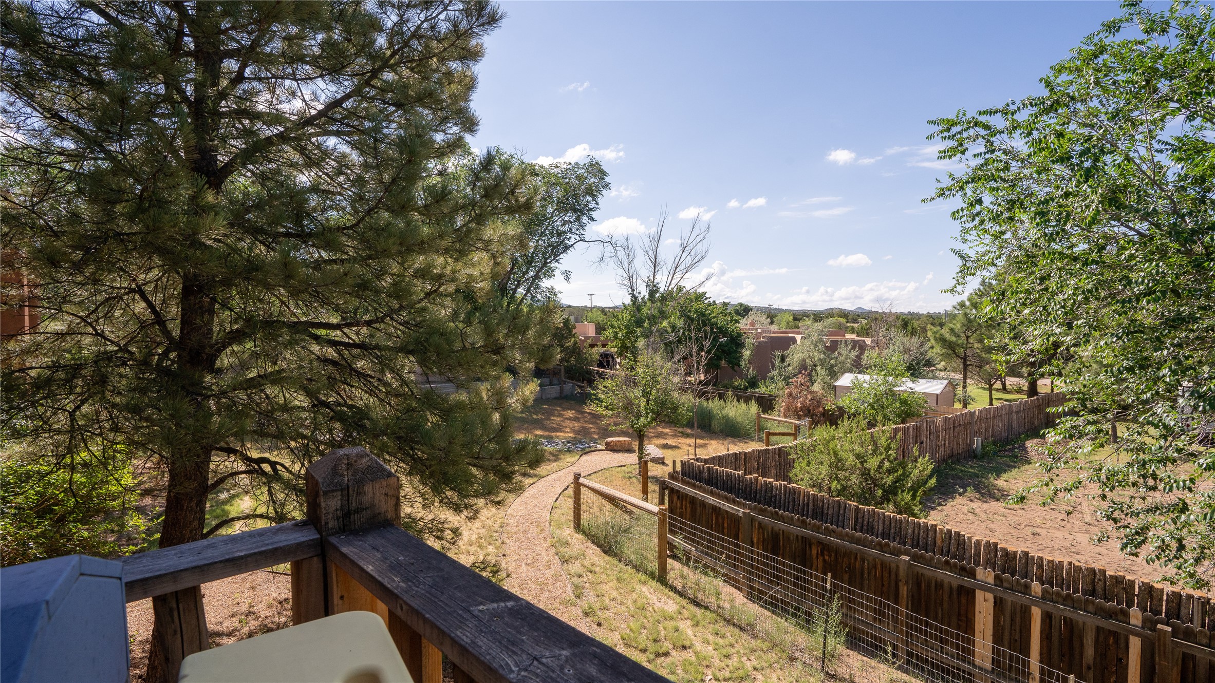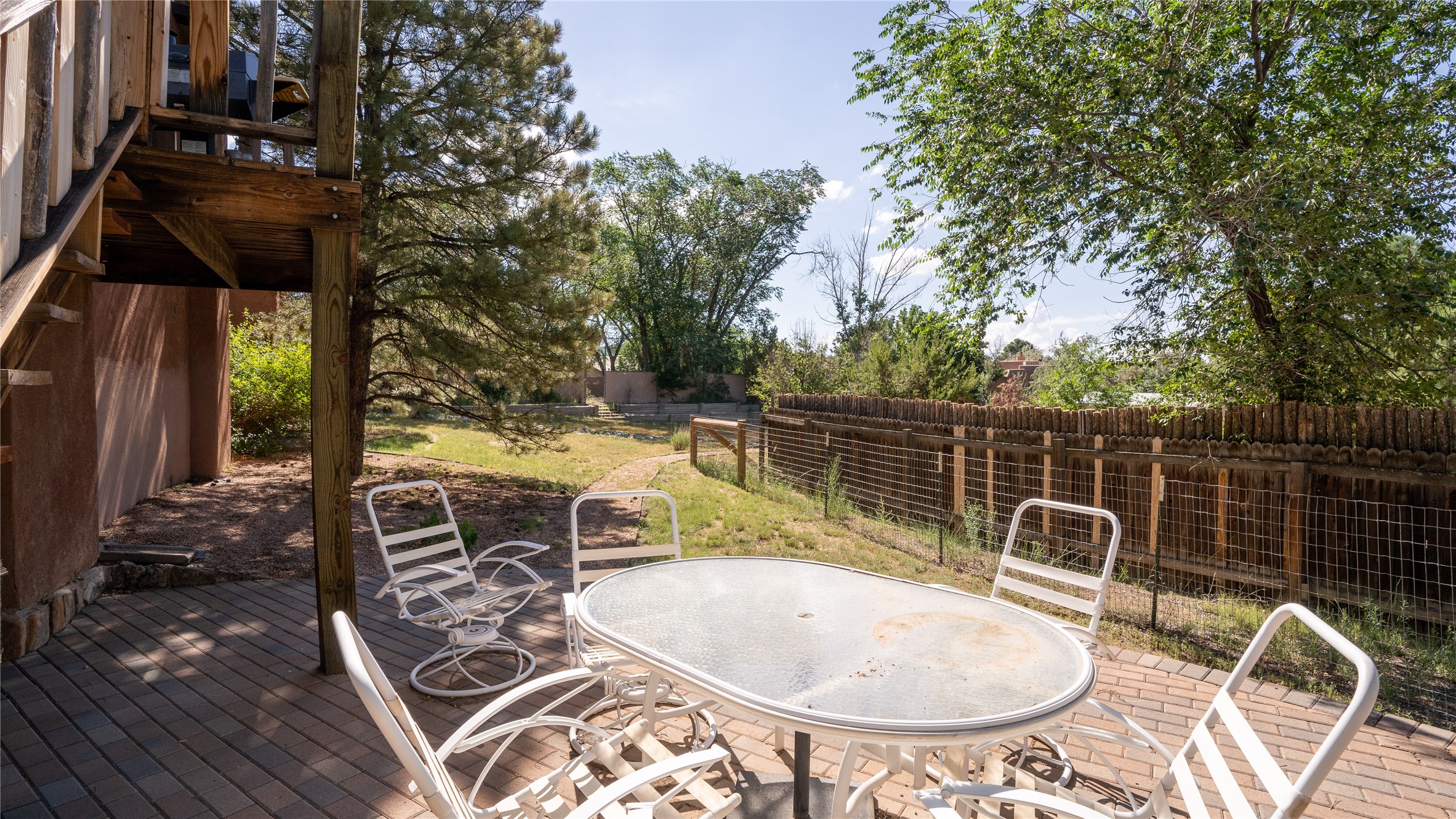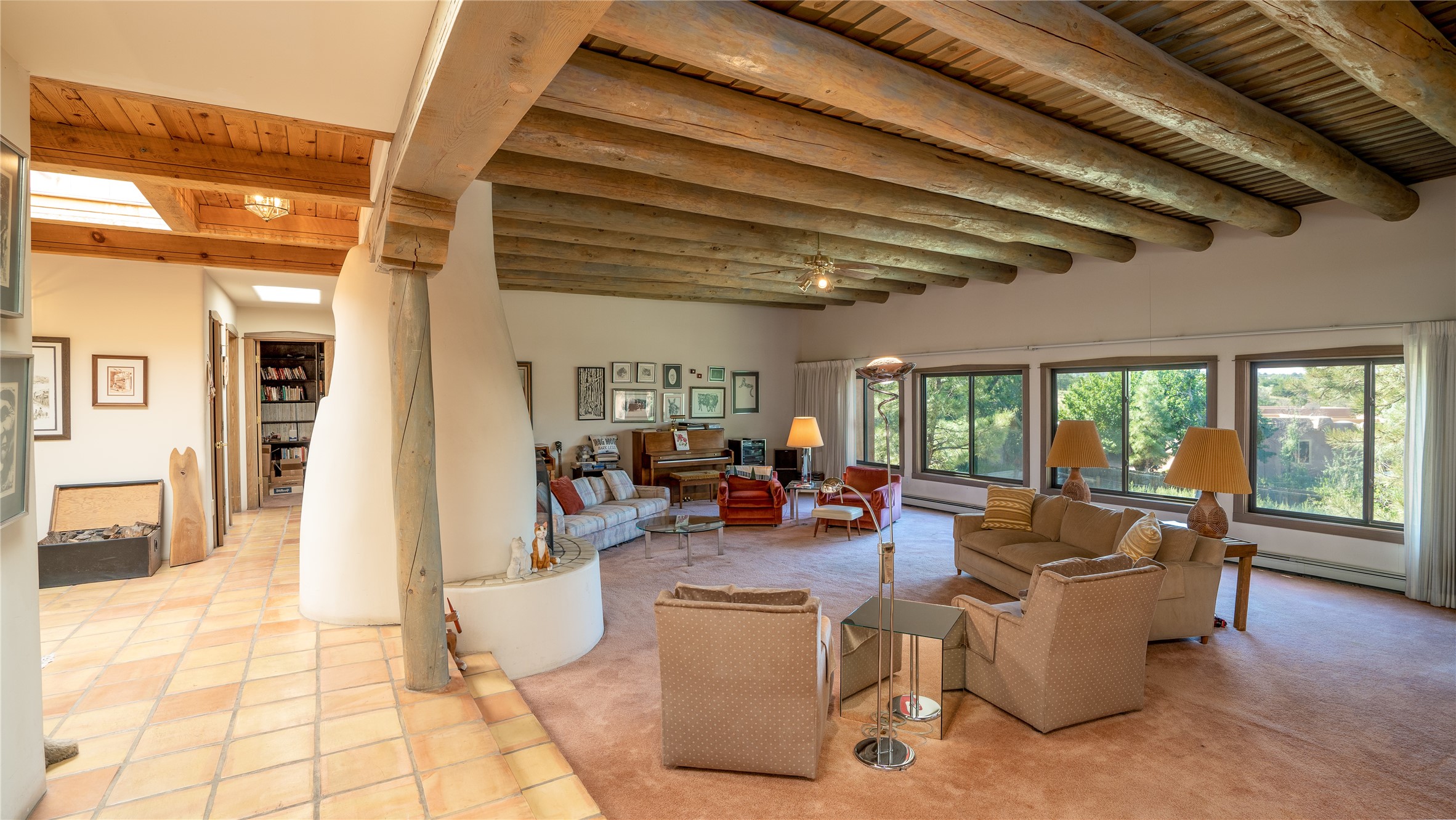 Sol Y Lomas 4 Bed/2Bath Home on 1.244 acre lot with mature trees. Large Sunken Living Room for lots of entertaining with beautiful wood burning Kiva Fireplace in the center including Vigas and Beams with T&G. Home has great separation of the primary suite from the guest rooms. Primary Suite is roomy with the ductless mini-split for your comfort along with an oversized tub, separate shower, dual sinks and large walk-in closet. At the other end of the home are the 3 bedrooms and full bath with double sinks. Kitchen includes 2 ovens with newer refrigerator, dishwasher, microwave, trash compactor and electric stove top. Dining Room has built-in buffet with Niches. The sliding glass door heads out to the patio deck and just down a few steps is the gas line for your grill. Outside is the brick patio and the outdoor water feature. The Stables now houses the trains with tracks. The approx. 1,500 sq ft stables also includes gas, electric, and a half bath with plumbing already installed for a shower. On the other side of the home was a tennis court. The 2 car garage is oversized with a tub for your pets and leads into the large laundry room. Minutes to Downtown Santa Fe, hospital, shopping, and I-25.