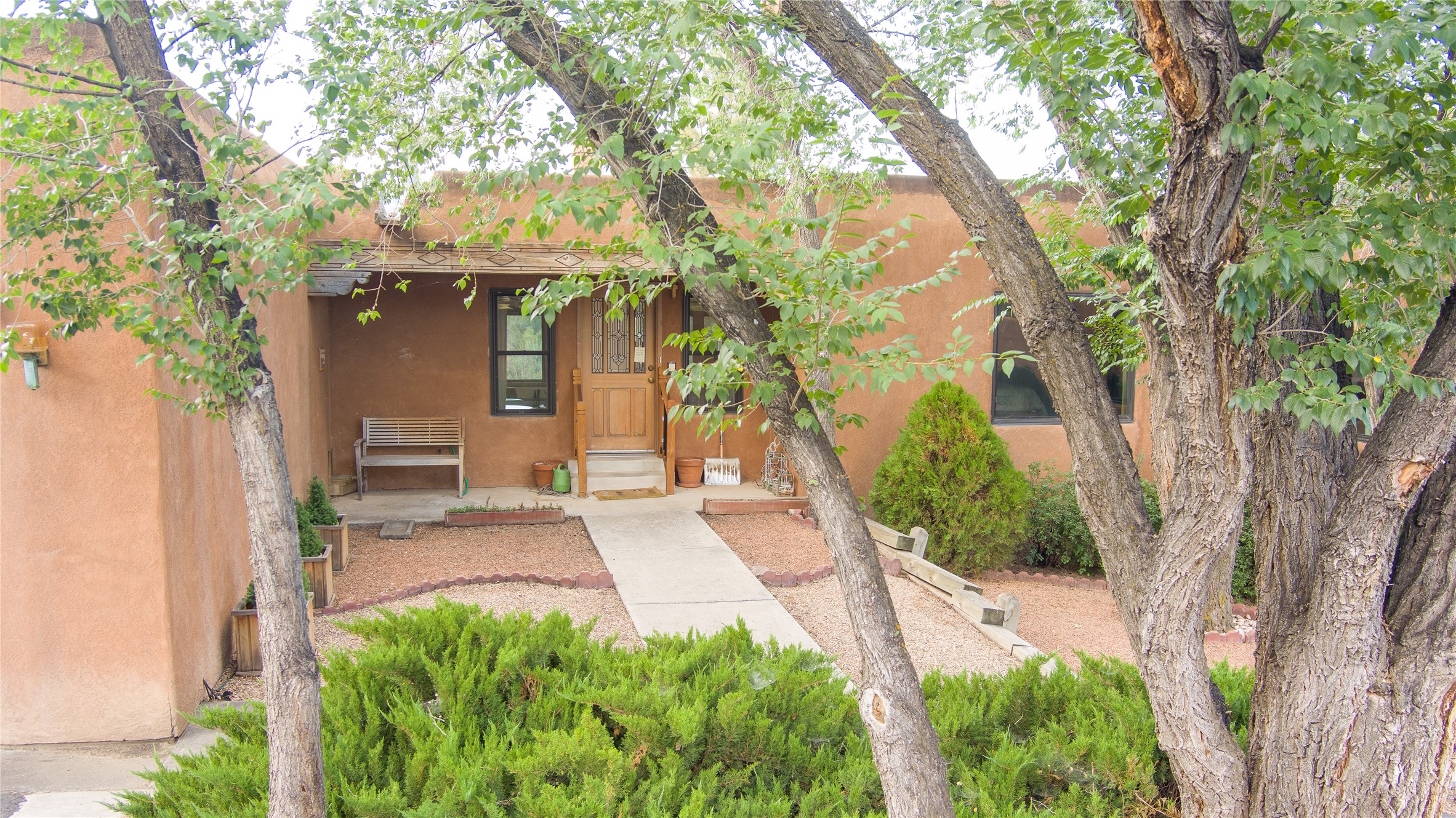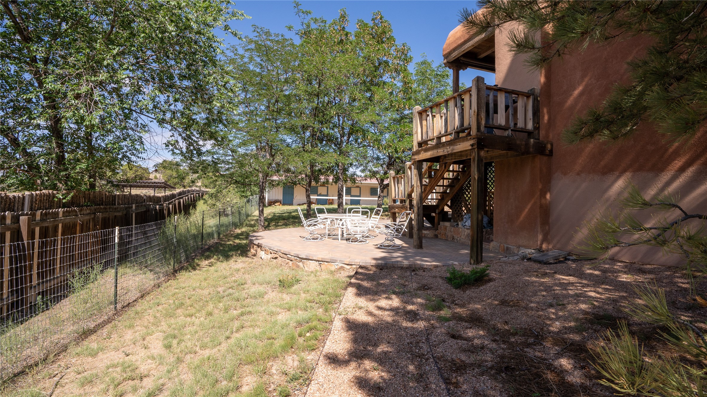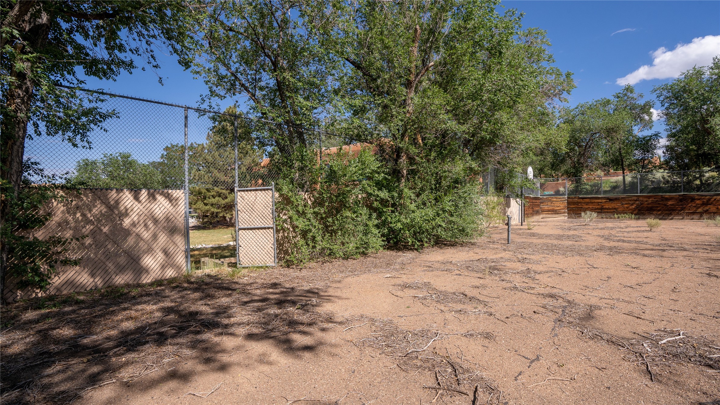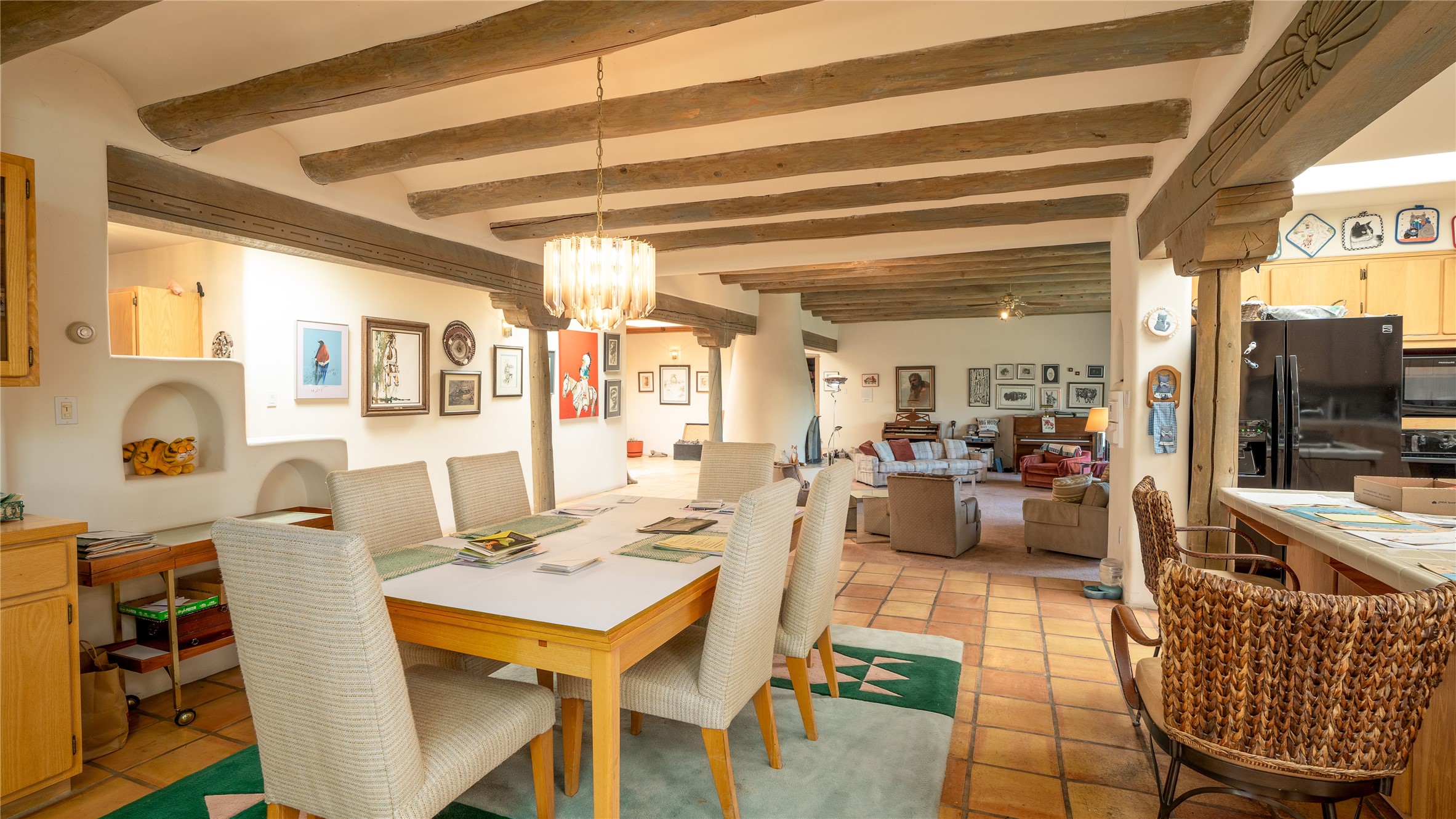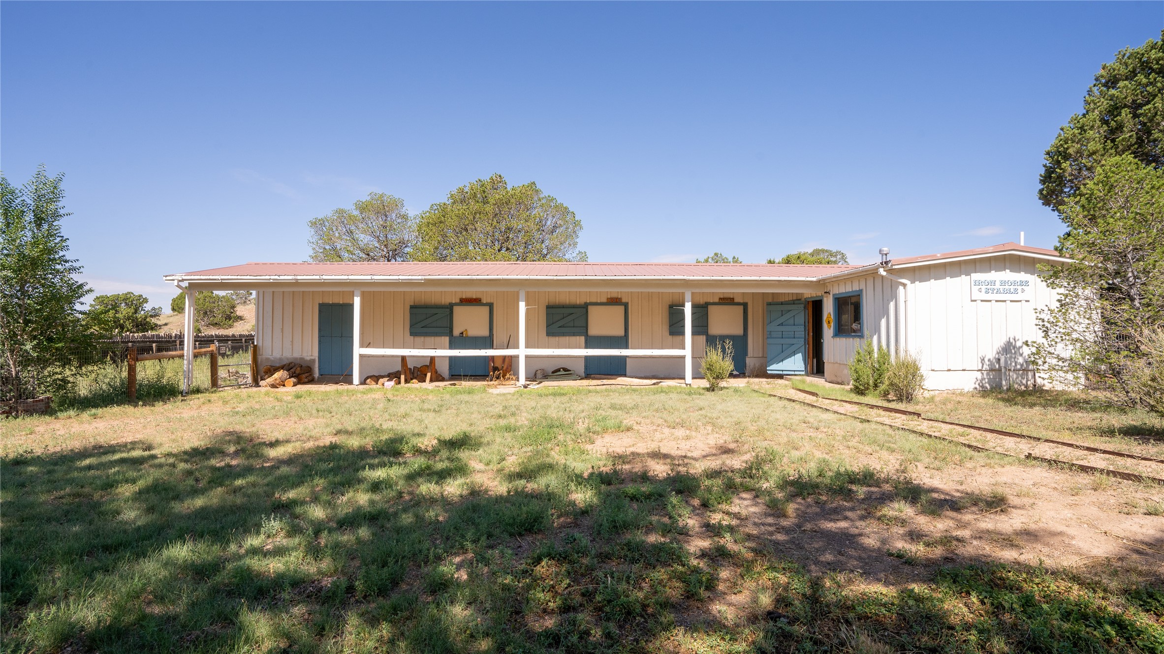 Sol Y Lomas 4 Bed/2Bath Home on 1.244 acre lot with mature trees. Large Sunken Living Room for lots of entertaining with beautiful wood burning Kiva Fireplace in the center including Vigas and Beams with T&G. Home has great separation of the primary suite from the guest rooms. Primary Suite is roomy with the ductless mini-split for your comfort along with an oversized tub, separate shower, dual sinks and large walk-in closet. At the other end of the home are the 3 bedrooms and full bath with double sinks. Kitchen includes 2 ovens with newer refrigerator, dishwasher, microwave, trash compactor and electric stove top. Dining Room has built-in buffet with Niches. The sliding glass door heads out to the patio deck and just down a few steps is the gas line for your grill. Outside is the brick patio and the outdoor water feature. The Stables now houses the trains with tracks. The approx. 1,500 sq ft stables also includes gas, electric, and a half bath with plumbing already installed for a shower. On the other side of the home was a tennis court. The 2 car garage is oversized with a tub for your pets and leads into the large laundry room. Minutes to Downtown Santa Fe, hospital, shopping, and I-25.