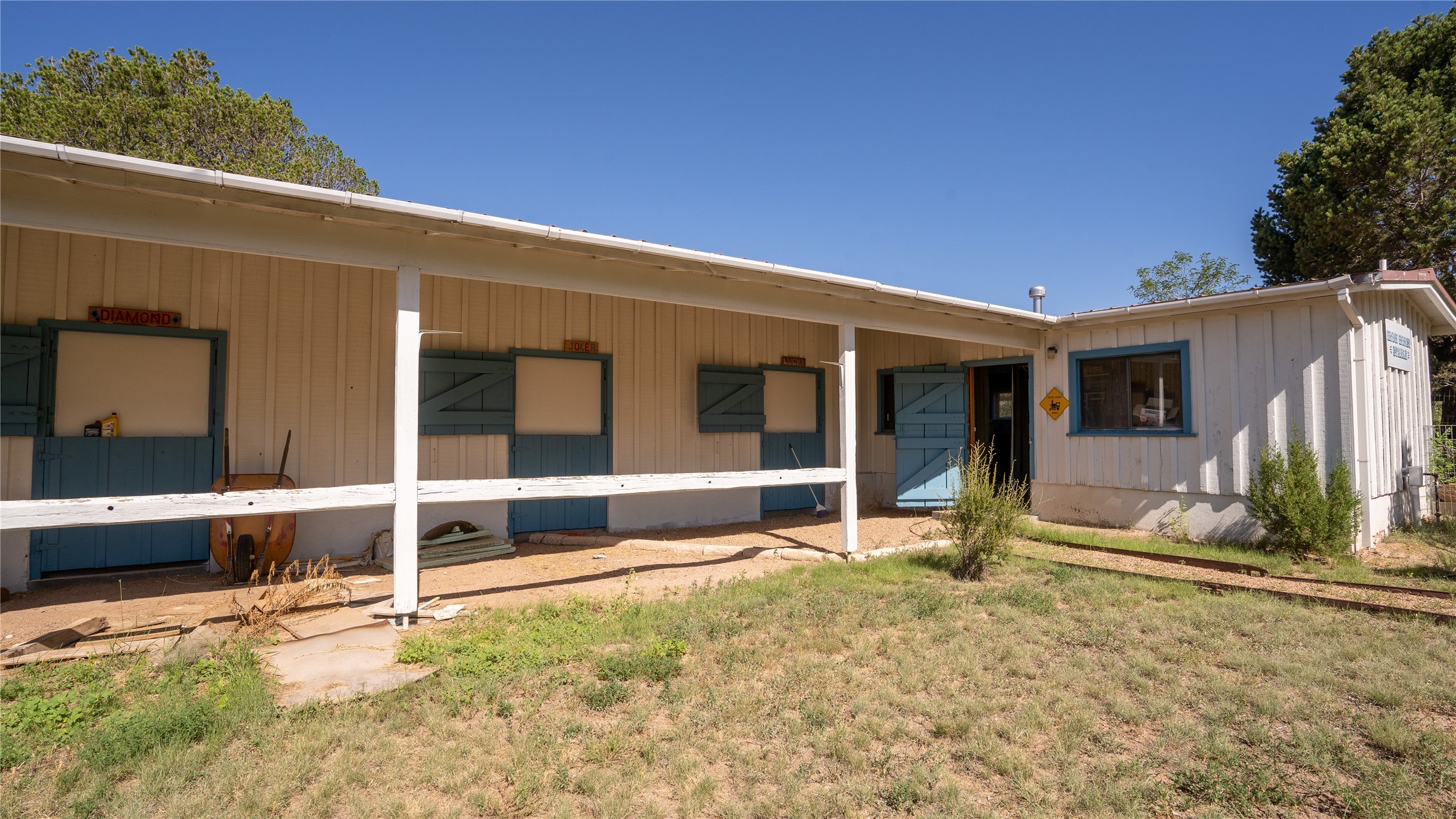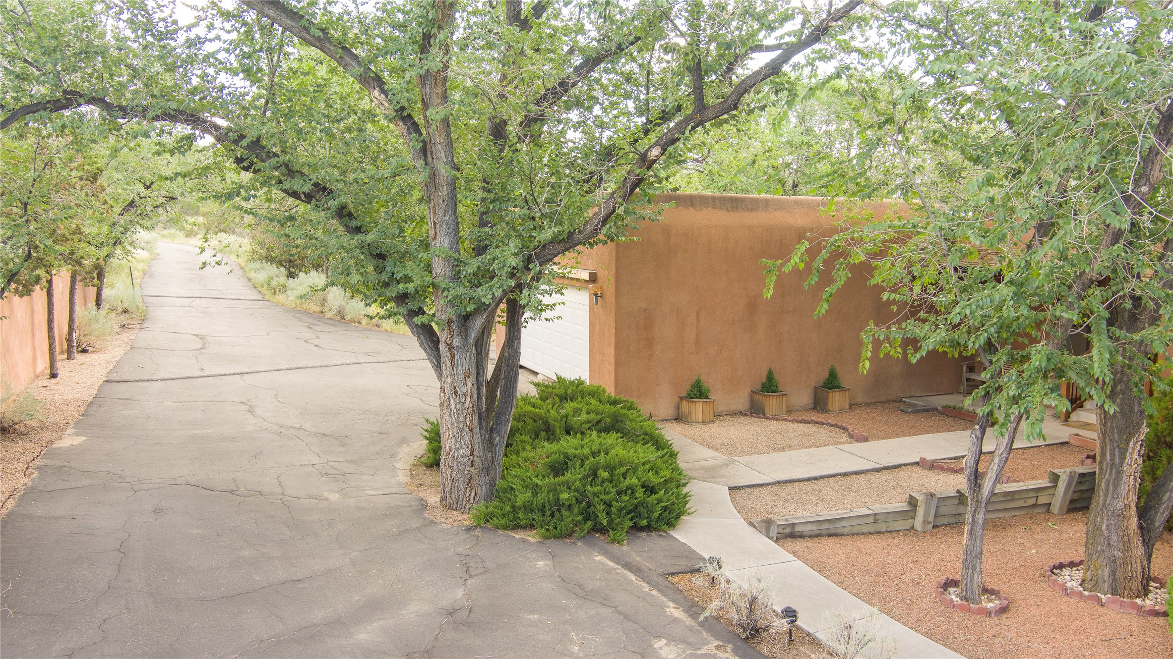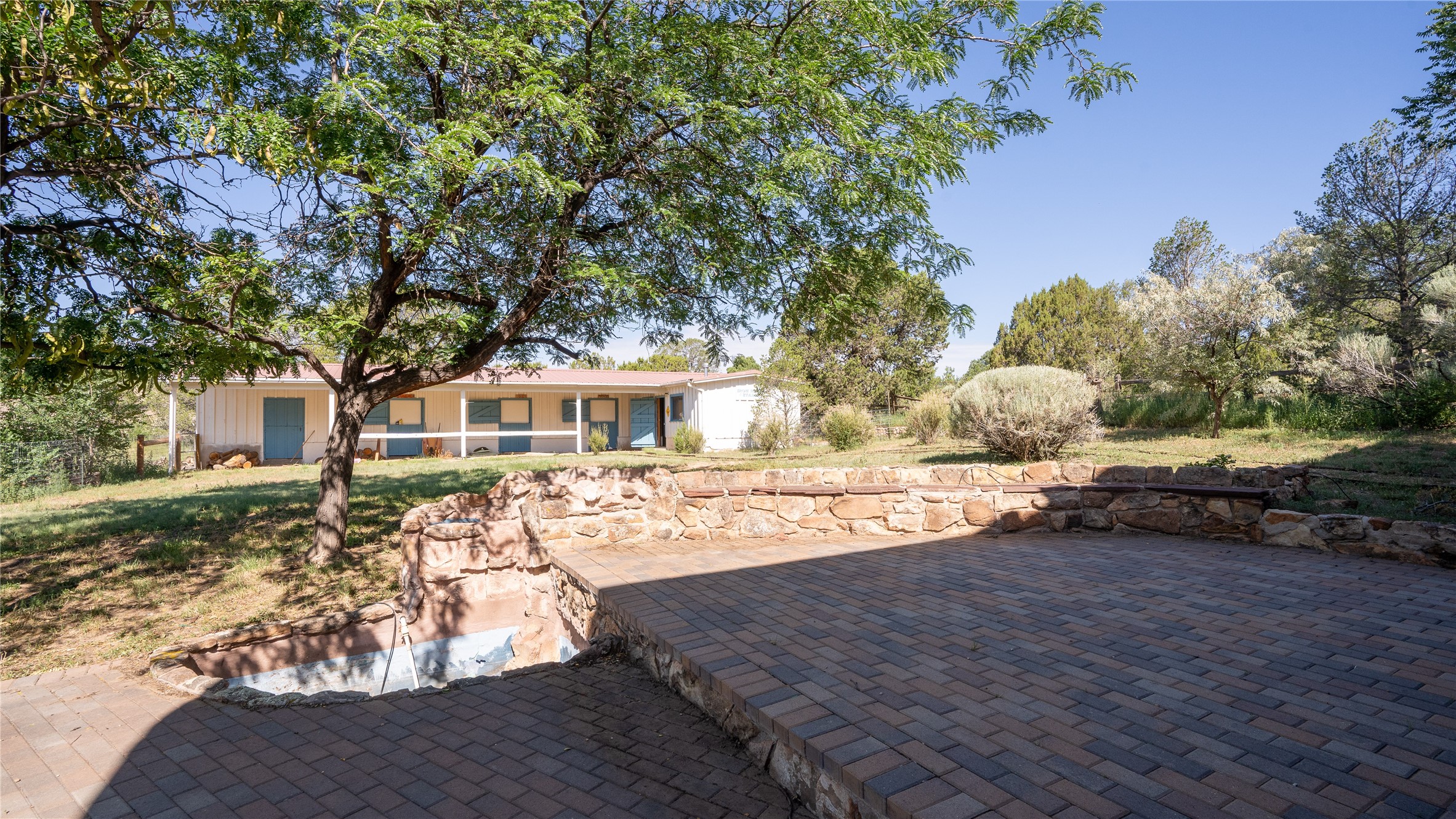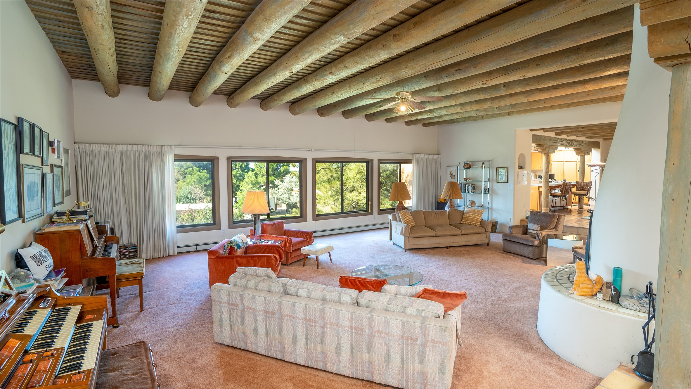 Sol Y Lomas 4 Bed/2Bath Home on 1.244 acre lot with mature trees. Large Sunken Living Room for lots of entertaining with beautiful wood burning Kiva Fireplace in the center including Vigas and Beams with T&G. Home has great separation of the primary suite from the guest rooms. Primary Suite is roomy with the ductless mini-split for your comfort along with an oversized tub, separate shower, dual sinks and large walk-in closet. At the other end of the home are the 3 bedrooms and full bath with double sinks. Kitchen includes 2 ovens with newer refrigerator, dishwasher, microwave, trash compactor and electric stove top. Dining Room has built-in buffet with Niches. The sliding glass door heads out to the patio deck and just down a few steps is the gas line for your grill. Outside is the brick patio and the outdoor water feature. The Stables now houses the trains with tracks. The approx. 1,500 sq ft stables also includes gas, electric, and a half bath with plumbing already installed for a shower. On the other side of the home was a tennis court. The 2 car garage is oversized with a tub for your pets and leads into the large laundry room. Minutes to Downtown Santa Fe, hospital, shopping, and I-25.