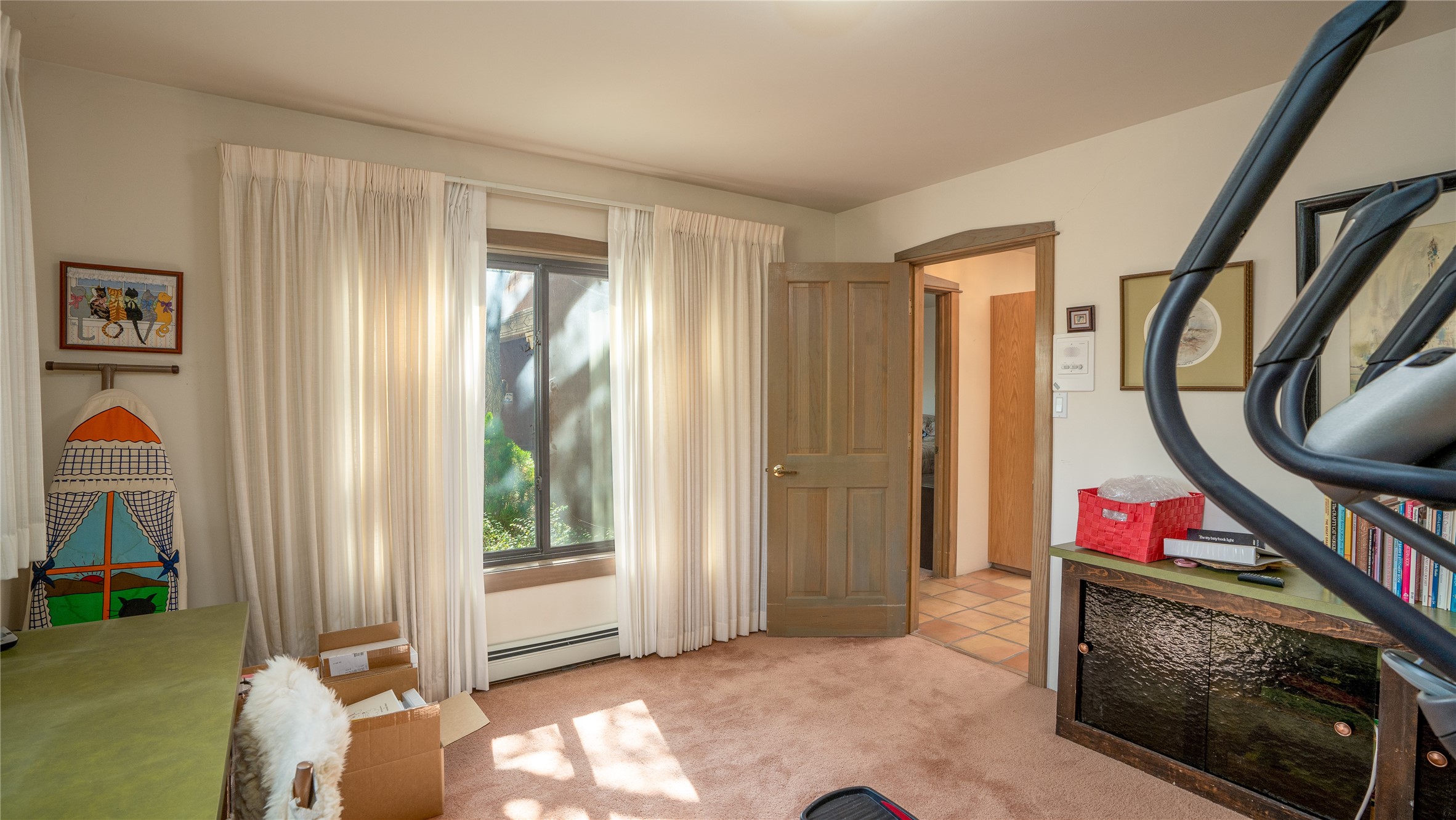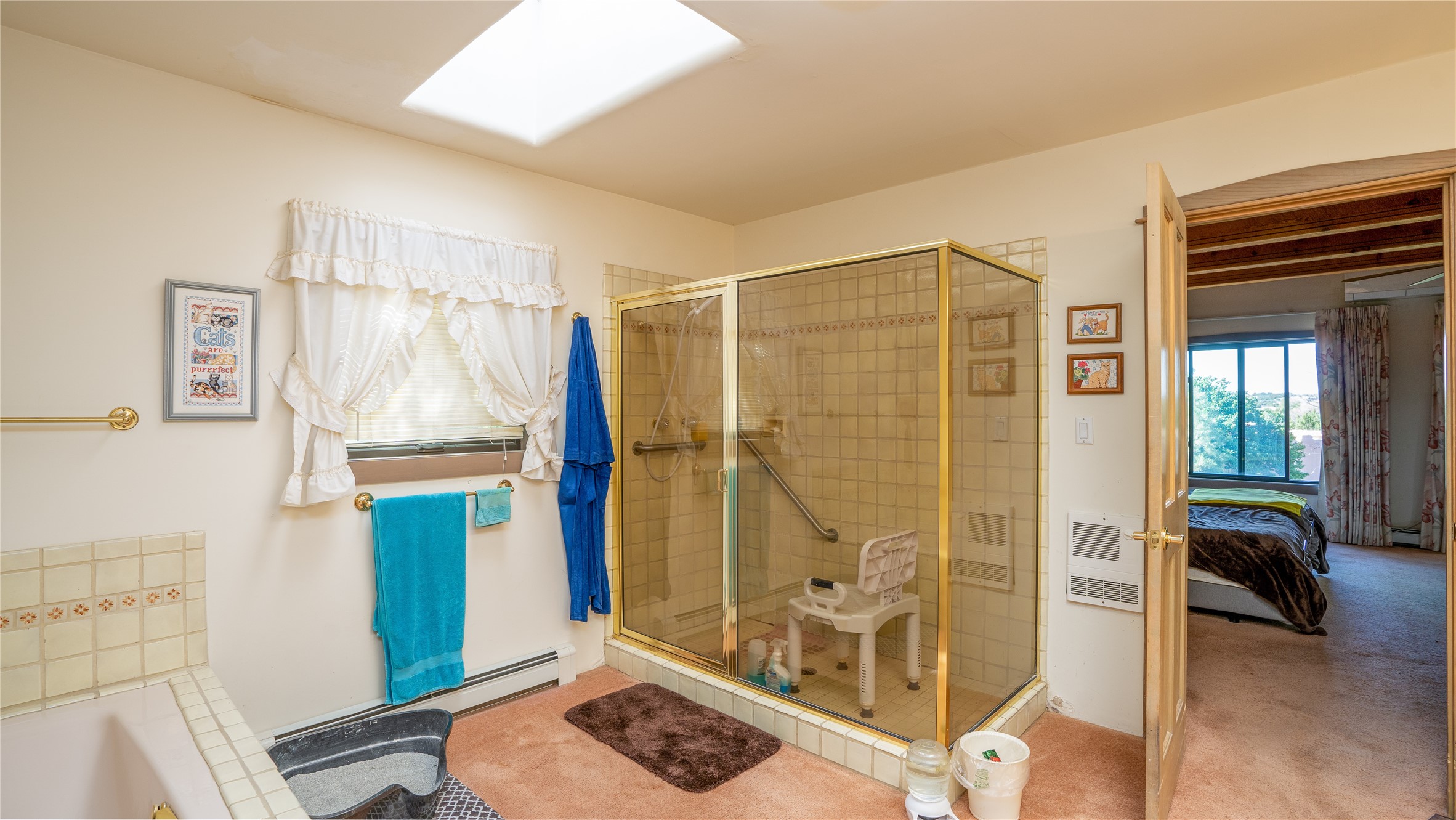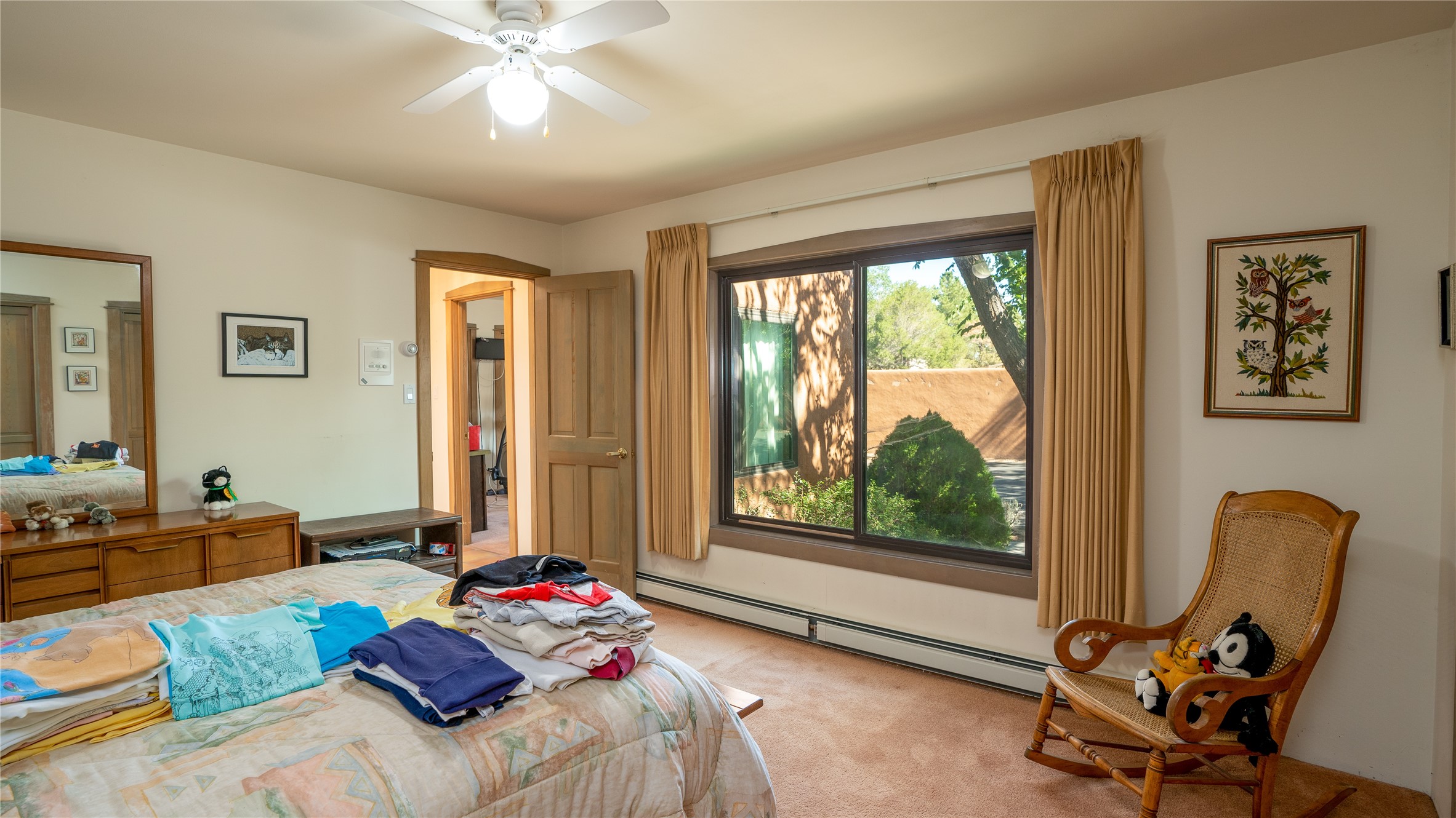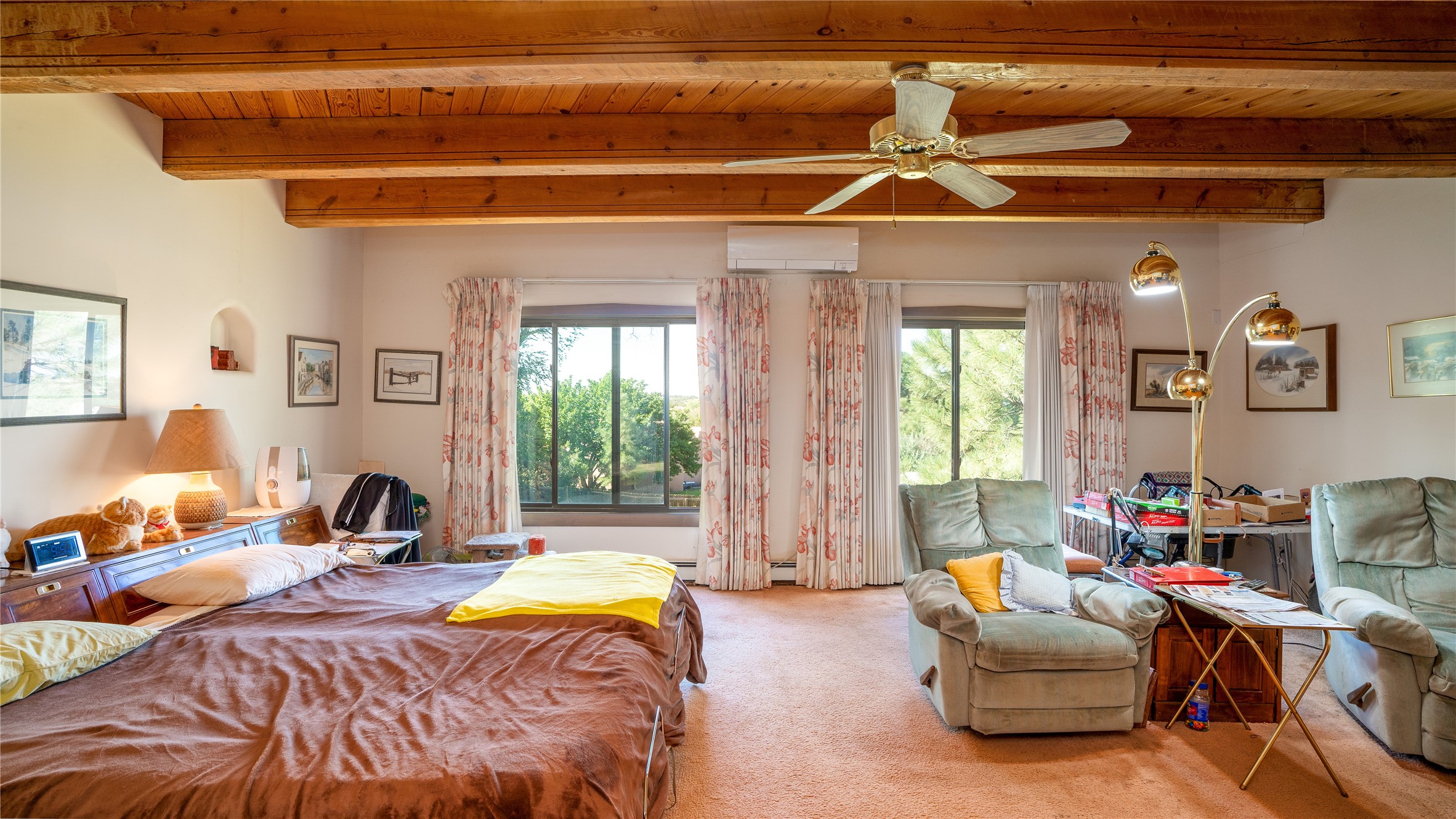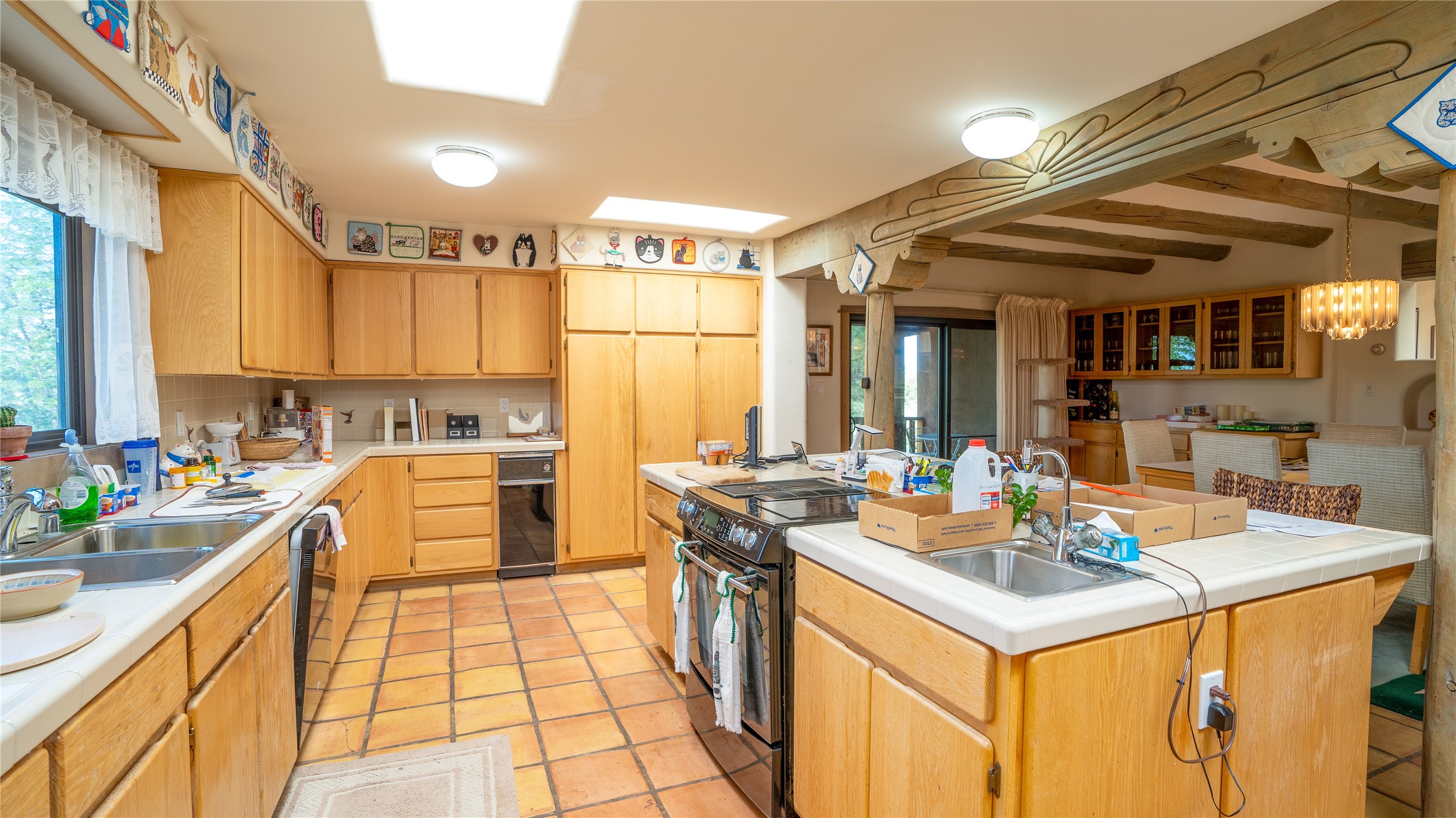 Sol Y Lomas 4 Bed/2Bath Home on 1.244 acre lot with mature trees. Large Sunken Living Room for lots of entertaining with beautiful wood burning Kiva Fireplace in the center including Vigas and Beams with T&G. Home has great separation of the primary suite from the guest rooms. Primary Suite is roomy with the ductless mini-split for your comfort along with an oversized tub, separate shower, dual sinks and large walk-in closet. At the other end of the home are the 3 bedrooms and full bath with double sinks. Kitchen includes 2 ovens with newer refrigerator, dishwasher, microwave, trash compactor and electric stove top. Dining Room has built-in buffet with Niches. The sliding glass door heads out to the patio deck and just down a few steps is the gas line for your grill. Outside is the brick patio and the outdoor water feature. The Stables now houses the trains with tracks. The approx. 1,500 sq ft stables also includes gas, electric, and a half bath with plumbing already installed for a shower. On the other side of the home was a tennis court. The 2 car garage is oversized with a tub for your pets and leads into the large laundry room. Minutes to Downtown Santa Fe, hospital, shopping, and I-25.