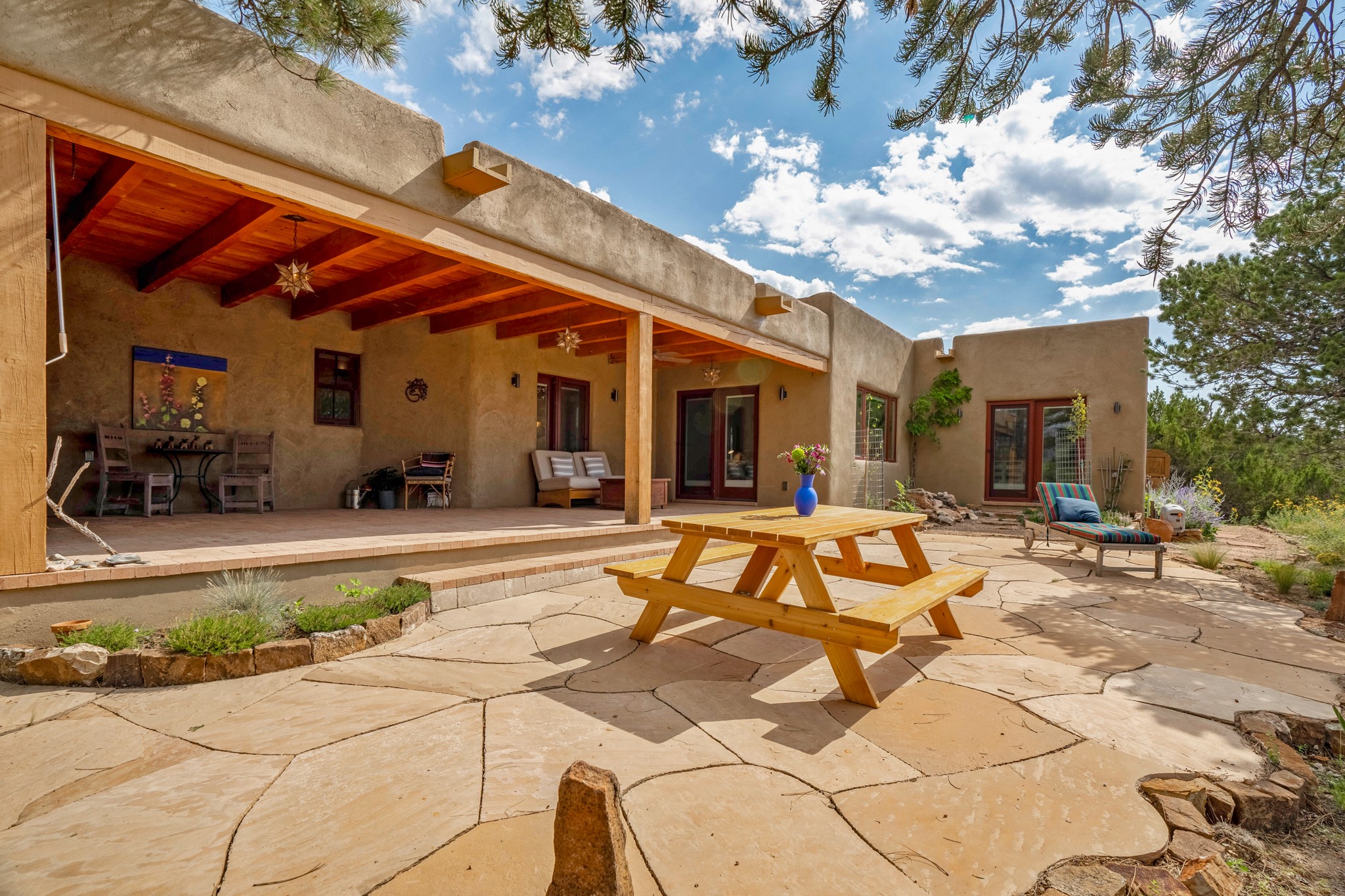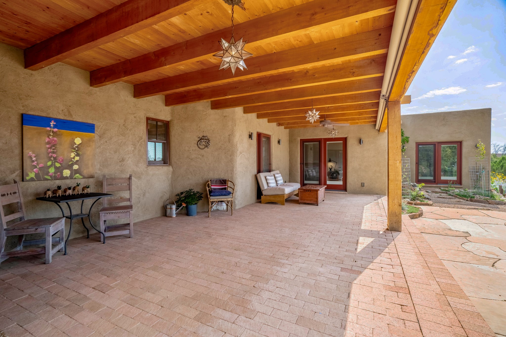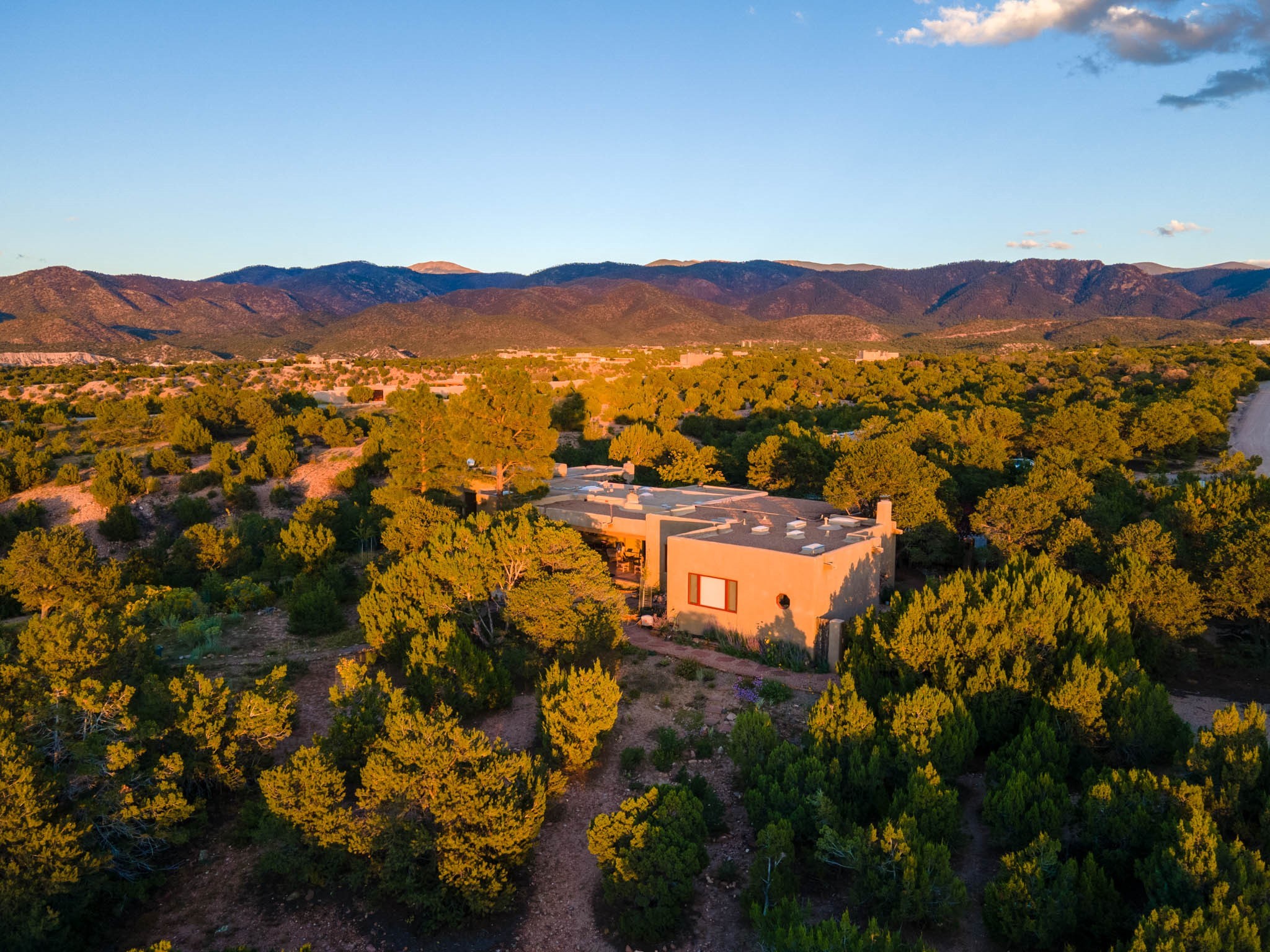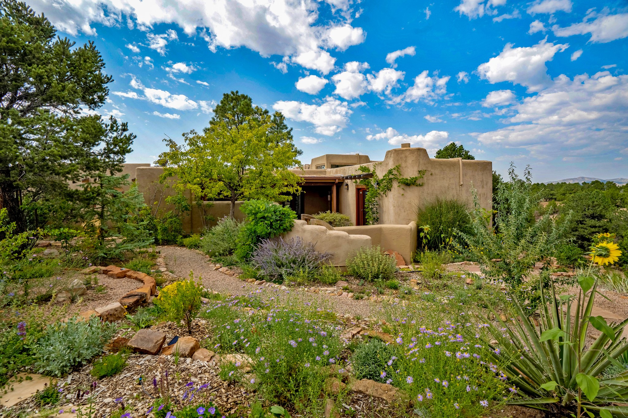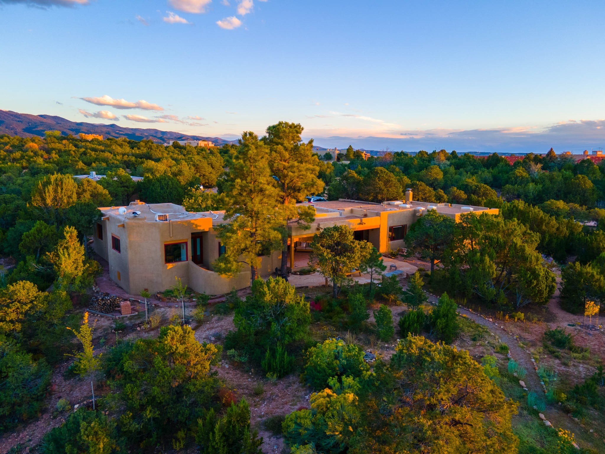 A beautifully renovated House /Guest House with panoramic views in Vista Redonda! 20 minutes to downtown Santa Fe and yet worlds away, this peaceful property has a soulful, organic feel that is 'home'. Sited on 5 view-filled acres, the 2900 sq. ft. MAIN HOUSE has a large owner's suite with a private den, private office and a spa-like bathroom. The guest bedroom is in its own wing of the house, offering great privacy with direct access to the lovely front courtyard. The kitchen was completely remodeled in 2020 with custom white cabinetry, soapstone countertops and a large island. Open to the kitchen, but maintaining a sense of intimacy, the main living area has wide plank pine flooring, a kiva fireplace and more views! The grounds are whimsical with beautiful landscaping, stone paths and a glorious hot tub for sunset viewing. GUEST HOUSE: The 1050 sq. ft. 1 bed/1 bath guest house has a newly renovated kitchen and is an absolute treasure, mirroring the same organic aesthetic of the main house. With a new roof in 2020 on the original part of the main house, community water and endless amounts of love and care, this beloved property is now available for a lucky homeowner!