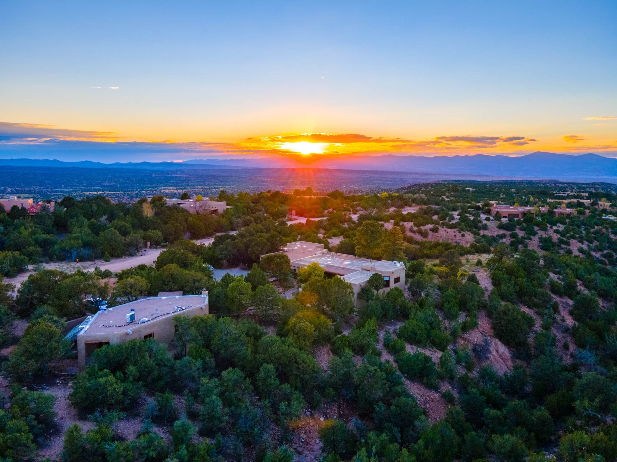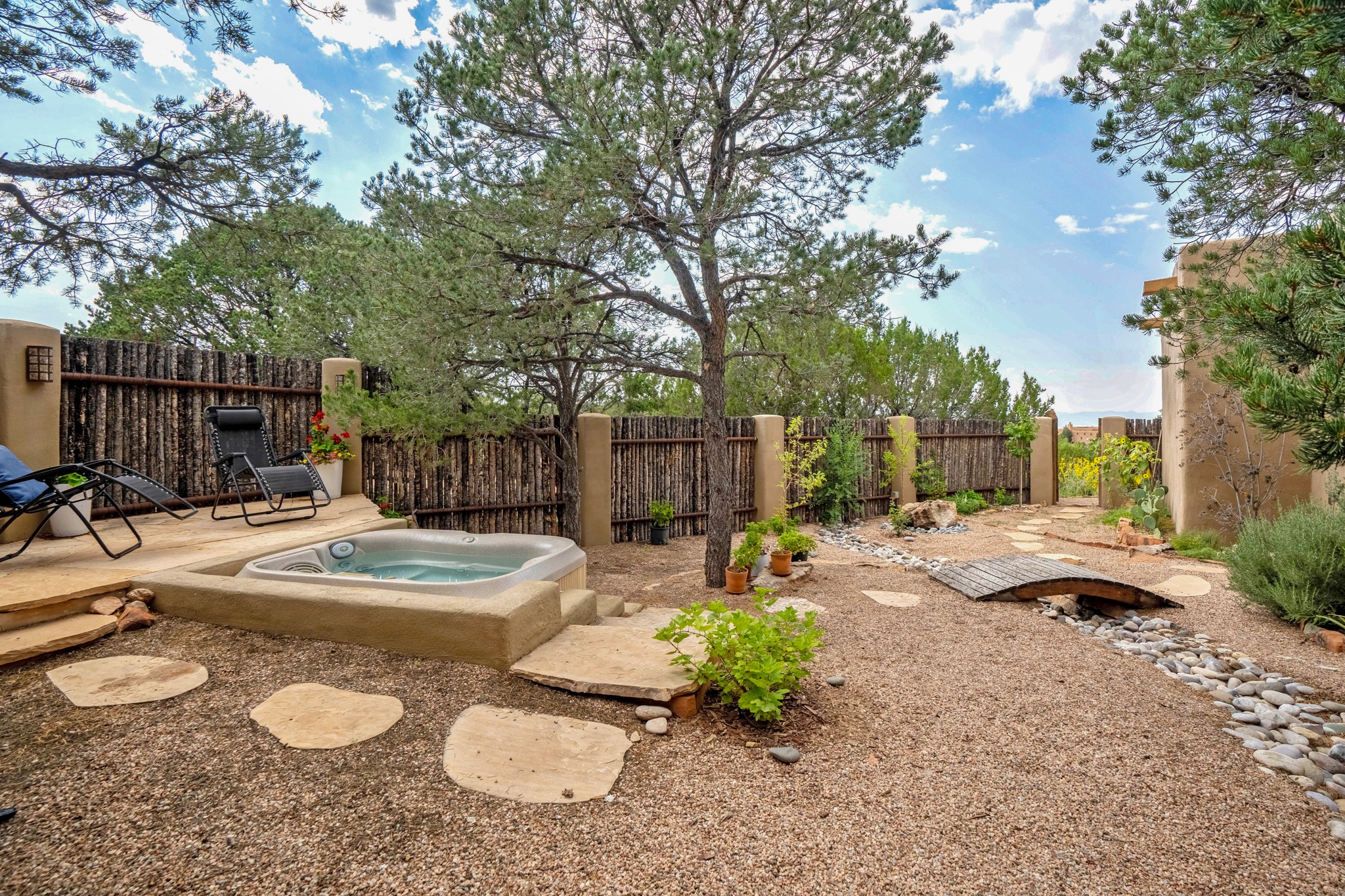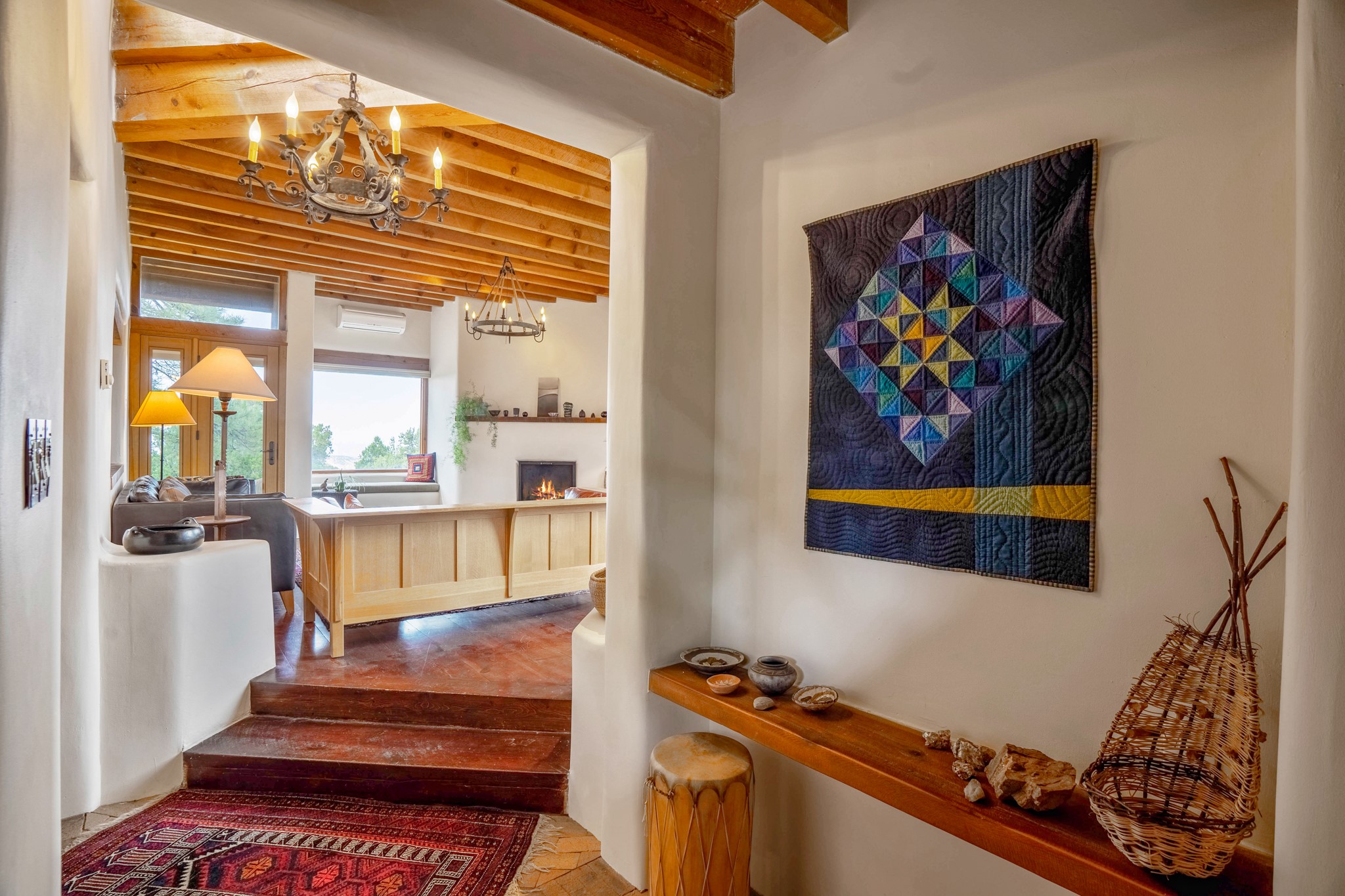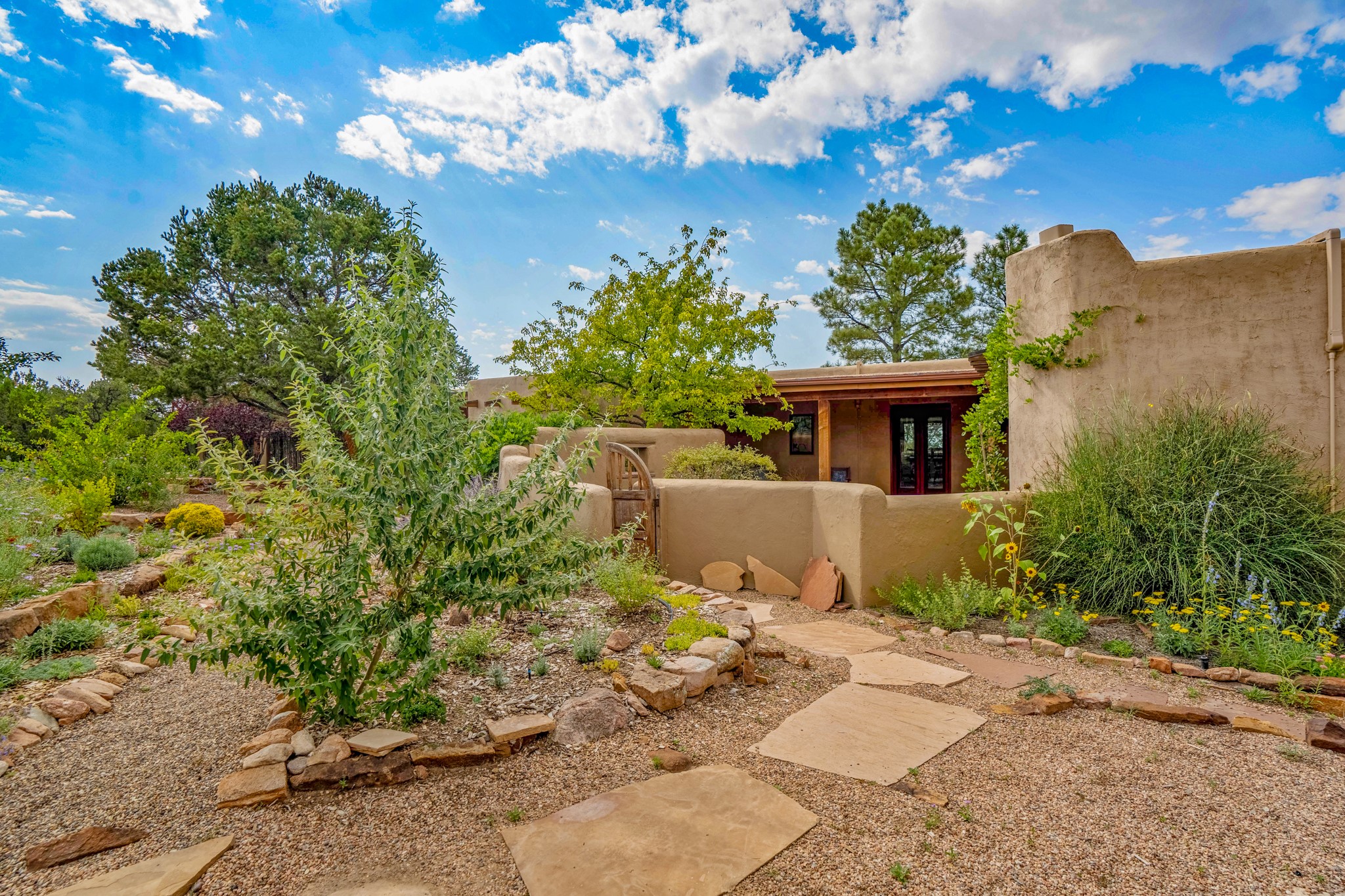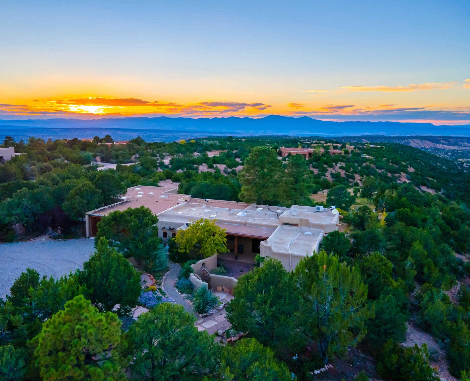 A beautifully renovated House /Guest House with panoramic views in Vista Redonda! 20 minutes to downtown Santa Fe and yet worlds away, this peaceful property has a soulful, organic feel that is 'home'. Sited on 5 view-filled acres, the 2900 sq. ft. MAIN HOUSE has a large owner's suite with a private den, private office and a spa-like bathroom. The guest bedroom is in its own wing of the house, offering great privacy with direct access to the lovely front courtyard. The kitchen was completely remodeled in 2020 with custom white cabinetry, soapstone countertops and a large island. Open to the kitchen, but maintaining a sense of intimacy, the main living area has wide plank pine flooring, a kiva fireplace and more views! The grounds are whimsical with beautiful landscaping, stone paths and a glorious hot tub for sunset viewing. GUEST HOUSE: The 1050 sq. ft. 1 bed/1 bath guest house has a newly renovated kitchen and is an absolute treasure, mirroring the same organic aesthetic of the main house. With a new roof in 2020 on the original part of the main house, community water and endless amounts of love and care, this beloved property is now available for a lucky homeowner!