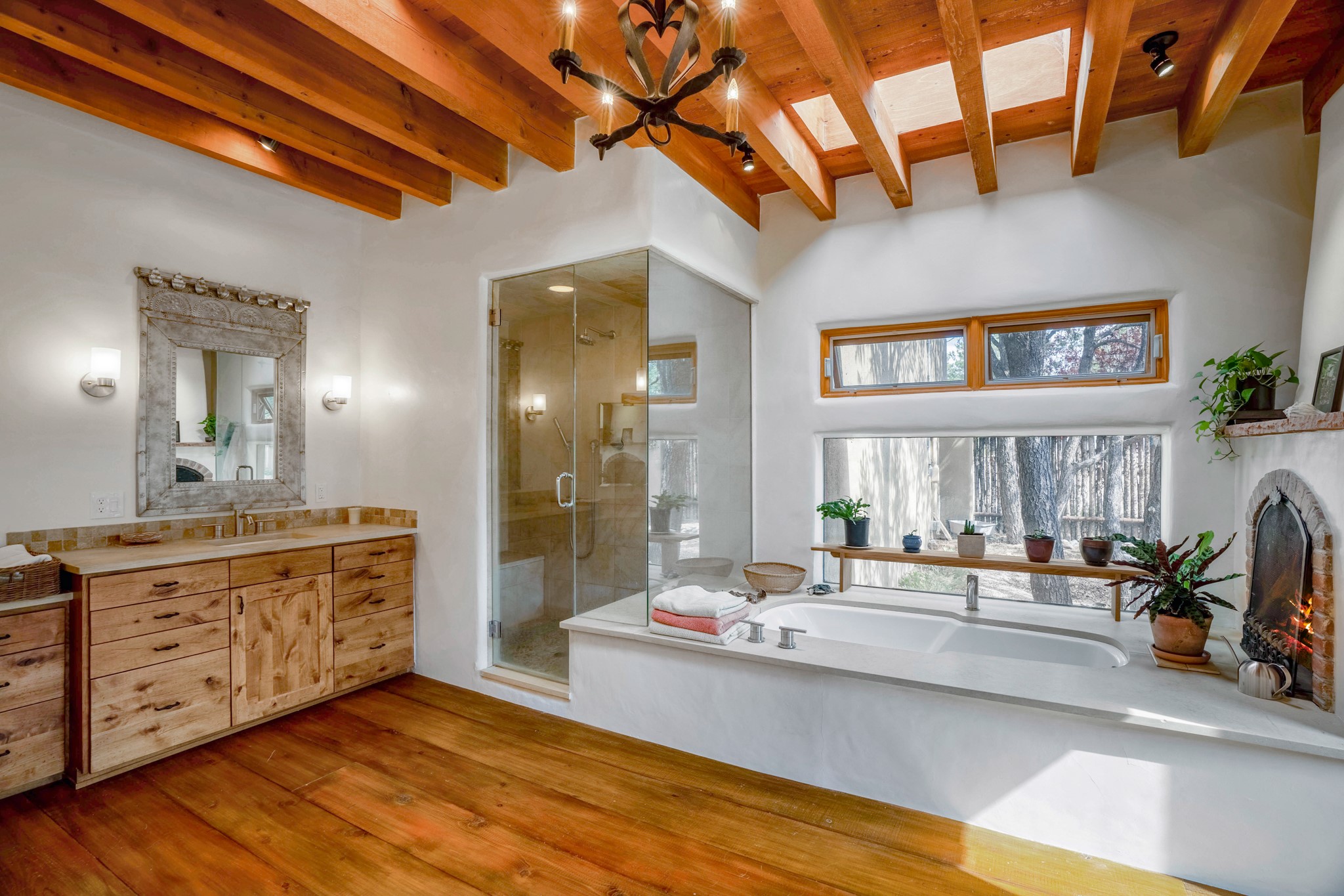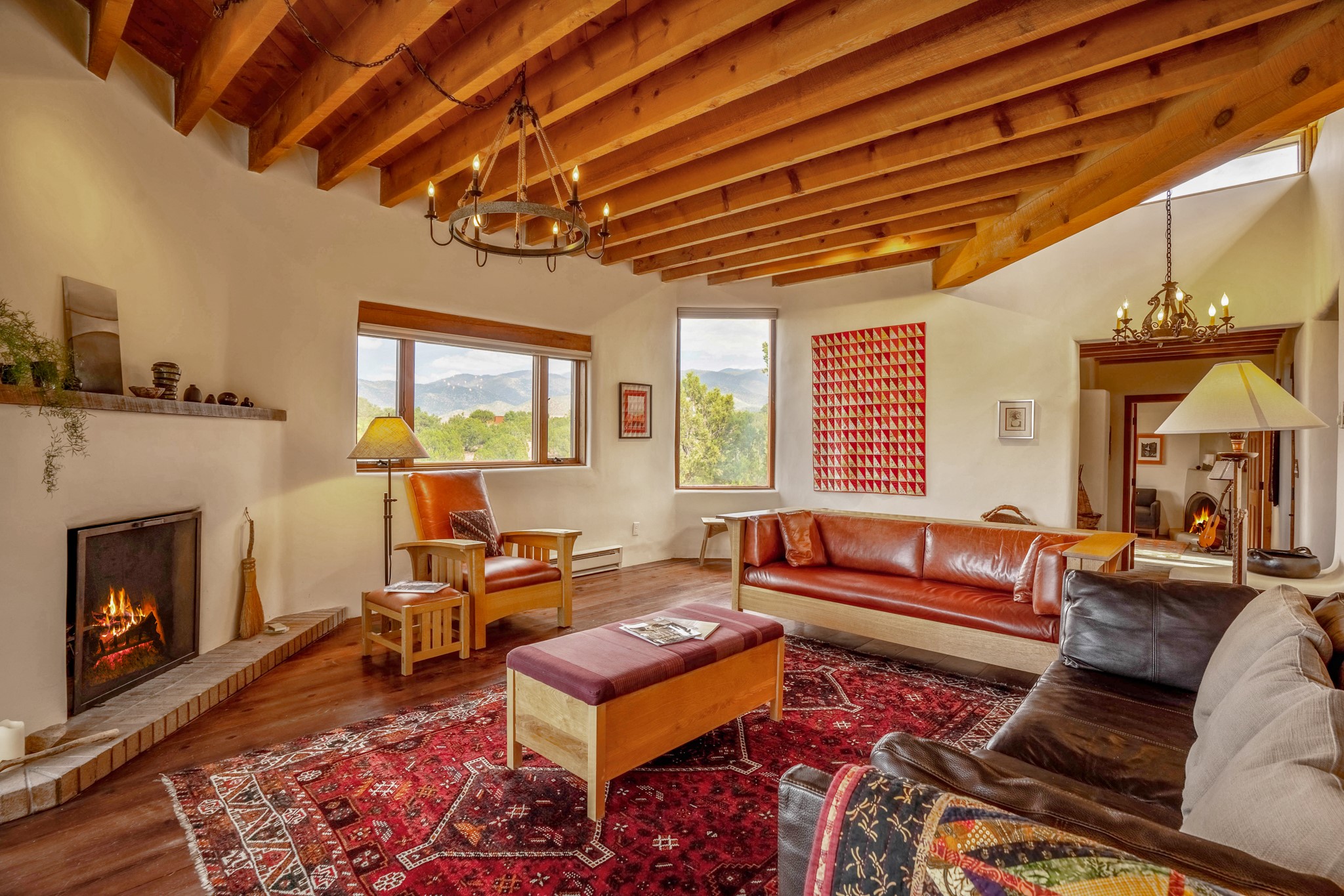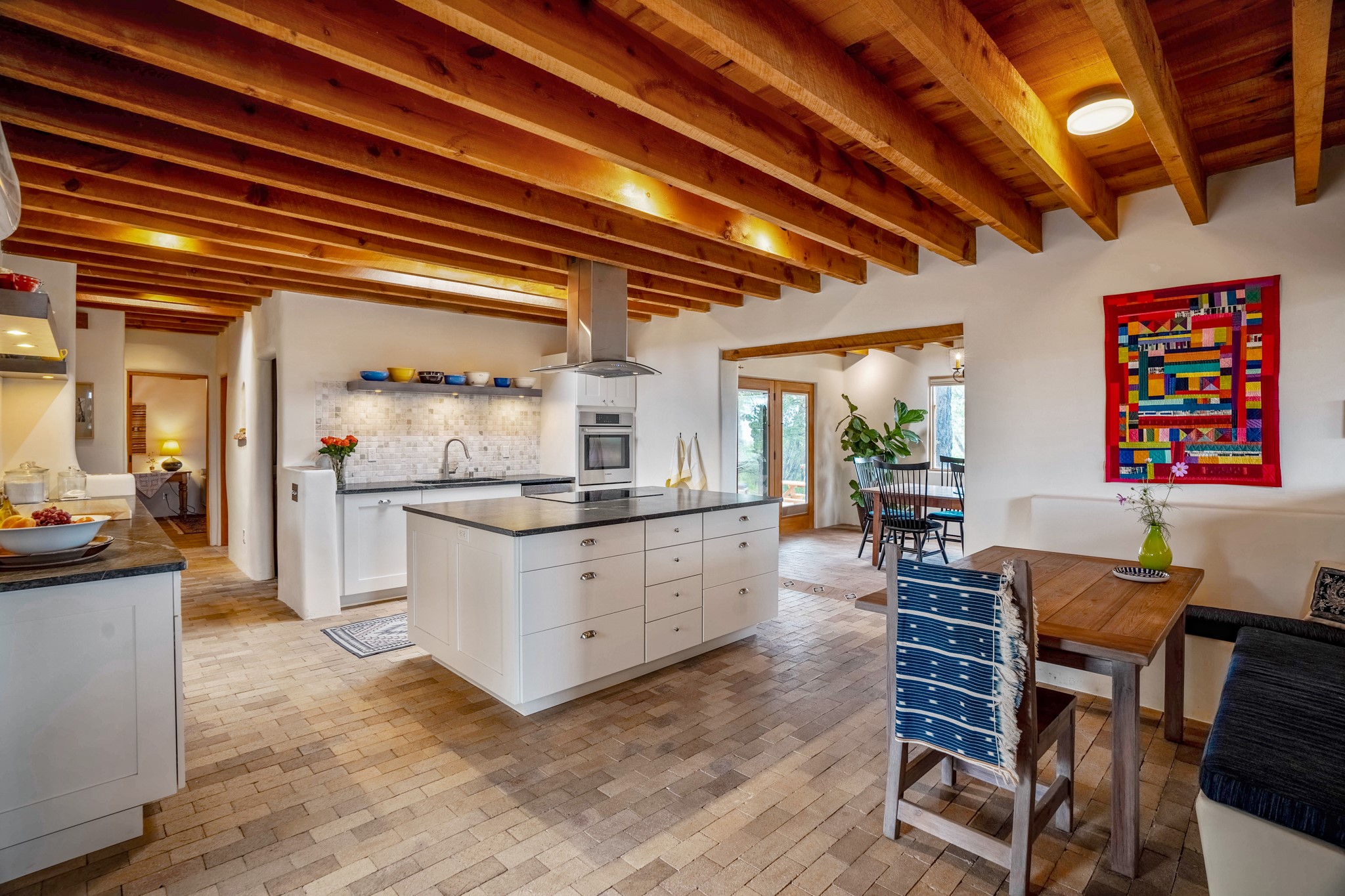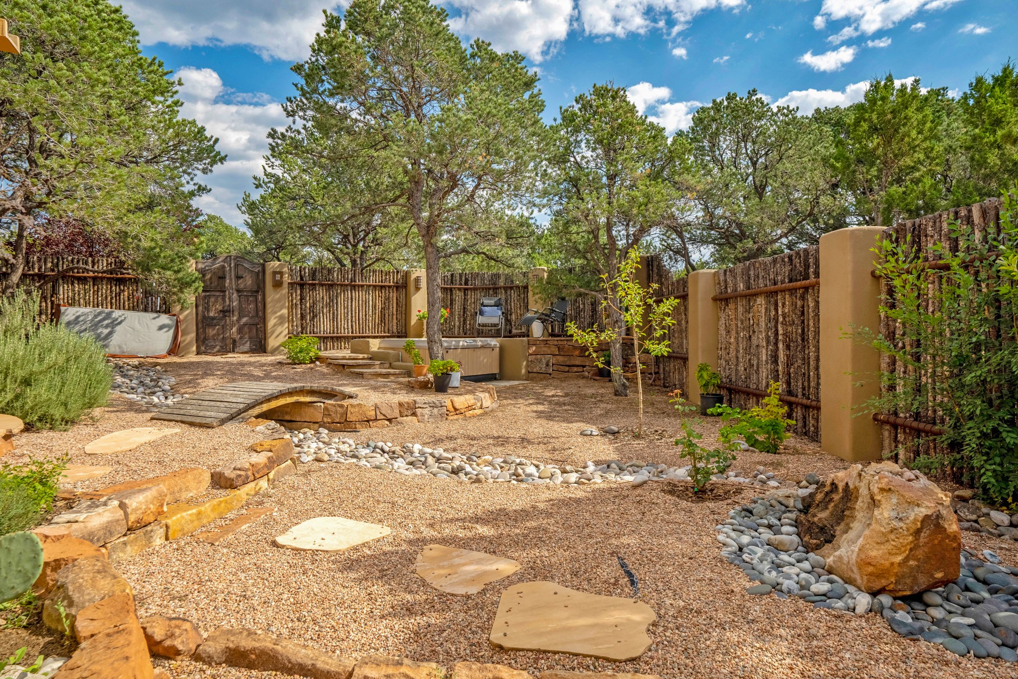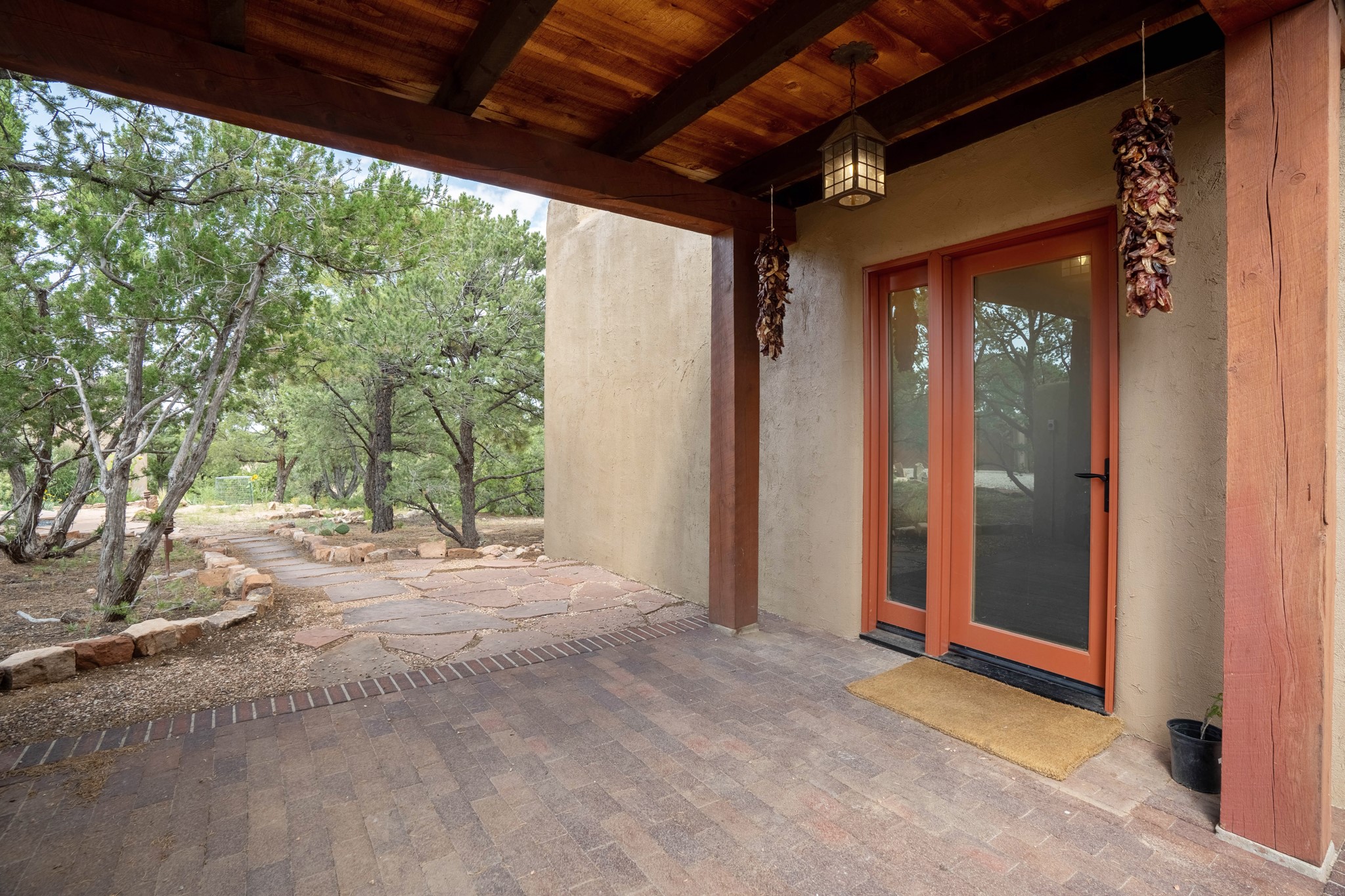A beautifully renovated House /Guest House with panoramic views in Vista Redonda! 20 minutes to downtown Santa Fe and yet worlds away, this peaceful property has a soulful, organic feel that is 'home'. Sited on 5 view-filled acres, the 2900 sq. ft. MAIN HOUSE has a large owner's suite with a private den, private office and a spa-like bathroom. The guest bedroom is in its own wing of the house, offering great privacy with direct access to the lovely front courtyard. The kitchen was completely remodeled in 2020 with custom white cabinetry, soapstone countertops and a large island. Open to the kitchen, but maintaining a sense of intimacy, the main living area has wide plank pine flooring, a kiva fireplace and more views! The grounds are whimsical with beautiful landscaping, stone paths and a glorious hot tub for sunset viewing. GUEST HOUSE: The 1050 sq. ft. 1 bed/1 bath guest house has a newly renovated kitchen and is an absolute treasure, mirroring the same organic aesthetic of the main house. With a new roof in 2020 on the original part of the main house, community water and endless amounts of love and care, this beloved property is now available for a lucky homeowner!