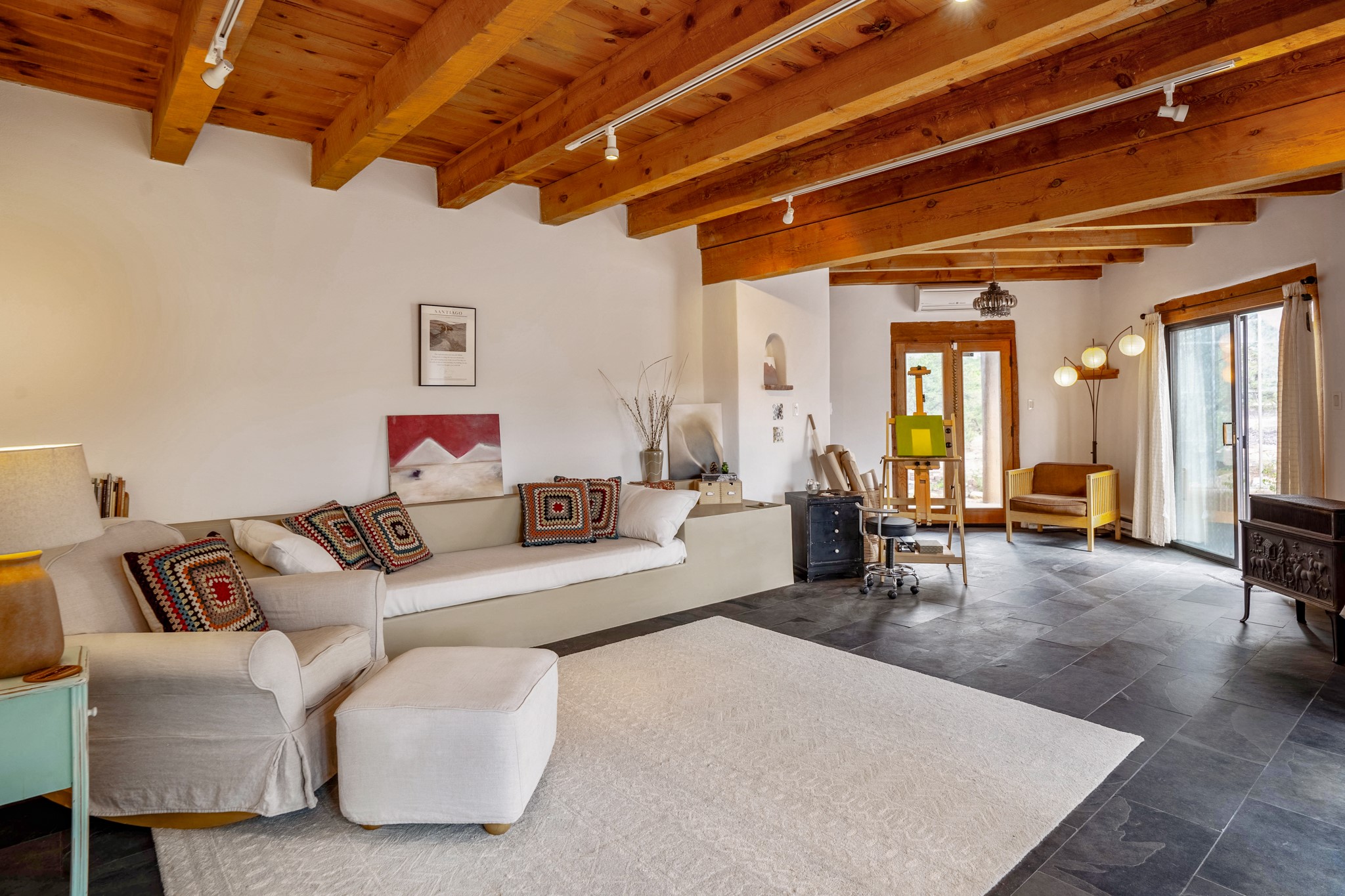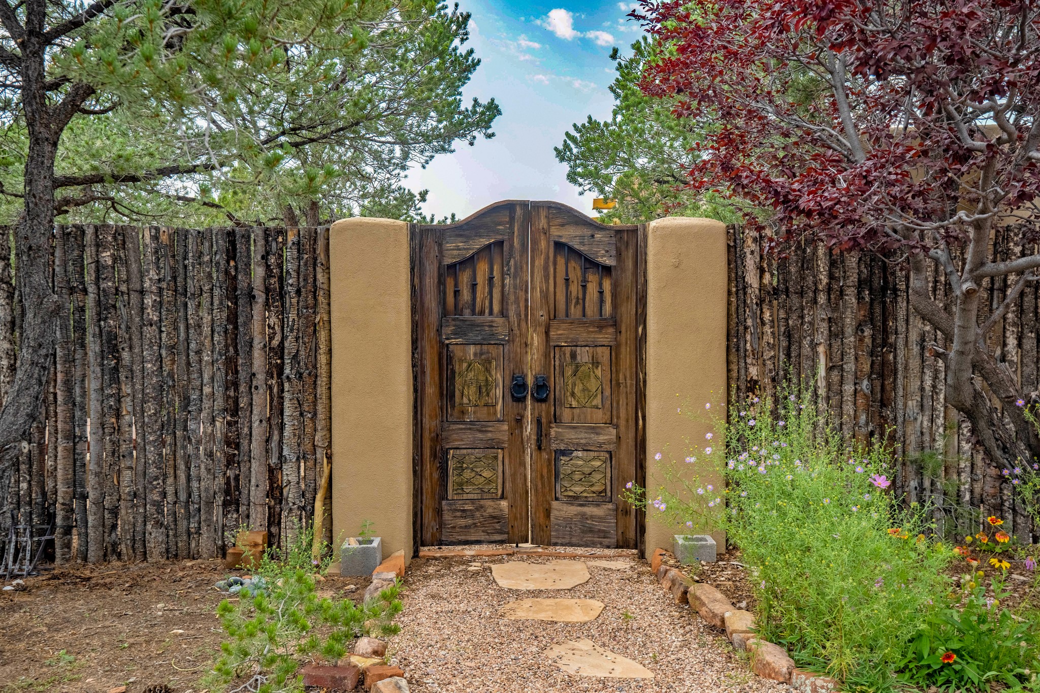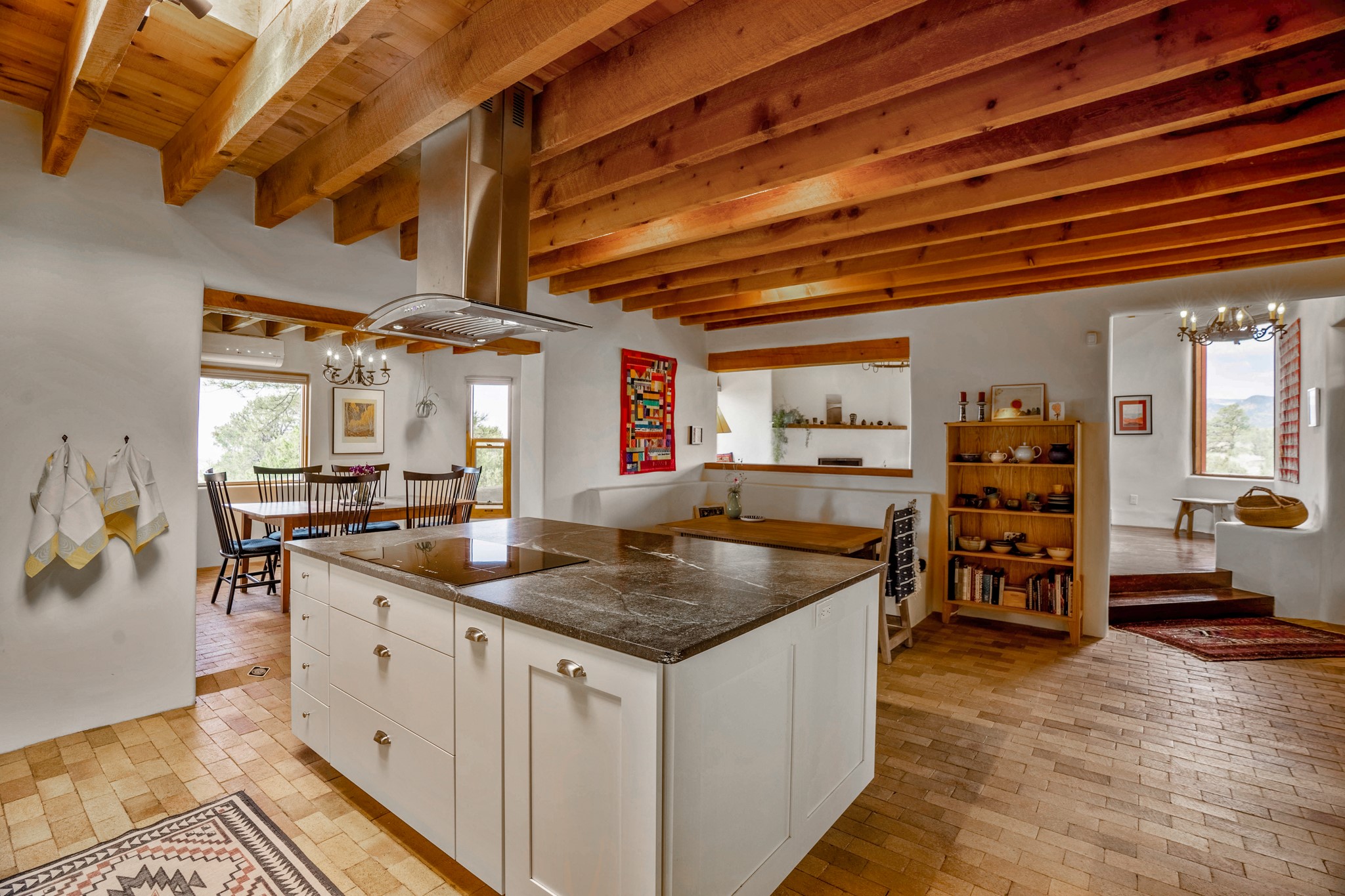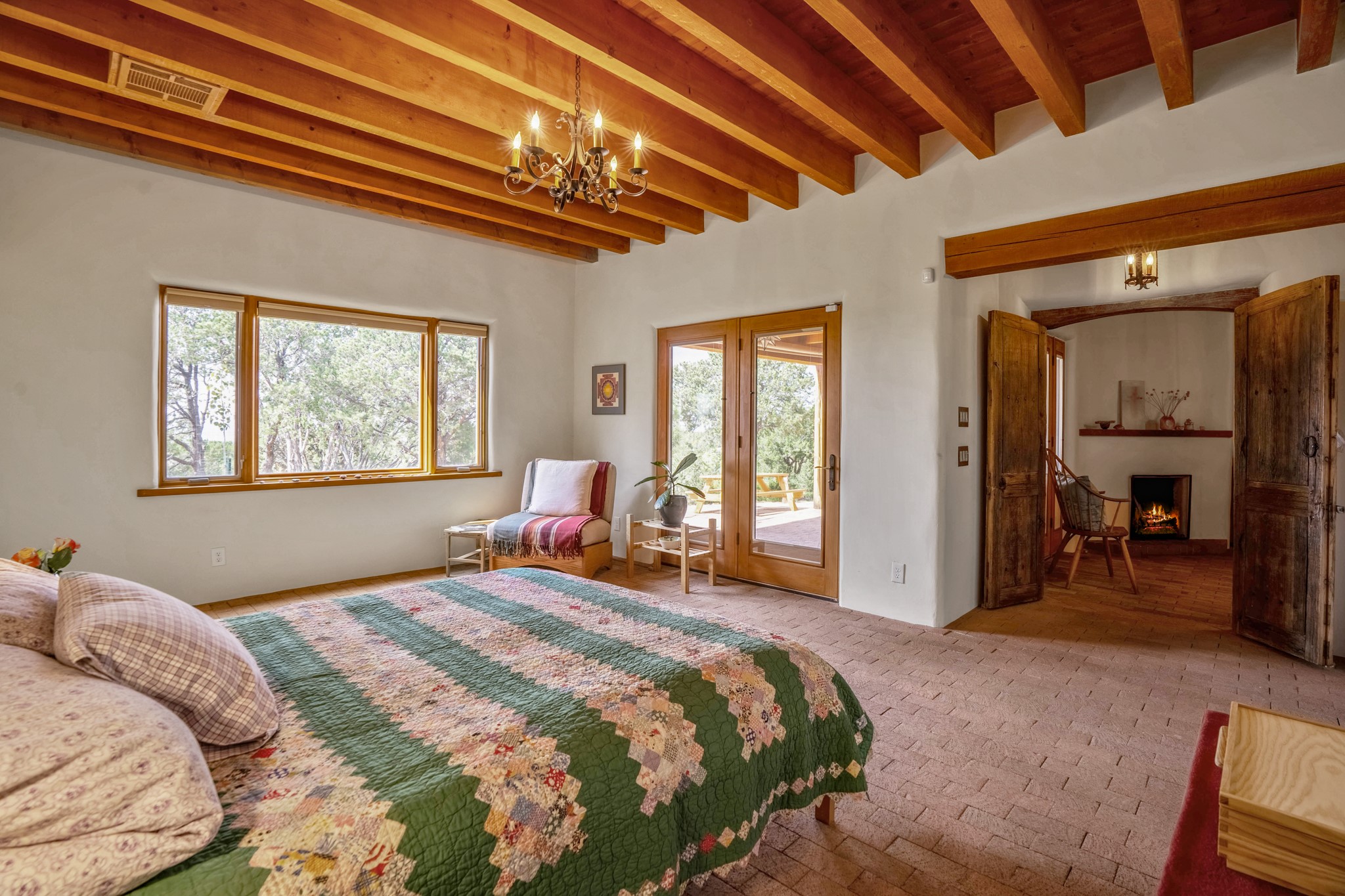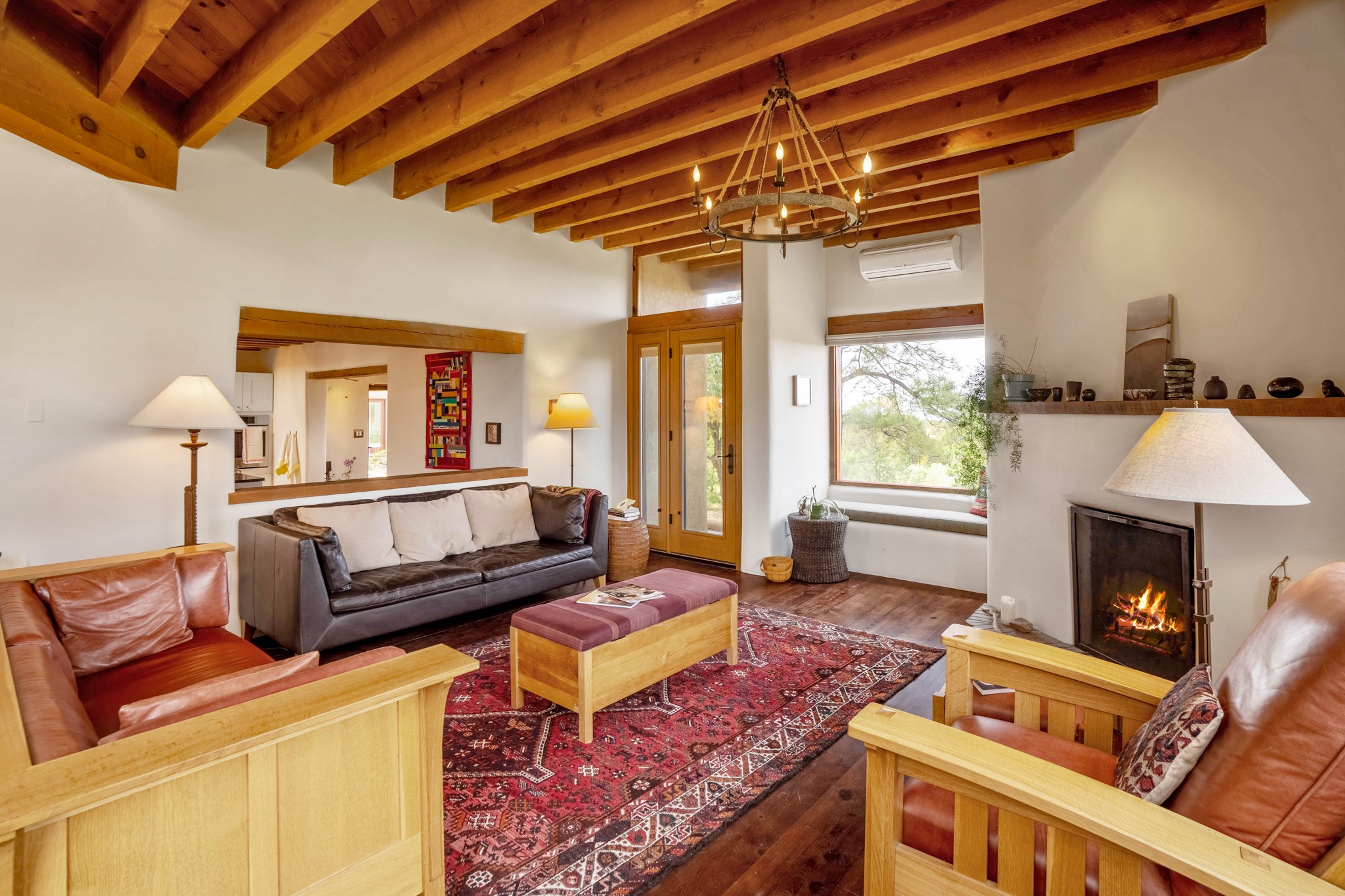 A beautifully renovated House /Guest House with panoramic views in Vista Redonda! 20 minutes to downtown Santa Fe and yet worlds away, this peaceful property has a soulful, organic feel that is 'home'. Sited on 5 view-filled acres, the 2900 sq. ft. MAIN HOUSE has a large owner's suite with a private den, private office and a spa-like bathroom. The guest bedroom is in its own wing of the house, offering great privacy with direct access to the lovely front courtyard. The kitchen was completely remodeled in 2020 with custom white cabinetry, soapstone countertops and a large island. Open to the kitchen, but maintaining a sense of intimacy, the main living area has wide plank pine flooring, a kiva fireplace and more views! The grounds are whimsical with beautiful landscaping, stone paths and a glorious hot tub for sunset viewing. GUEST HOUSE: The 1050 sq. ft. 1 bed/1 bath guest house has a newly renovated kitchen and is an absolute treasure, mirroring the same organic aesthetic of the main house. With a new roof in 2020 on the original part of the main house, community water and endless amounts of love and care, this beloved property is now available for a lucky homeowner!