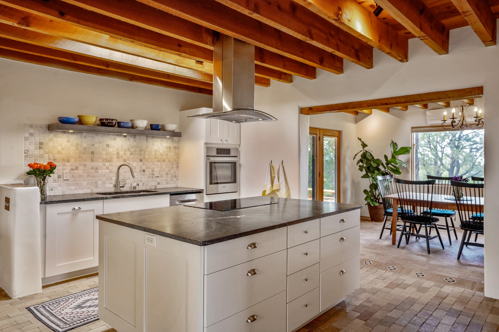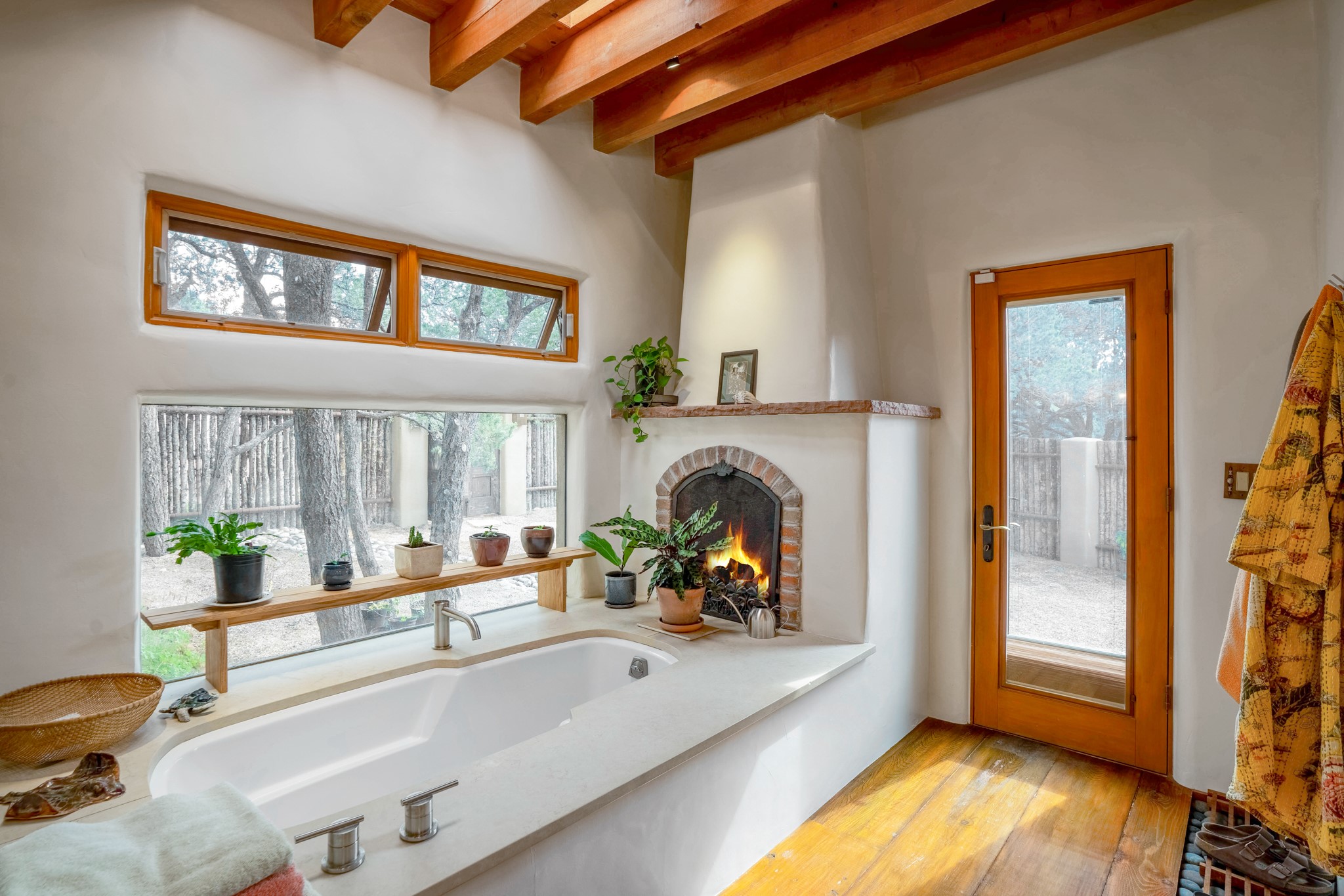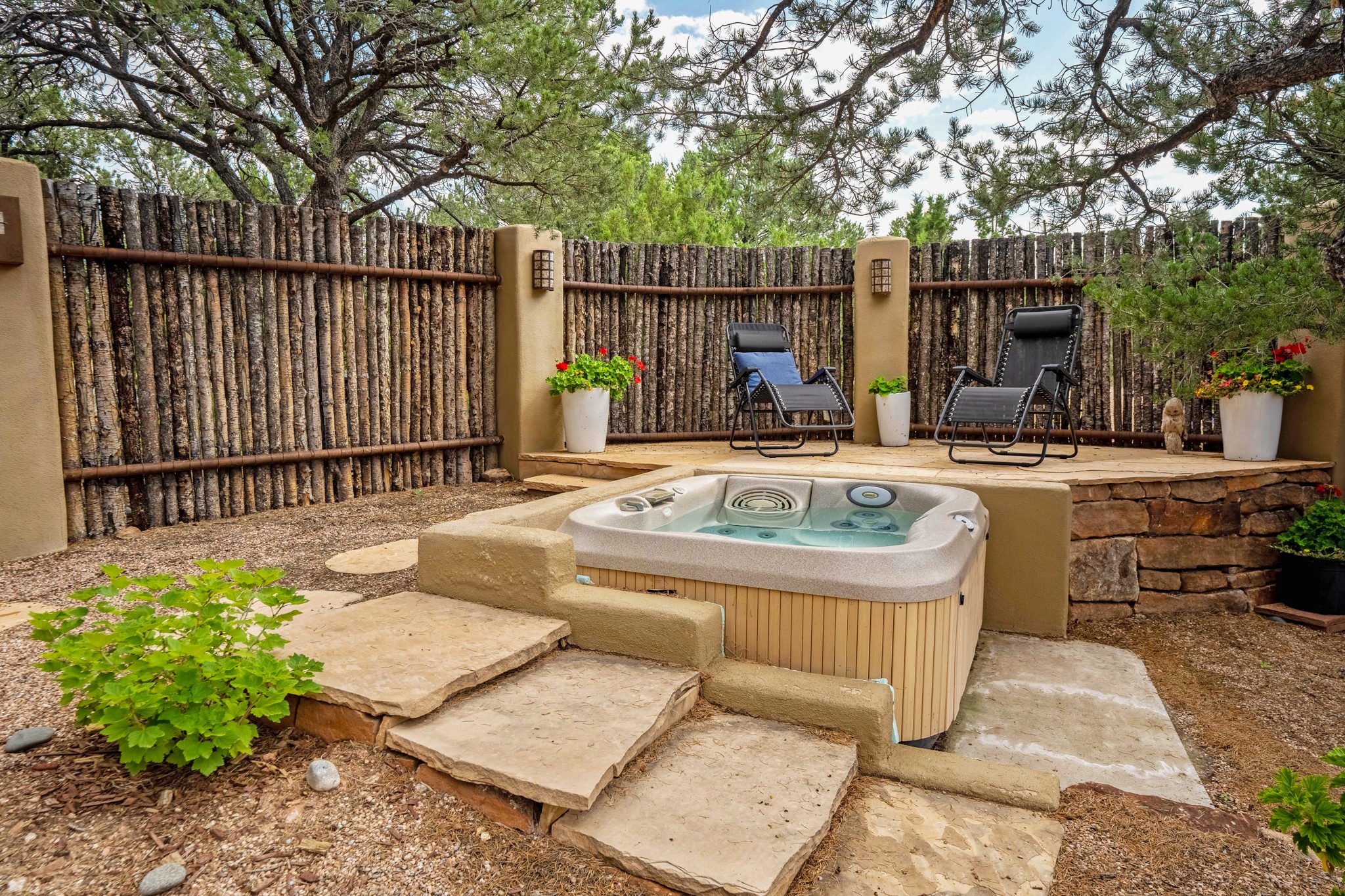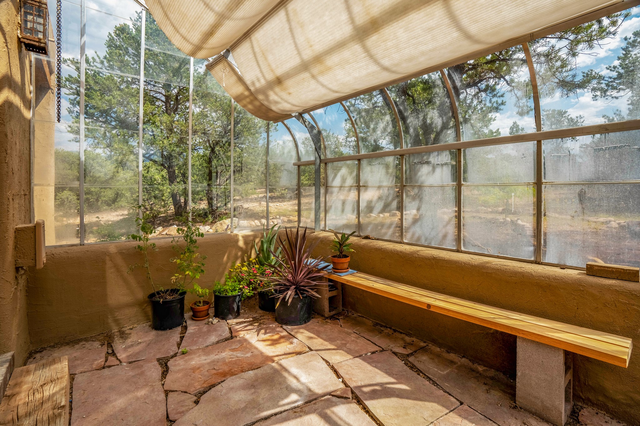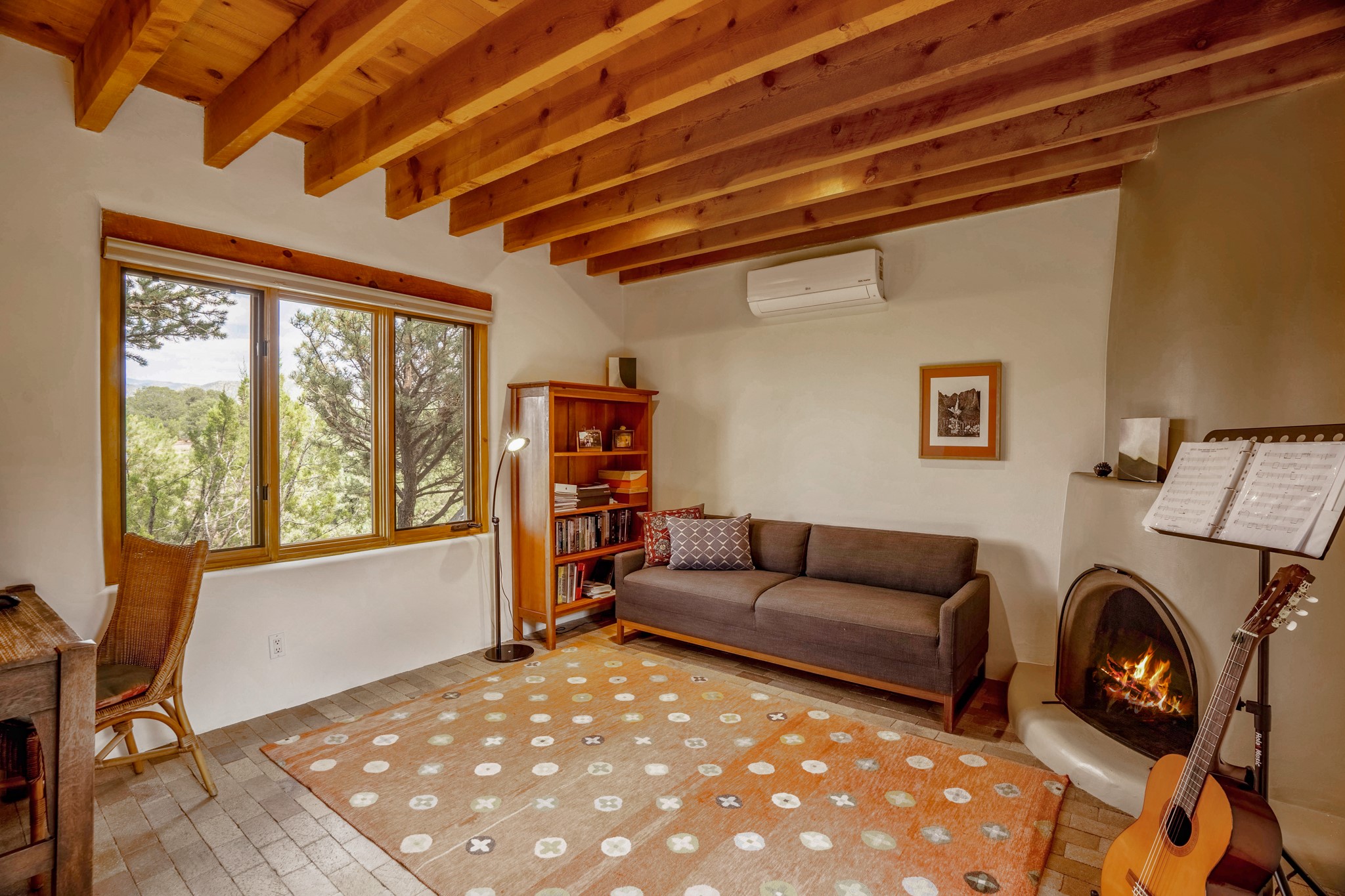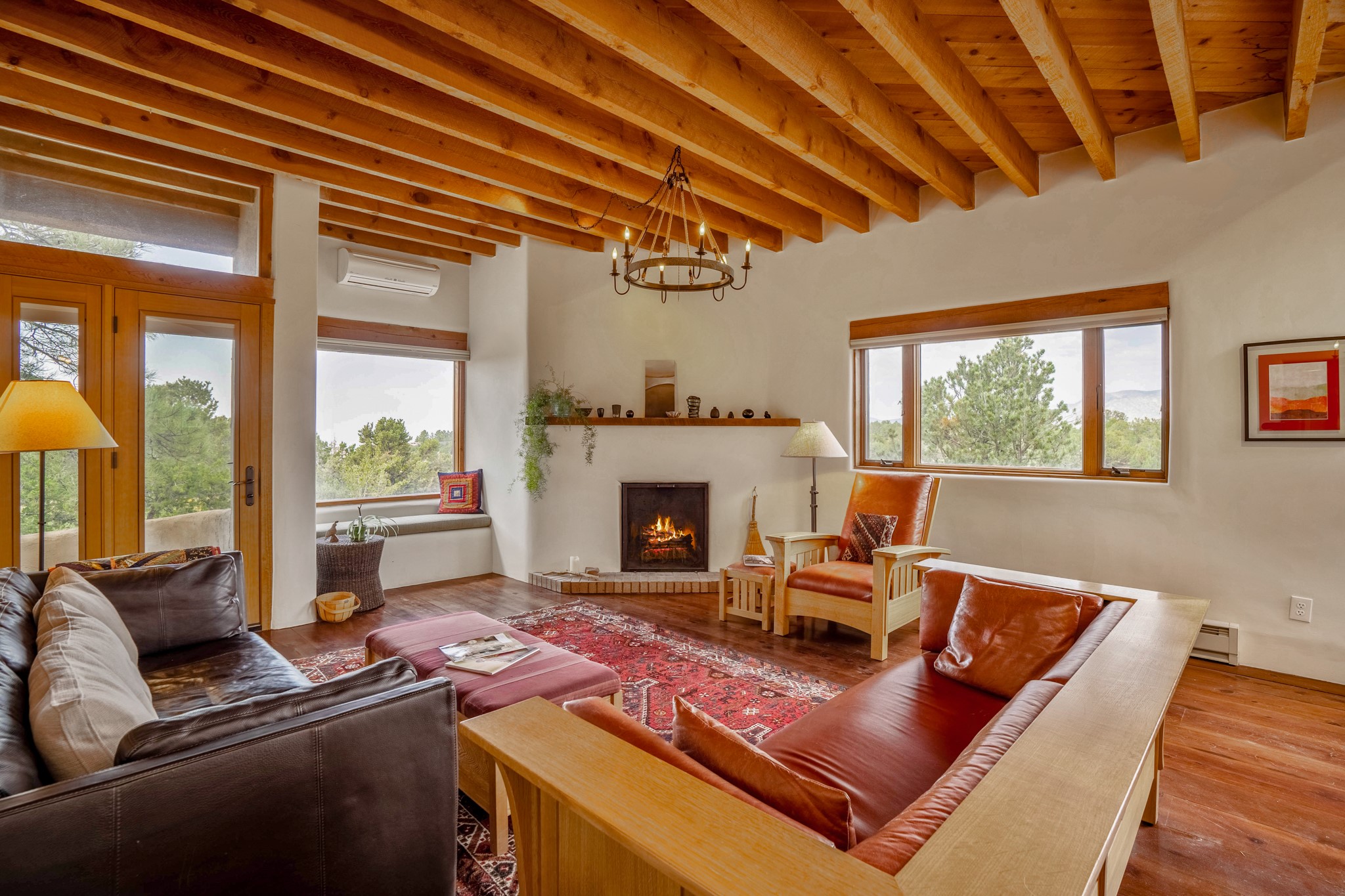 A beautifully renovated House /Guest House with panoramic views in Vista Redonda! 20 minutes to downtown Santa Fe and yet worlds away, this peaceful property has a soulful, organic feel that is 'home'. Sited on 5 view-filled acres, the 2900 sq. ft. MAIN HOUSE has a large owner's suite with a private den, private office and a spa-like bathroom. The guest bedroom is in its own wing of the house, offering great privacy with direct access to the lovely front courtyard. The kitchen was completely remodeled in 2020 with custom white cabinetry, soapstone countertops and a large island. Open to the kitchen, but maintaining a sense of intimacy, the main living area has wide plank pine flooring, a kiva fireplace and more views! The grounds are whimsical with beautiful landscaping, stone paths and a glorious hot tub for sunset viewing. GUEST HOUSE: The 1050 sq. ft. 1 bed/1 bath guest house has a newly renovated kitchen and is an absolute treasure, mirroring the same organic aesthetic of the main house. With a new roof in 2020 on the original part of the main house, community water and endless amounts of love and care, this beloved property is now available for a lucky homeowner!