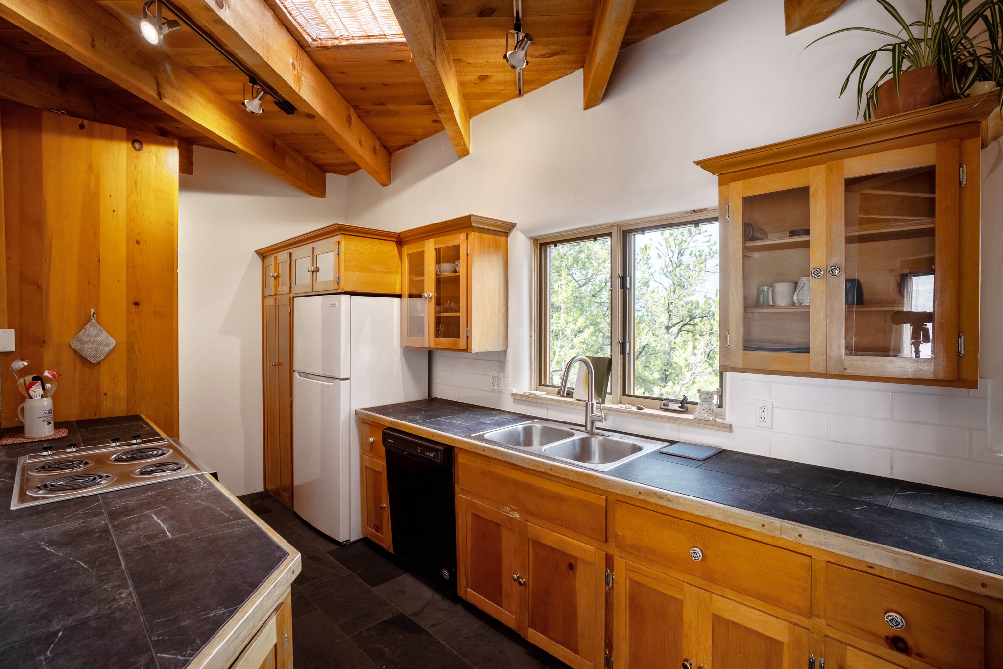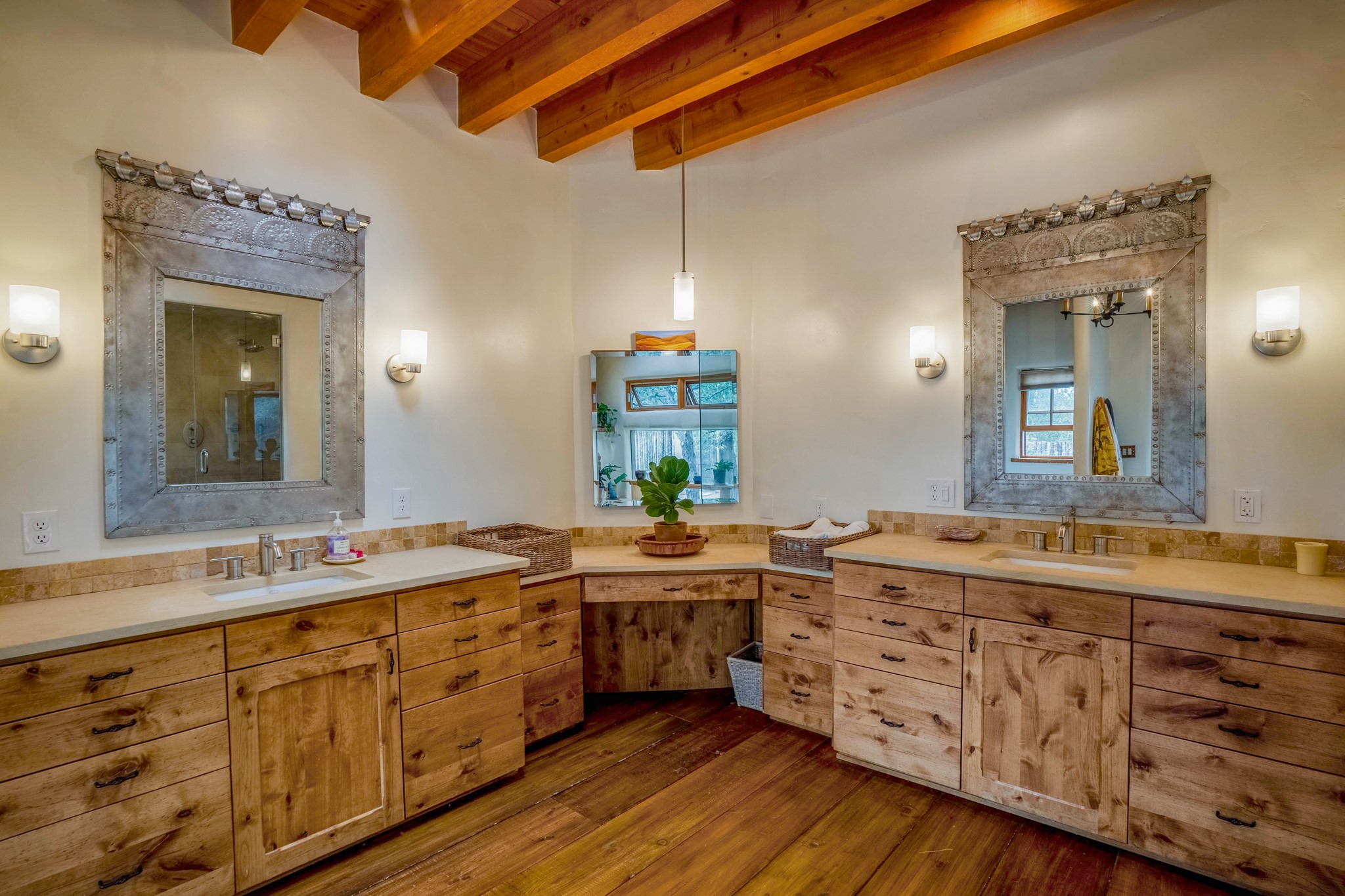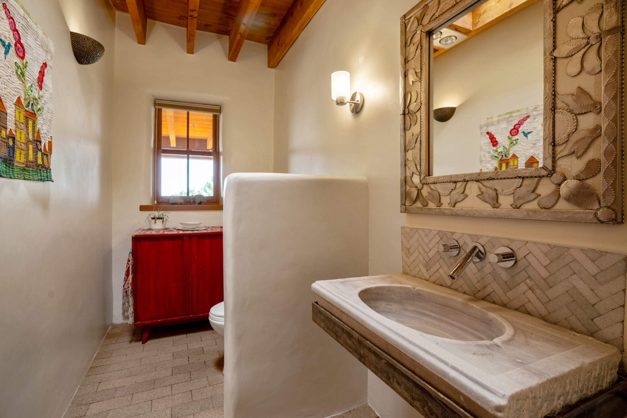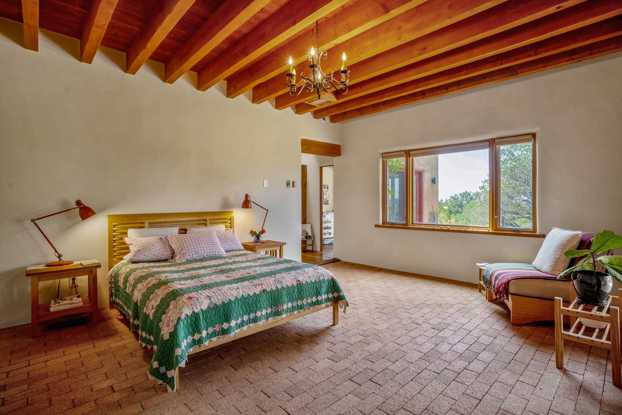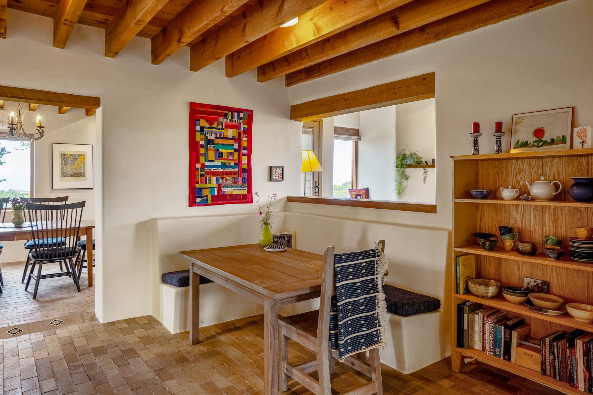 A beautifully renovated House /Guest House with panoramic views in Vista Redonda! 20 minutes to downtown Santa Fe and yet worlds away, this peaceful property has a soulful, organic feel that is 'home'. Sited on 5 view-filled acres, the 2900 sq. ft. MAIN HOUSE has a large owner's suite with a private den, private office and a spa-like bathroom. The guest bedroom is in its own wing of the house, offering great privacy with direct access to the lovely front courtyard. The kitchen was completely remodeled in 2020 with custom white cabinetry, soapstone countertops and a large island. Open to the kitchen, but maintaining a sense of intimacy, the main living area has wide plank pine flooring, a kiva fireplace and more views! The grounds are whimsical with beautiful landscaping, stone paths and a glorious hot tub for sunset viewing. GUEST HOUSE: The 1050 sq. ft. 1 bed/1 bath guest house has a newly renovated kitchen and is an absolute treasure, mirroring the same organic aesthetic of the main house. With a new roof in 2020 on the original part of the main house, community water and endless amounts of love and care, this beloved property is now available for a lucky homeowner!