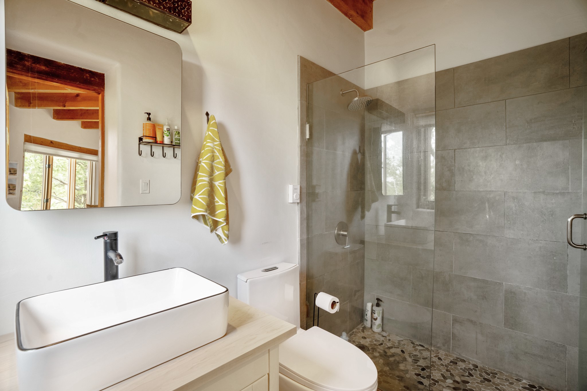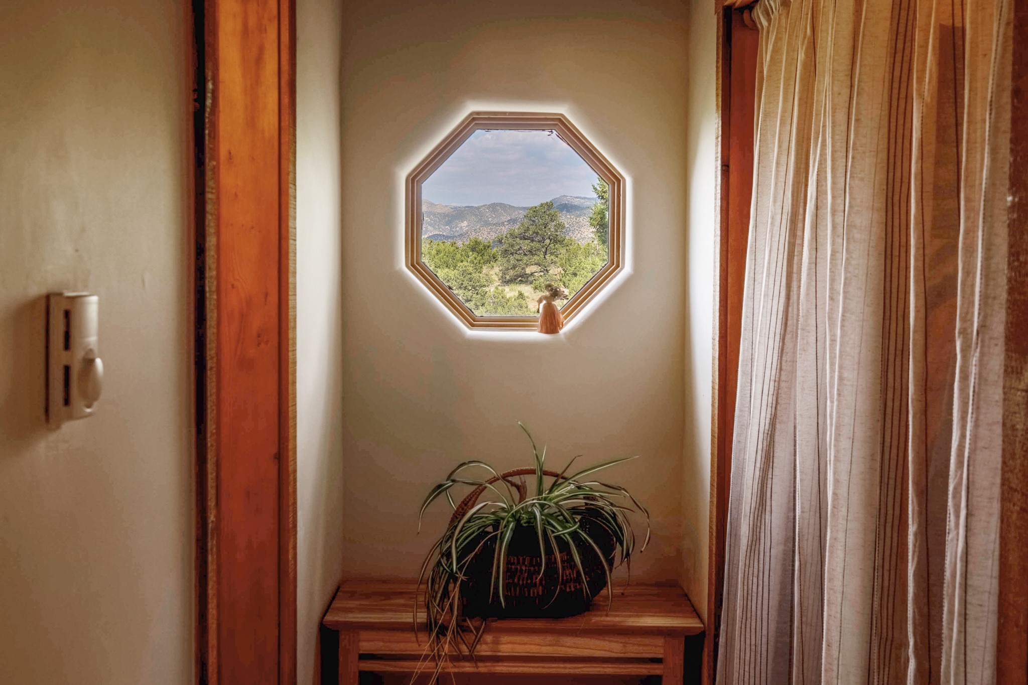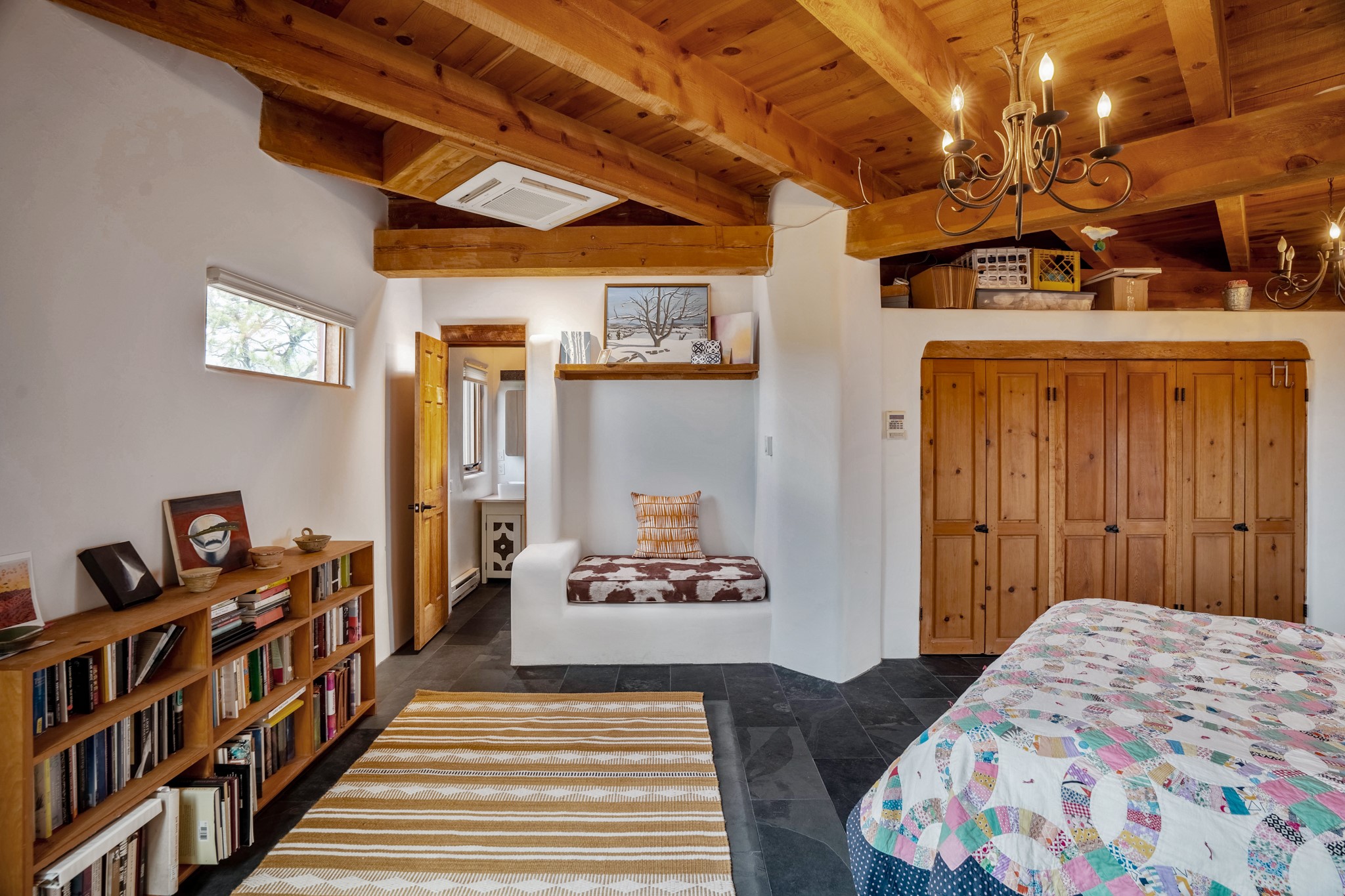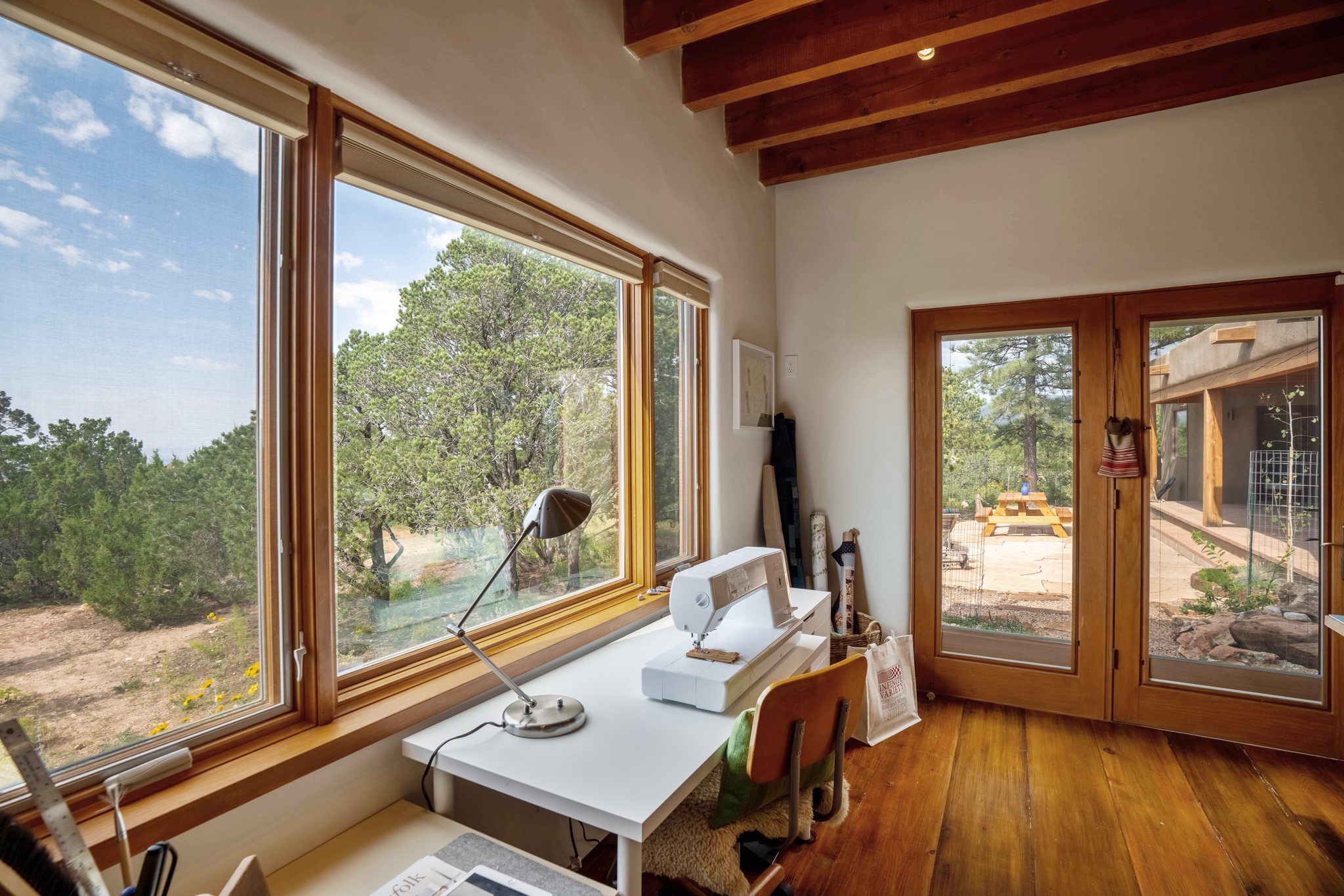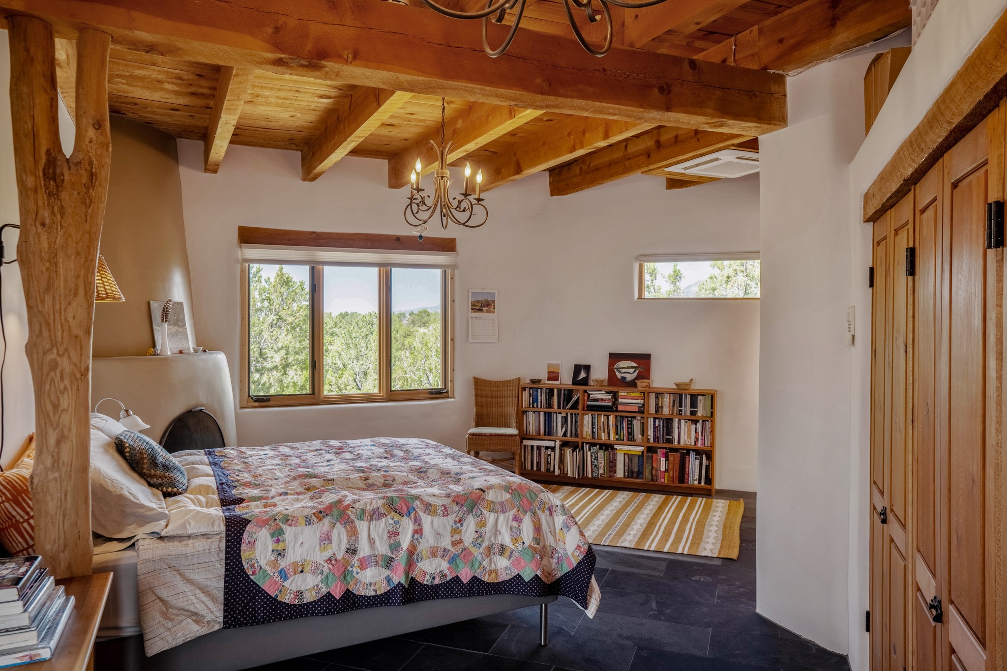 A beautifully renovated House /Guest House with panoramic views in Vista Redonda! 20 minutes to downtown Santa Fe and yet worlds away, this peaceful property has a soulful, organic feel that is 'home'. Sited on 5 view-filled acres, the 2900 sq. ft. MAIN HOUSE has a large owner's suite with a private den, private office and a spa-like bathroom. The guest bedroom is in its own wing of the house, offering great privacy with direct access to the lovely front courtyard. The kitchen was completely remodeled in 2020 with custom white cabinetry, soapstone countertops and a large island. Open to the kitchen, but maintaining a sense of intimacy, the main living area has wide plank pine flooring, a kiva fireplace and more views! The grounds are whimsical with beautiful landscaping, stone paths and a glorious hot tub for sunset viewing. GUEST HOUSE: The 1050 sq. ft. 1 bed/1 bath guest house has a newly renovated kitchen and is an absolute treasure, mirroring the same organic aesthetic of the main house. With a new roof in 2020 on the original part of the main house, community water and endless amounts of love and care, this beloved property is now available for a lucky homeowner!