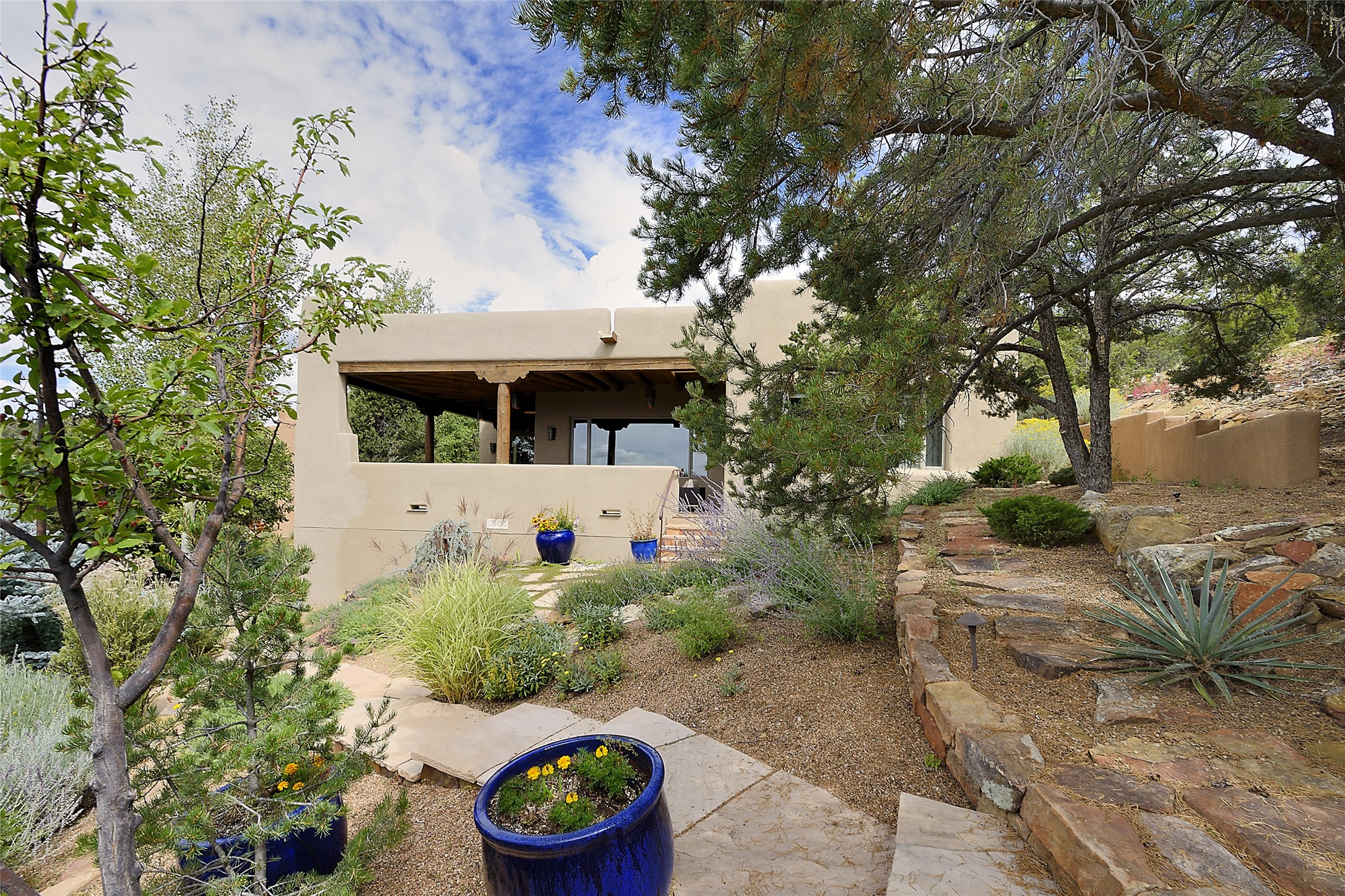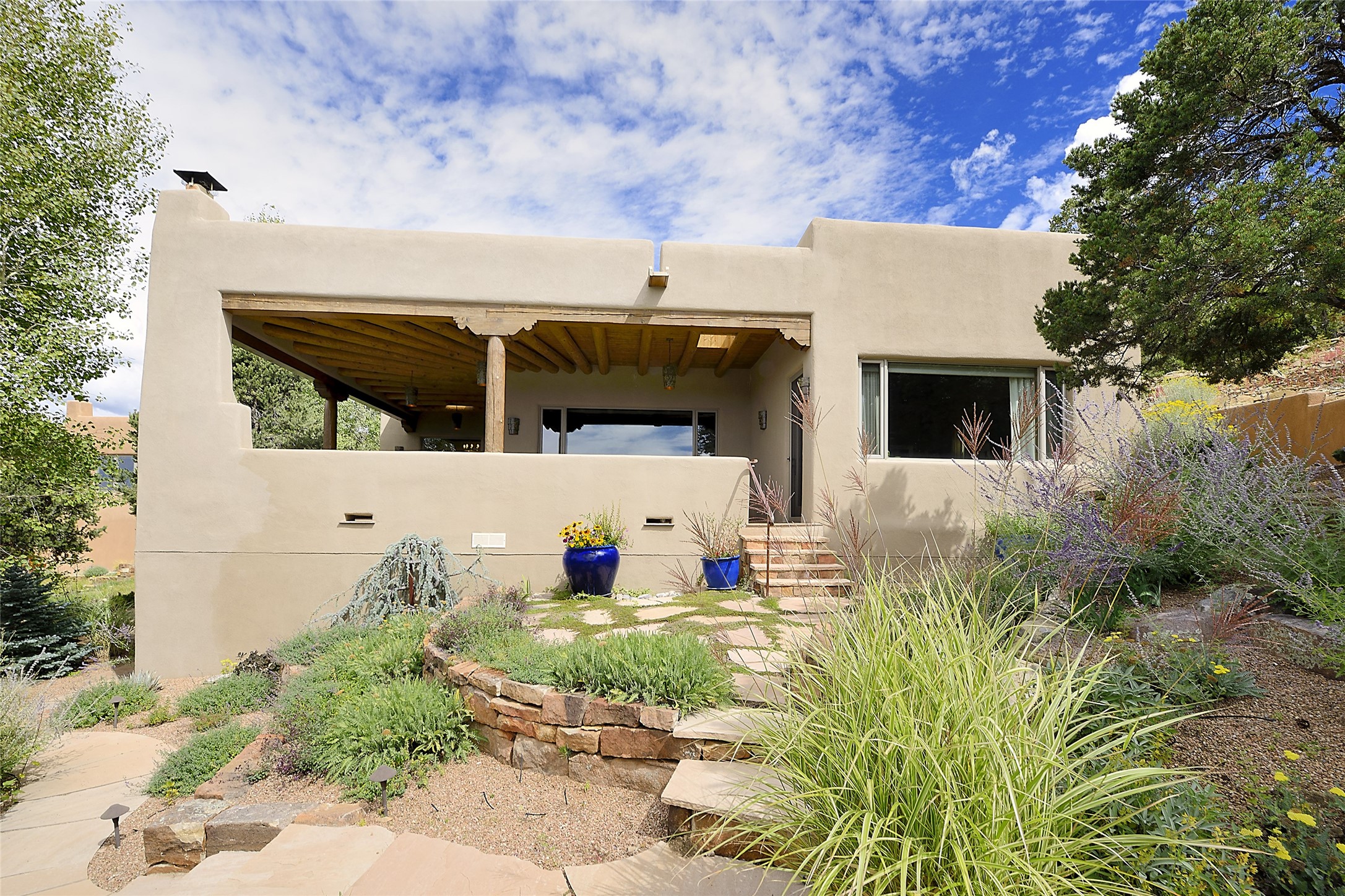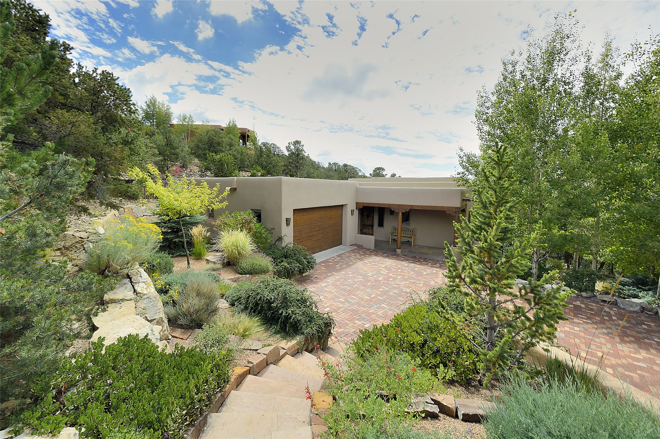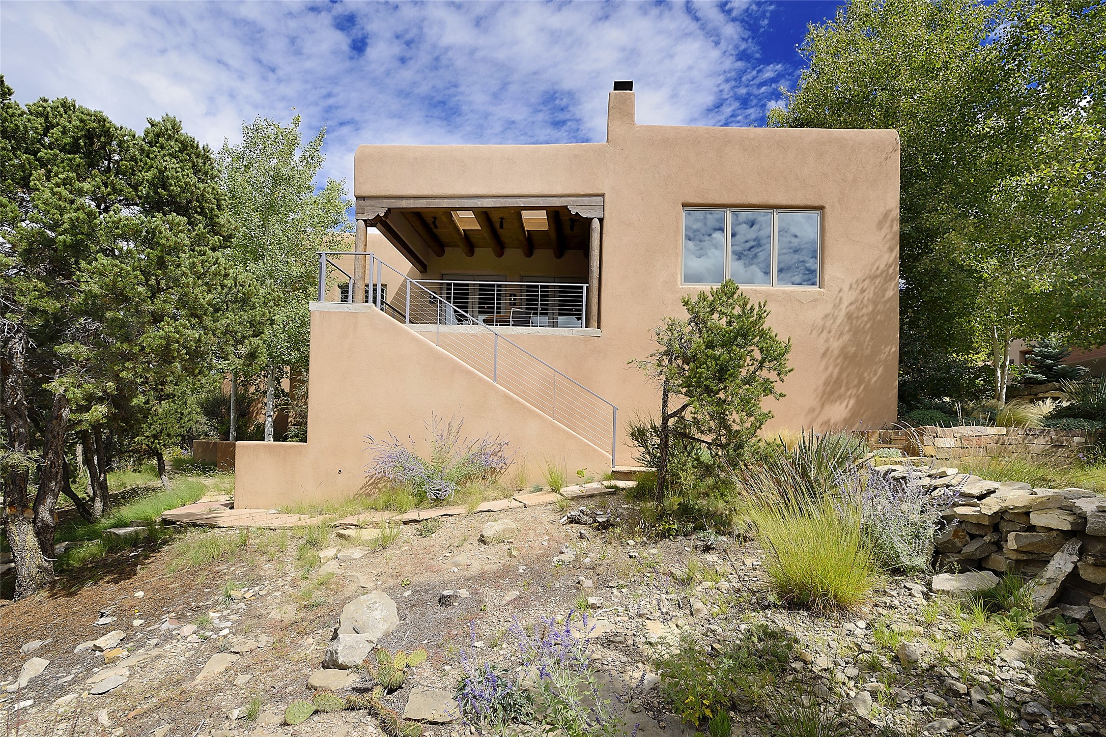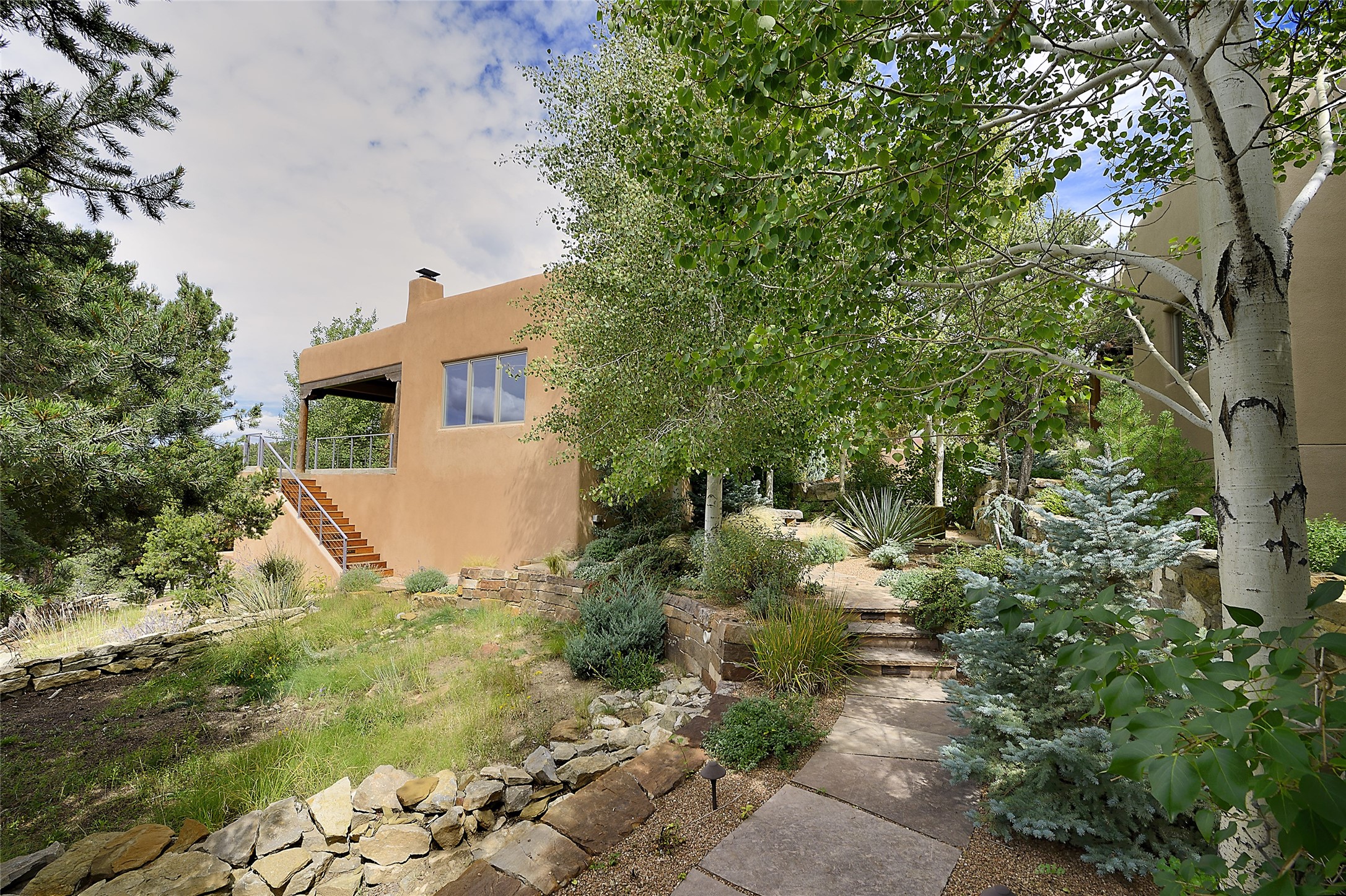 This is an exceptional offering in the gated and sought after High Summit. This compound estateconsists of a 3 Bedroom , 2.5 Bath main home built in 2009 and a 2 Bedroom, 2 Bath plus office/studioguest home completed in 2013. The homes are on a combined .7 acre lot and are nicely separated forprivacy with their own direct entry 2 car garages. The covered portals flow from the living spaces andoffer wonderful sunset views to the South and West. Upon entering you immediately notice the highend finishes and features such as nichos, vigas, stone floors and custom doors & cabinetry. The kitchensoffer all the conveniences with quality appliances and islands and bars for gathering and entertaining.Central forced air heating and air conditioning in the guest house and radiant in-floor heating andevaporative cooling in the main house keep things comfortable year-round. The grounds arewonderfully landscaped and planted featuring tall aspens, pinons and water features. This gatedcommunity with a sensible HOA is a stone's throw away from Ten Thousand waves and 12 miles toSanta Fe Ski Basin, yet only 5 miles away from the heart of downtown, Canyon road, restaurants and artgalleries.
