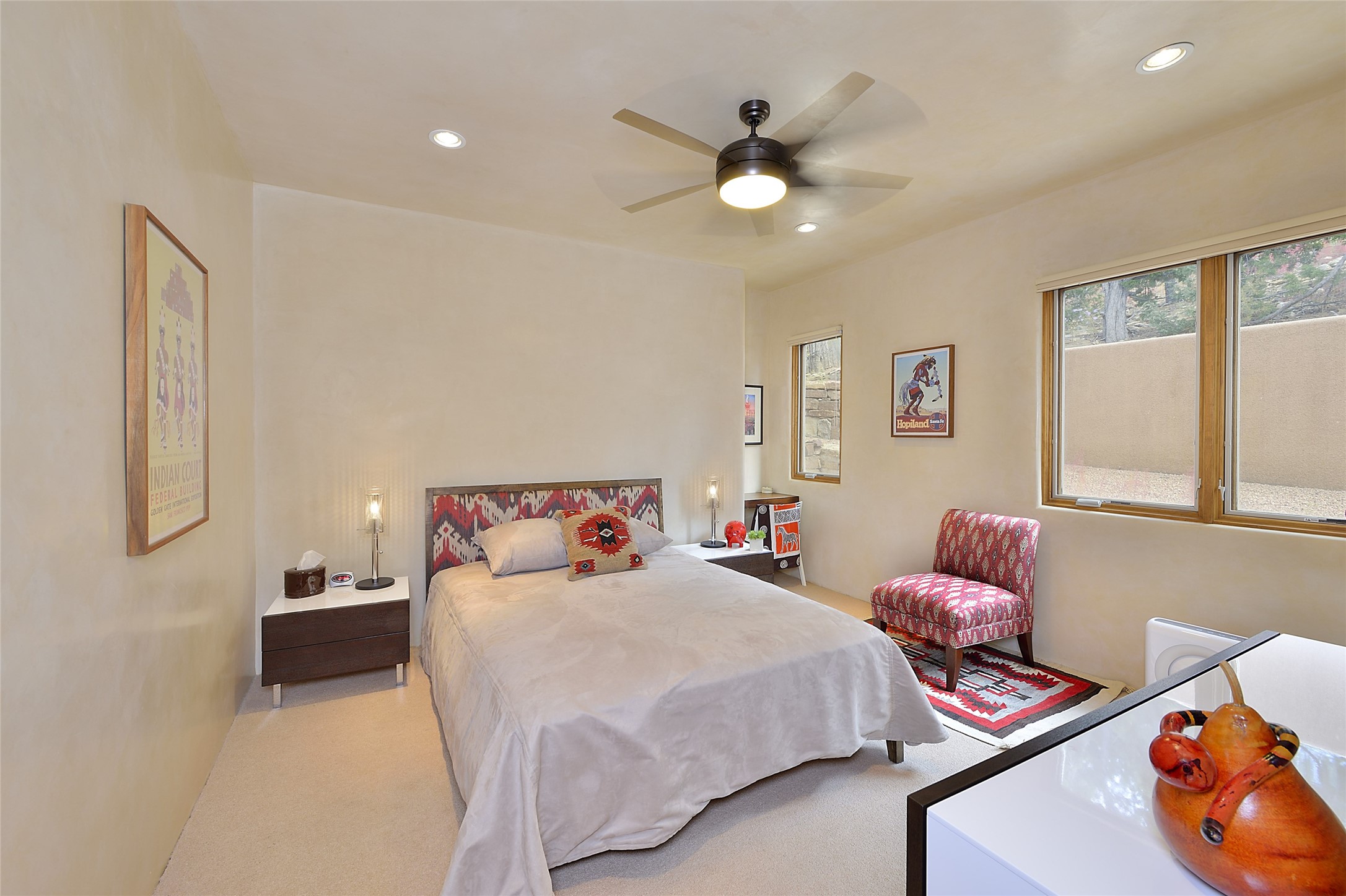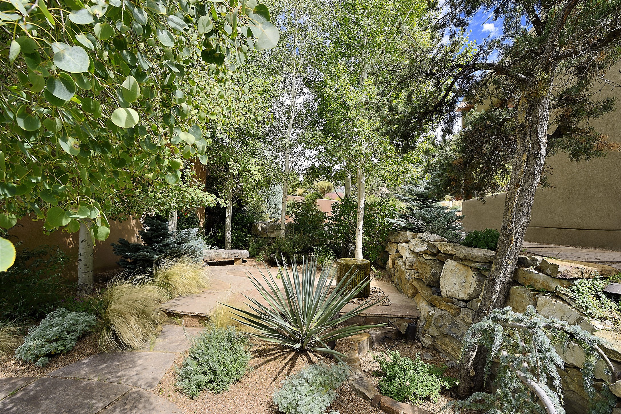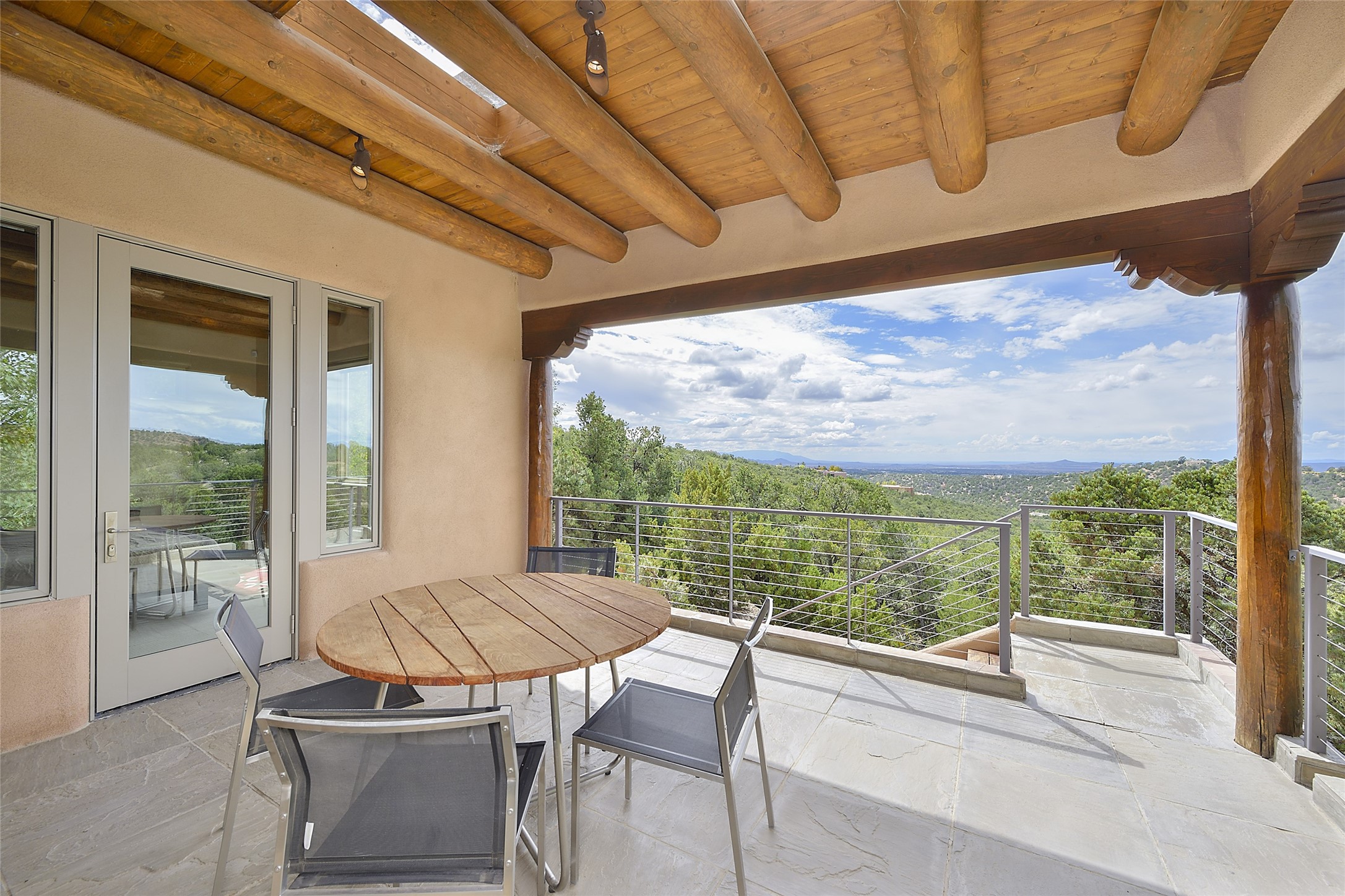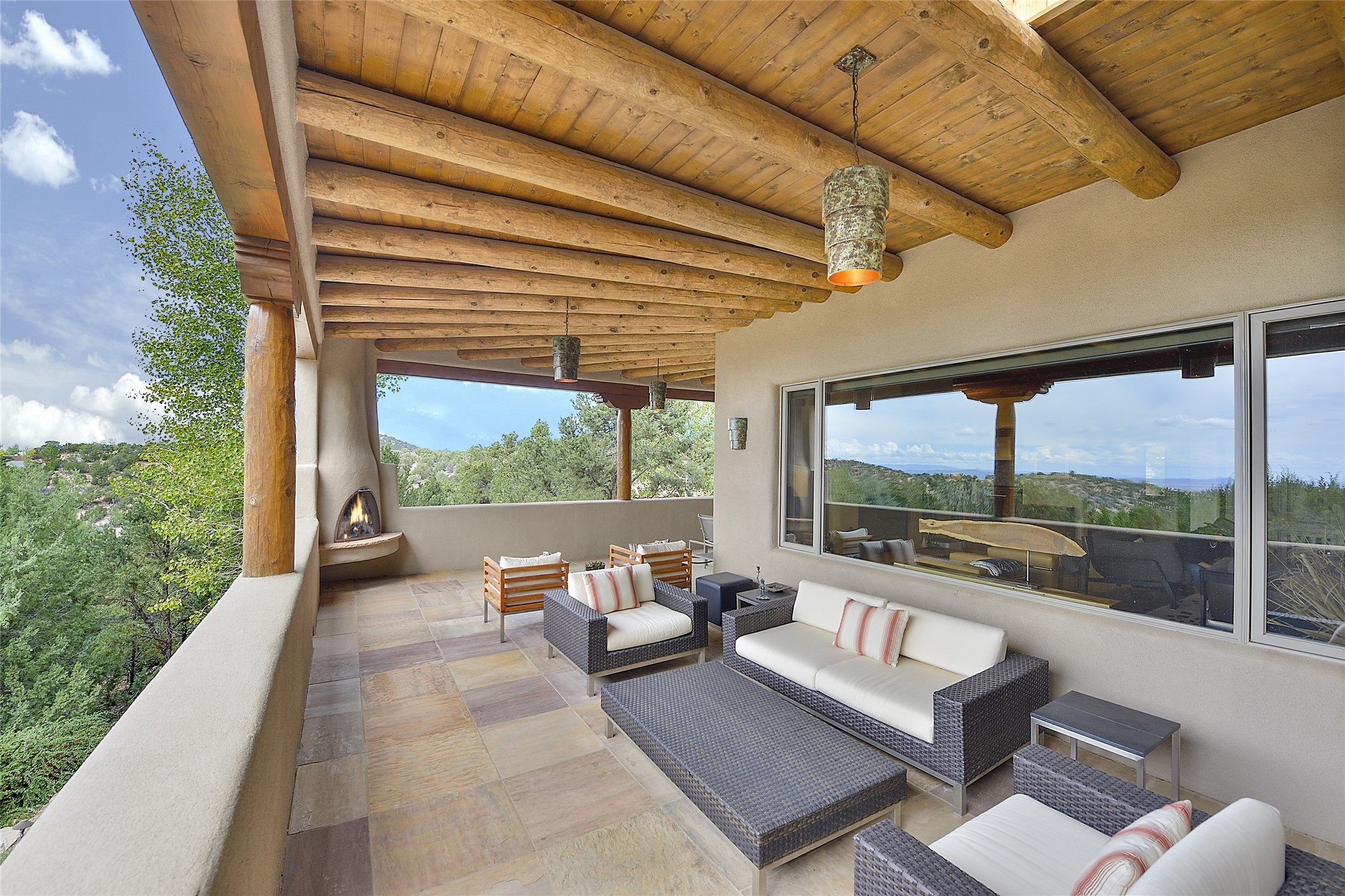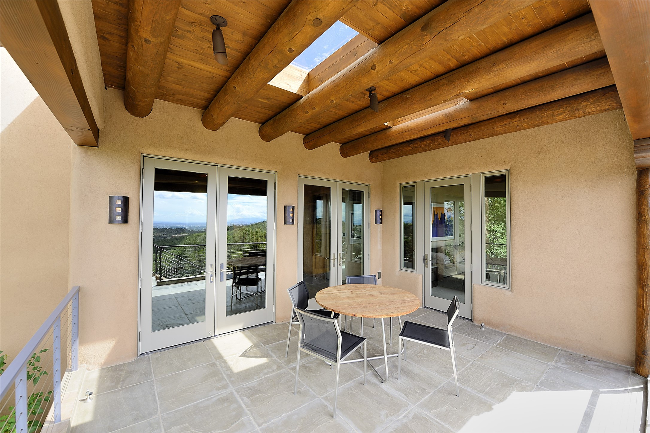 This is an exceptional offering in the gated and sought after High Summit. This compound estateconsists of a 3 Bedroom , 2.5 Bath main home built in 2009 and a 2 Bedroom, 2 Bath plus office/studioguest home completed in 2013. The homes are on a combined .7 acre lot and are nicely separated forprivacy with their own direct entry 2 car garages. The covered portals flow from the living spaces andoffer wonderful sunset views to the South and West. Upon entering you immediately notice the highend finishes and features such as nichos, vigas, stone floors and custom doors & cabinetry. The kitchensoffer all the conveniences with quality appliances and islands and bars for gathering and entertaining.Central forced air heating and air conditioning in the guest house and radiant in-floor heating andevaporative cooling in the main house keep things comfortable year-round. The grounds arewonderfully landscaped and planted featuring tall aspens, pinons and water features. This gatedcommunity with a sensible HOA is a stone's throw away from Ten Thousand waves and 12 miles toSanta Fe Ski Basin, yet only 5 miles away from the heart of downtown, Canyon road, restaurants and artgalleries.