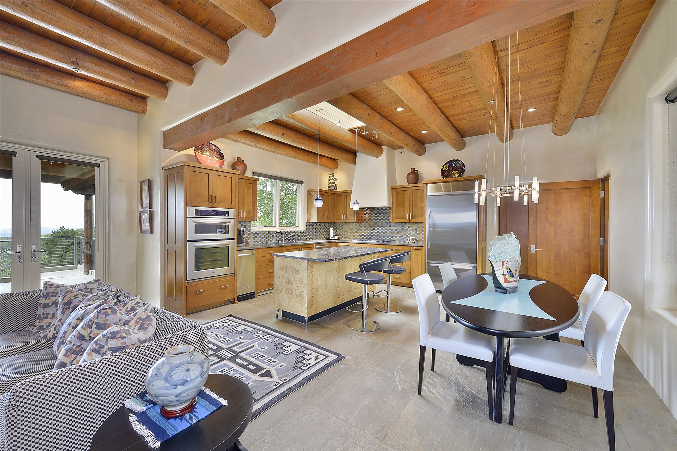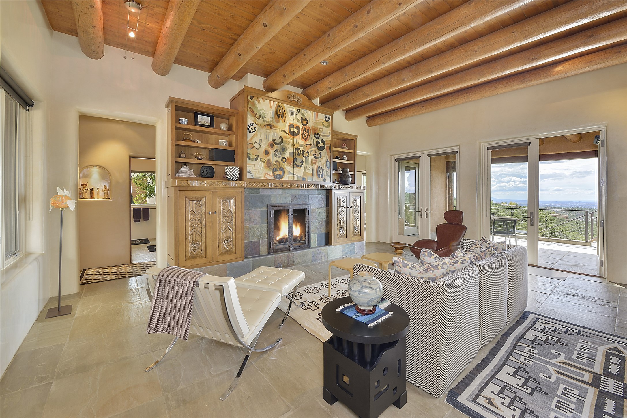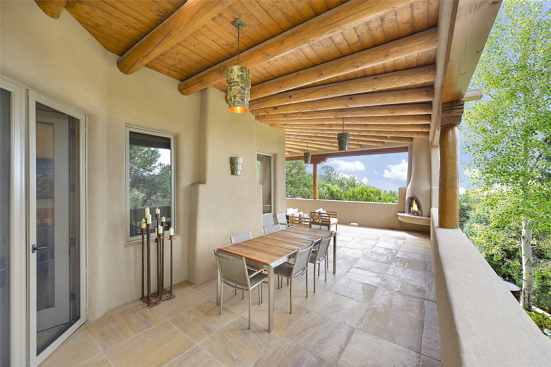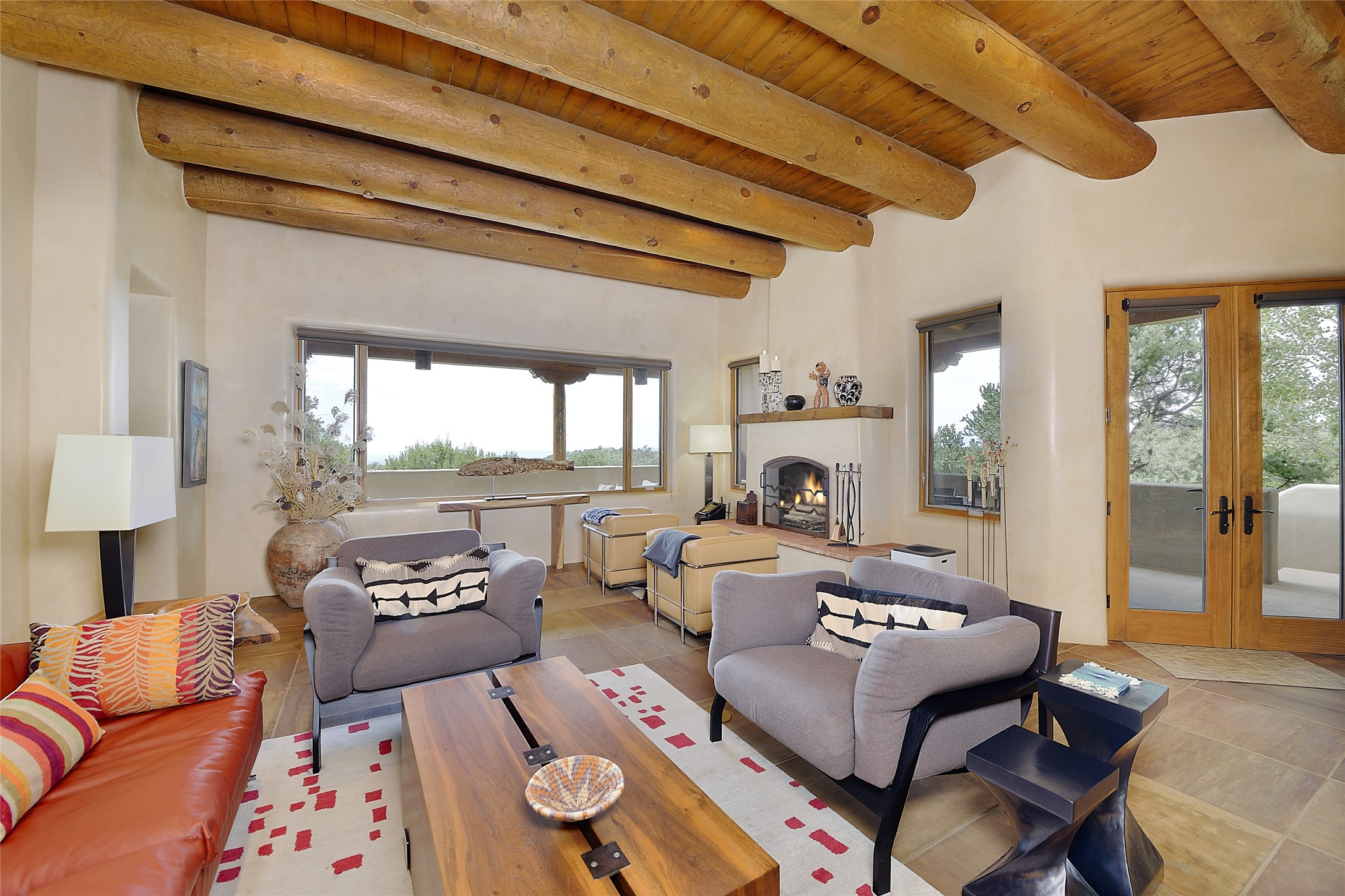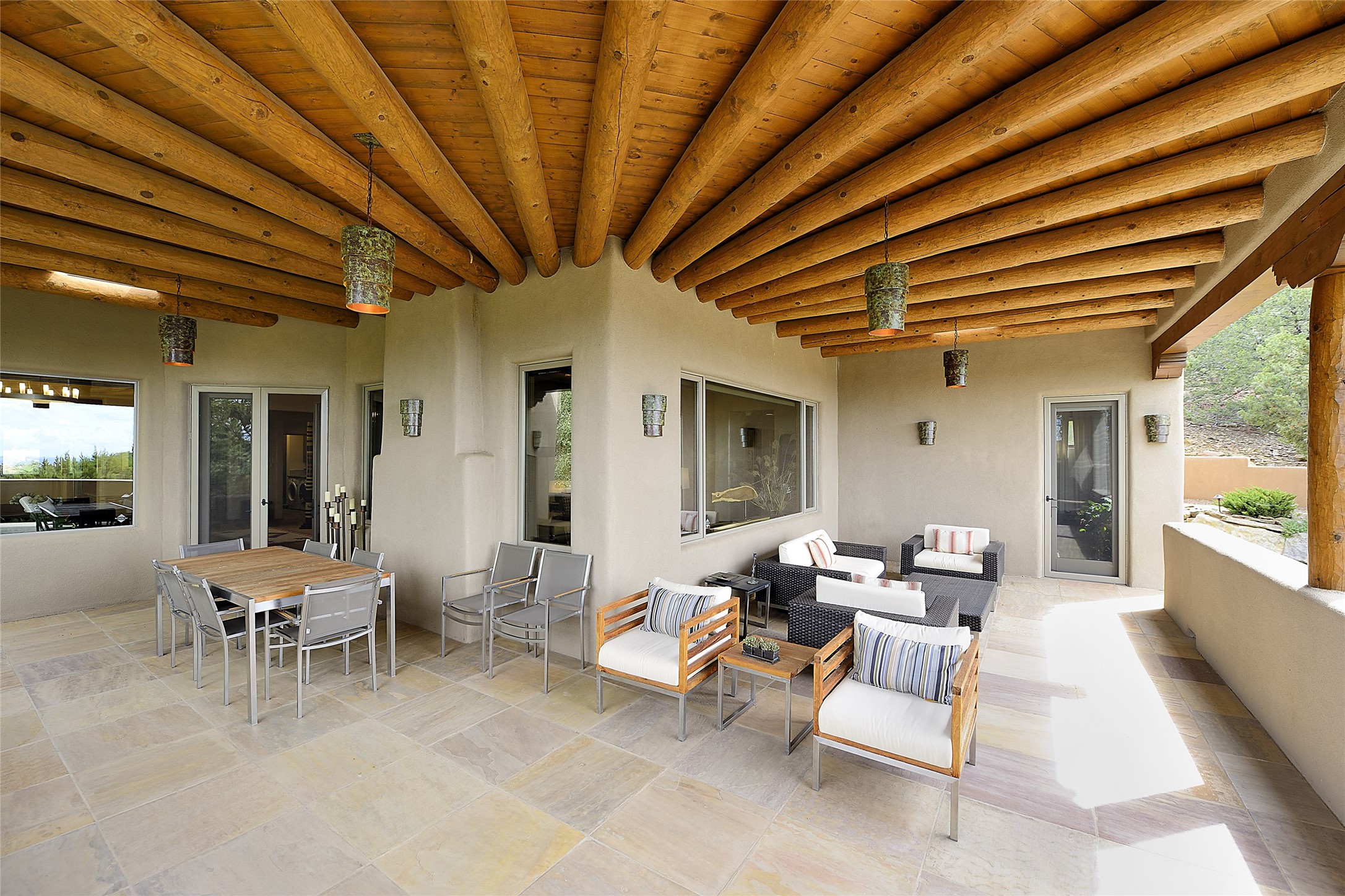 This is an exceptional offering in the gated and sought after High Summit. This compound estateconsists of a 3 Bedroom , 2.5 Bath main home built in 2009 and a 2 Bedroom, 2 Bath plus office/studioguest home completed in 2013. The homes are on a combined .7 acre lot and are nicely separated forprivacy with their own direct entry 2 car garages. The covered portals flow from the living spaces andoffer wonderful sunset views to the South and West. Upon entering you immediately notice the highend finishes and features such as nichos, vigas, stone floors and custom doors & cabinetry. The kitchensoffer all the conveniences with quality appliances and islands and bars for gathering and entertaining.Central forced air heating and air conditioning in the guest house and radiant in-floor heating andevaporative cooling in the main house keep things comfortable year-round. The grounds arewonderfully landscaped and planted featuring tall aspens, pinons and water features. This gatedcommunity with a sensible HOA is a stone's throw away from Ten Thousand waves and 12 miles toSanta Fe Ski Basin, yet only 5 miles away from the heart of downtown, Canyon road, restaurants and artgalleries.