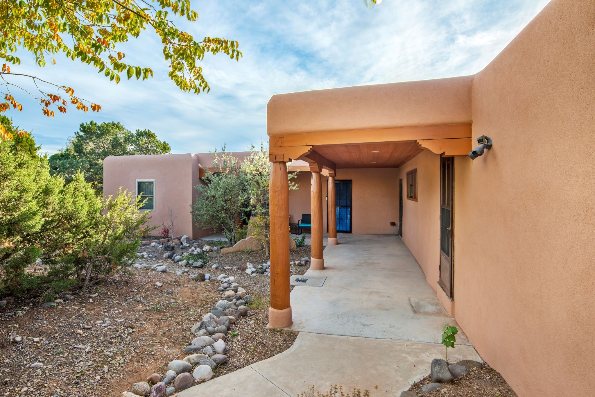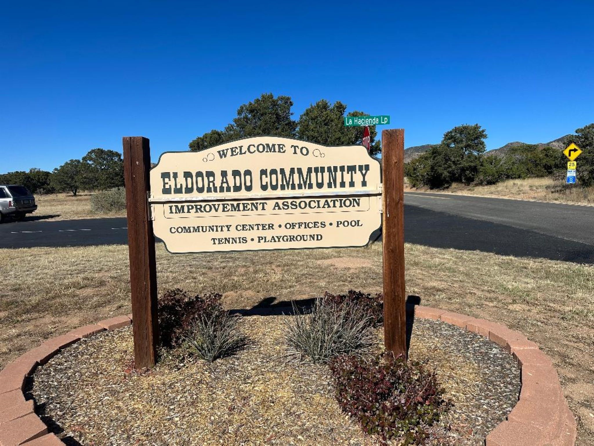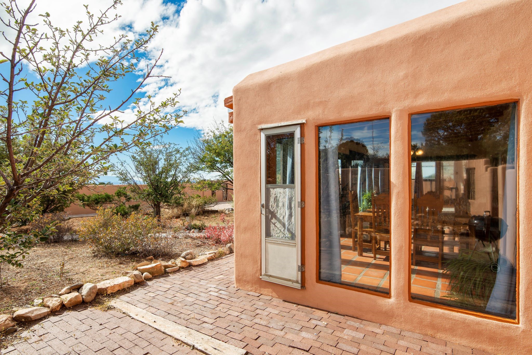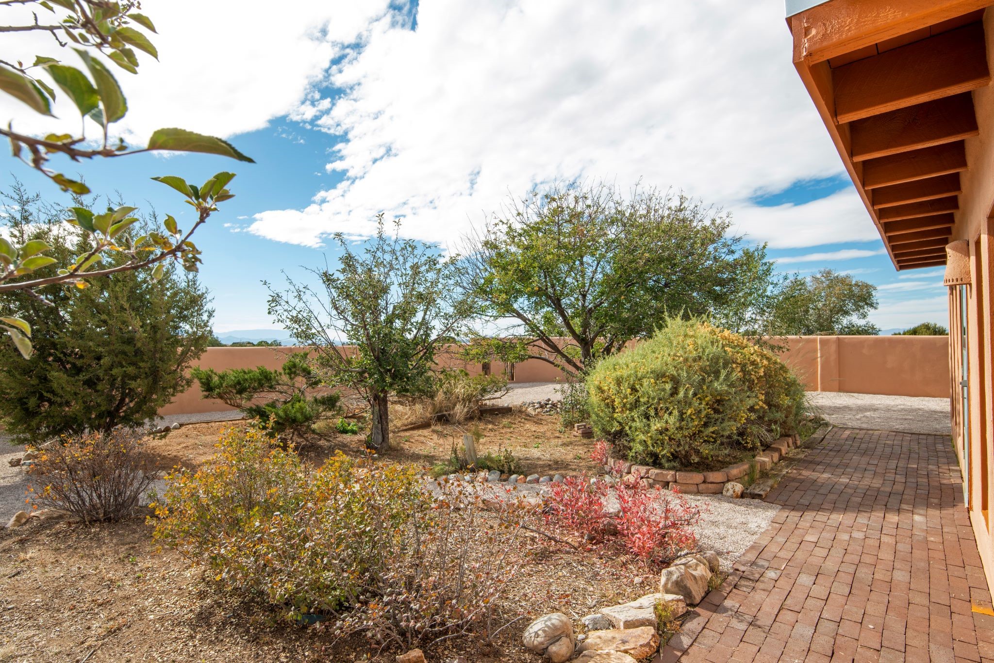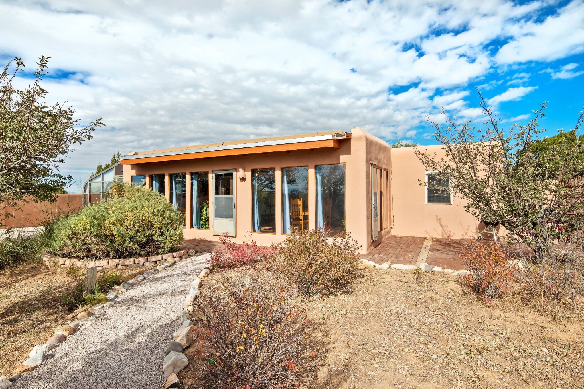 This beautiful Eldorado home is waiting for your visit. It has 4 bedrooms and 2 baths, with a full sized 2 car garage, on 1.24 acres. New stucco, new roof, landscaped backyard, stilestone countertops, saltillo flooring throughout the home. One of the bedrooms has been used as the studio for the well regarded artist/owner. The kitchen has custom cabinets and beam ceilings can be found in several rooms. The home was designed and positioned as a passive solar home keeping your heating needs to a minimum. Fireplace is fireplace/heater which can heat a good portion of the home. Past owners have documented over 140 bird species enjoying the backyard. Fully walled backyard, abundant trees, with new gates and accent windows. Come soon to see this home and its amazing views of the Ortiz mountains. See VIRTUAL TOUR LINK.