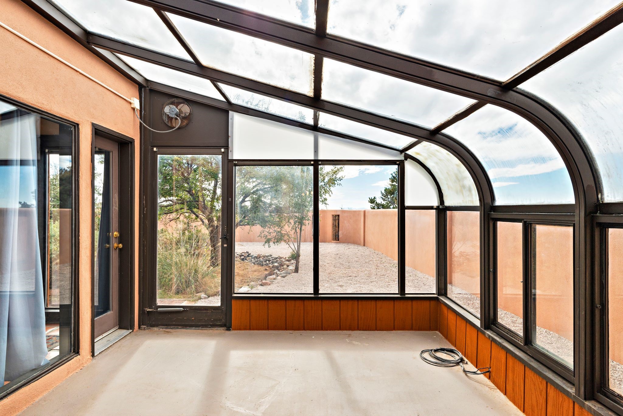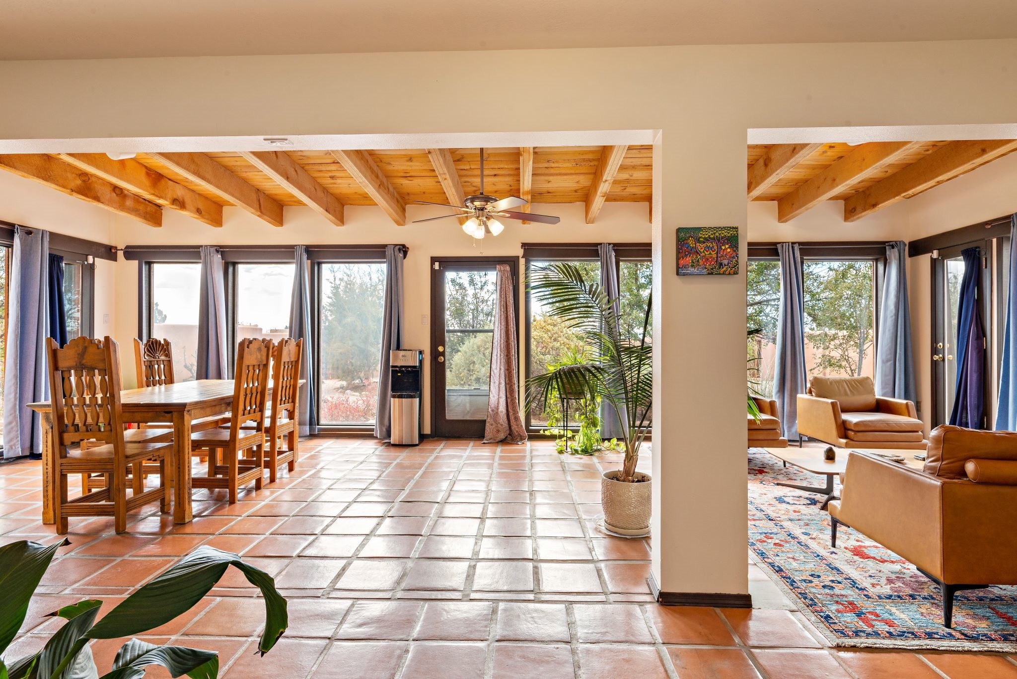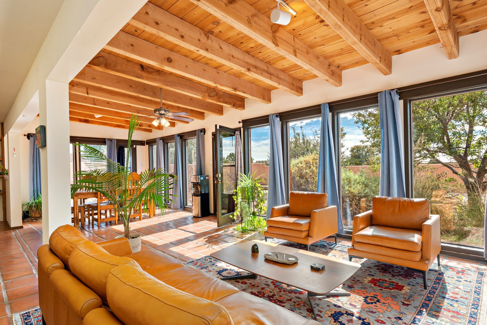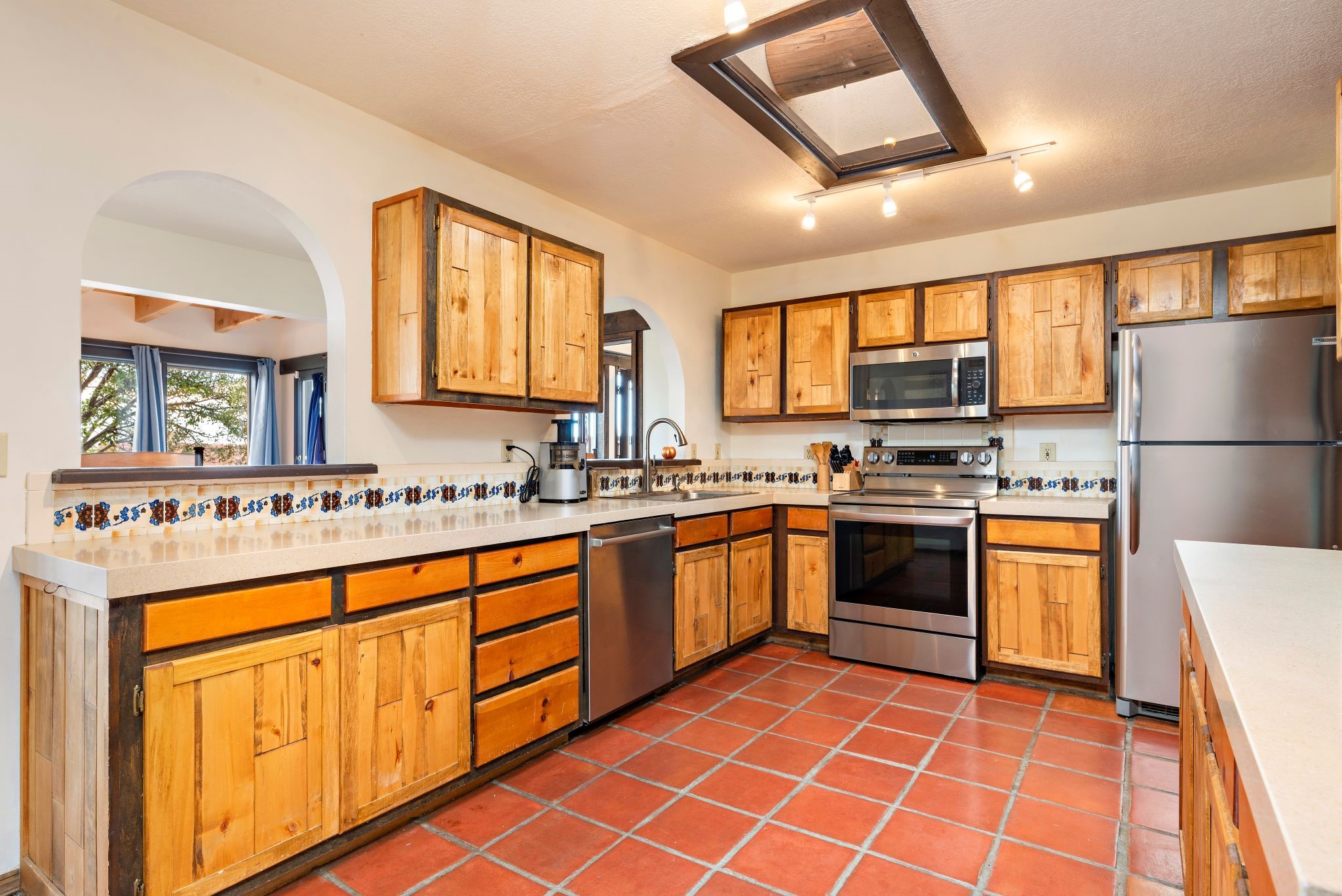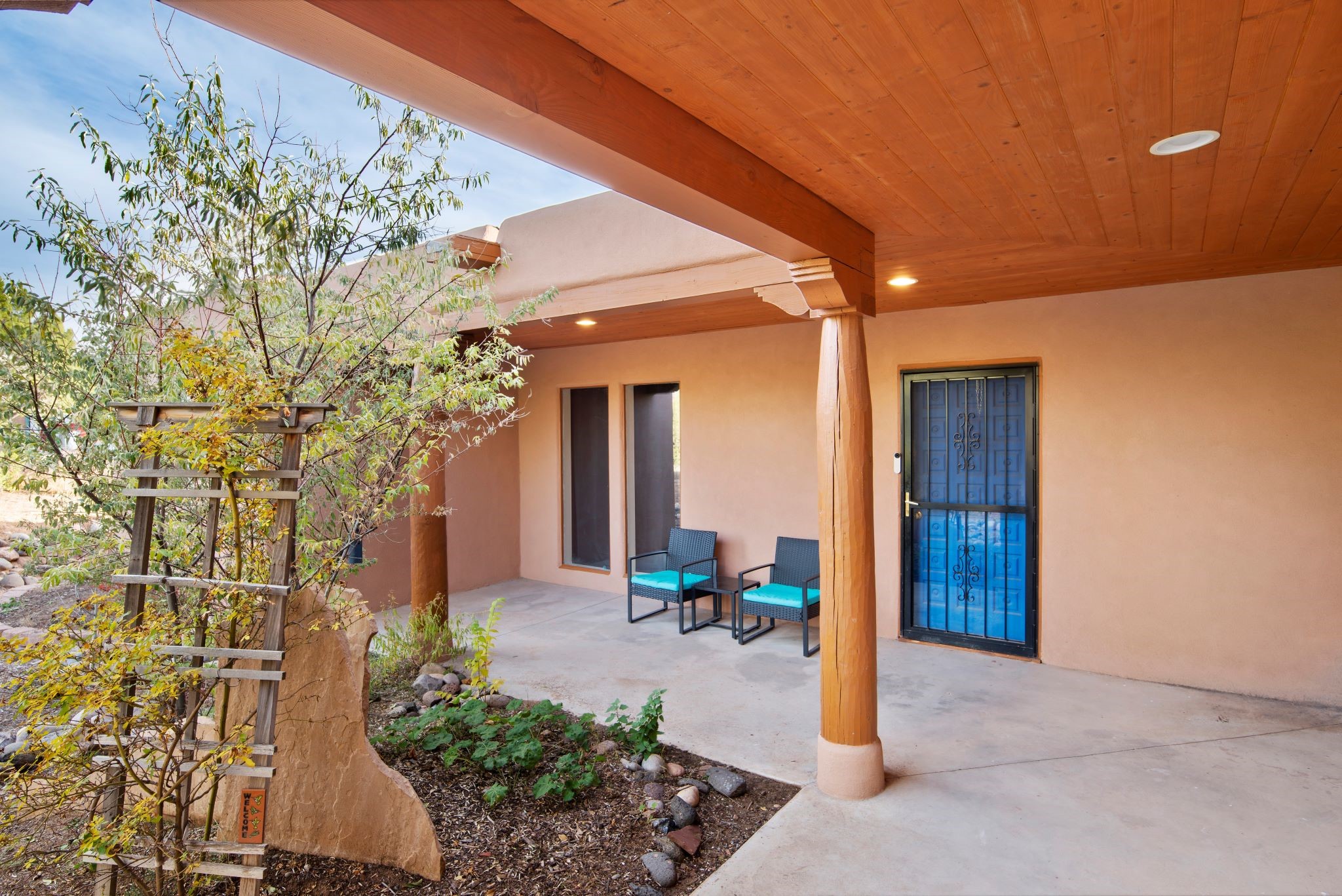 This beautiful Eldorado home is waiting for your visit. It has 4 bedrooms and 2 baths, with a full sized 2 car garage, on 1.24 acres. New stucco, new roof, landscaped backyard, stilestone countertops, saltillo flooring throughout the home. One of the bedrooms has been used as the studio for the well regarded artist/owner. The kitchen has custom cabinets and beam ceilings can be found in several rooms. The home was designed and positioned as a passive solar home keeping your heating needs to a minimum. Fireplace is fireplace/heater which can heat a good portion of the home. Past owners have documented over 140 bird species enjoying the backyard. Fully walled backyard, abundant trees, with new gates and accent windows. Come soon to see this home and its amazing views of the Ortiz mountains. See VIRTUAL TOUR LINK.