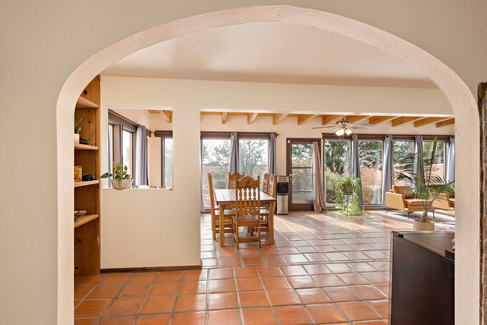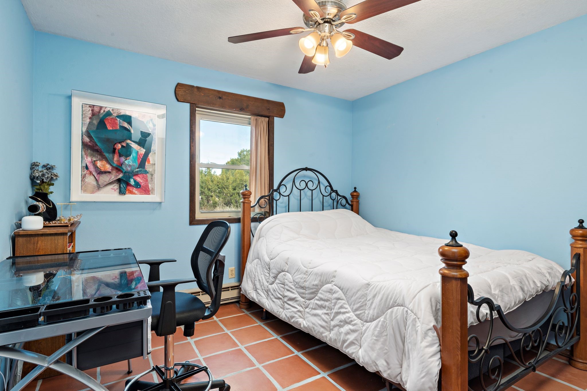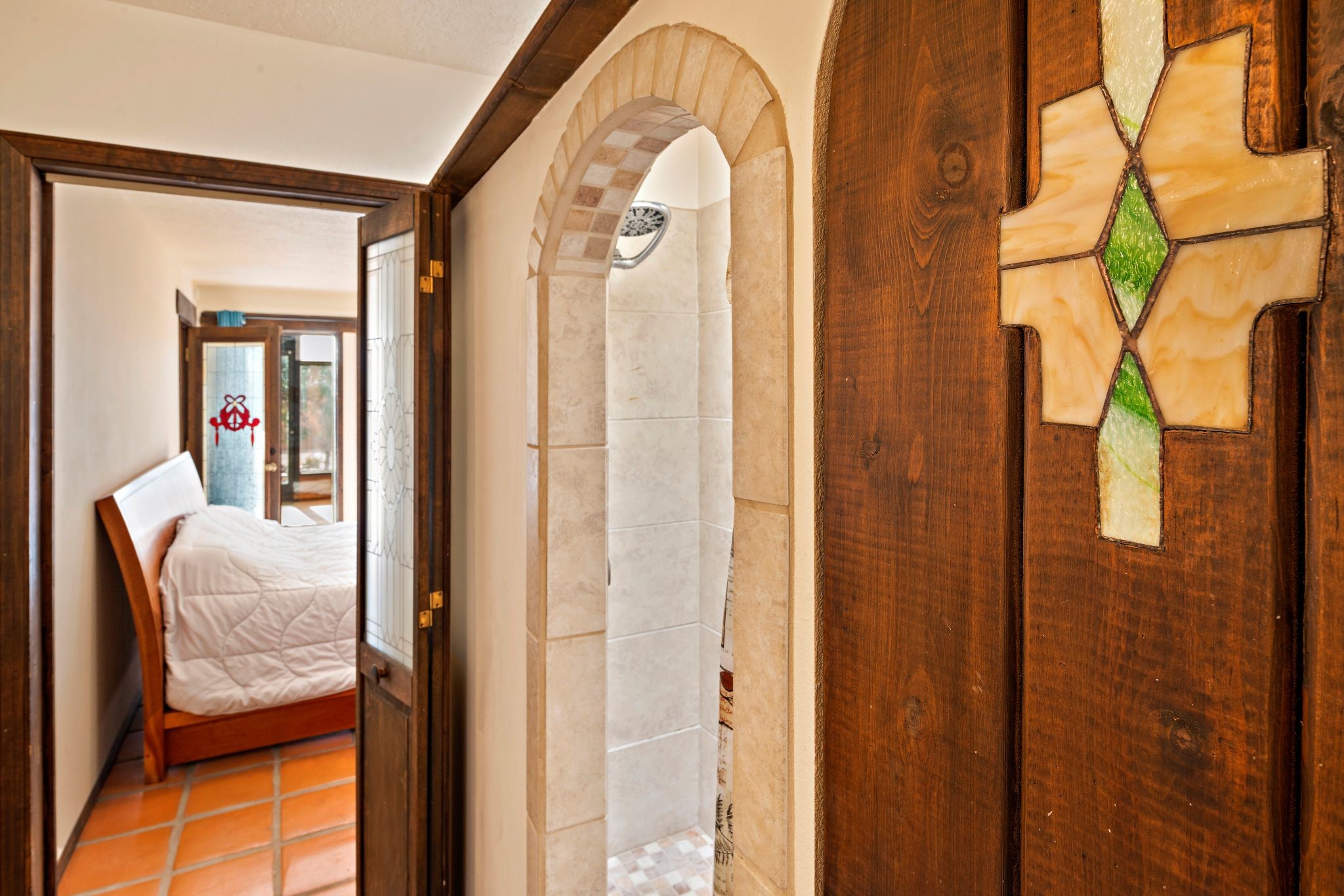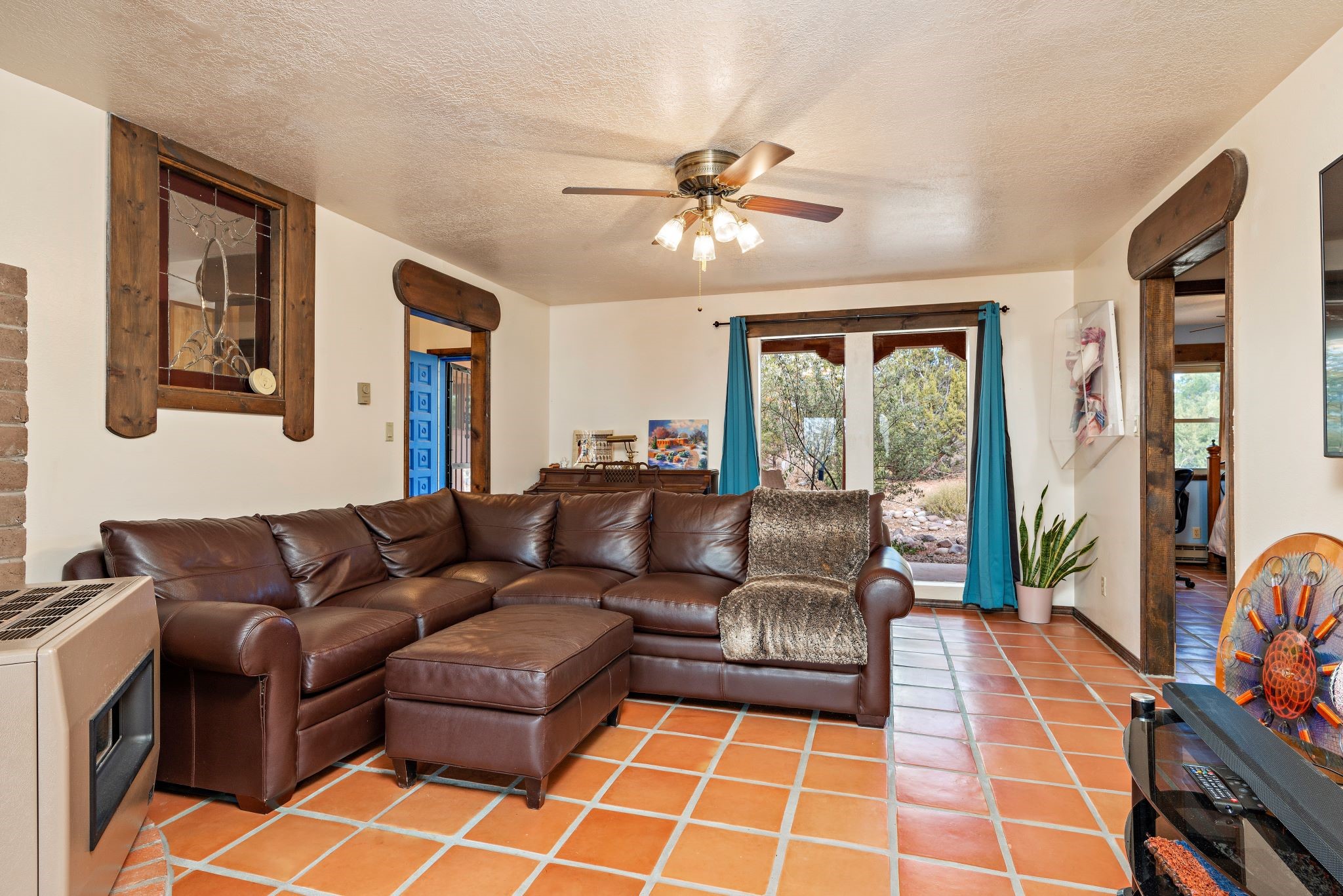 This beautiful Eldorado home is waiting for your visit. It has 4 bedrooms and 2 baths, with a full sized 2 car garage, on 1.24 acres. New stucco, new roof, landscaped backyard, stilestone countertops, saltillo flooring throughout the home. One of the bedrooms has been used as the studio for the well regarded artist/owner. The kitchen has custom cabinets and beam ceilings can be found in several rooms. The home was designed and positioned as a passive solar home keeping your heating needs to a minimum. Fireplace is fireplace/heater which can heat a good portion of the home. Past owners have documented over 140 bird species enjoying the backyard. Fully walled backyard, abundant trees, with new gates and accent windows. Come soon to see this home and its amazing views of the Ortiz mountains. See VIRTUAL TOUR LINK.