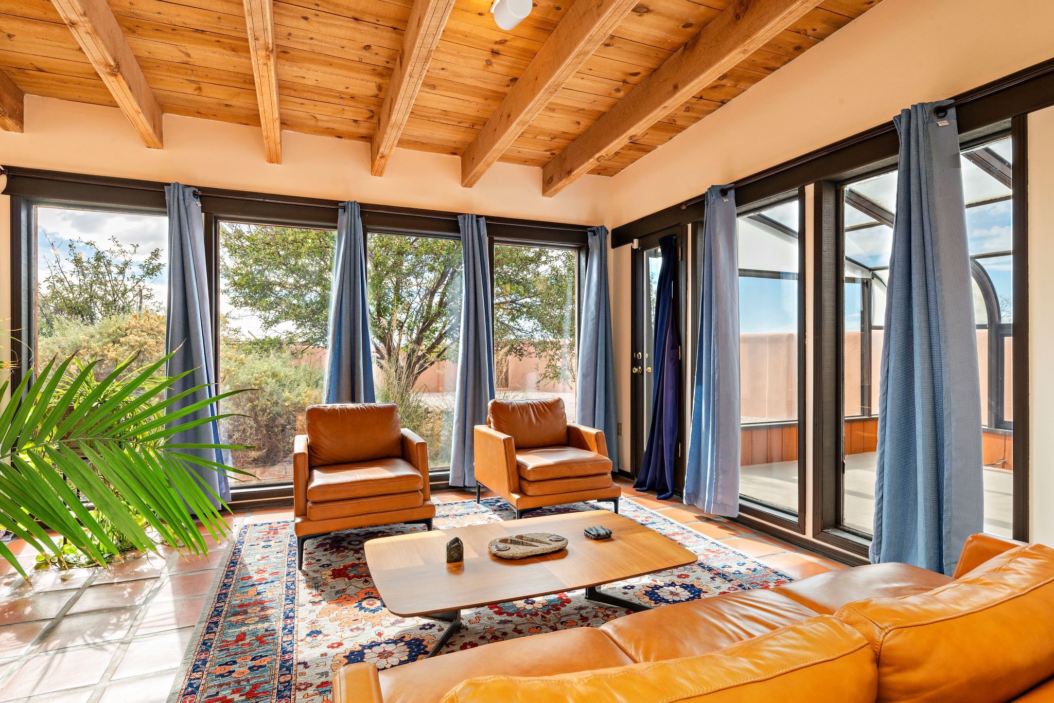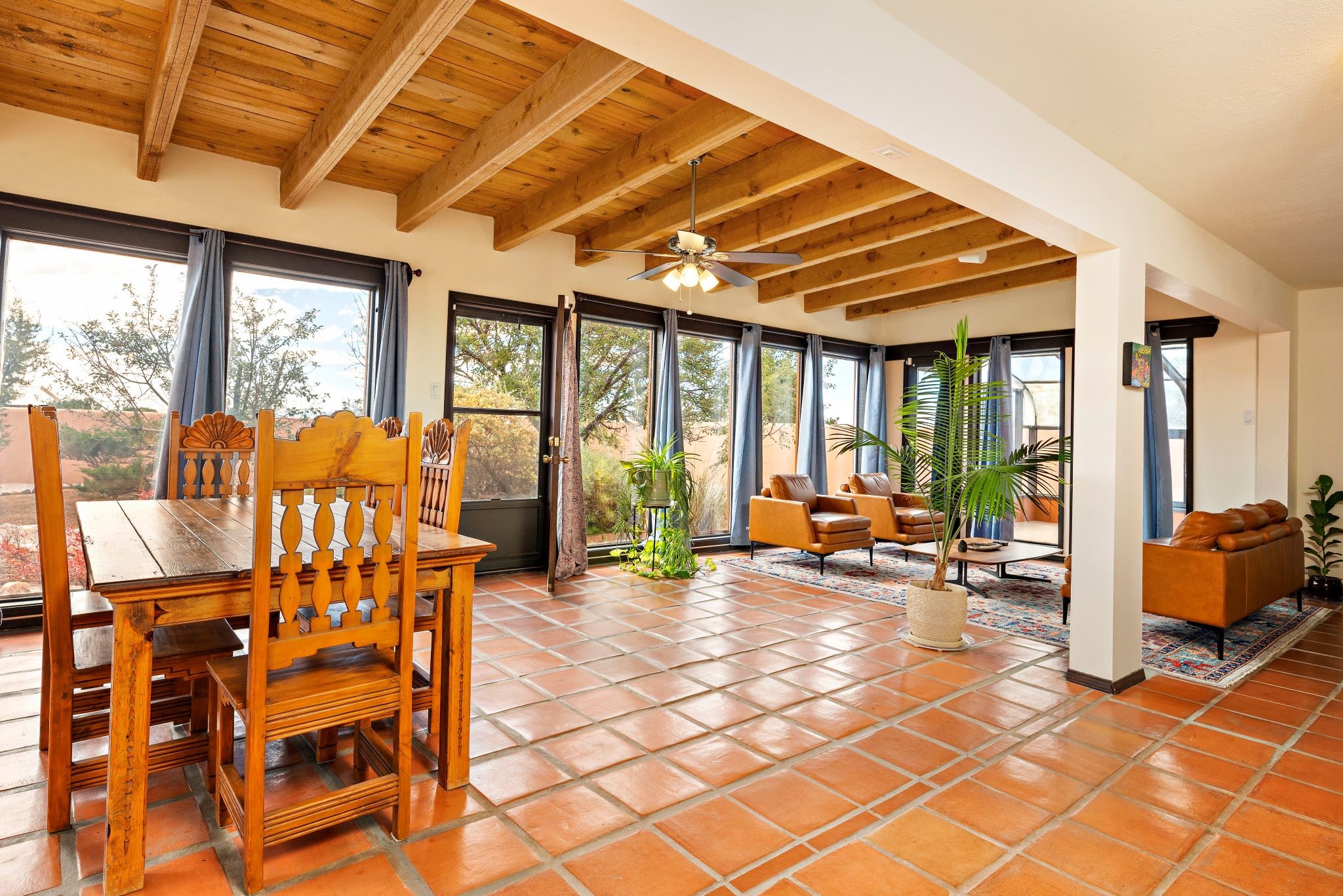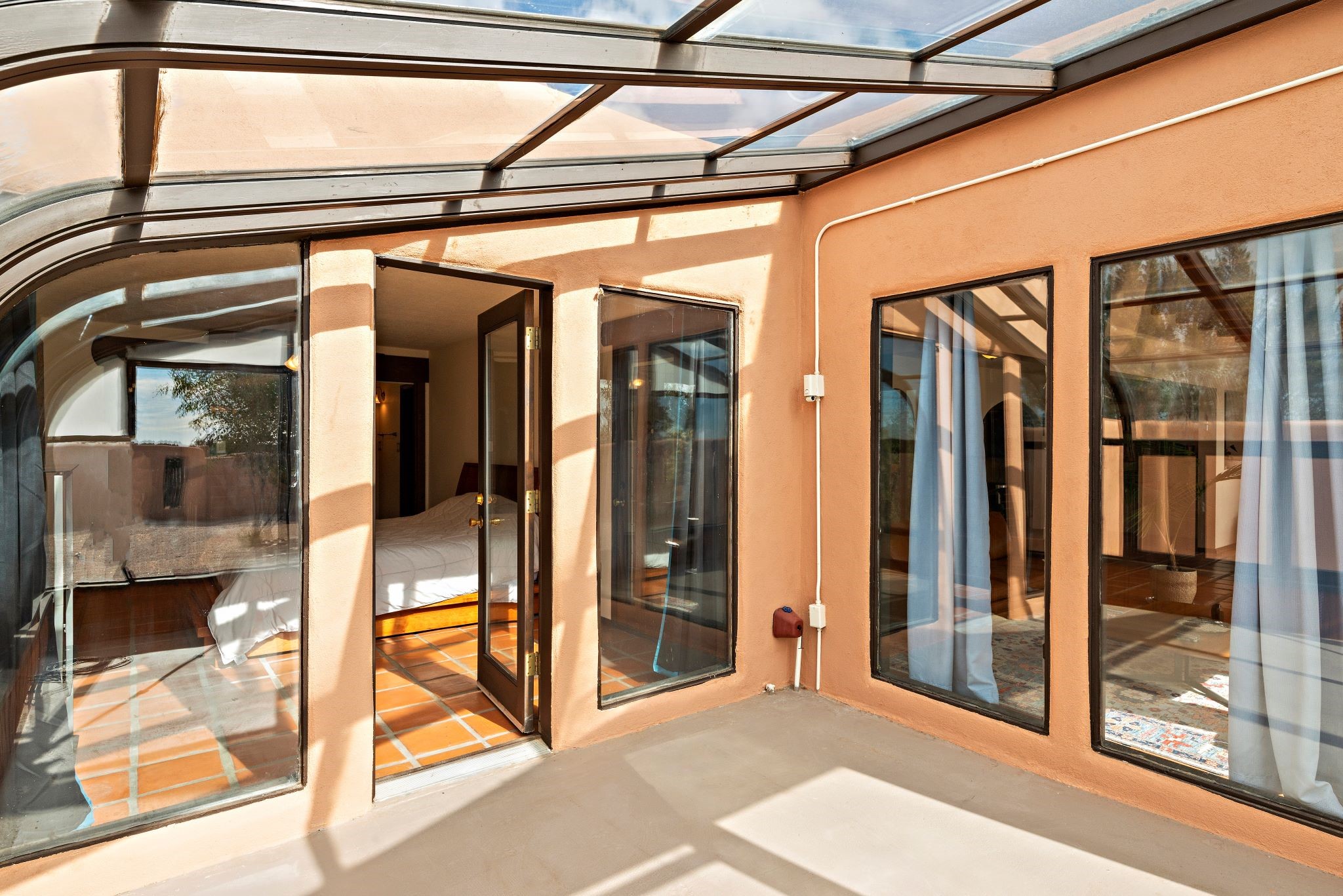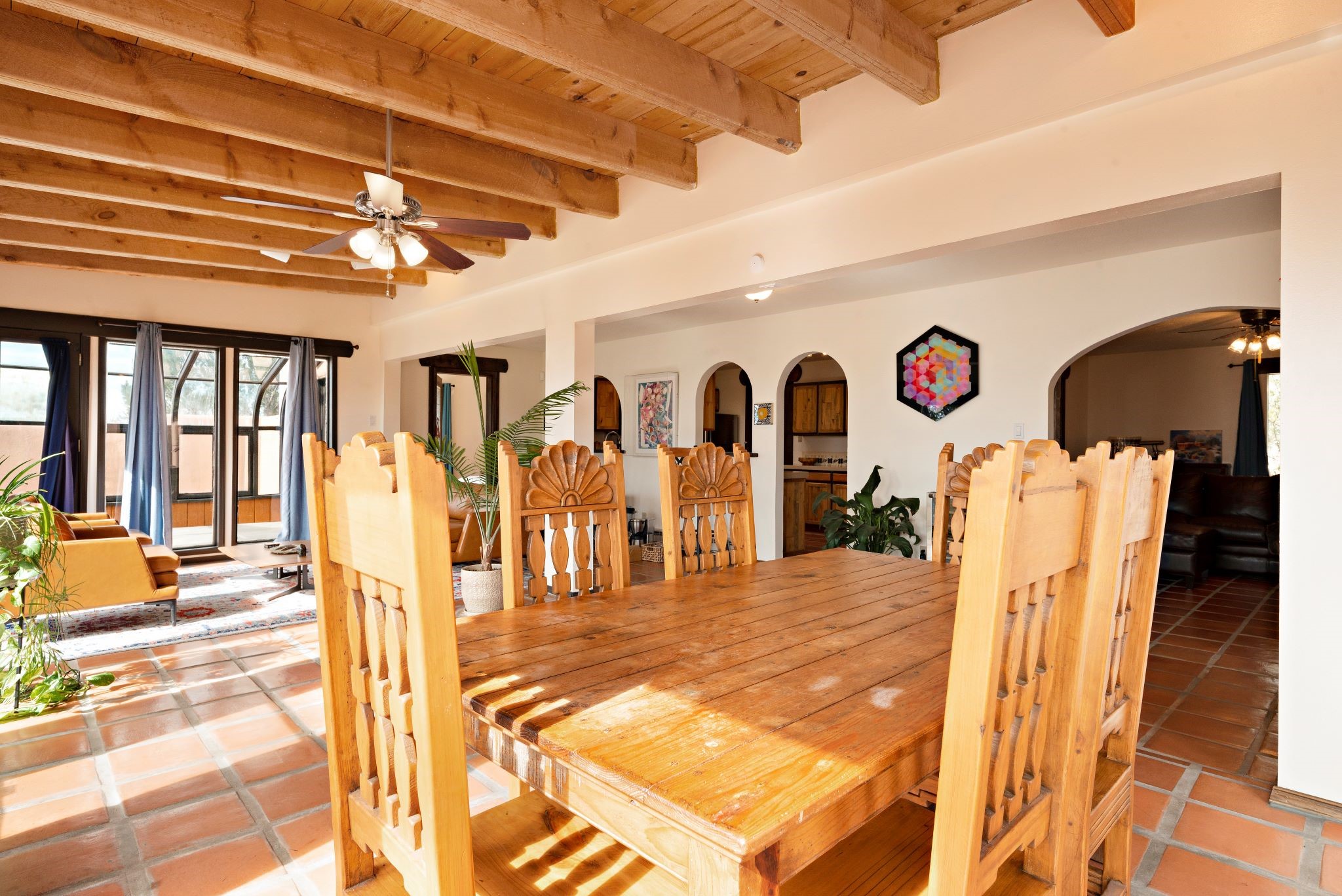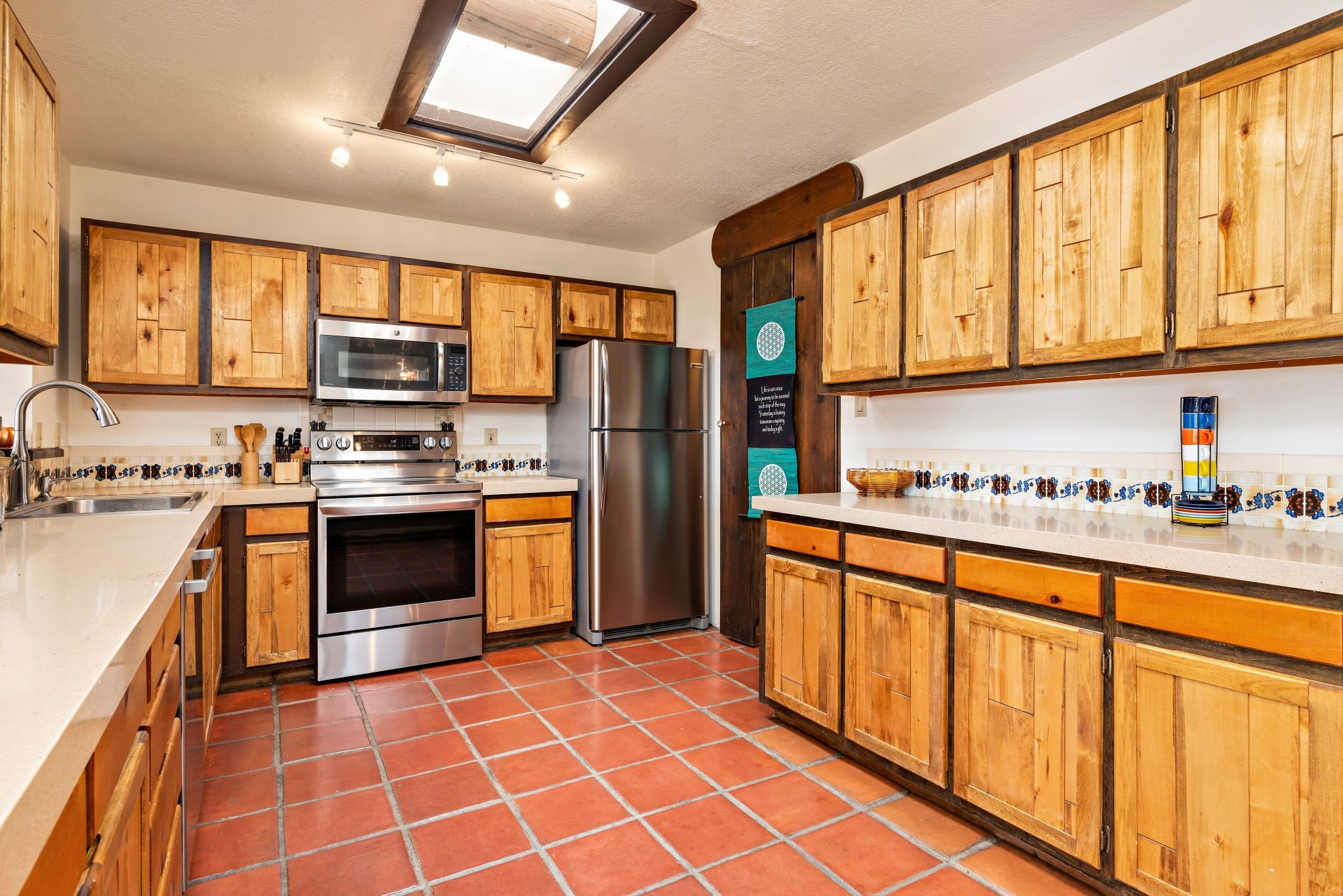 This beautiful Eldorado home is waiting for your visit. It has 4 bedrooms and 2 baths, with a full sized 2 car garage, on 1.24 acres. New stucco, new roof, landscaped backyard, stilestone countertops, saltillo flooring throughout the home. One of the bedrooms has been used as the studio for the well regarded artist/owner. The kitchen has custom cabinets and beam ceilings can be found in several rooms. The home was designed and positioned as a passive solar home keeping your heating needs to a minimum. Fireplace is fireplace/heater which can heat a good portion of the home. Past owners have documented over 140 bird species enjoying the backyard. Fully walled backyard, abundant trees, with new gates and accent windows. Come soon to see this home and its amazing views of the Ortiz mountains. See VIRTUAL TOUR LINK.