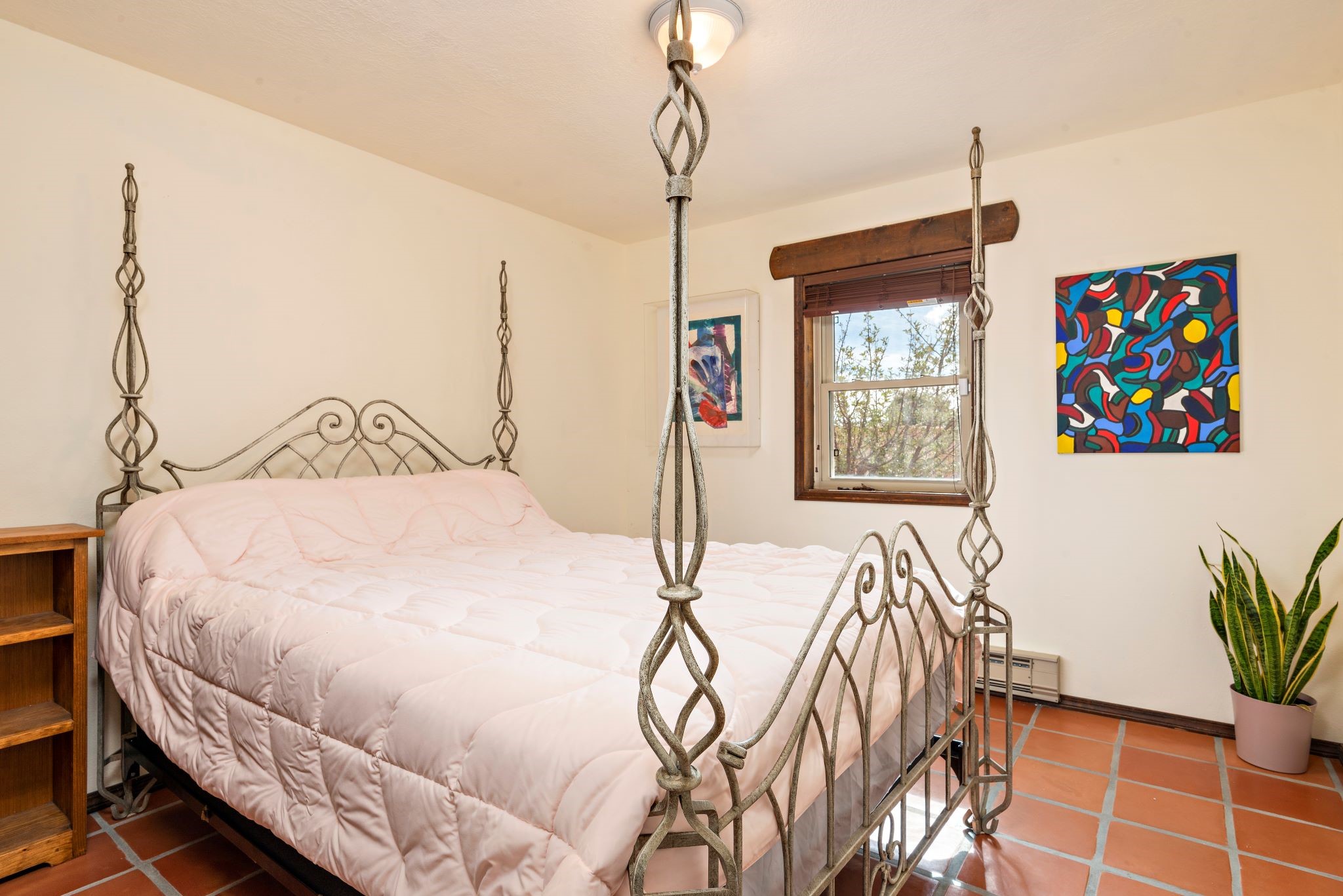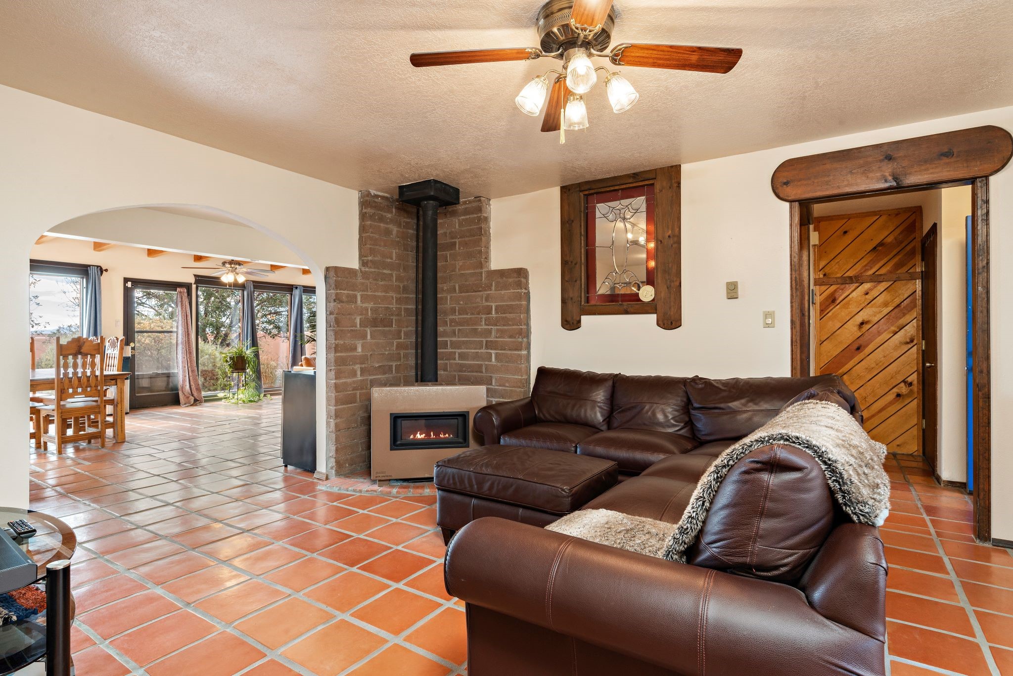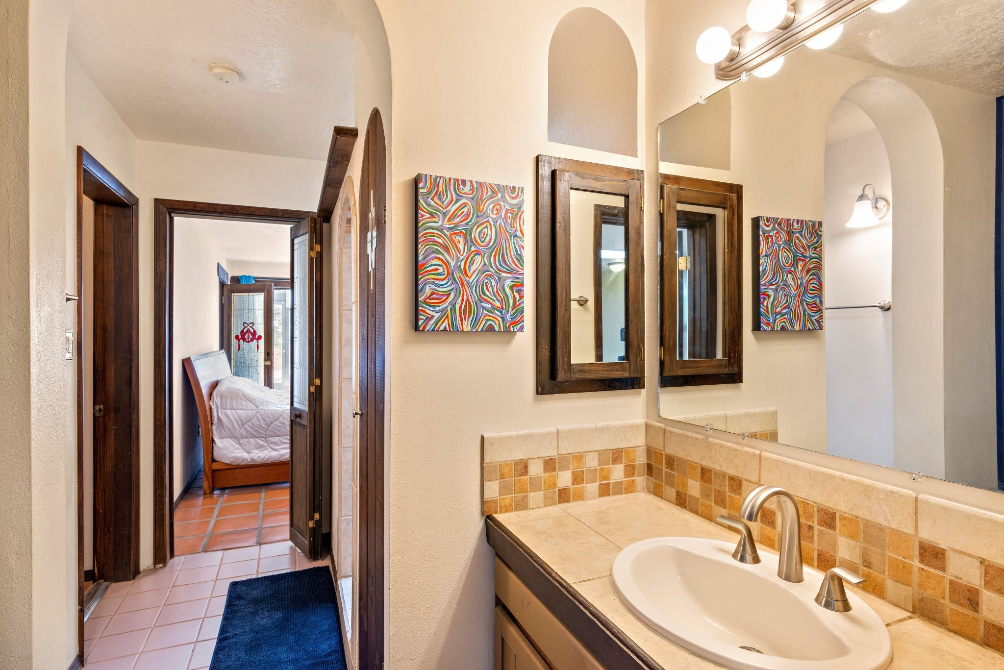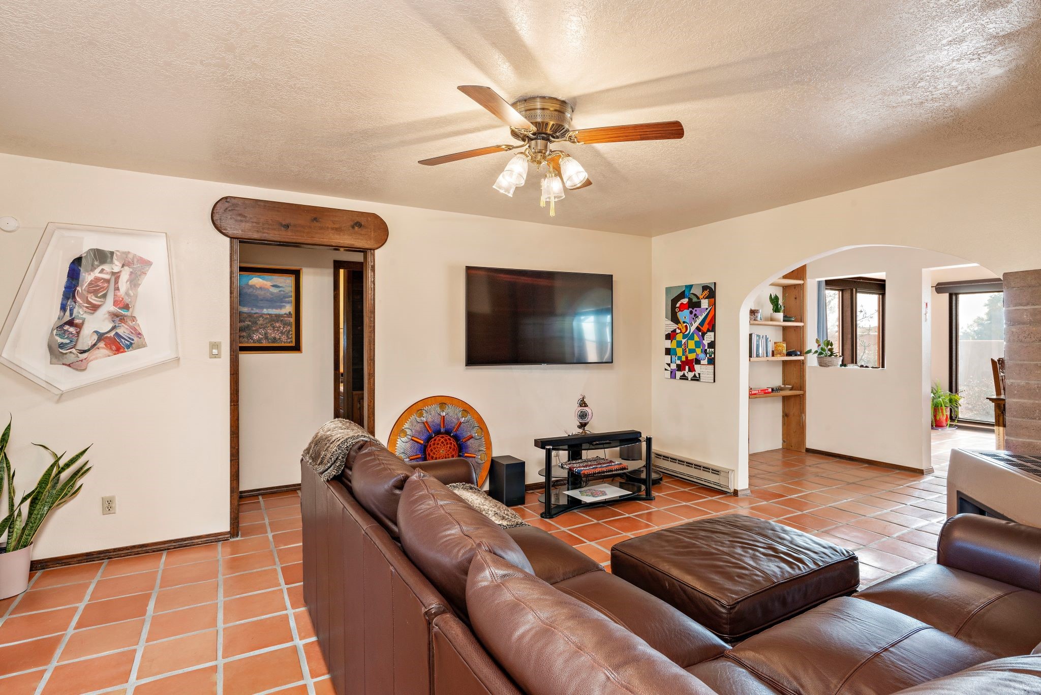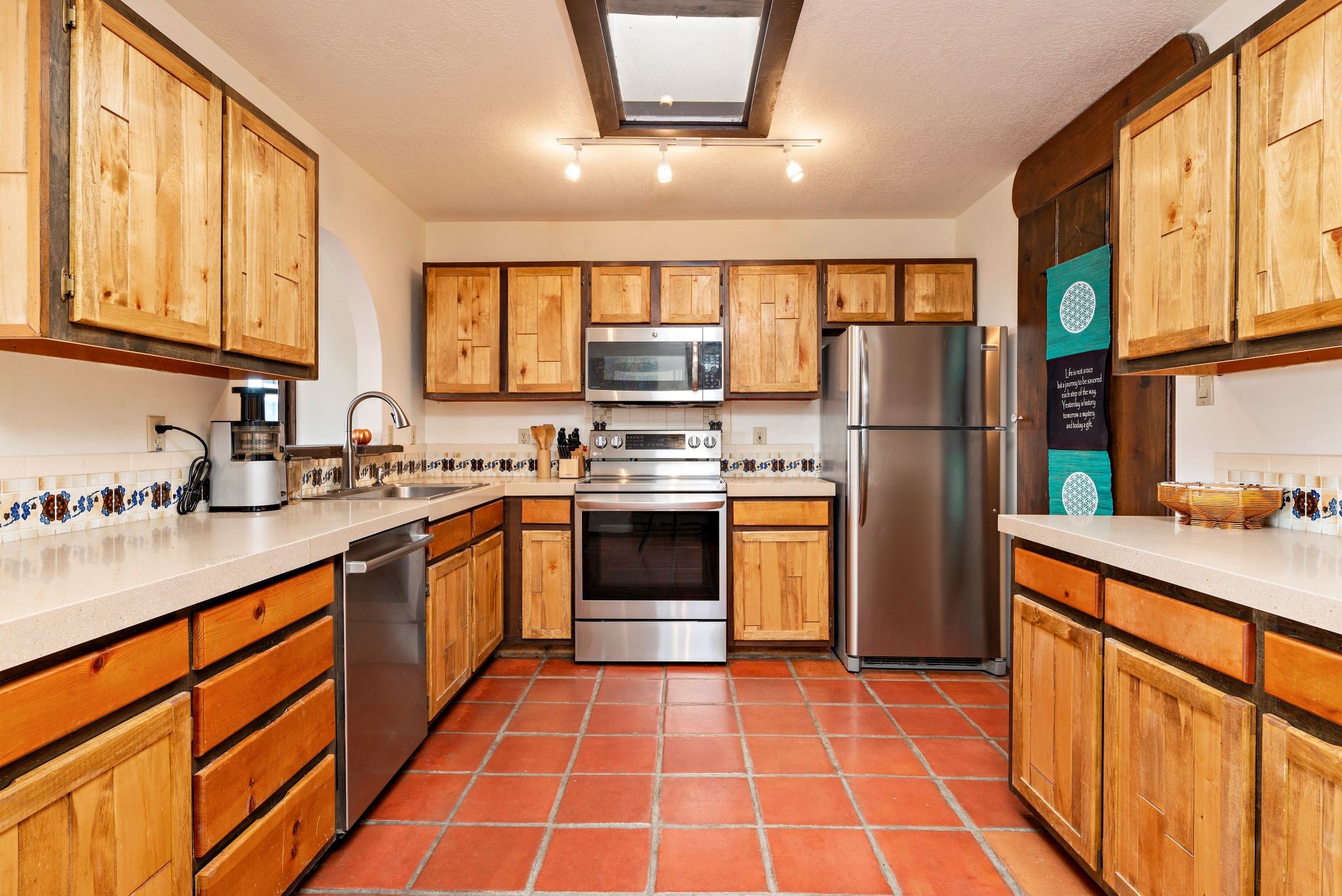 This beautiful Eldorado home is waiting for your visit. It has 4 bedrooms and 2 baths, with a full sized 2 car garage, on 1.24 acres. New stucco, new roof, landscaped backyard, stilestone countertops, saltillo flooring throughout the home. One of the bedrooms has been used as the studio for the well regarded artist/owner. The kitchen has custom cabinets and beam ceilings can be found in several rooms. The home was designed and positioned as a passive solar home keeping your heating needs to a minimum. Fireplace is fireplace/heater which can heat a good portion of the home. Past owners have documented over 140 bird species enjoying the backyard. Fully walled backyard, abundant trees, with new gates and accent windows. Come soon to see this home and its amazing views of the Ortiz mountains. See VIRTUAL TOUR LINK.