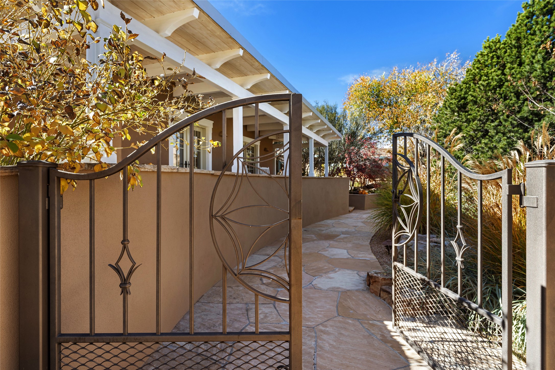 Sited on 1.57 gated park-like acres in Las Campanas with its own private gate, this elegant 7000 sq. ft., four-bedroom estate is surrounded by lush gardens, an extraordinary central courtyard with a cascading rock waterfall and mature landscaping, multiple outdoor entertaining areas and intimate portal/patio spaces.Winning three Hacienda Awards including the coveted "Judges Choice," this Territorial-style residence exudes the personality and taste of those accustomed to the finest quality, fit and finishes while preserving the quintessential Santa Fe elements to include clay plaster walls, coved ceilings, vigas, latillas and brick floors. The extensive use of glass and river rock bring the outside inside creating a comfortable, organic and serene environment. The main residence and casita have been thoughtfully remodeled for today's lifestyle. Nine of the ten fireplaces have natural gas for ease of use.The grand entryway draws your guests into a generous layout ideal for entertaining and the ample floor plan encompasses an impressive living room, beautiful dining room, a casual gathering room for family and friends, a stylish chef's kitchen/butler's pantry and handsomely fitted media room. There are three spacious bedrooms- each ensuite and each with private portals. The primary suite includes a luxurious spa-like bath area with a soaking tub and outdoor views, fireplace and wet room. **