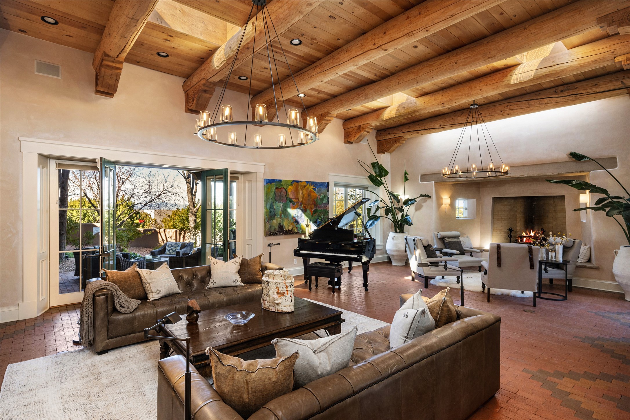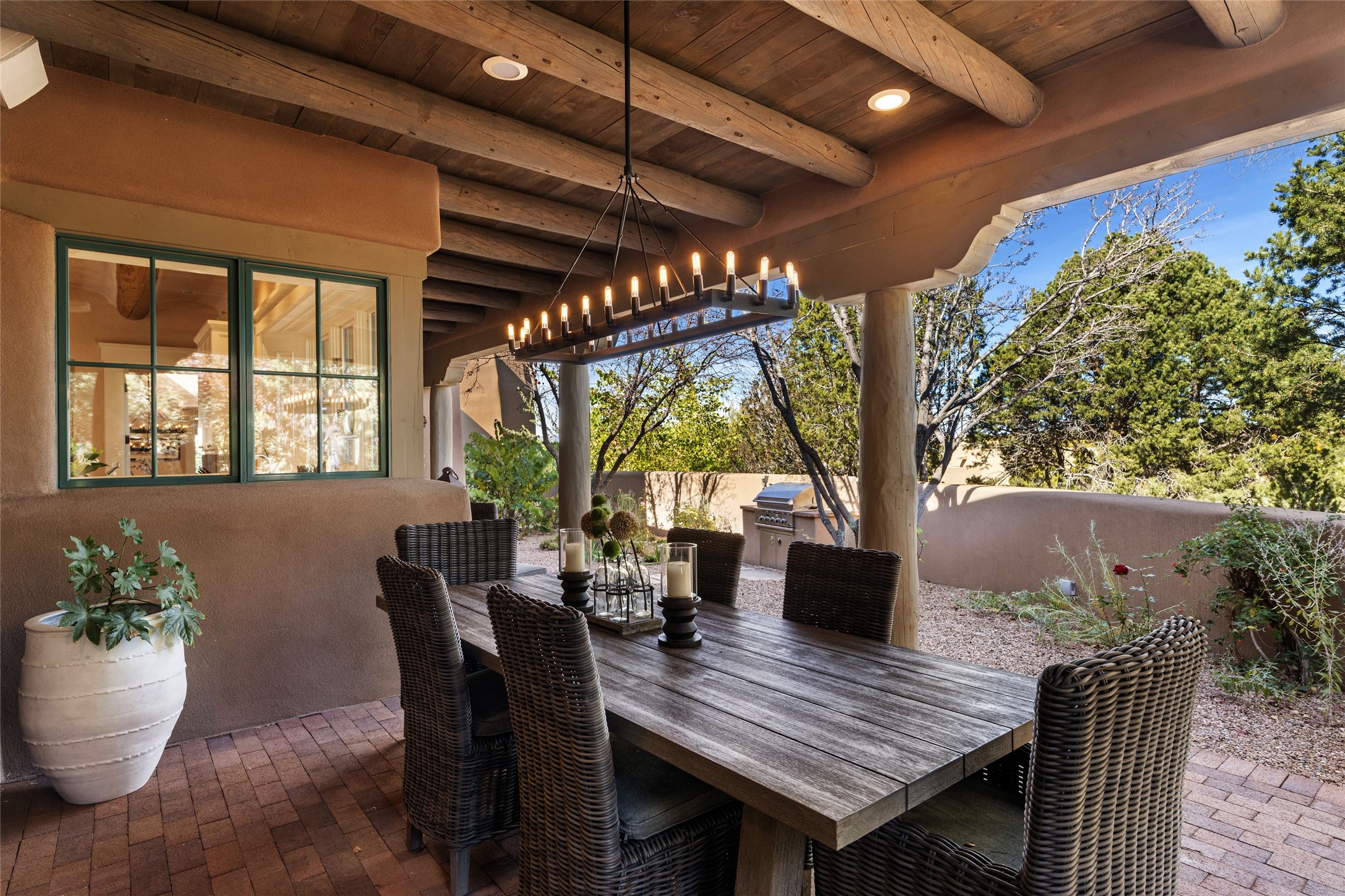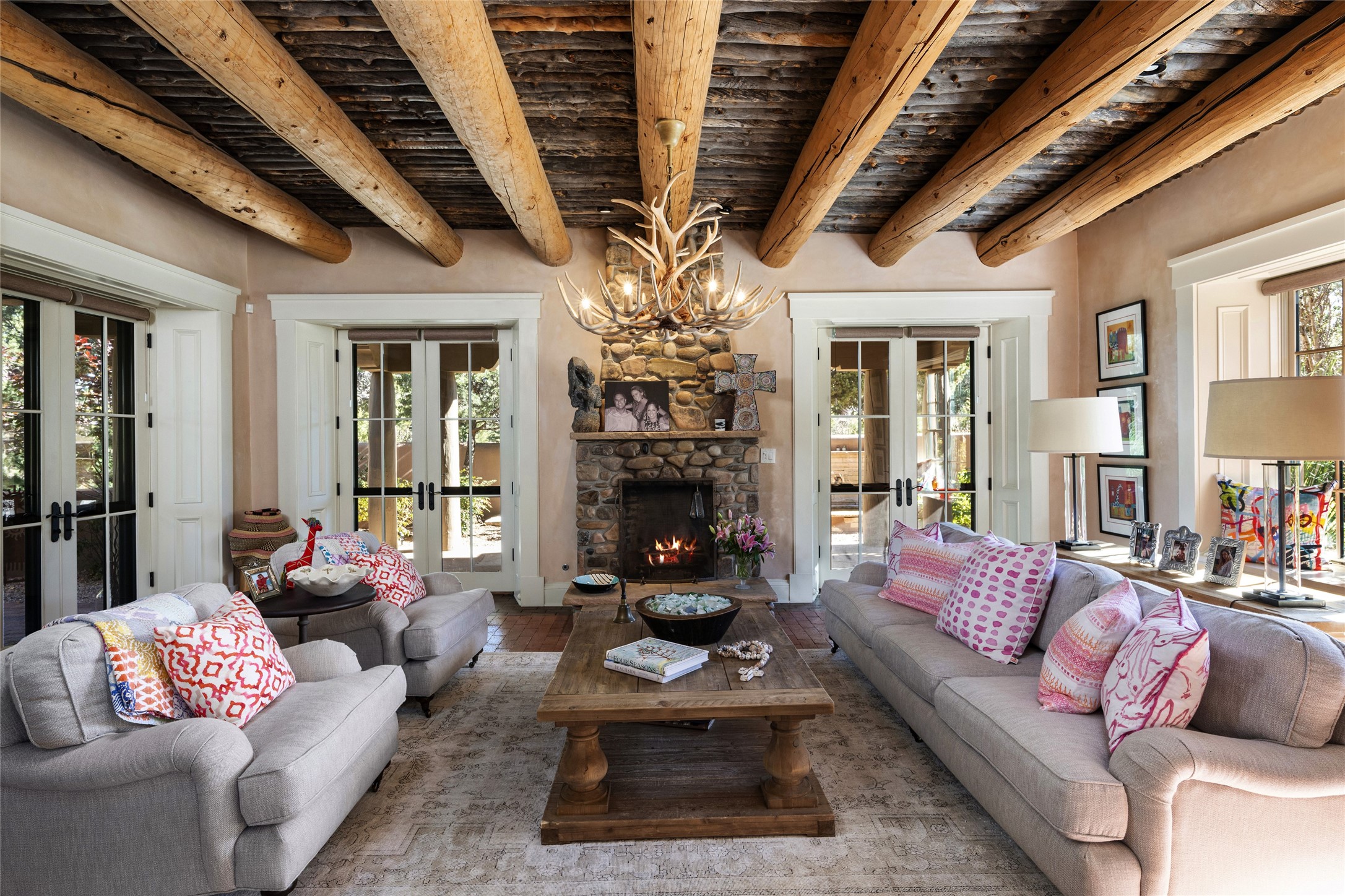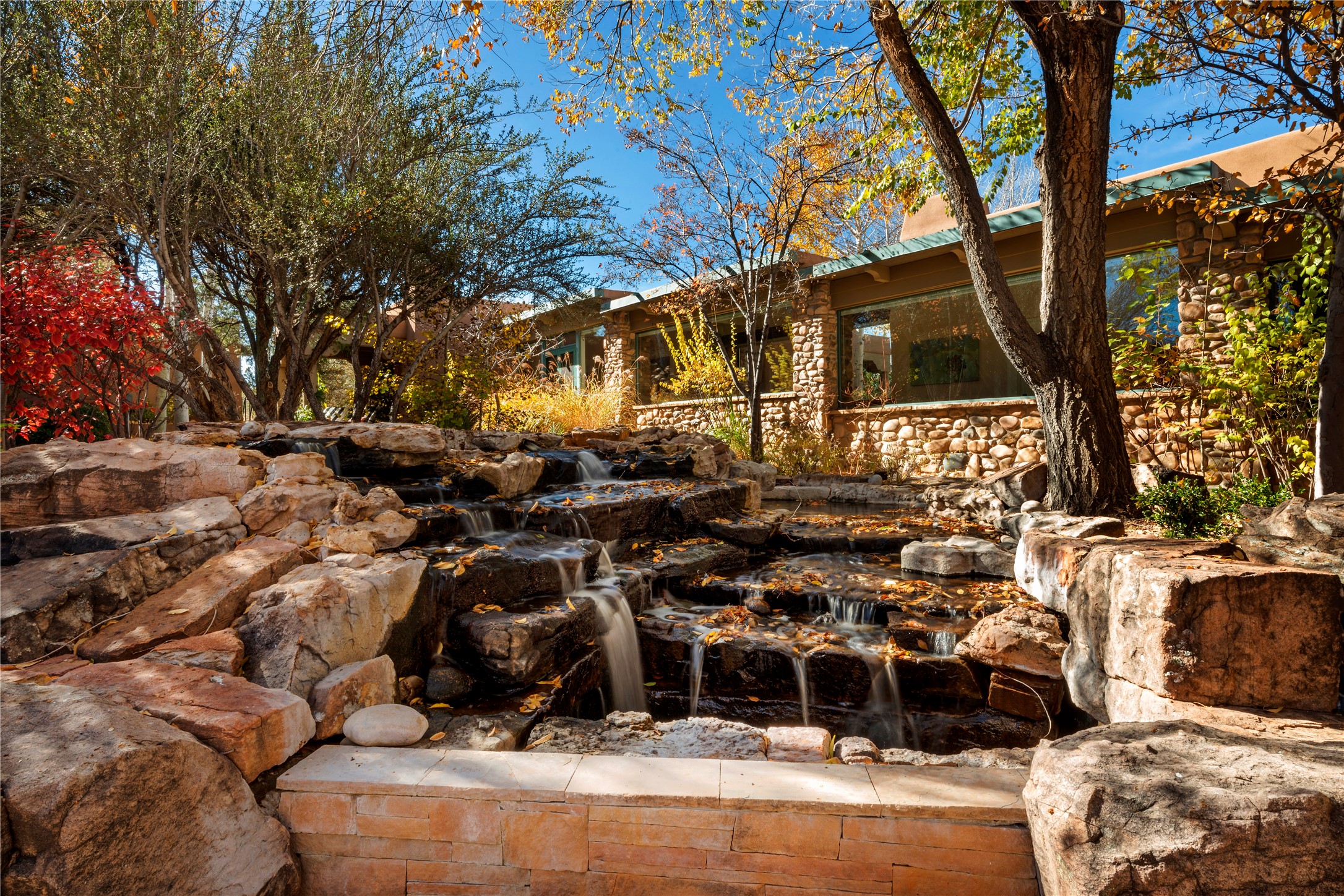 Sited on 1.57 gated park-like acres in Las Campanas with its own private gate, this elegant 7000 sq. ft., four-bedroom estate is surrounded by lush gardens, an extraordinary central courtyard with a cascading rock waterfall and mature landscaping, multiple outdoor entertaining areas and intimate portal/patio spaces.Winning three Hacienda Awards including the coveted "Judges Choice," this Territorial-style residence exudes the personality and taste of those accustomed to the finest quality, fit and finishes while preserving the quintessential Santa Fe elements to include clay plaster walls, coved ceilings, vigas, latillas and brick floors. The extensive use of glass and river rock bring the outside inside creating a comfortable, organic and serene environment. The main residence and casita have been thoughtfully remodeled for today's lifestyle. Nine of the ten fireplaces have natural gas for ease of use.The grand entryway draws your guests into a generous layout ideal for entertaining and the ample floor plan encompasses an impressive living room, beautiful dining room, a casual gathering room for family and friends, a stylish chef's kitchen/butler's pantry and handsomely fitted media room. There are three spacious bedrooms- each ensuite and each with private portals. The primary suite includes a luxurious spa-like bath area with a soaking tub and outdoor views, fireplace and wet room. **