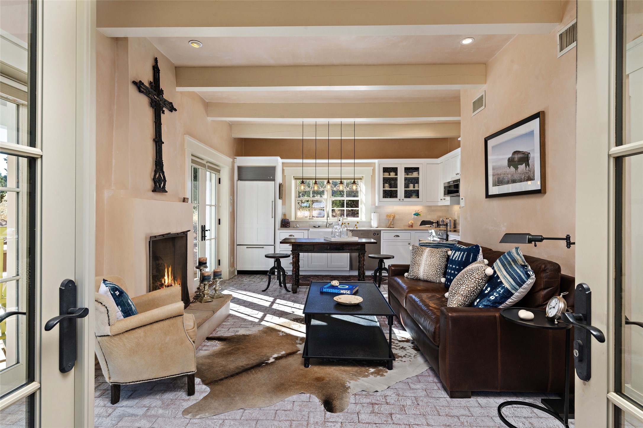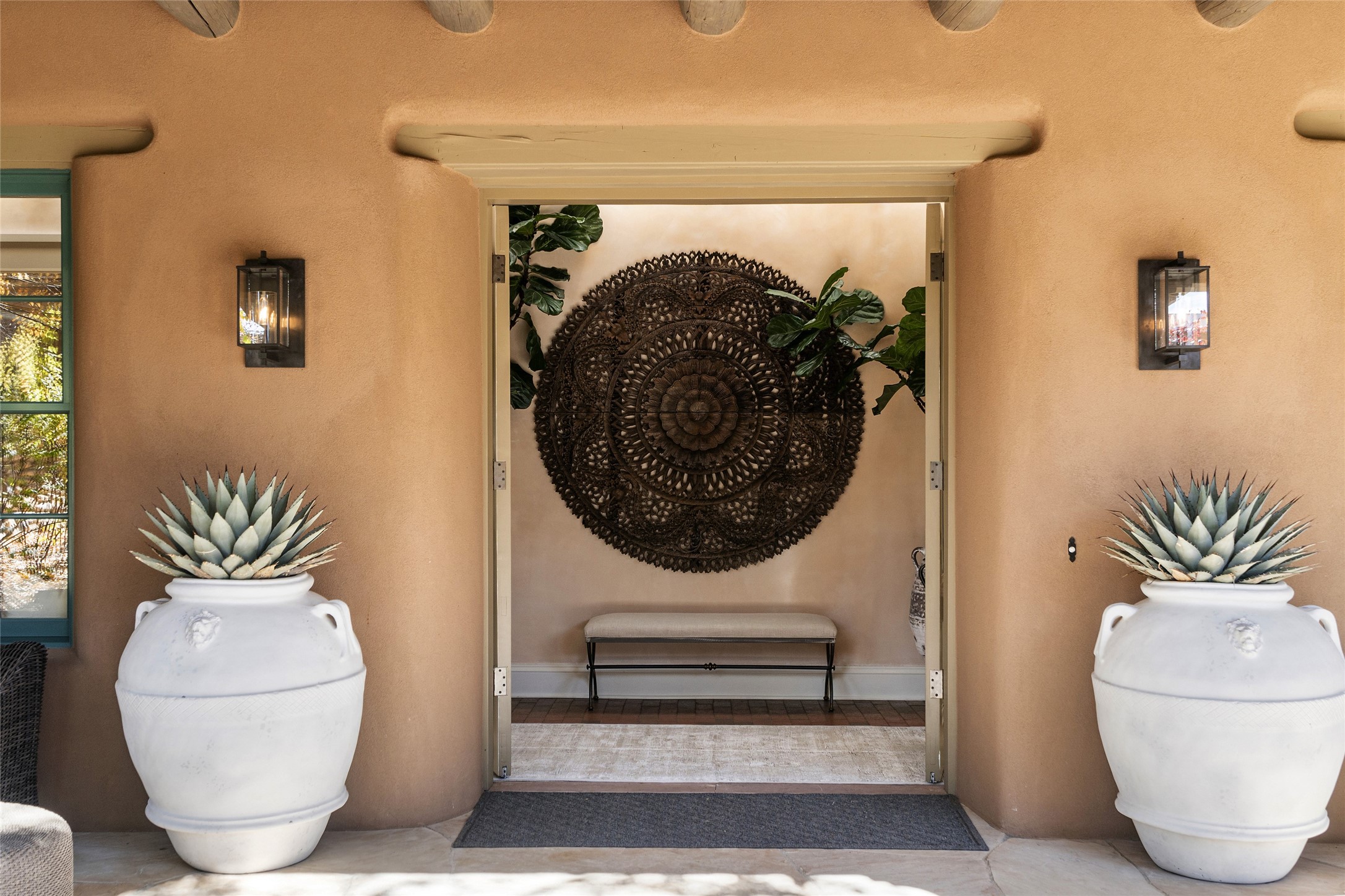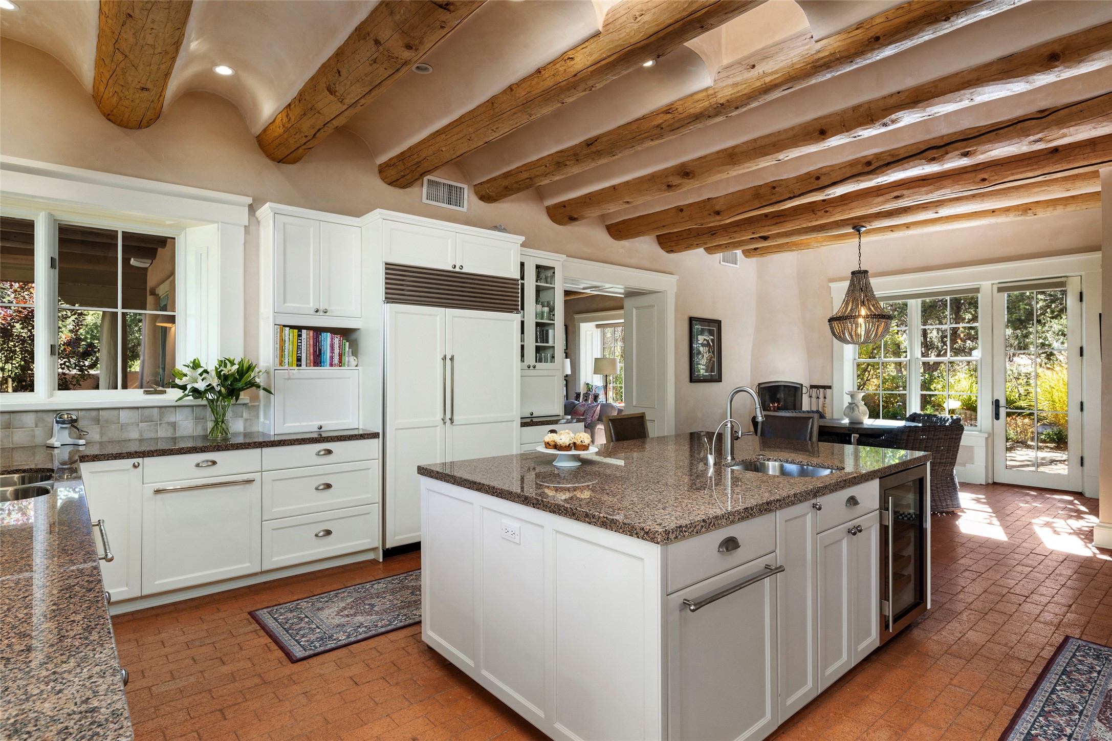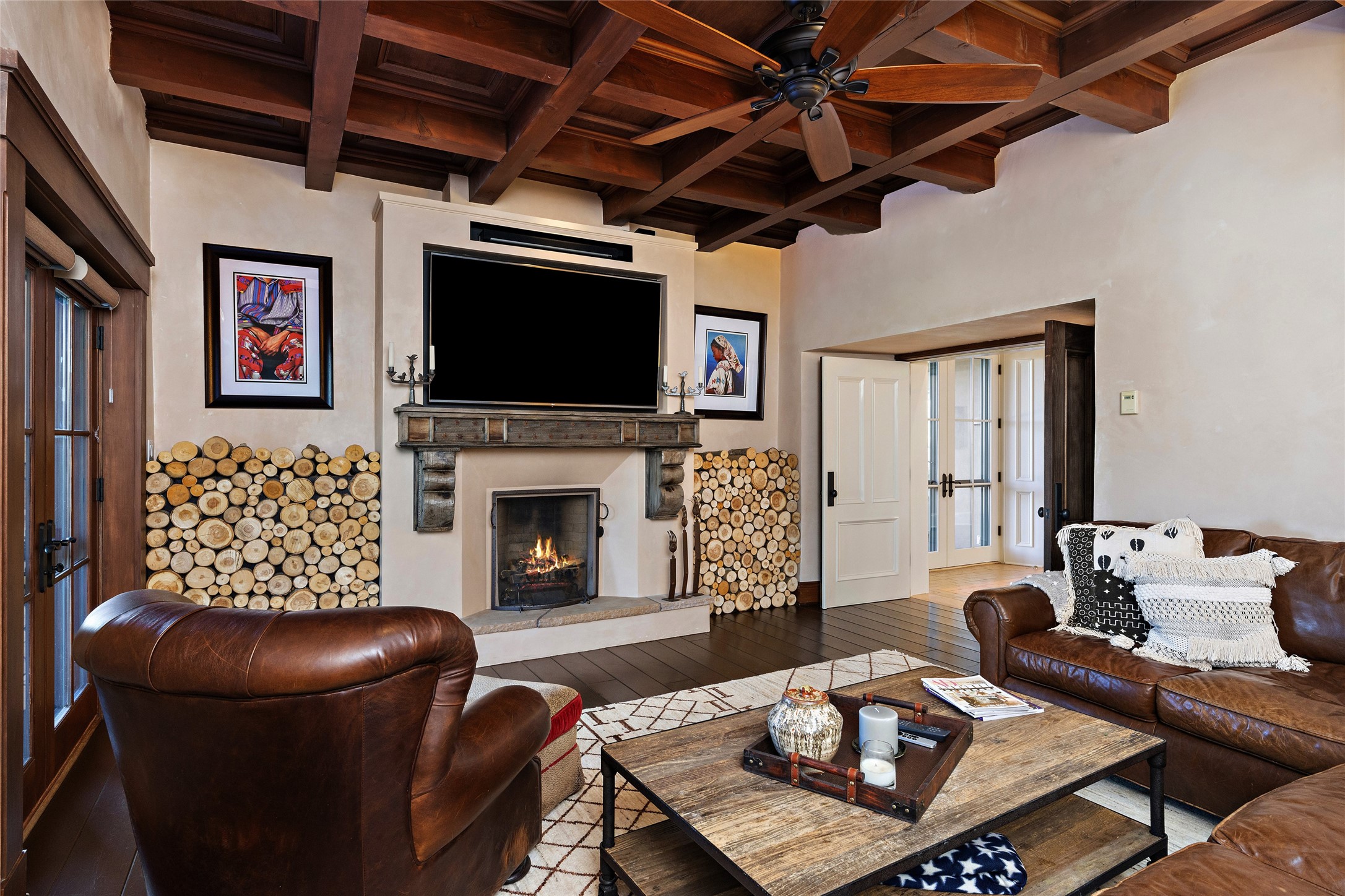 Sited on 1.57 gated park-like acres in Las Campanas with its own private gate, this elegant 7000 sq. ft., four-bedroom estate is surrounded by lush gardens, an extraordinary central courtyard with a cascading rock waterfall and mature landscaping, multiple outdoor entertaining areas and intimate portal/patio spaces.Winning three Hacienda Awards including the coveted "Judges Choice," this Territorial-style residence exudes the personality and taste of those accustomed to the finest quality, fit and finishes while preserving the quintessential Santa Fe elements to include clay plaster walls, coved ceilings, vigas, latillas and brick floors. The extensive use of glass and river rock bring the outside inside creating a comfortable, organic and serene environment. The main residence and casita have been thoughtfully remodeled for today's lifestyle. Nine of the ten fireplaces have natural gas for ease of use.The grand entryway draws your guests into a generous layout ideal for entertaining and the ample floor plan encompasses an impressive living room, beautiful dining room, a casual gathering room for family and friends, a stylish chef's kitchen/butler's pantry and handsomely fitted media room. There are three spacious bedrooms- each ensuite and each with private portals. The primary suite includes a luxurious spa-like bath area with a soaking tub and outdoor views, fireplace and wet room. **