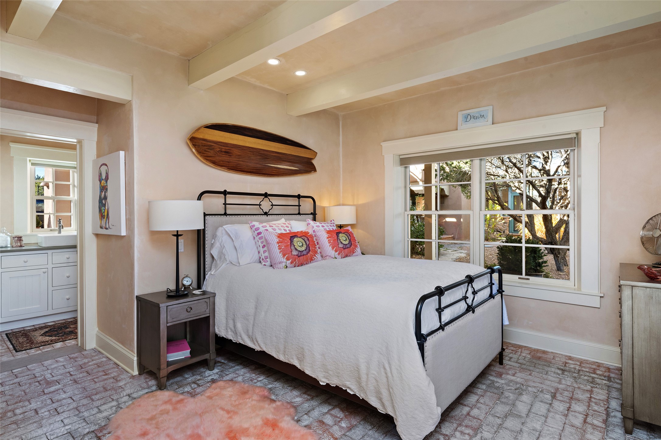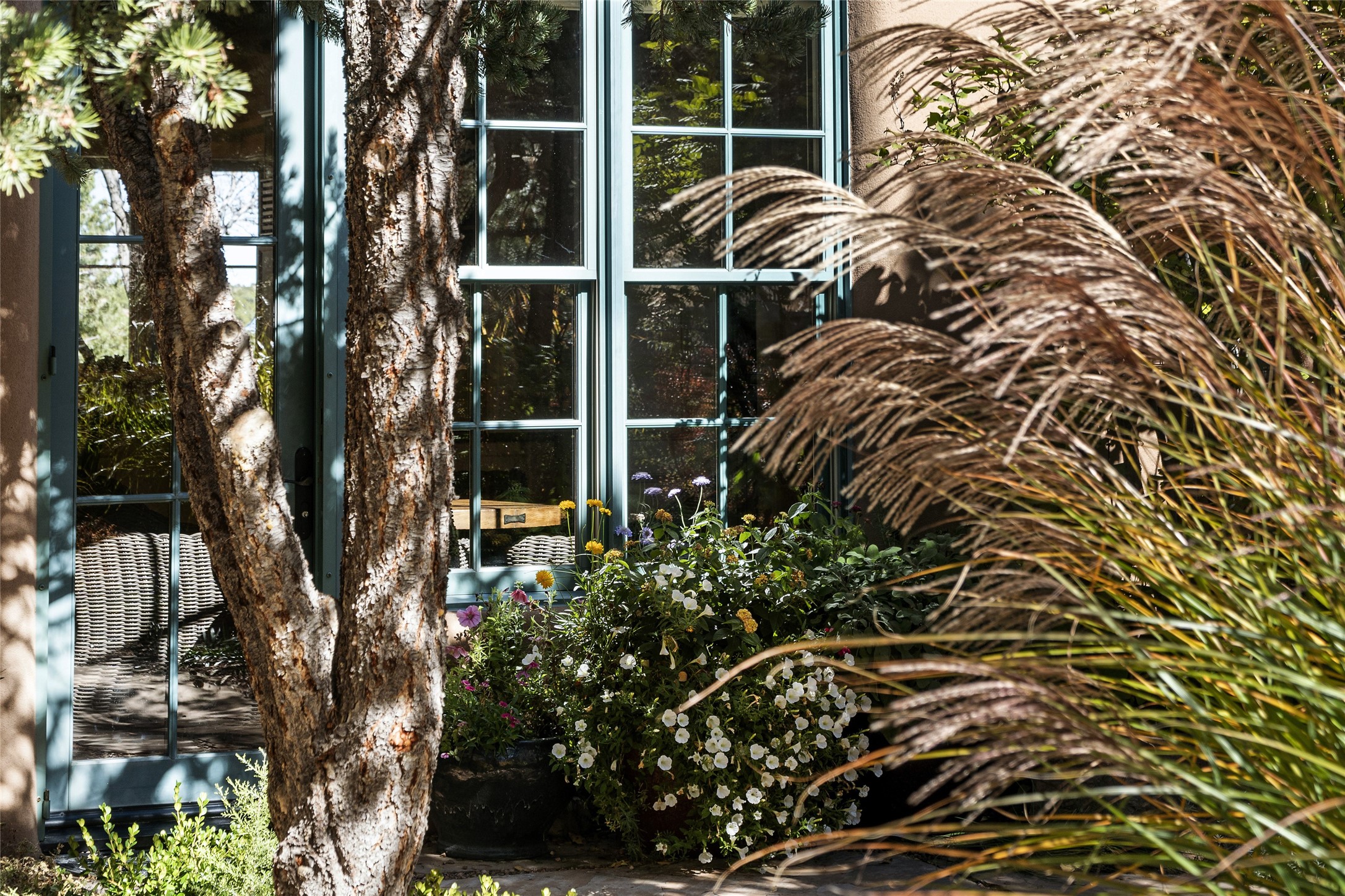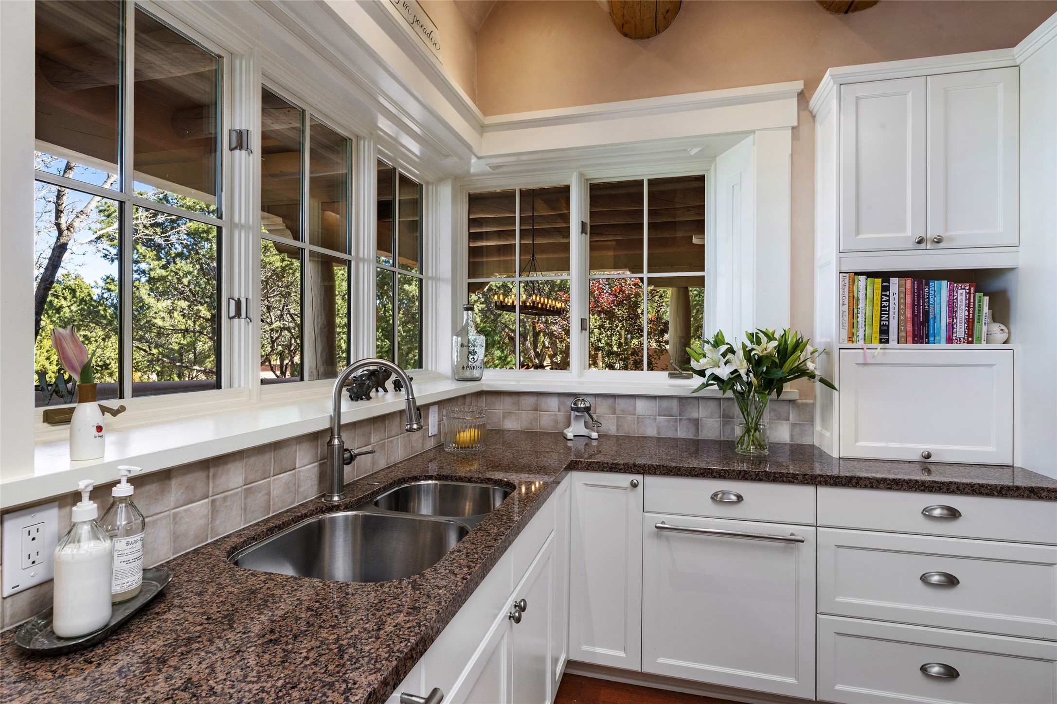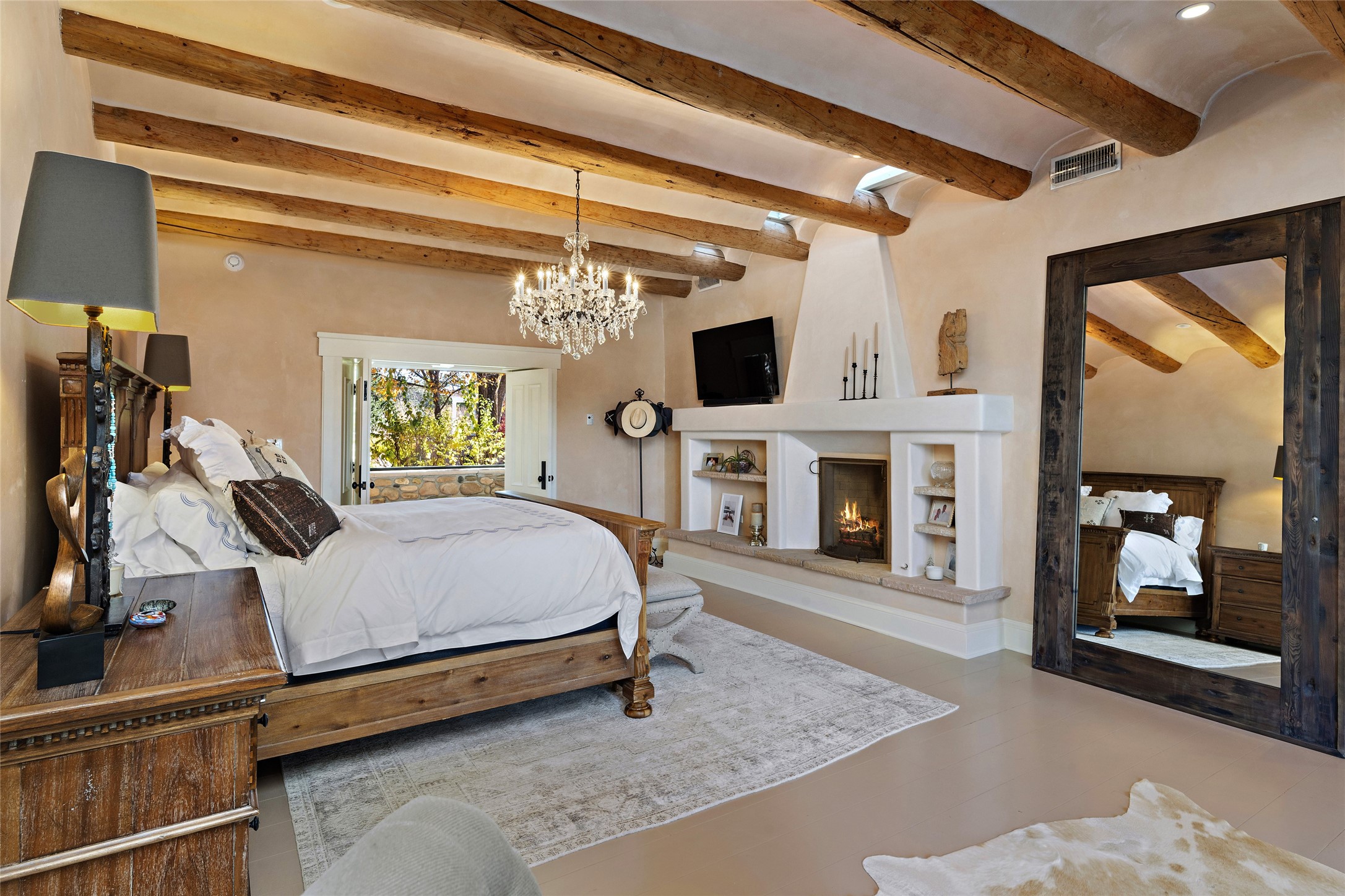 Sited on 1.57 gated park-like acres in Las Campanas with its own private gate, this elegant 7000 sq. ft., four-bedroom estate is surrounded by lush gardens, an extraordinary central courtyard with a cascading rock waterfall and mature landscaping, multiple outdoor entertaining areas and intimate portal/patio spaces.Winning three Hacienda Awards including the coveted "Judges Choice," this Territorial-style residence exudes the personality and taste of those accustomed to the finest quality, fit and finishes while preserving the quintessential Santa Fe elements to include clay plaster walls, coved ceilings, vigas, latillas and brick floors. The extensive use of glass and river rock bring the outside inside creating a comfortable, organic and serene environment. The main residence and casita have been thoughtfully remodeled for today's lifestyle. Nine of the ten fireplaces have natural gas for ease of use.The grand entryway draws your guests into a generous layout ideal for entertaining and the ample floor plan encompasses an impressive living room, beautiful dining room, a casual gathering room for family and friends, a stylish chef's kitchen/butler's pantry and handsomely fitted media room. There are three spacious bedrooms- each ensuite and each with private portals. The primary suite includes a luxurious spa-like bath area with a soaking tub and outdoor views, fireplace and wet room. **