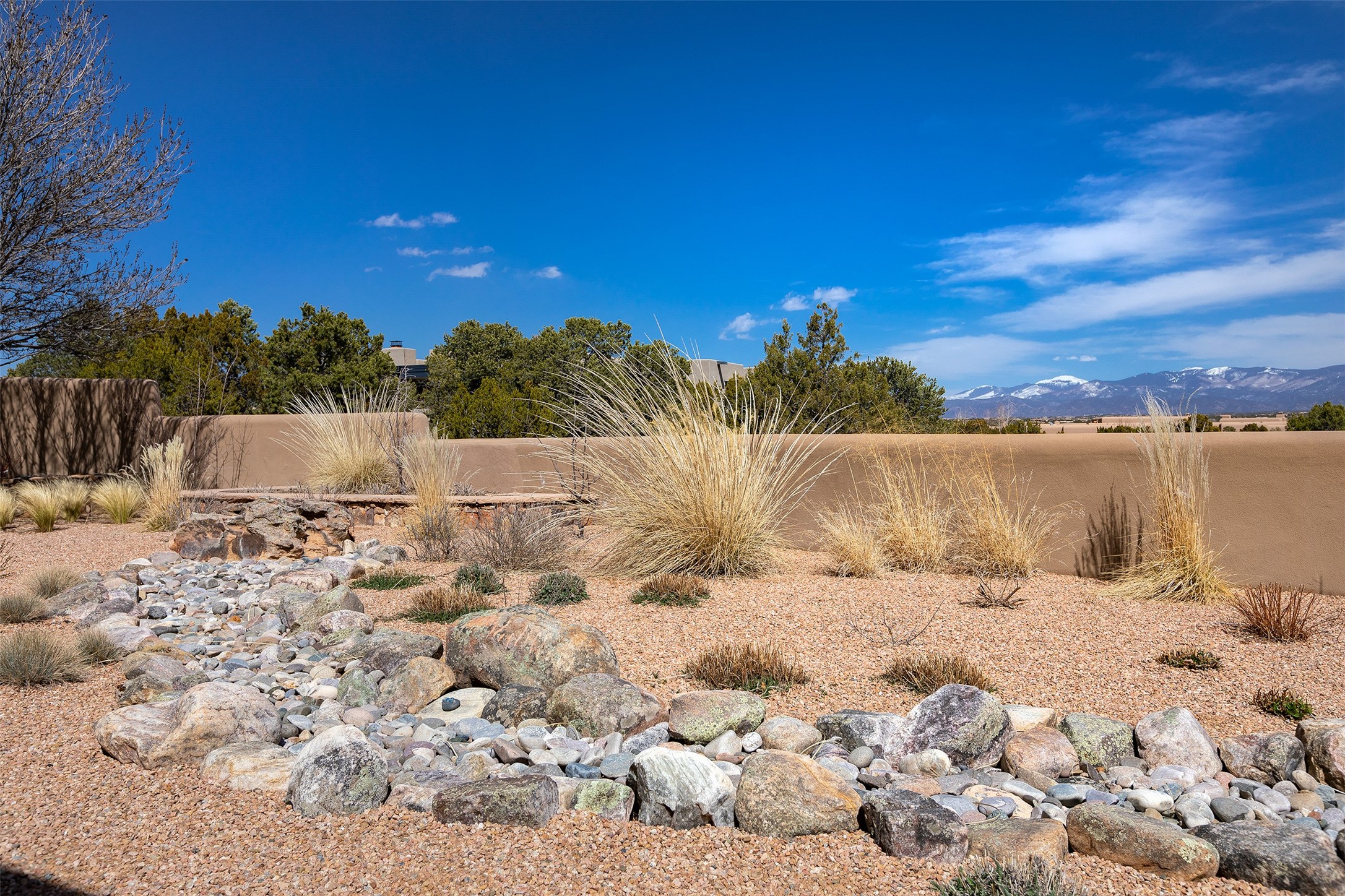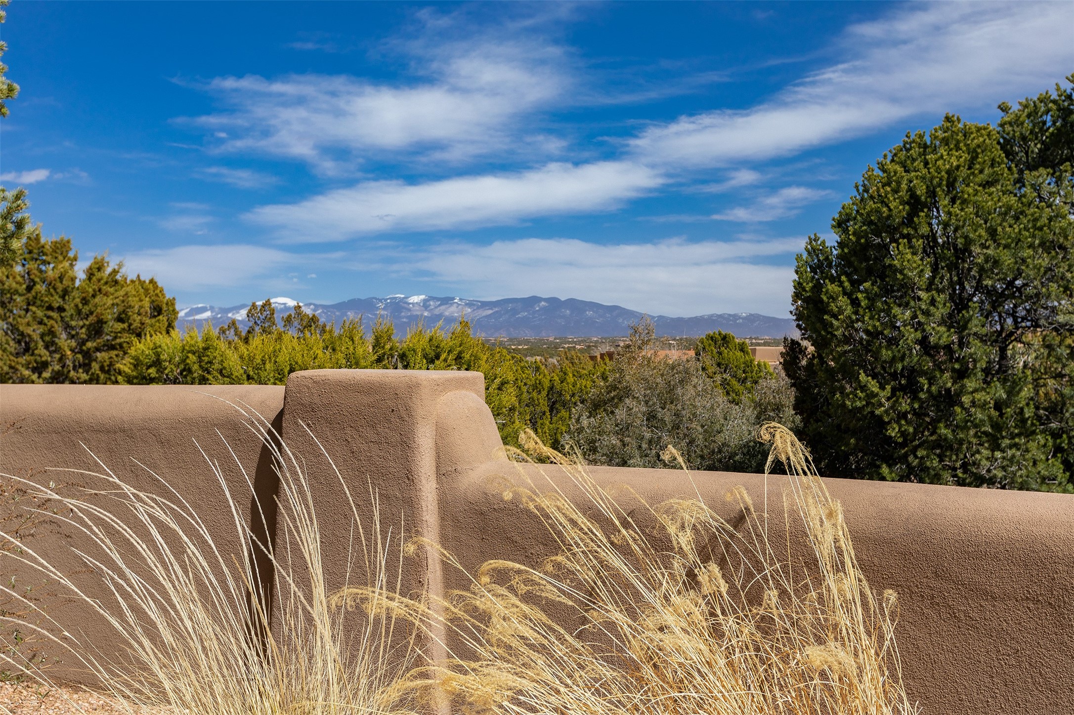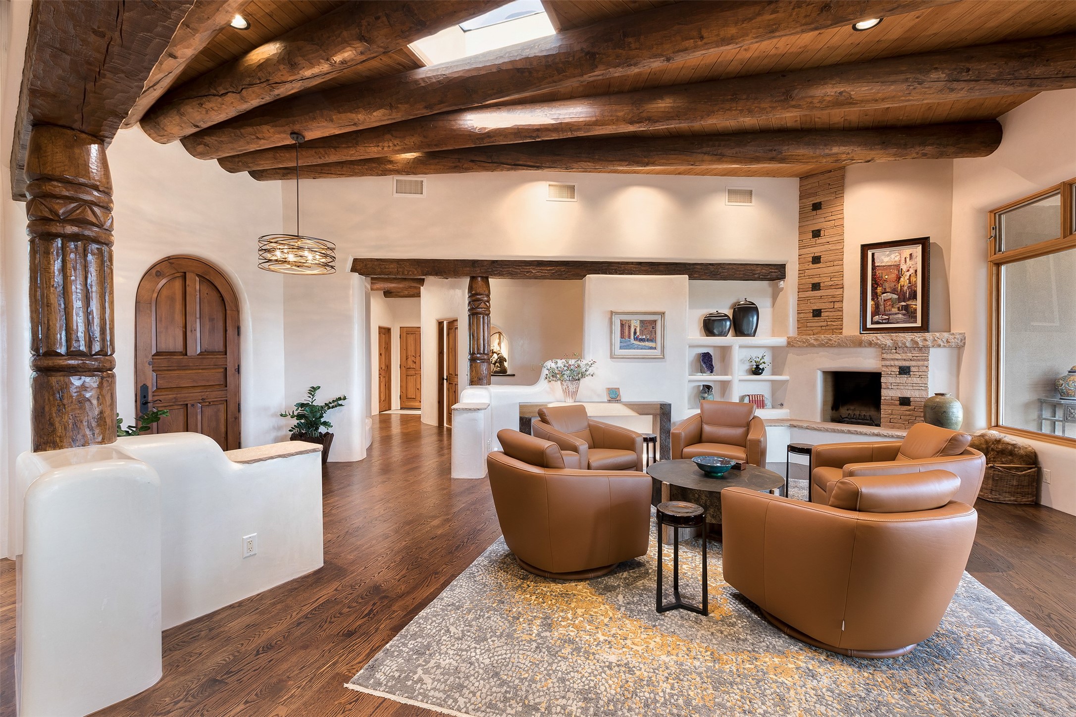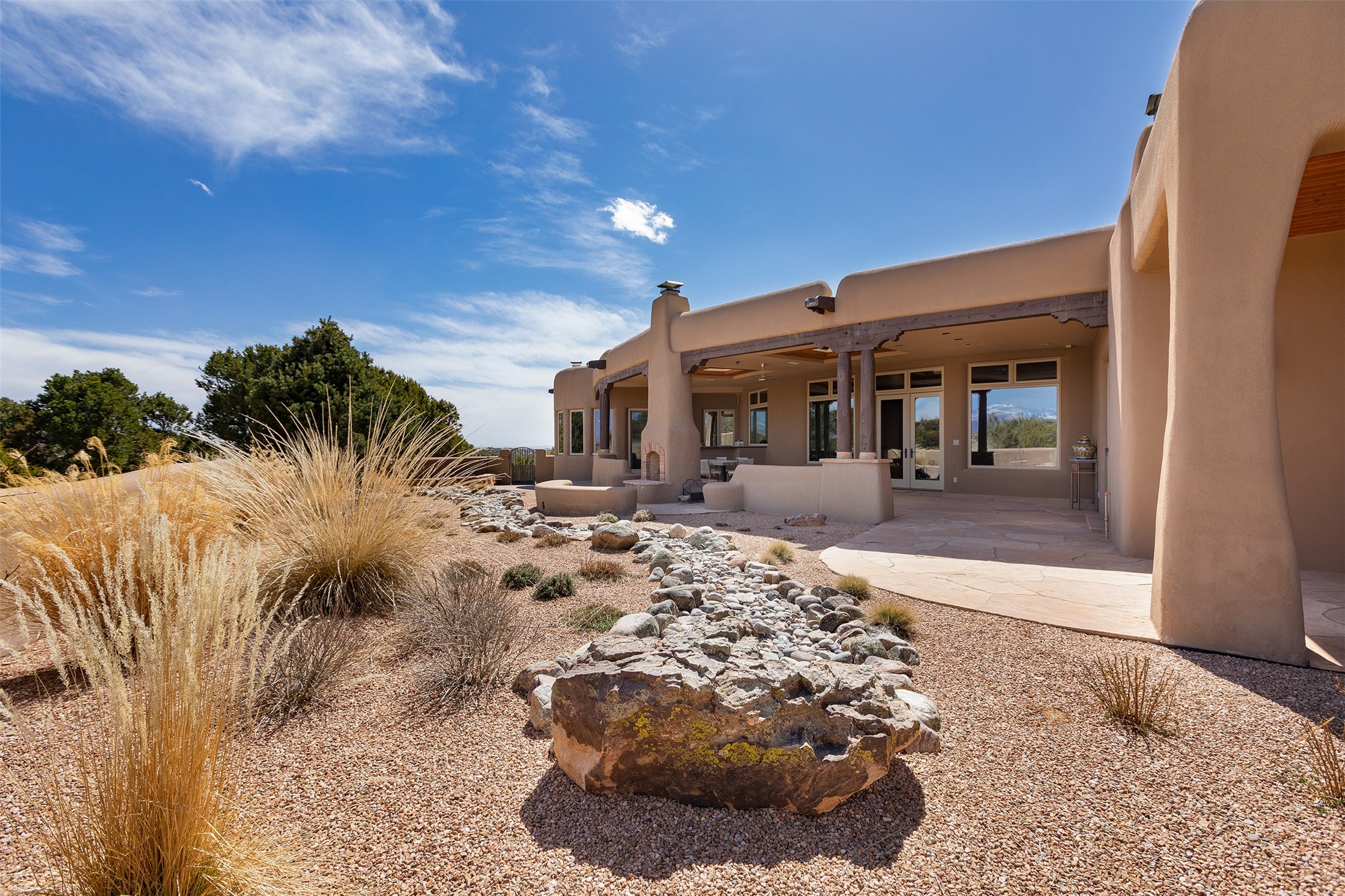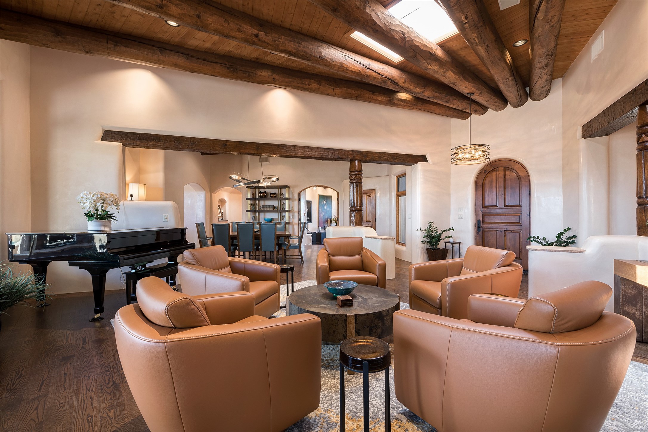 This home in Las Campanas has it all! The owners took a fabulous house and meticulously updated it. Masterfully designed to feature magnificent views of the Sangre de Cristo mountains and also the western sunset views with ever changing kaleidoscope clouds. Central evaporative AC, with 3 new units in 2020. Attached guest house/studio with separate entrance, home gym with sauna, home office, spacious portal with outdoor kitchen and fireplace, professionally landscaped and walled yard with water feature and the commanding Sangre views, a dream den with high ceilings, bar, large fireplace, 82" Samsung TV (this home is being offered furnished). Oversize 3-car garage with storage room. Hand plastered walls, beautiful wood floors. Equity Golf Membership available. Roof maintenance completed in March 2023 with transferrable warranty.