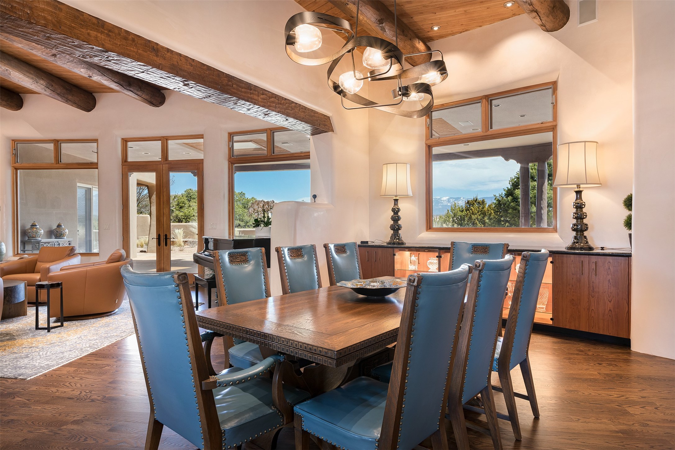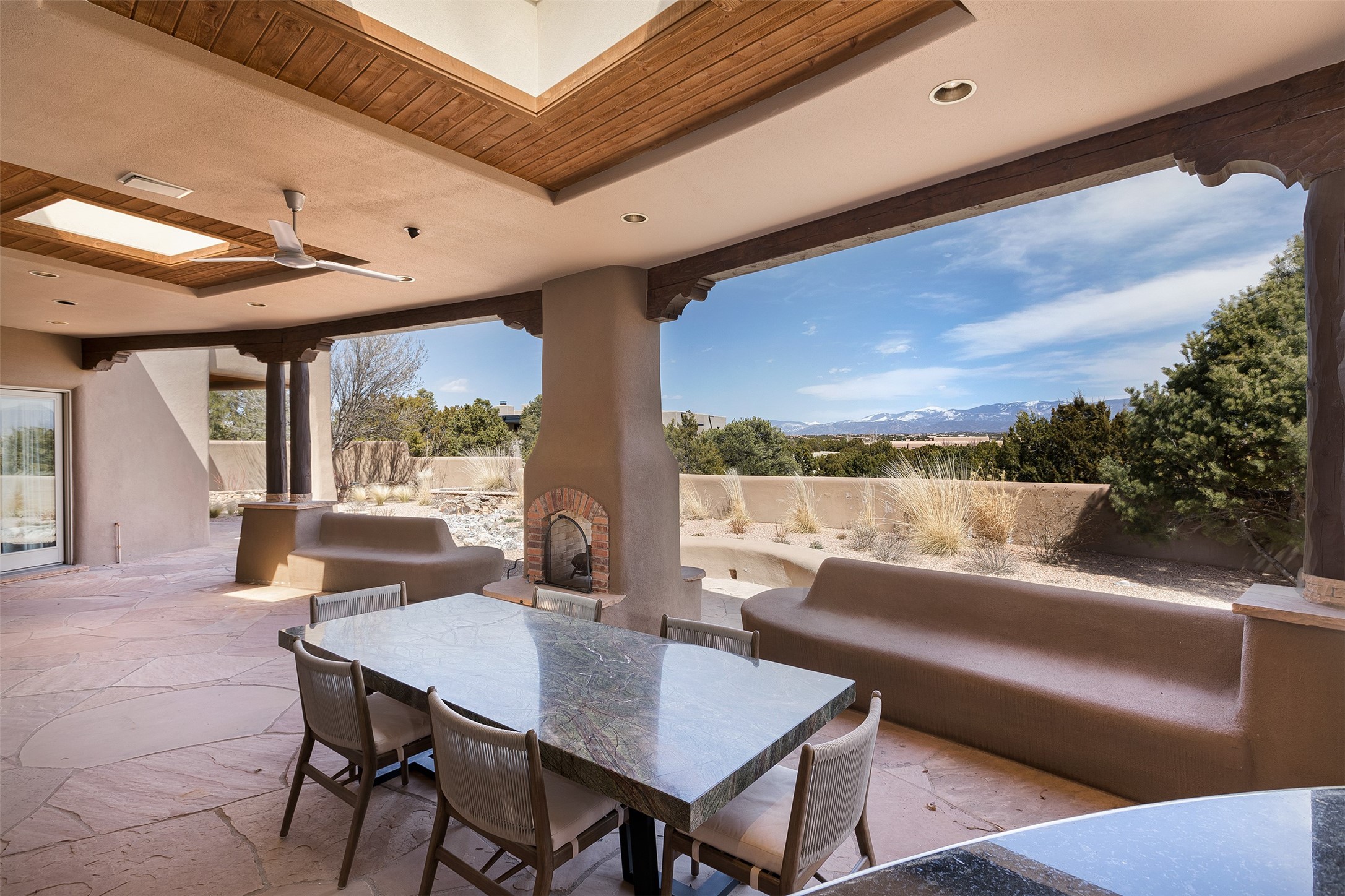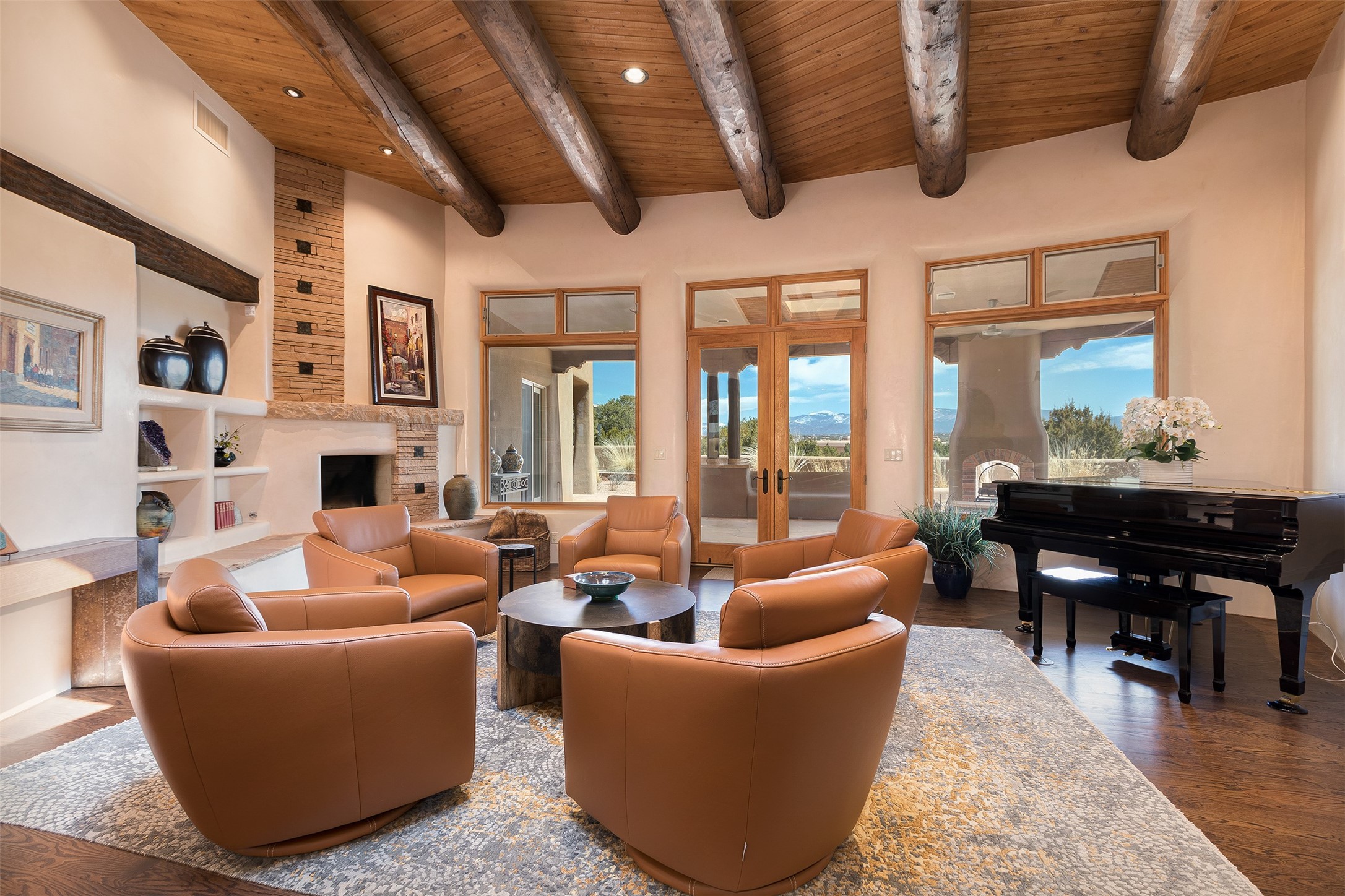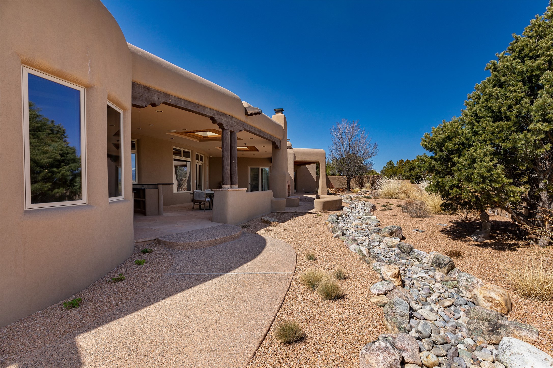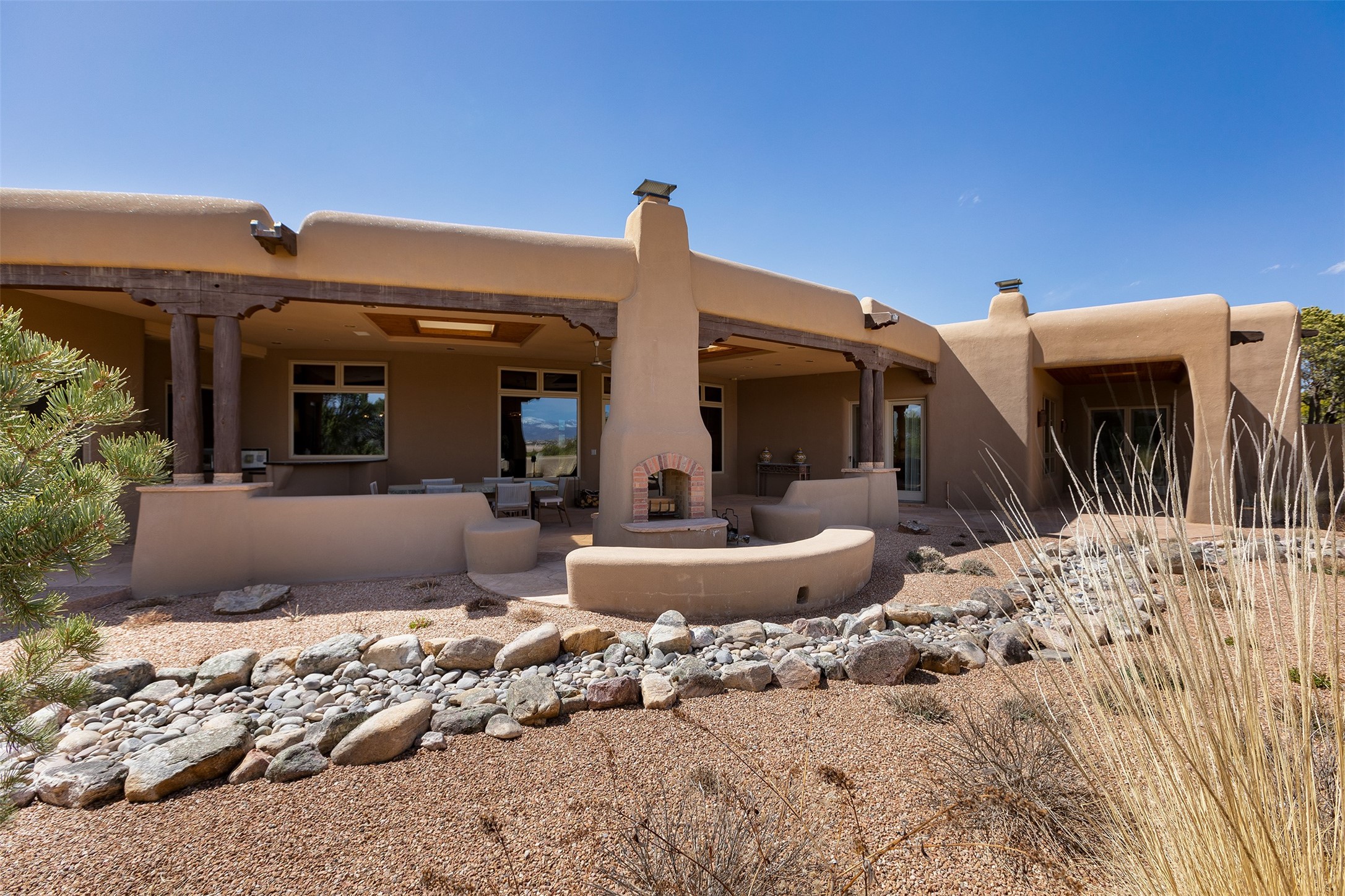 This home in Las Campanas has it all! The owners took a fabulous house and meticulously updated it. Masterfully designed to feature magnificent views of the Sangre de Cristo mountains and also the western sunset views with ever changing kaleidoscope clouds. Central evaporative AC, with 3 new units in 2020. Attached guest house/studio with separate entrance, home gym with sauna, home office, spacious portal with outdoor kitchen and fireplace, professionally landscaped and walled yard with water feature and the commanding Sangre views, a dream den with high ceilings, bar, large fireplace, 82" Samsung TV (this home is being offered furnished). Oversize 3-car garage with storage room. Hand plastered walls, beautiful wood floors. Equity Golf Membership available. Roof maintenance completed in March 2023 with transferrable warranty.