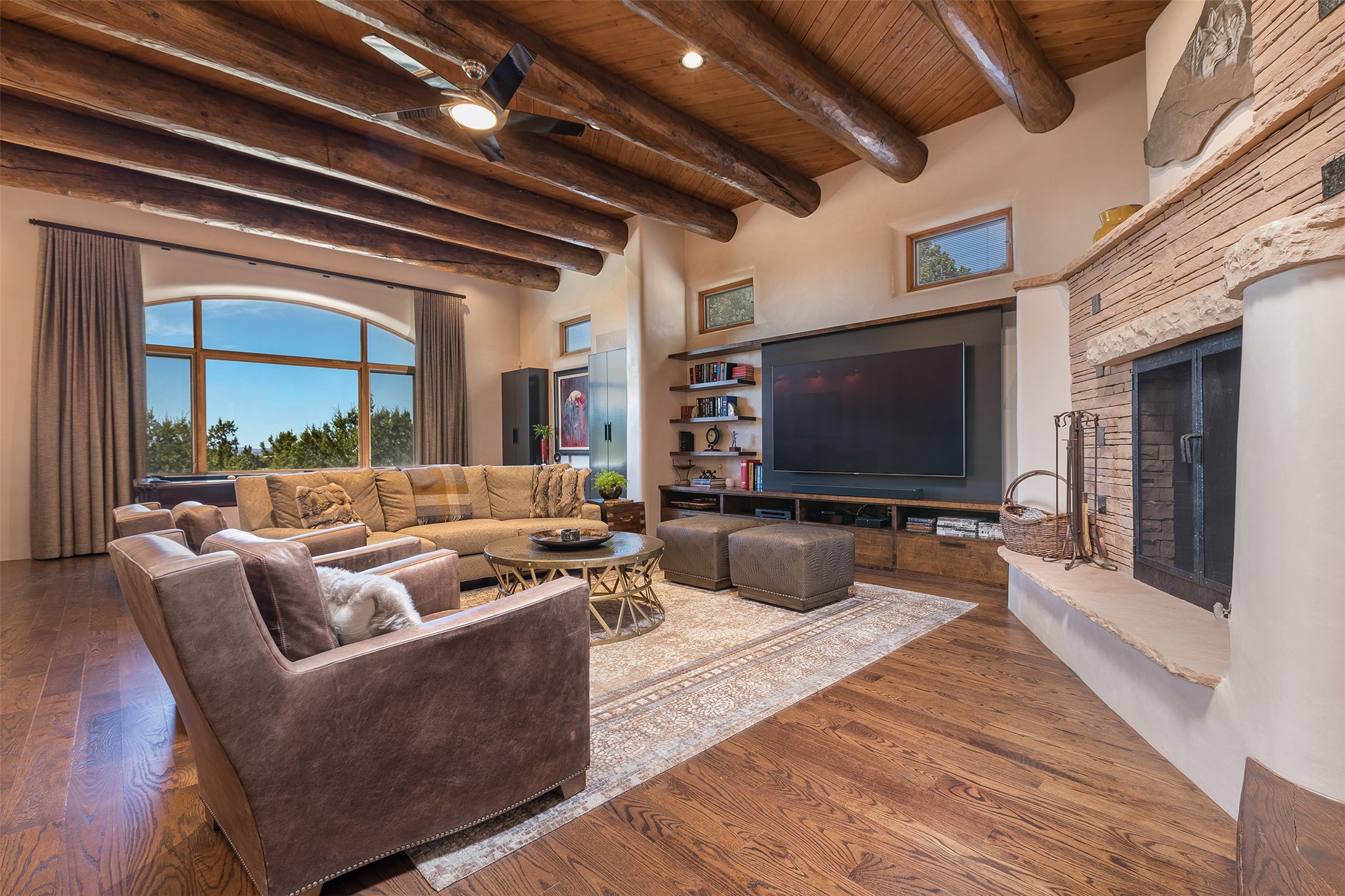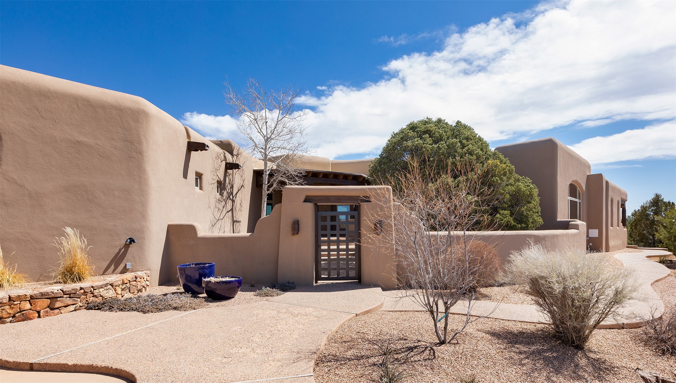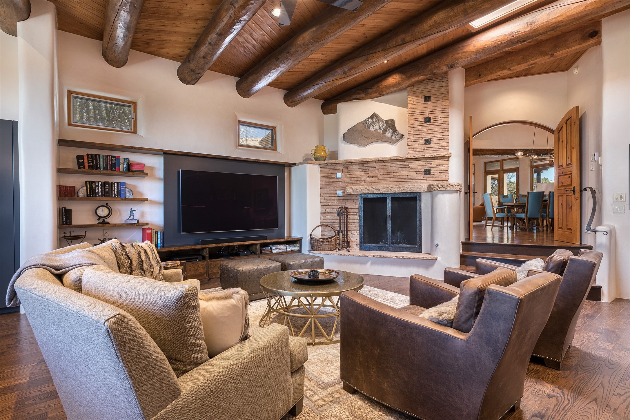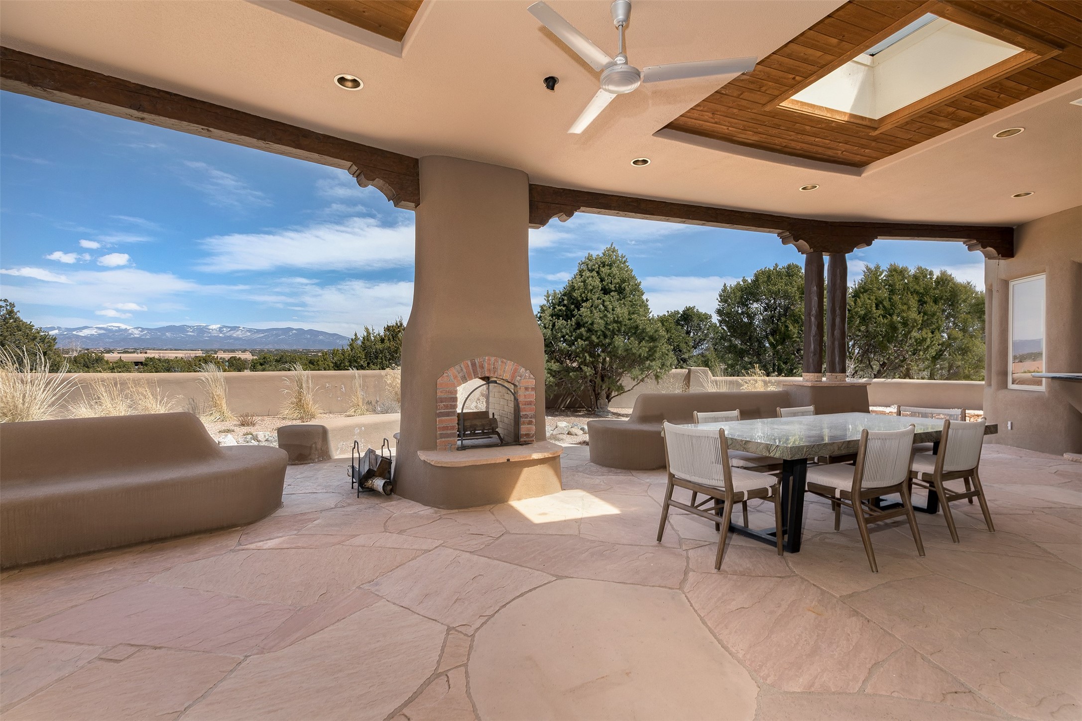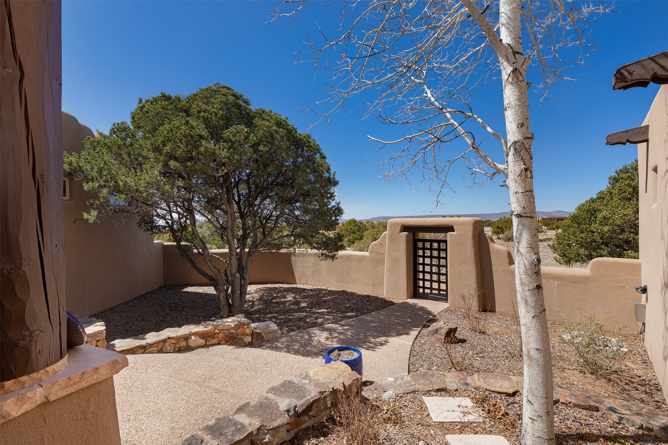 This home in Las Campanas has it all! The owners took a fabulous house and meticulously updated it. Masterfully designed to feature magnificent views of the Sangre de Cristo mountains and also the western sunset views with ever changing kaleidoscope clouds. Central evaporative AC, with 3 new units in 2020. Attached guest house/studio with separate entrance, home gym with sauna, home office, spacious portal with outdoor kitchen and fireplace, professionally landscaped and walled yard with water feature and the commanding Sangre views, a dream den with high ceilings, bar, large fireplace, 82" Samsung TV (this home is being offered furnished). Oversize 3-car garage with storage room. Hand plastered walls, beautiful wood floors. Equity Golf Membership available. Roof maintenance completed in March 2023 with transferrable warranty.