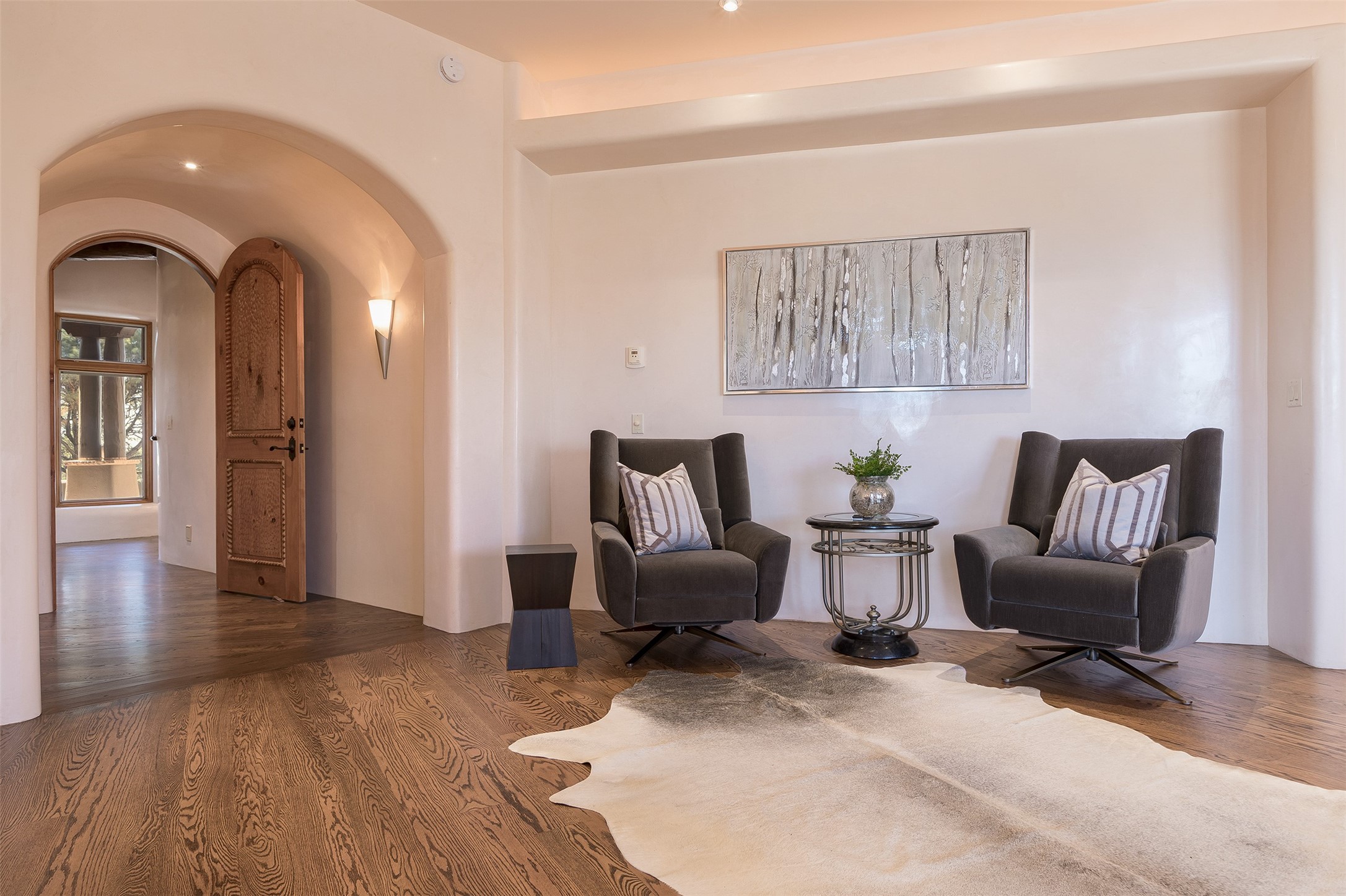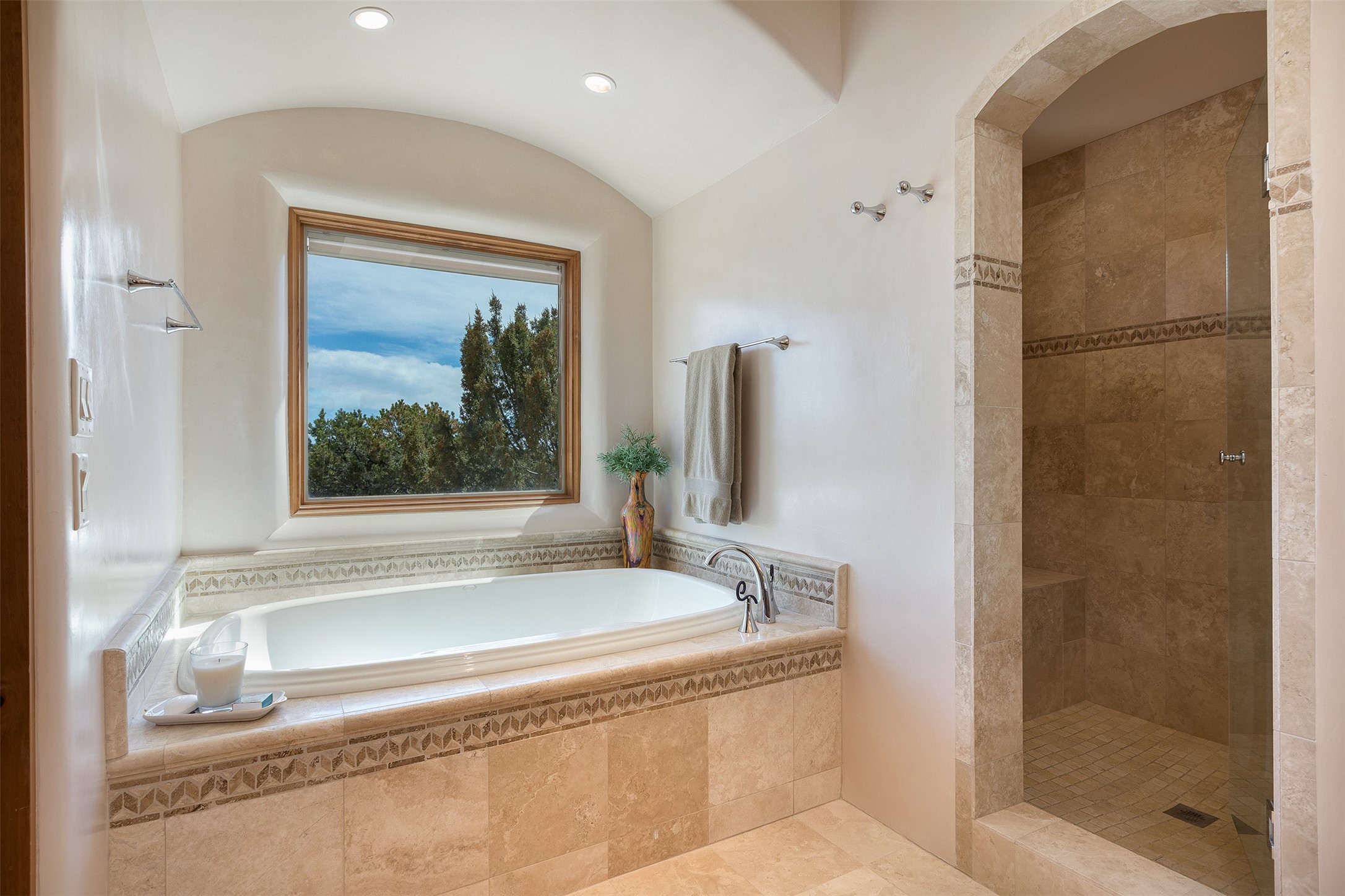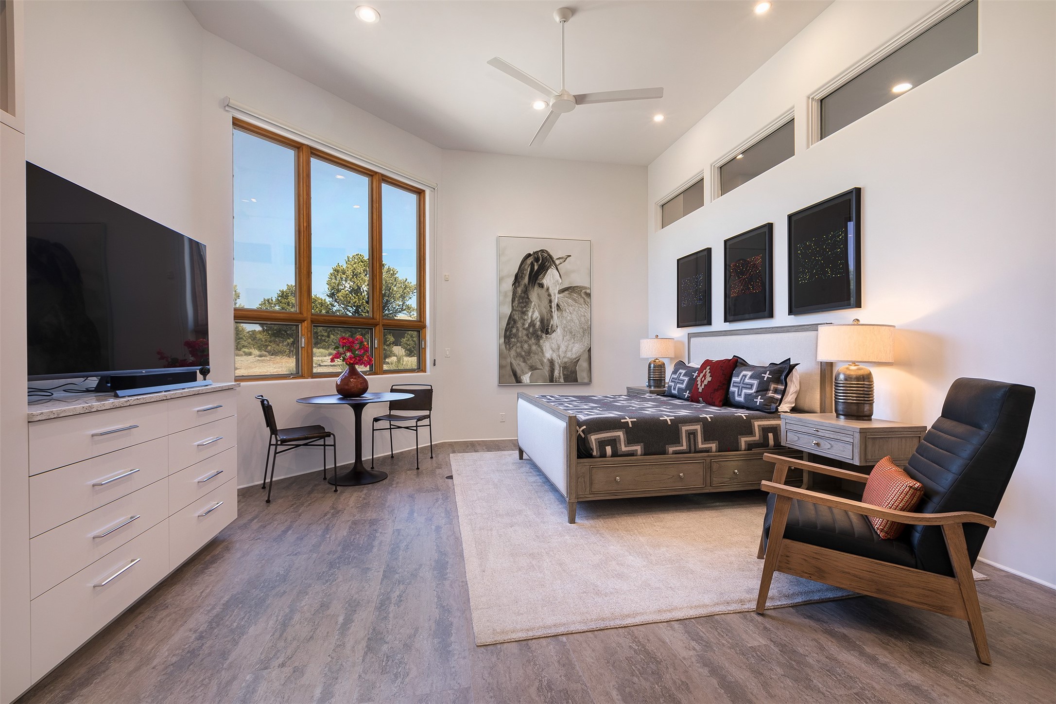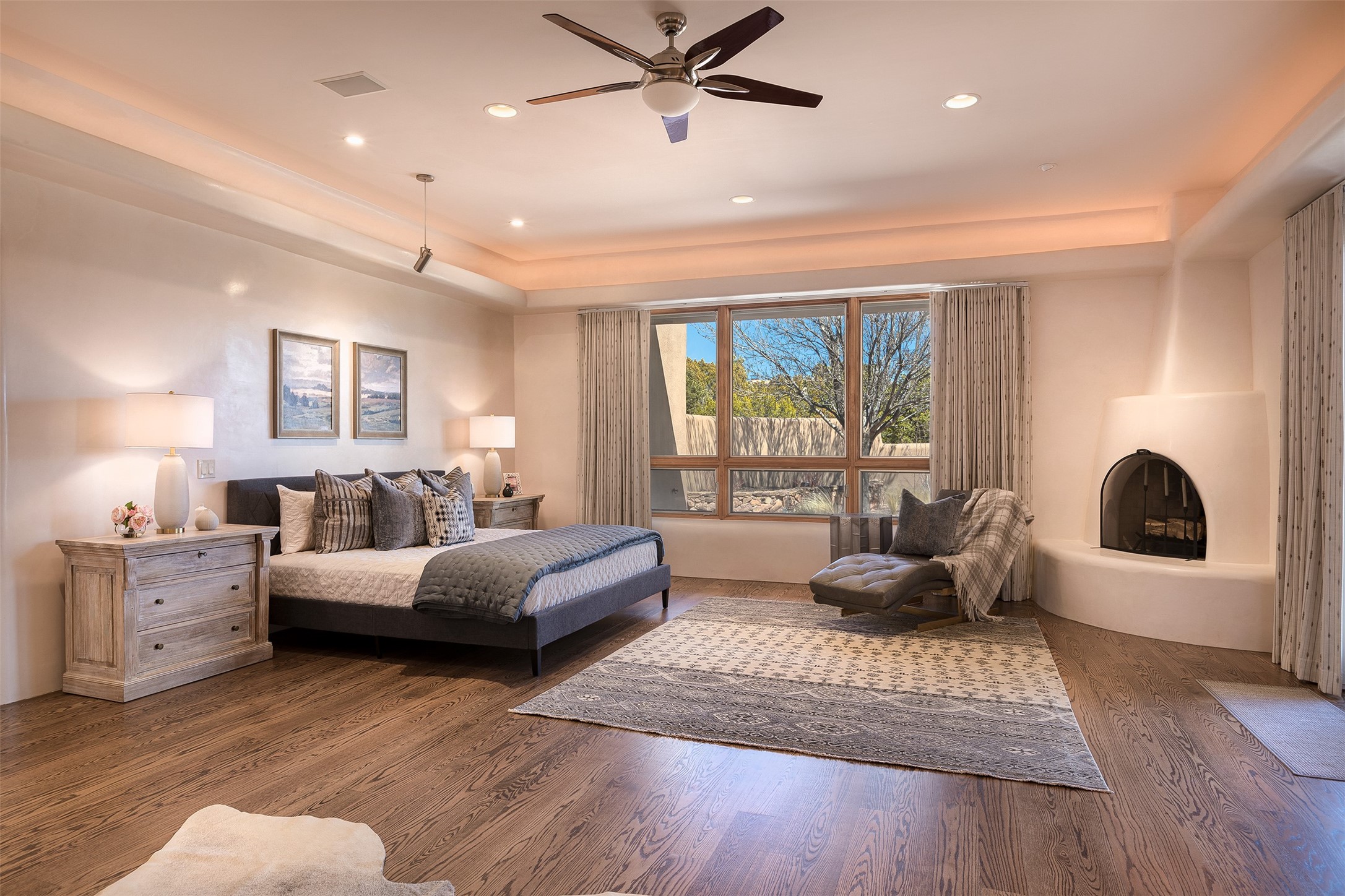 This home in Las Campanas has it all! The owners took a fabulous house and meticulously updated it. Masterfully designed to feature magnificent views of the Sangre de Cristo mountains and also the western sunset views with ever changing kaleidoscope clouds. Central evaporative AC, with 3 new units in 2020. Attached guest house/studio with separate entrance, home gym with sauna, home office, spacious portal with outdoor kitchen and fireplace, professionally landscaped and walled yard with water feature and the commanding Sangre views, a dream den with high ceilings, bar, large fireplace, 82" Samsung TV (this home is being offered furnished). Oversize 3-car garage with storage room. Hand plastered walls, beautiful wood floors. Equity Golf Membership available. Roof maintenance completed in March 2023 with transferrable warranty.