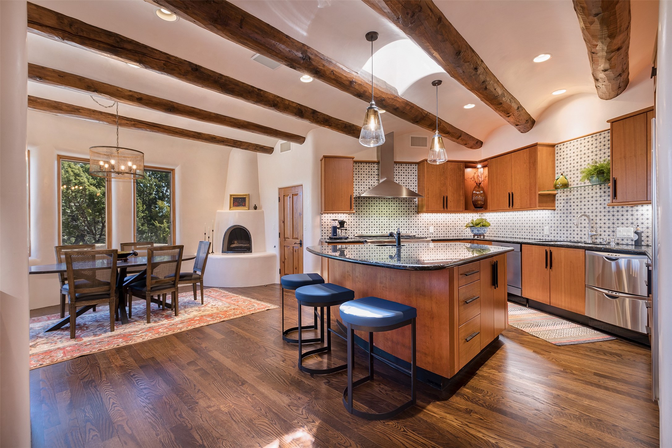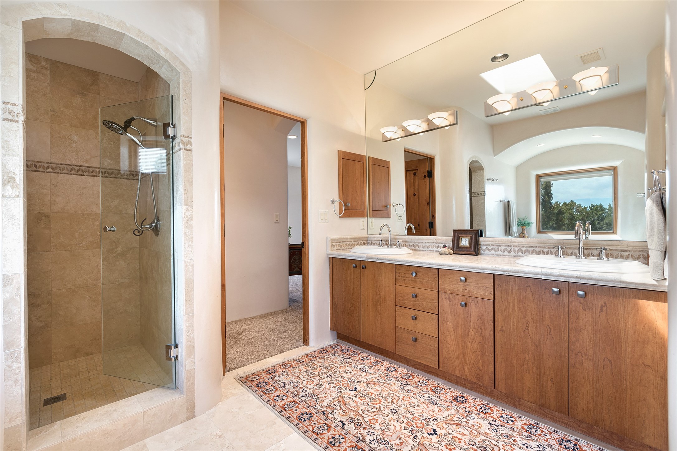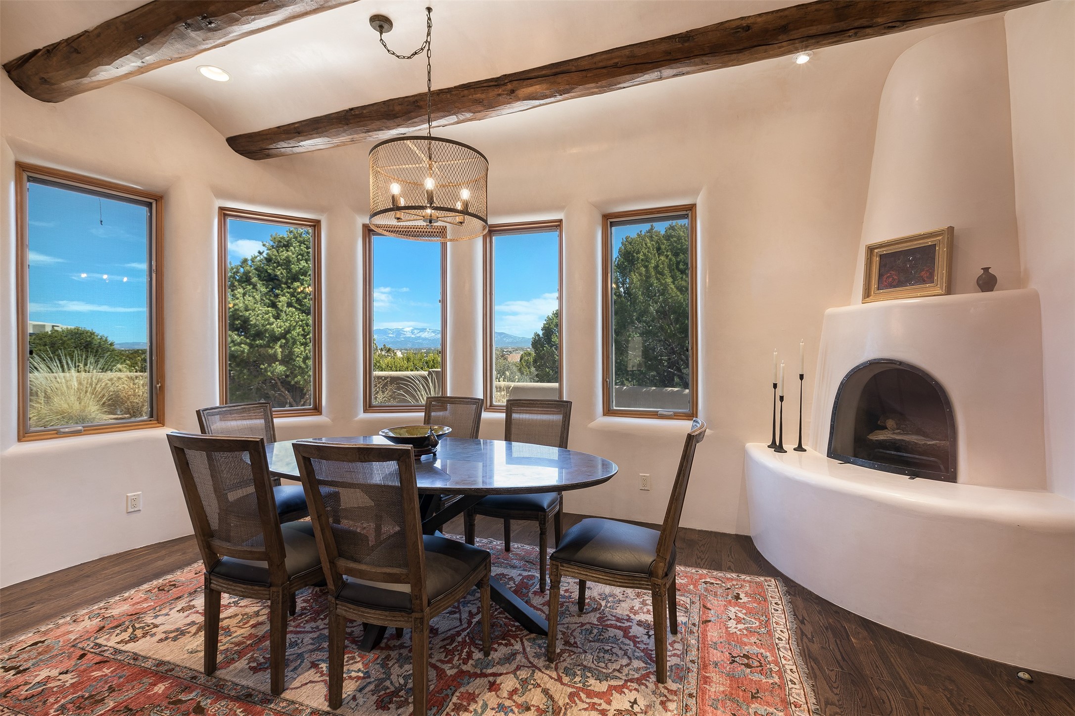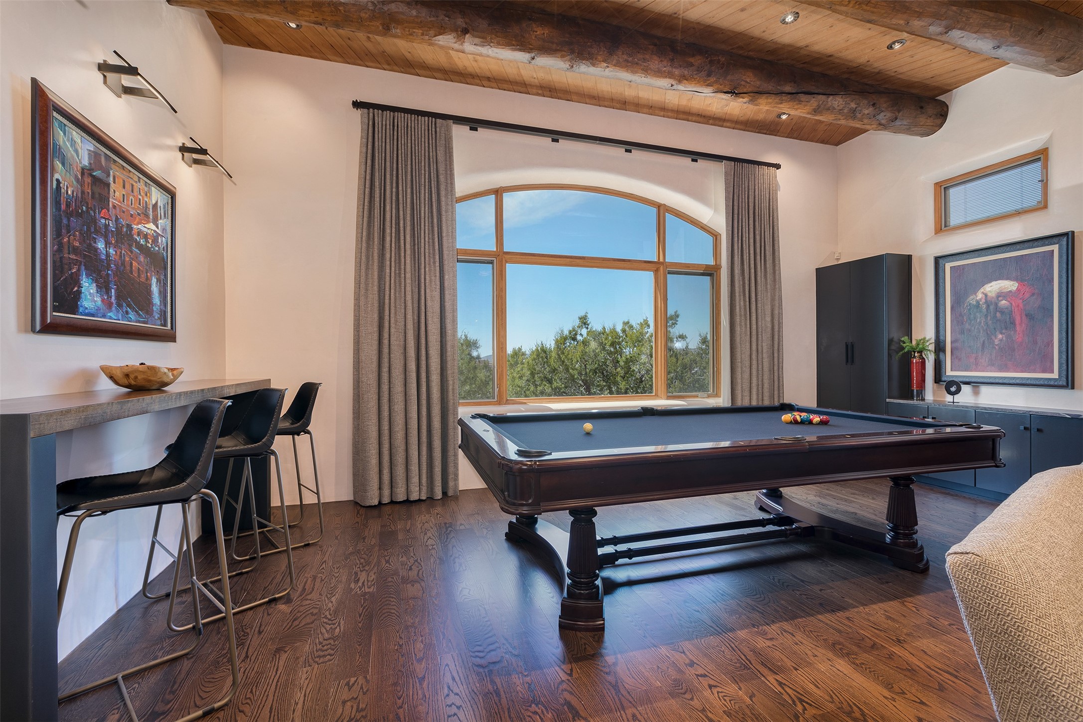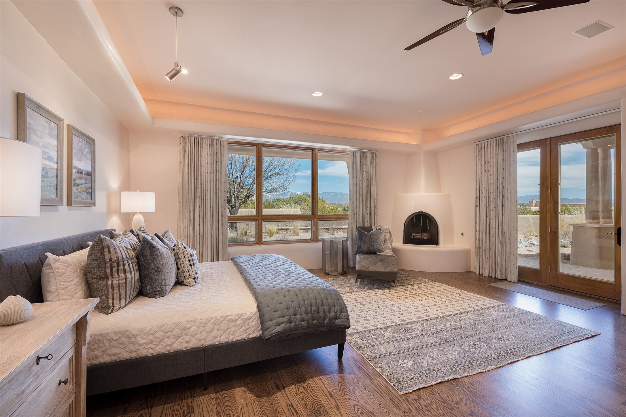 This home in Las Campanas has it all! The owners took a fabulous house and meticulously updated it. Masterfully designed to feature magnificent views of the Sangre de Cristo mountains and also the western sunset views with ever changing kaleidoscope clouds. Central evaporative AC, with 3 new units in 2020. Attached guest house/studio with separate entrance, home gym with sauna, home office, spacious portal with outdoor kitchen and fireplace, professionally landscaped and walled yard with water feature and the commanding Sangre views, a dream den with high ceilings, bar, large fireplace, 82" Samsung TV (this home is being offered furnished). Oversize 3-car garage with storage room. Hand plastered walls, beautiful wood floors. Equity Golf Membership available. Roof maintenance completed in March 2023 with transferrable warranty.