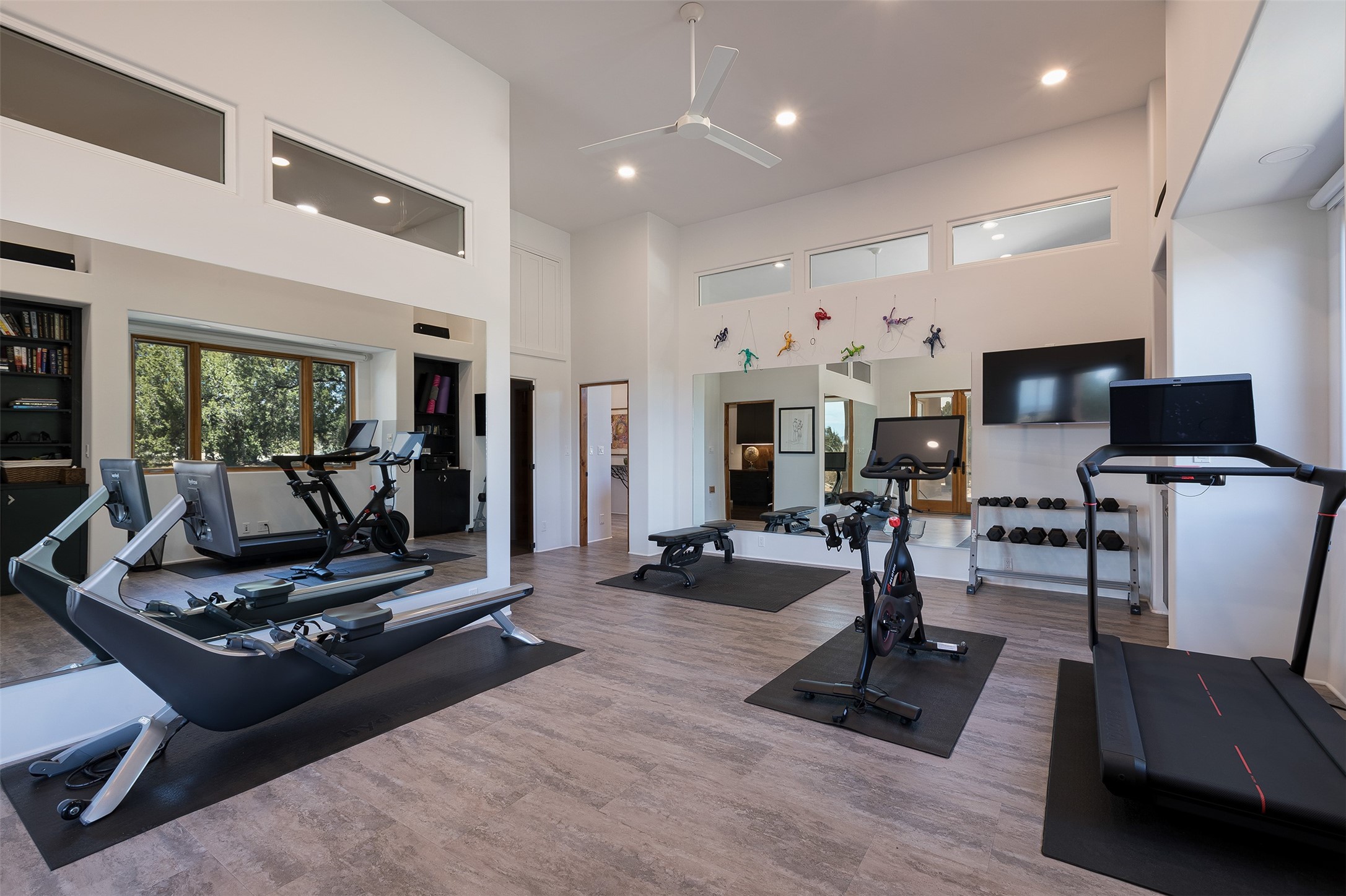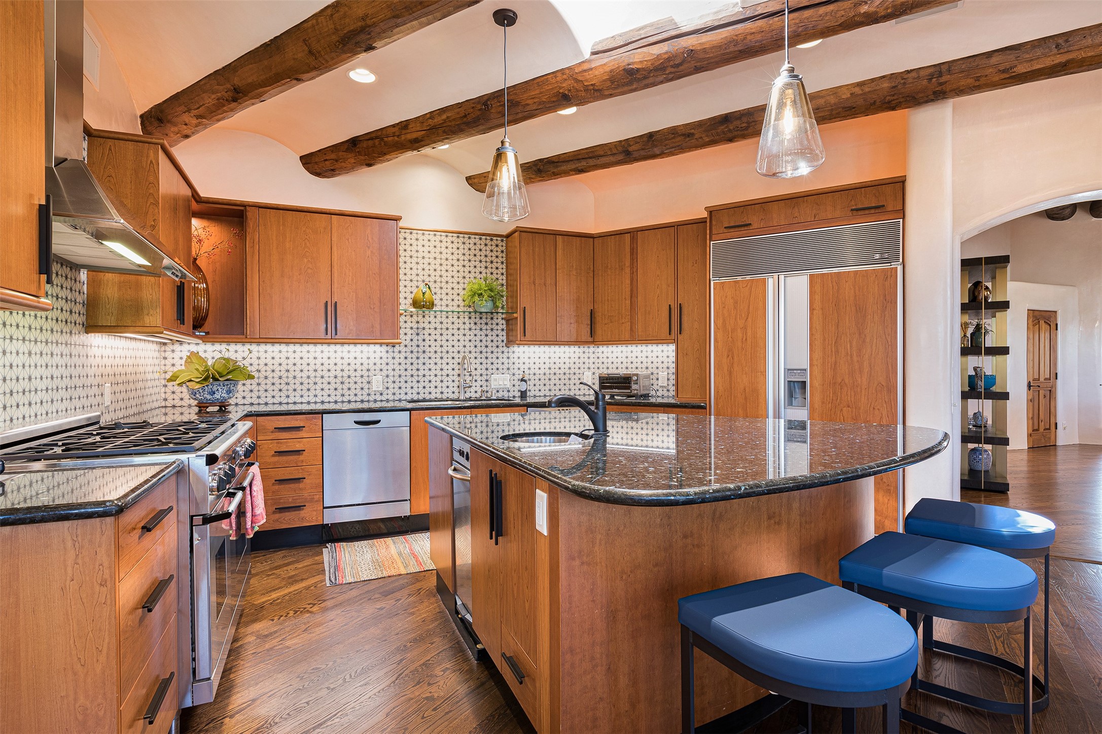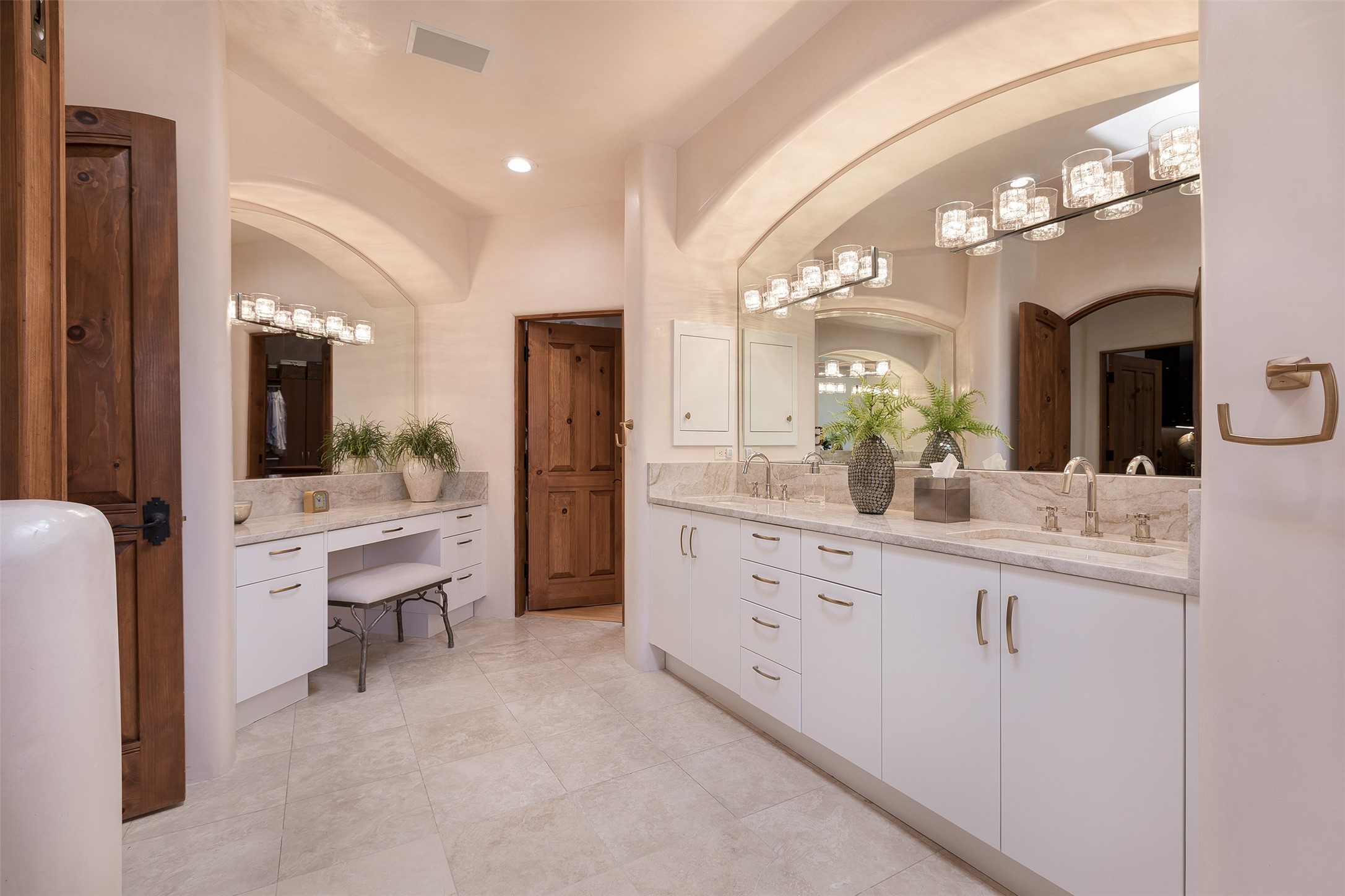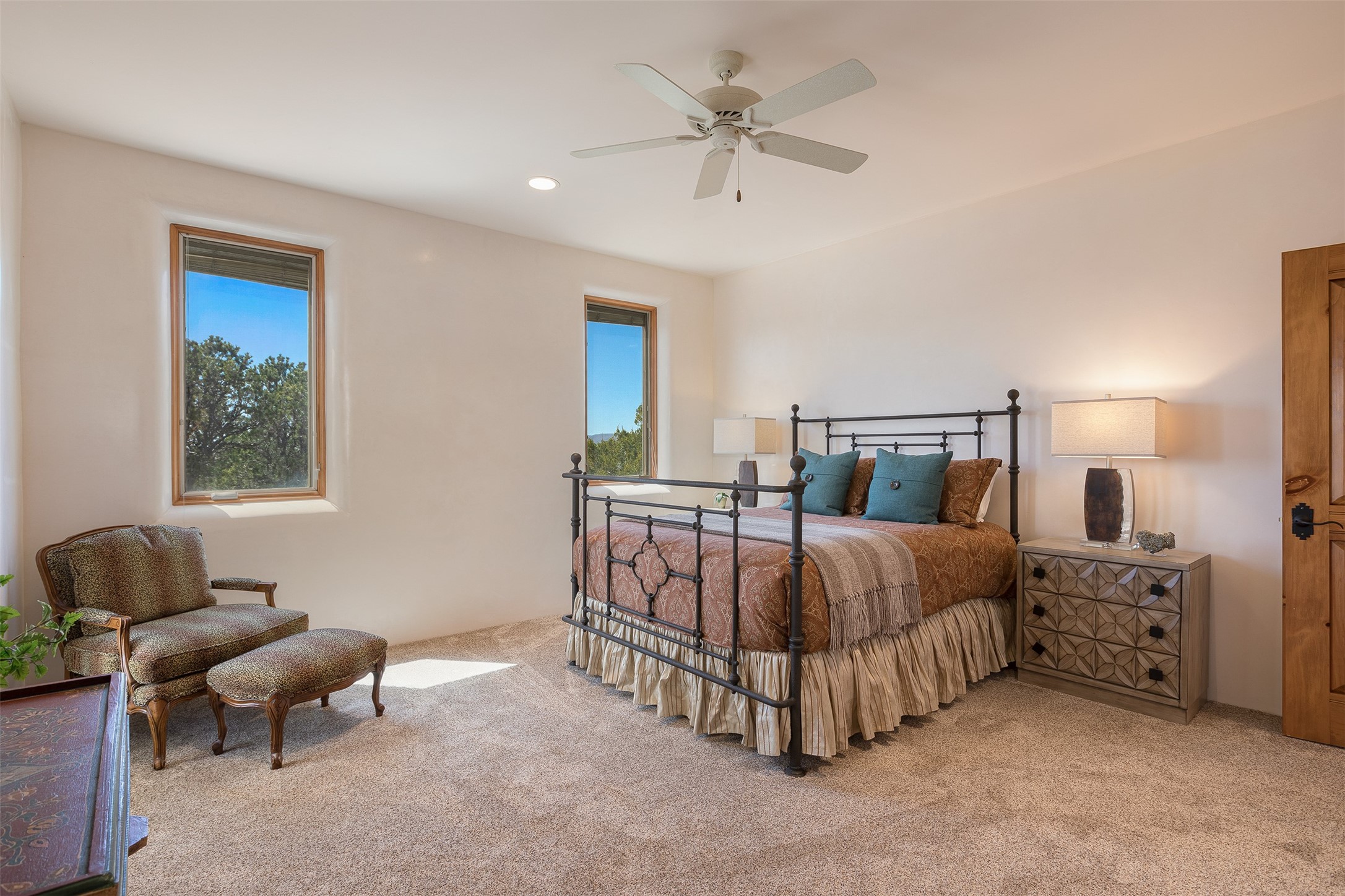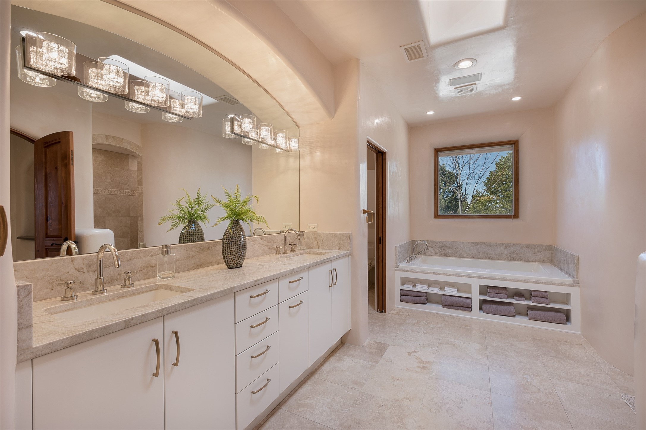 This home in Las Campanas has it all! The owners took a fabulous house and meticulously updated it. Masterfully designed to feature magnificent views of the Sangre de Cristo mountains and also the western sunset views with ever changing kaleidoscope clouds. Central evaporative AC, with 3 new units in 2020. Attached guest house/studio with separate entrance, home gym with sauna, home office, spacious portal with outdoor kitchen and fireplace, professionally landscaped and walled yard with water feature and the commanding Sangre views, a dream den with high ceilings, bar, large fireplace, 82" Samsung TV (this home is being offered furnished). Oversize 3-car garage with storage room. Hand plastered walls, beautiful wood floors. Equity Golf Membership available. Roof maintenance completed in March 2023 with transferrable warranty.