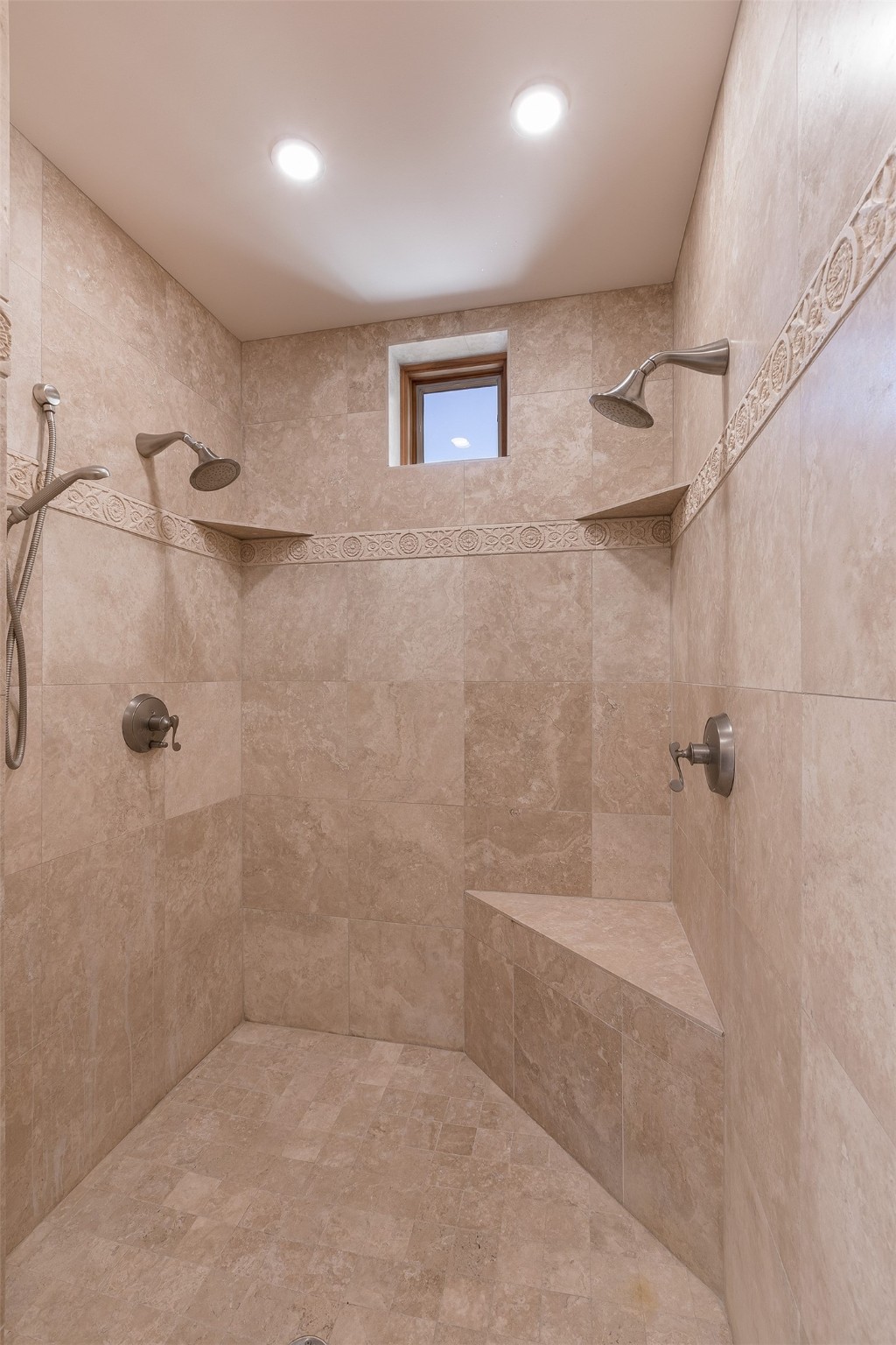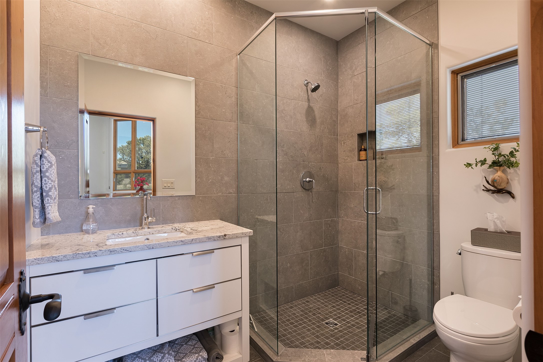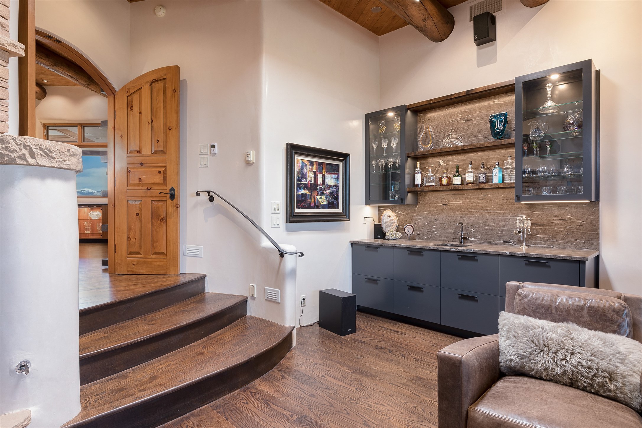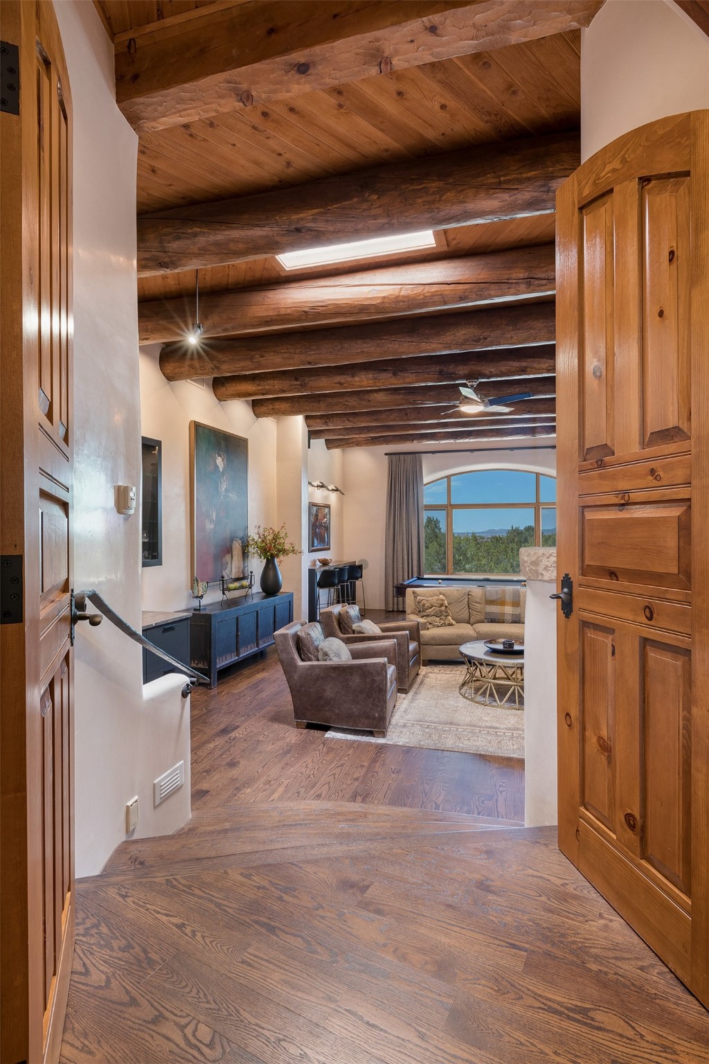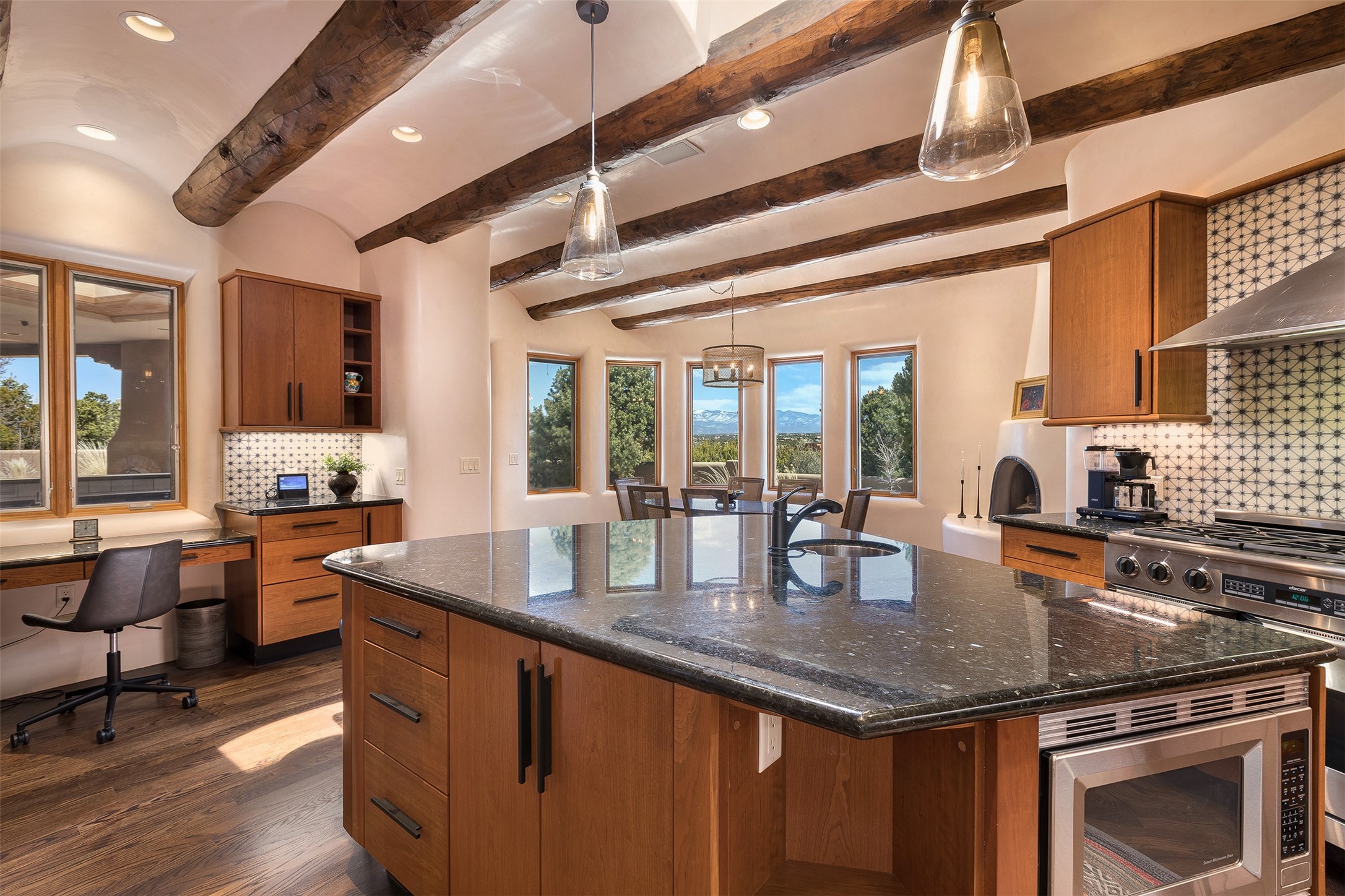 This home in Las Campanas has it all! The owners took a fabulous house and meticulously updated it. Masterfully designed to feature magnificent views of the Sangre de Cristo mountains and also the western sunset views with ever changing kaleidoscope clouds. Central evaporative AC, with 3 new units in 2020. Attached guest house/studio with separate entrance, home gym with sauna, home office, spacious portal with outdoor kitchen and fireplace, professionally landscaped and walled yard with water feature and the commanding Sangre views, a dream den with high ceilings, bar, large fireplace, 82" Samsung TV (this home is being offered furnished). Oversize 3-car garage with storage room. Hand plastered walls, beautiful wood floors. Equity Golf Membership available. Roof maintenance completed in March 2023 with transferrable warranty.