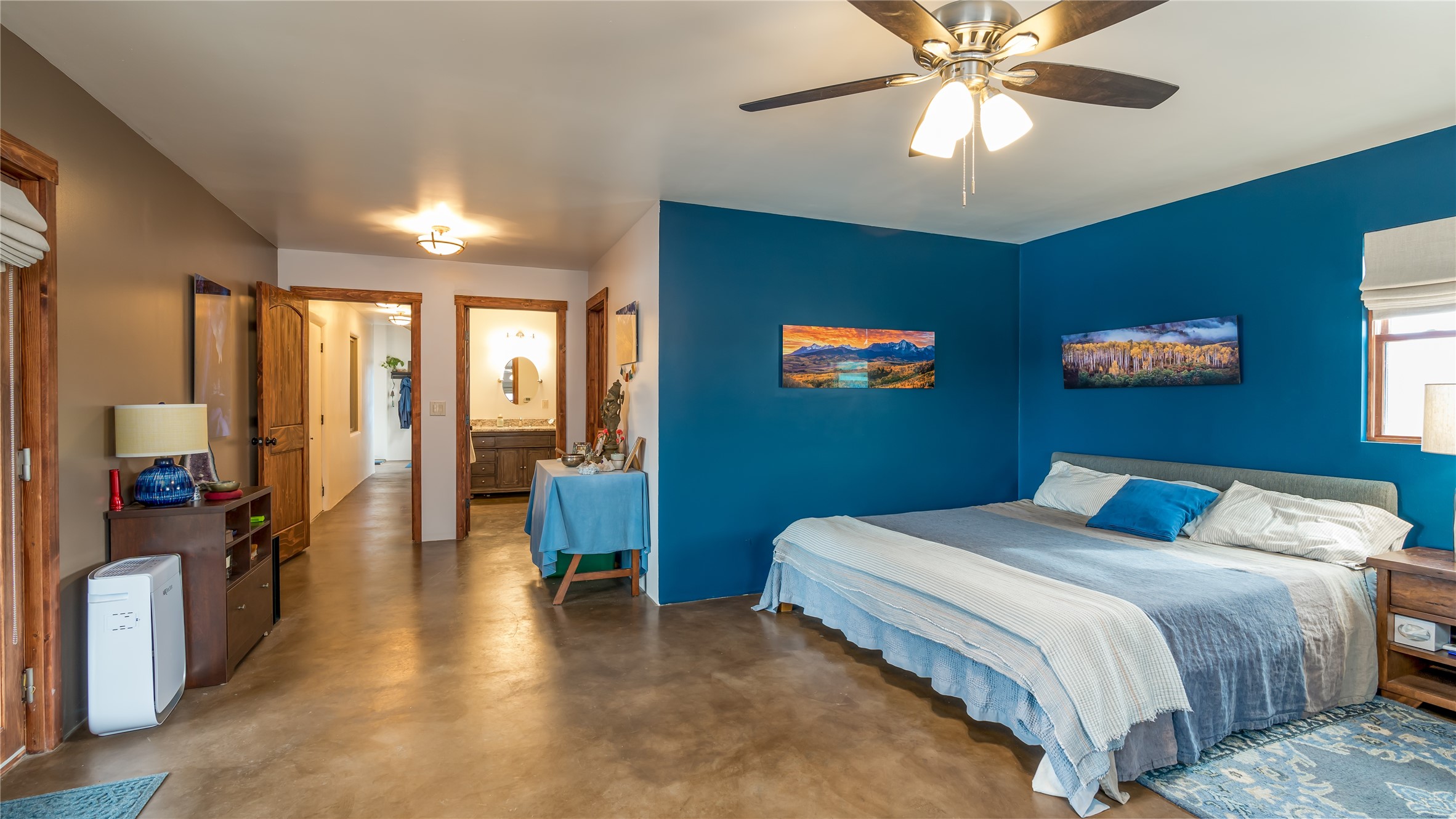 This spectacular, secluded Santa Fe Modern compound is one-of-a-kind. Located in the Art Barn district near Eldorado, this 12.5 acre property was masterfully designed to feature panoramic views of several mountain ranges, as well as wildlife viewing. Only 25 minutes from the Plaza and 5 minutes to nearby restaurants, this stunning estate is adjacent to a 100-acre private nature preserve and the 4,000 acre Eldorado Wilderness. Nestled amidst groves of native trees, this property consists of 3 homes totaling 6 bedrooms, each with an ensuite bathroom. This magnificent home brings the outdoors inside with numerous glass exposures and several private patios. The home and grounds have been updated using organic and non-toxic materials to further integrate the classic Santa Fe style. The primary suite offers a gas fireplace, enormous closet, private office, patio, and gorgeous primary bath with a soaking tub and steam shower. The Great Room has towering ceilings with abundant natural light. The custom wine room, wet bar, stunning tile and hand troweled plaster walls are just a few of the refined features this home offers. The Chef's kitchen features Wolf appliances, granite countertops with an over-sized island, and a walk-through butler's panty to a kitchen garden. The 3-car garage attached to the Main Residence is partially heated and offers extensive storage space, along with outdoor closets attached to the south patio. The guest house features 2 separate suites, a private portal, steam shower and beautiful kiva fireplace. A front porch offers bird and wildlife viewing while watching epic sunsets as an added bonus. The caretaker's cottage is over 1000 sq feet and has been used as a successful rental, This is a one-of-a kind property that has been meticulously cared for and recently upgraded in many aspects. This home is perfect for those wanting the quiet of a more rural area, while providing the comfort and convenience to the historic Santa Fe Plaza.