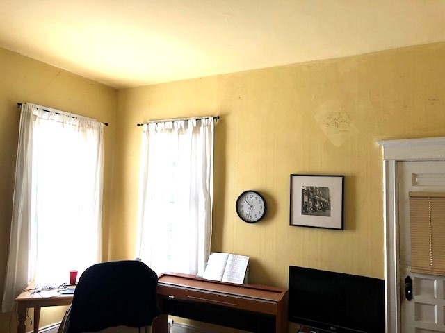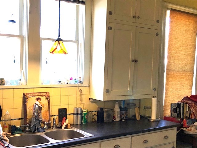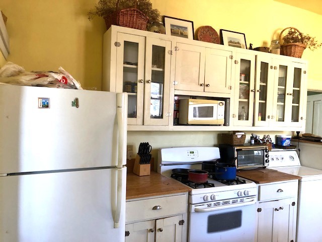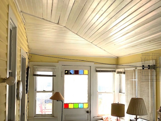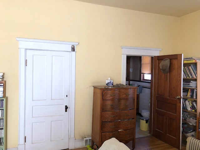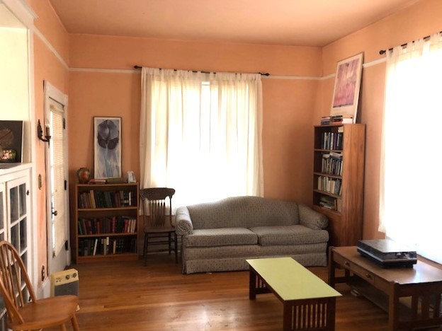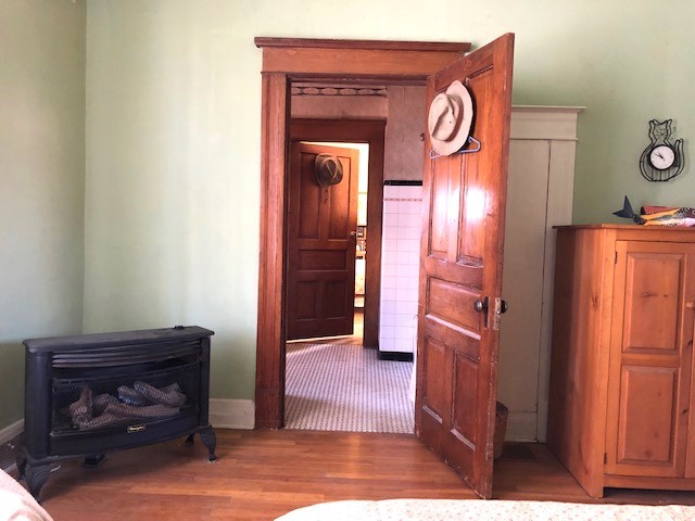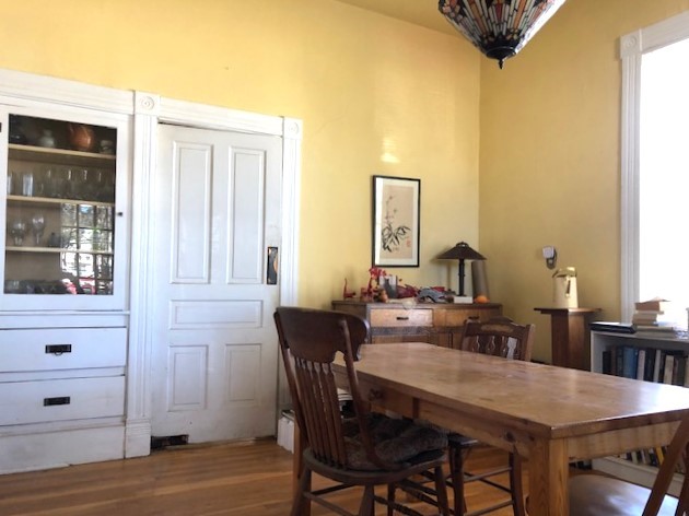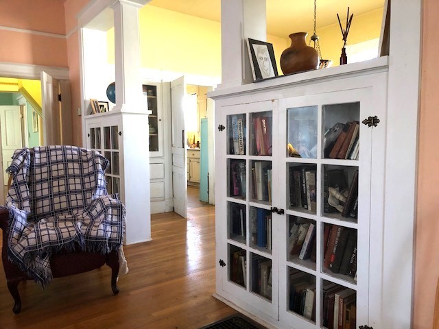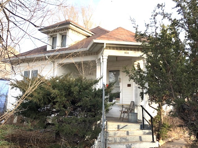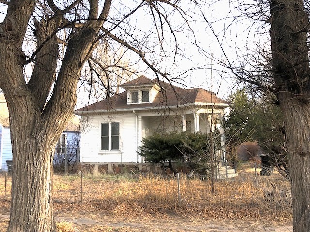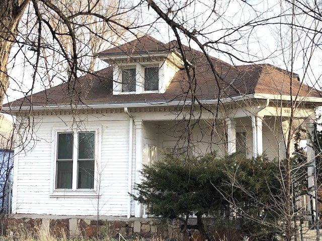 Victorian home on a corner lot with the entryway angled toward the corner. Built in 1900, its charm has attracted attention from movie companies seeking to use it in films. It was renovated while respecting its original features in 2006-2007 by the present owner. Wood siding and pitched roof, with a garage and a carriage house with a second story, where hay was stored for the horses. Front and back porches; enclosed porch on the back provides a large extra sunroom or mudroom. Originally two parlors comprise the front of the house, but the one on the right works great as a formal dining room, since it leads into the large kitchen. Two bedrooms with one full bath between them. Large attic that you can stand up in has a wood floor. Partial basement and partial crawl space. Basement has interior and exterior entrances. Original wood floors throughout house except for bathroom, which has vinyl.