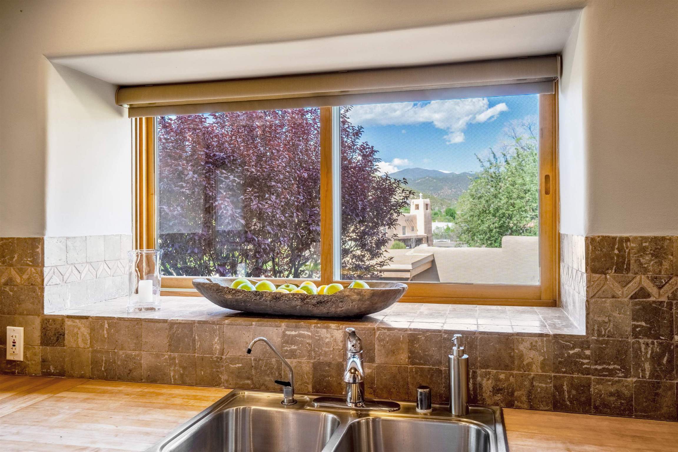 This elegant home is quiet and immensely private in one of the most treasured parts of Santa Fe's Eastside, yet only two blocks from exciting Canyon Road. Perfect as a vacation or main home. Only 4 homes in this hushed and verdant sanctuary which was part of the Alexander Girard compound. The Girards planted the gorgeous Provenal style garden which was a social center of Santa Fe where they hosted friends like Georgia O' Keeffe. Pick apples, pears and mulberries in season. A promenade along the this garden takes you home; Enter from the 560 sq ft wooden deck where you can work and play while enjoying the view to the garden and beyond to Christo Rey Church, the Sangres and sunsets over the Jemez mountains. The beautiful skylit great room is open concept, with high ceilings, massive vigas, and wonderful wall spaces for showcasing artwork. Pieces from Girard's collection are built-in and blend seamlessly with sophisticated Santa Fe style with blonde wood floors, and a corner kiva fireplace flanked by bancos. The two spacious bedrooms have ensuite baths, and big walk-in closets. The warm and inviting chef's kitchen with inspiring views has a coved cooking area, Viking range, Subzero fridge, and a wonderful spot for breakfast. More: Big laundry room, storage space, refrigerated air, and a detached garage with shelving. So much of what makes Santa Fe special is closeby-- Galleries, restaurants, the Santa Fe River and Eastside hiking trails, parks and museums. Have a look at the video tours.