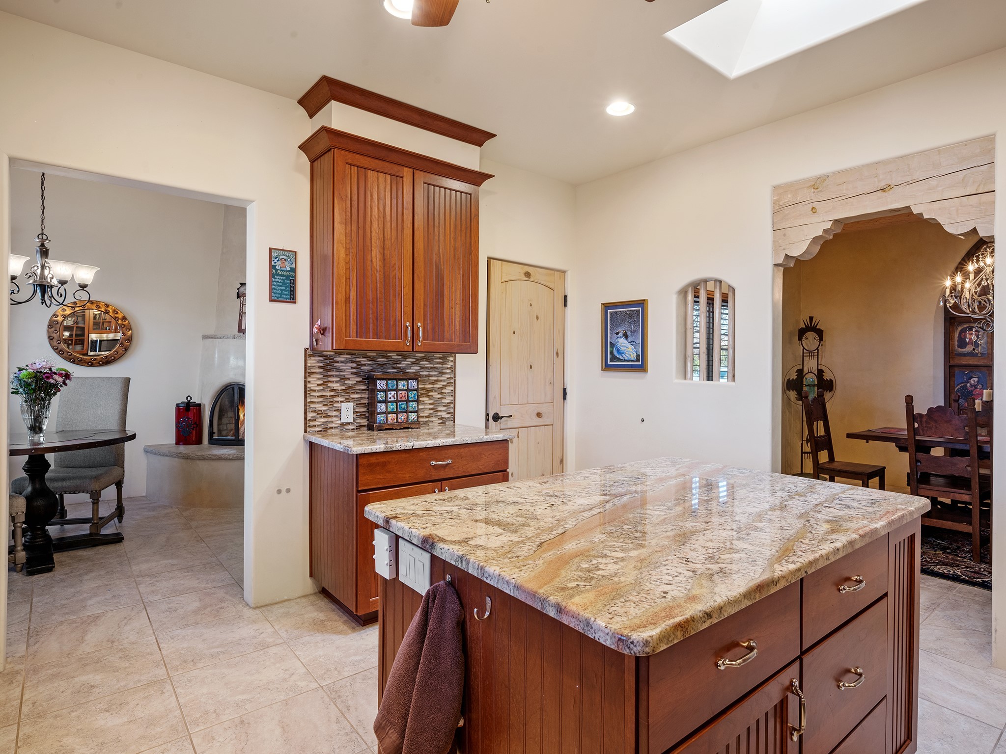 Kitek in the domestic system has been replaced. This elegant Santa Fe style and guest house in desirable Aldea has it all. 3741 sf. The primary bedroom is nicely separated from the guest bedrooms for total of 4 beds, 3 1/2 baths, oversized 2 car garage, 5 fireplaces, plus living, room, media room, breakfast room and dining room, including a 400/sf guest house. High end finishes include plaster walls, vigas, tile floors and a gas burning Kiva fireplace as a dramatic focal point. The beauty continues into the dining room also has vigas and tile floors and leads to an updated handsome kitchen with lovely wood cabinets, tasteful granite counters and new tile backsplash. There is also a gas range and a new dishwasher and a large walk in pantry. Tucked off of the kitchen is a charming breakfast room with another kiva fireplace. The large media room is perfect for cozy nights by the fireplace. French doors off the living room, and primary suite lead to the portal and private courtyard with bubbling fountain and mature landscaping. Here, there is a casita with 1 bedroom 1 bath and kitchenette with a separate living room and gas burning Kiva fireplace. There is also a nice hot tub and rooftop viewing deck to take in the amazing Santa Fe Sunsets. Continuing in the main house The primary suite also has a kiva fireplace and a large walk in close to you will find a large laundry room with plenty of cabinets, a powder room and 2 more guest bedrooms with a very pretty shared bathroom between them. The garage is an oversized 2 car garage with lots of room for storage. For the mechanical geeks, there are 7 zones for the radiant in floor heat, a water softener, a water filtration system and reverse osmosis under the sink in the kitchen. The house has radiant in floor heat and is ducted with 3 evaporative coolers providing 3 cooling zones. Aldea is an active community with 13 miles of walking trails, a community center, coffee shop, tennis, basketball and a bocce ball court.