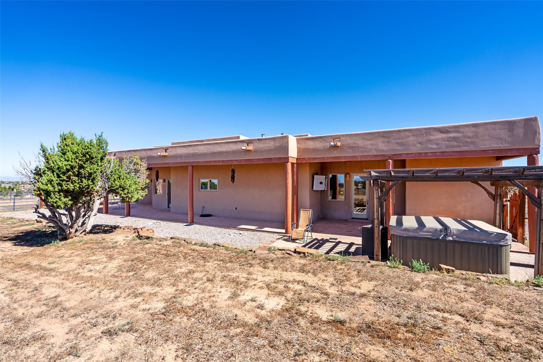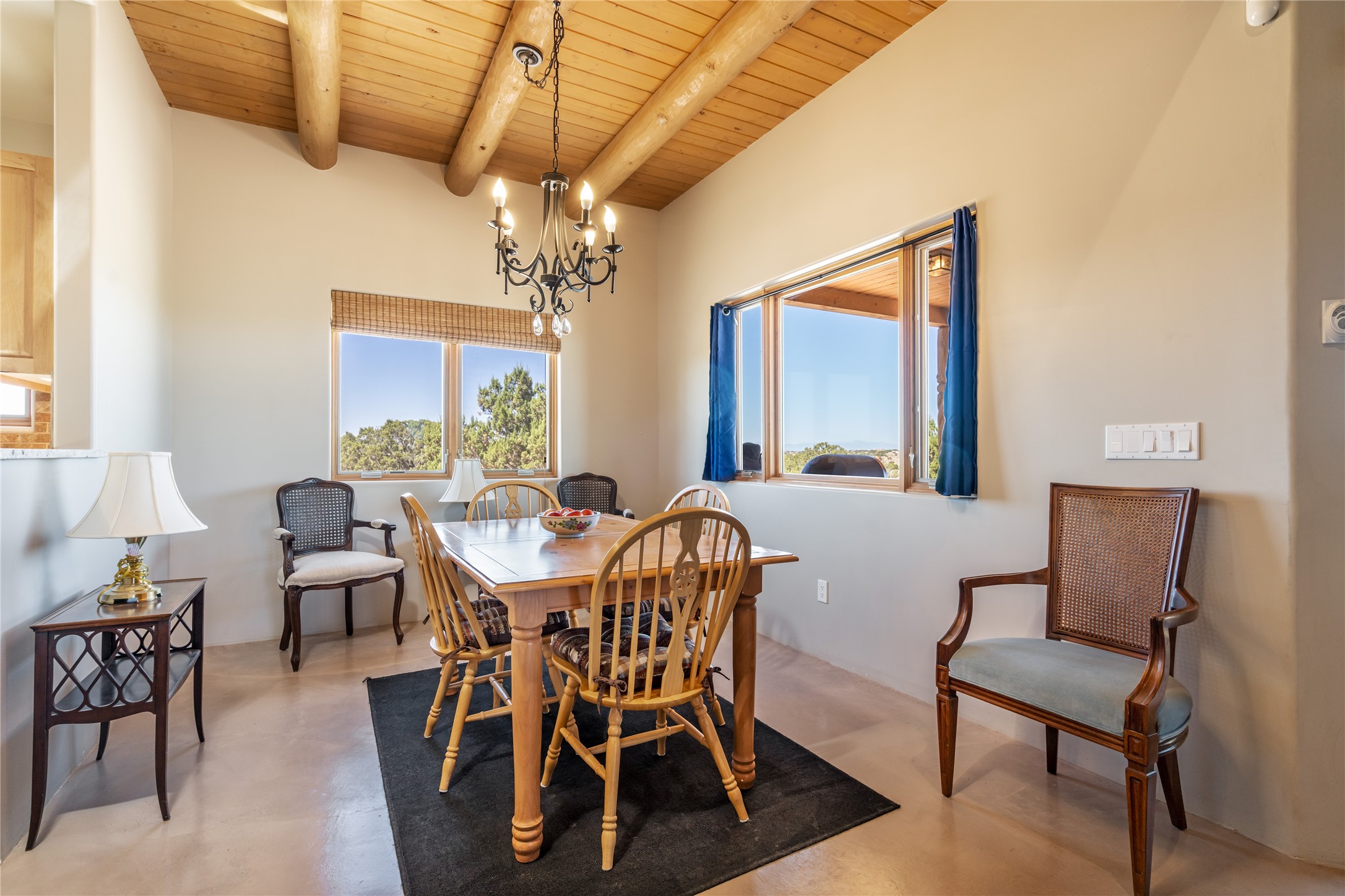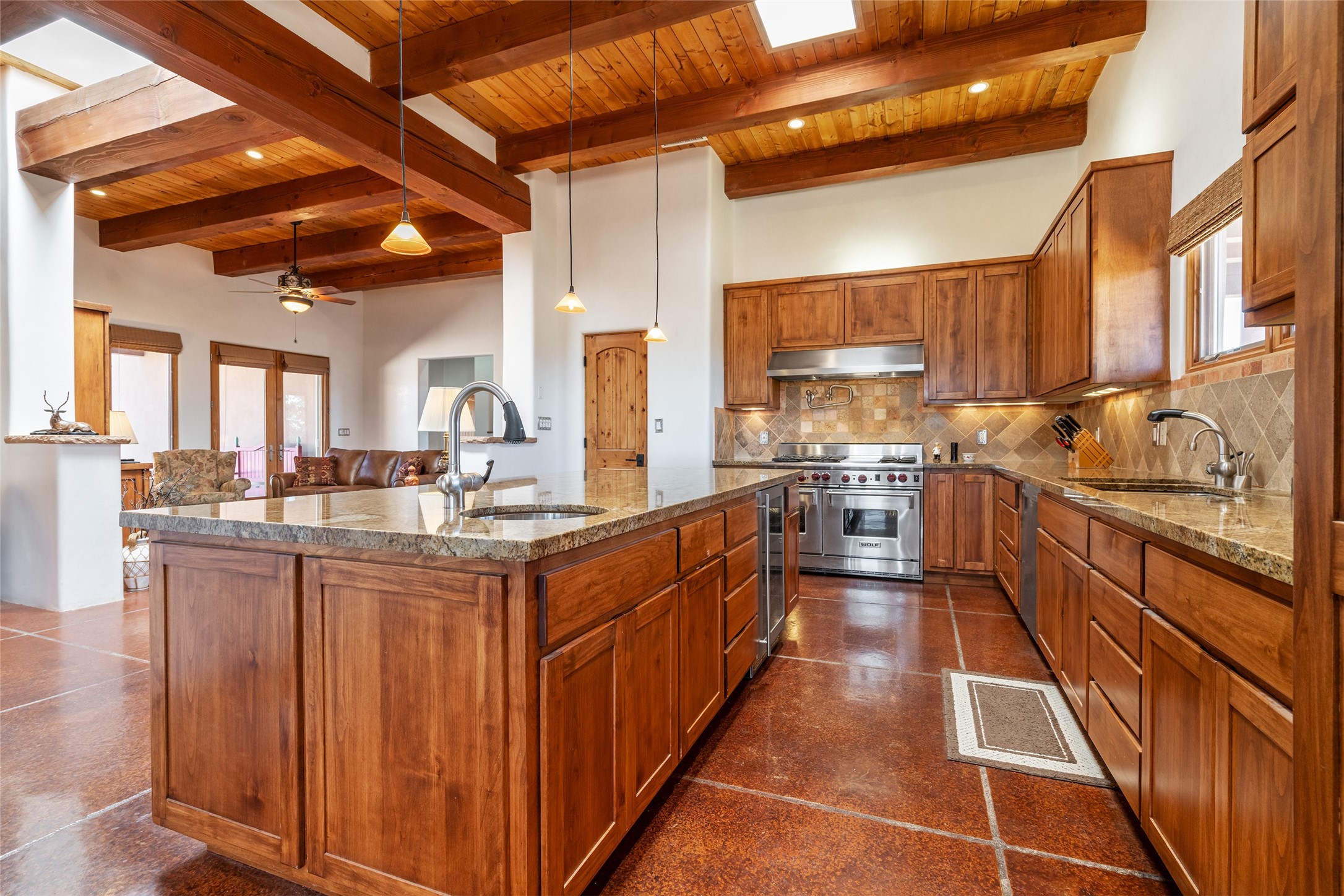 15 Silver Saddle is a 3 BRM/ 3.5 BATH main home with diamond plaster walls, polished concrete floors and wood beam high- ceilings throughout. The master suite is located on the western side of the house apart from the two additional en-suite guest bedrooms-- all with outdoor access. The master suite is well-appointed with a walk-in closet, a master bath with his and her sinks and water closets- along with a walk-in steam shower and soaking tub. Outdoor access from the master suite leads to a private outdoor area with a jacuzzi. However, it is the open concept cook's kitchen and adjacent entertaining room with a built-in wood bar that are the home's showstoppers. The almost 17-acre property also boasts a newly built (2017) two-bedroom 1,400 square foot guest house with high-end finishes and appliances throughout. Approx. 15 minutes to Santa Fe and conveniently located 5 minutes from the shopping area at Eldorado Santa Fe. For horse lovers the property has a Cleary barn, 3 horse stalls, an insulated tack room, an arena, a turnout and pasture. As an added bonus, there is direct access to Galisteo Basin Trails.