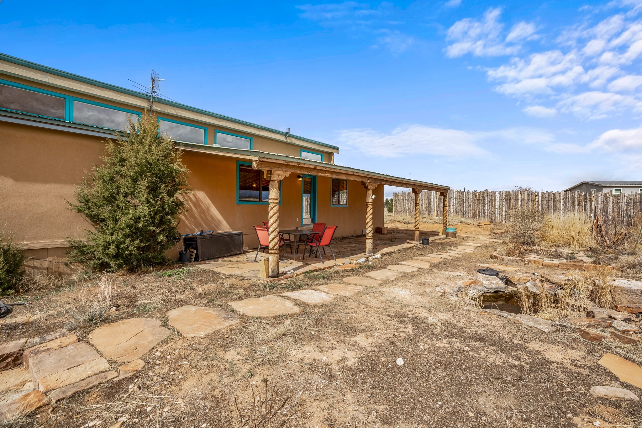 Beautiful customized modular home on almost 5 acres. An artist or craft person's dream with a nearly 2,200 square foot ATTACHED STUDIO/WORKSHOP on its own electrical panel, with a wood heater, evaporative cooler, gas stub out, electrical outlets throughout, and two garage doors! The 2,275 square foot main home features raised vaulted tongue and groove wood ceilings, an open concept great room with clerestory windows, solar tube, and a wood burning stove. Lots of natural light. This does not feel like a modular home! Three bedrooms each with their own walk-in closet and an office. Wonderful views from all directions. Private well. Primary bathroom has a jetted tub, separate shower and double sinks. 5 Hydroviv filters installed, one on each shower, one in the kitchen sink, and two on bathroom sinks. Wrap around porch in the front and a patio with a wood portal off the back of the home with a small pond, perfect for relaxing and taking in the views. The whole home has been freshly painted and professionally cleaned including windows. According to Seller, the metal roof may have been installed within the last 6 years. New hot water heater with instant hot circulation, and stainless steel farm sink in the kitchen recently installed. Gas range is only two years old. Make this Santa Fe escape and live/work dream a reality!