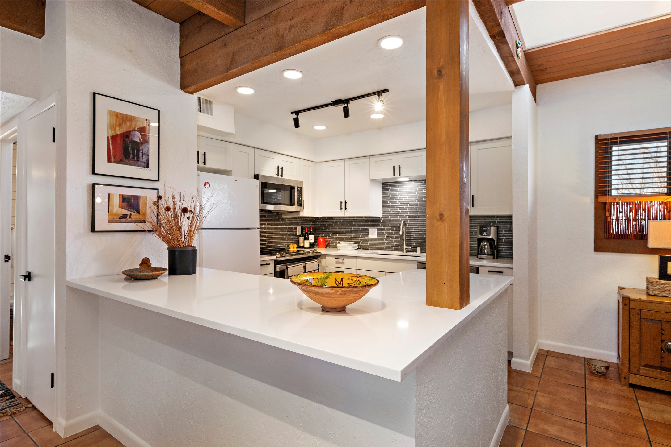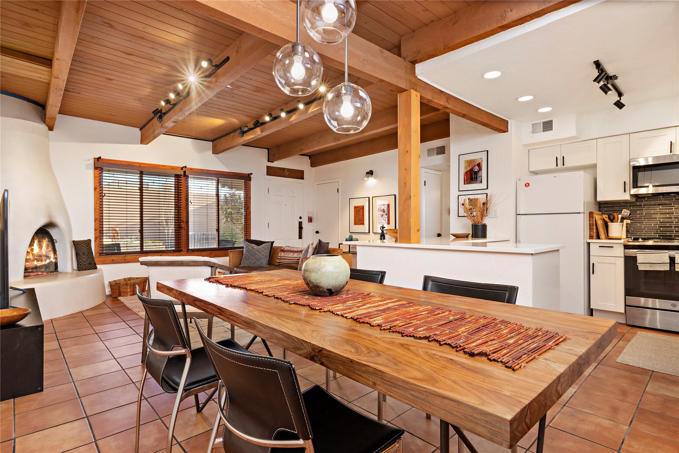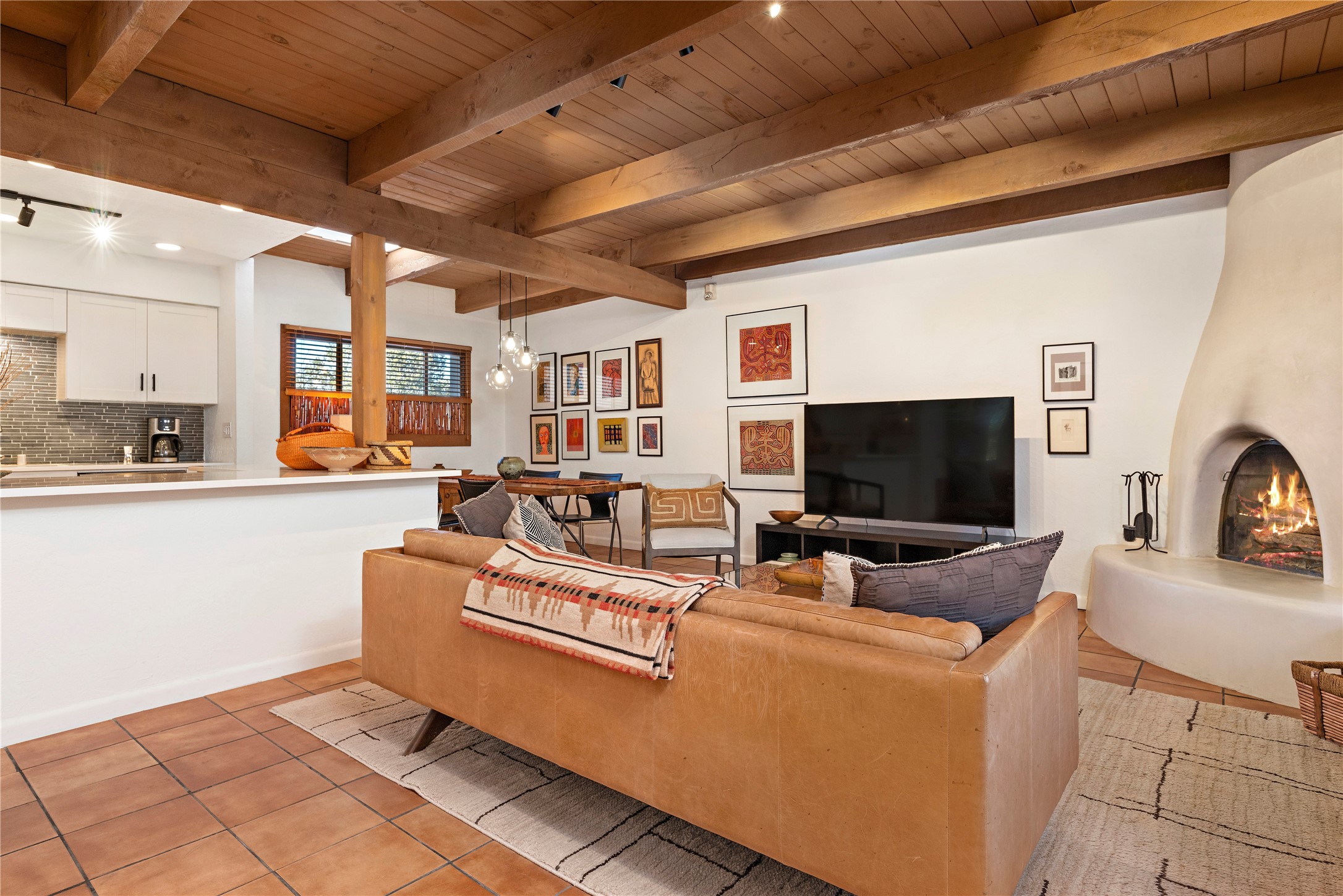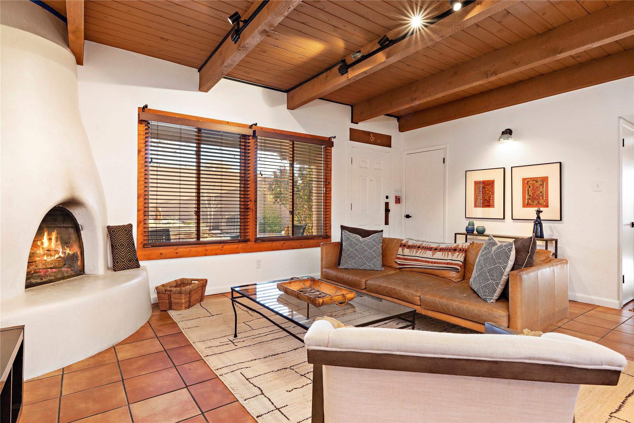 Walk to the Santa Fe historic plaza from this lovely condo. It has been refreshed, top to bottom, including beautiful tile flooring throughout, all new cabinetry with soft-close doors and drawers, new appliances, countertops and all new bathrooms. Single-level living made easy and comfortable, enjoy the central refrigerated air-conditioning in the warmer months, and the wood burning kiva fireplace on the cooler evening. Cental forced-air heating will keep you warm, no matter how cold it is outside. Offered with a limited furniture package, this condo is truly turn-key! On-site management offers a short-term rental program, specializing in short-term vacation rentals. Use as a full-time residence, part-time vacation home, long term rental, or short-term rental. The city's Short-term Rental Permit may not be required. Ask listing broker for details. To view CC & R's, go to https://allseasonshoa.com/associations/fort-marcy-hotel-suites/. Title is open with Greta at Prima/Stewart.