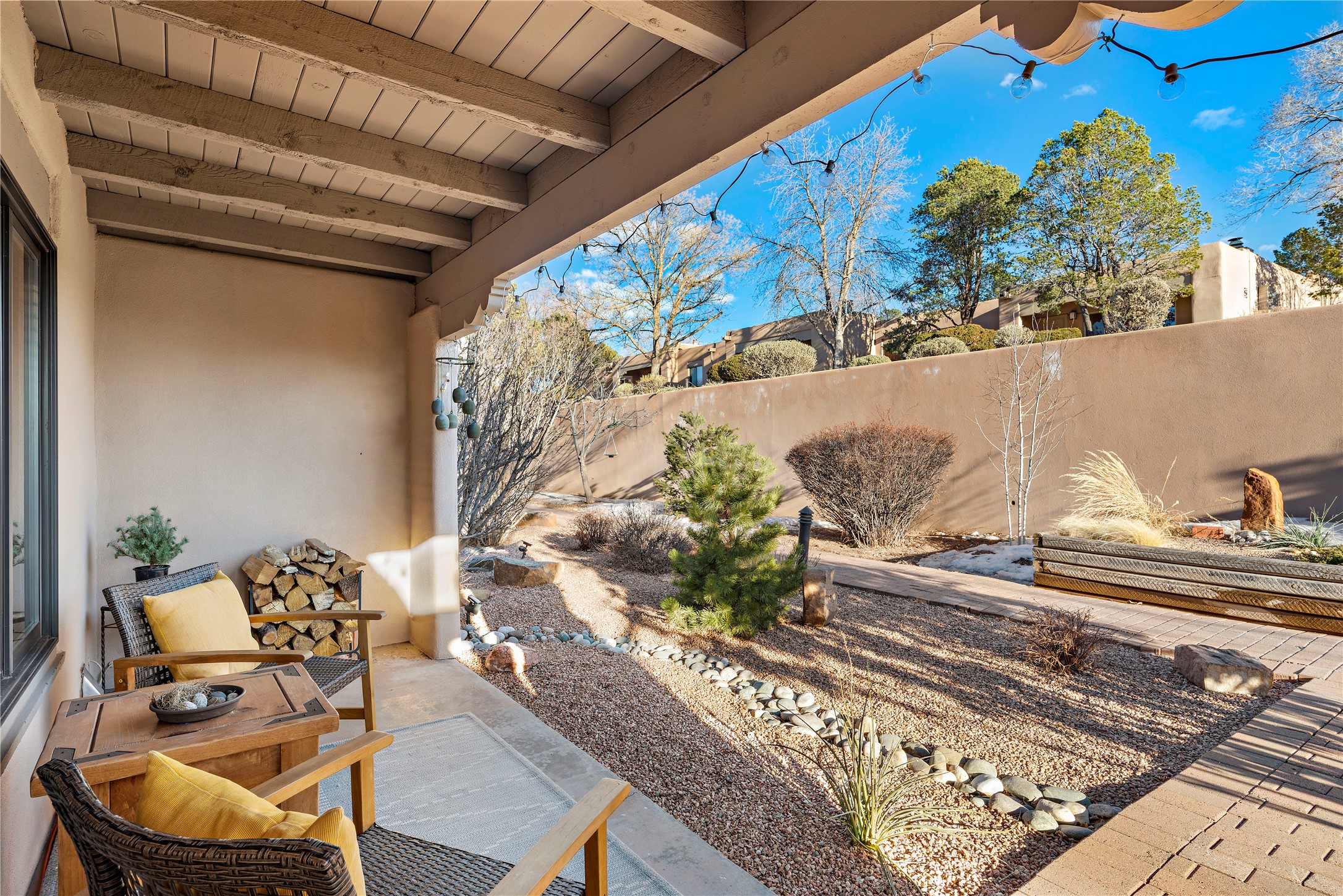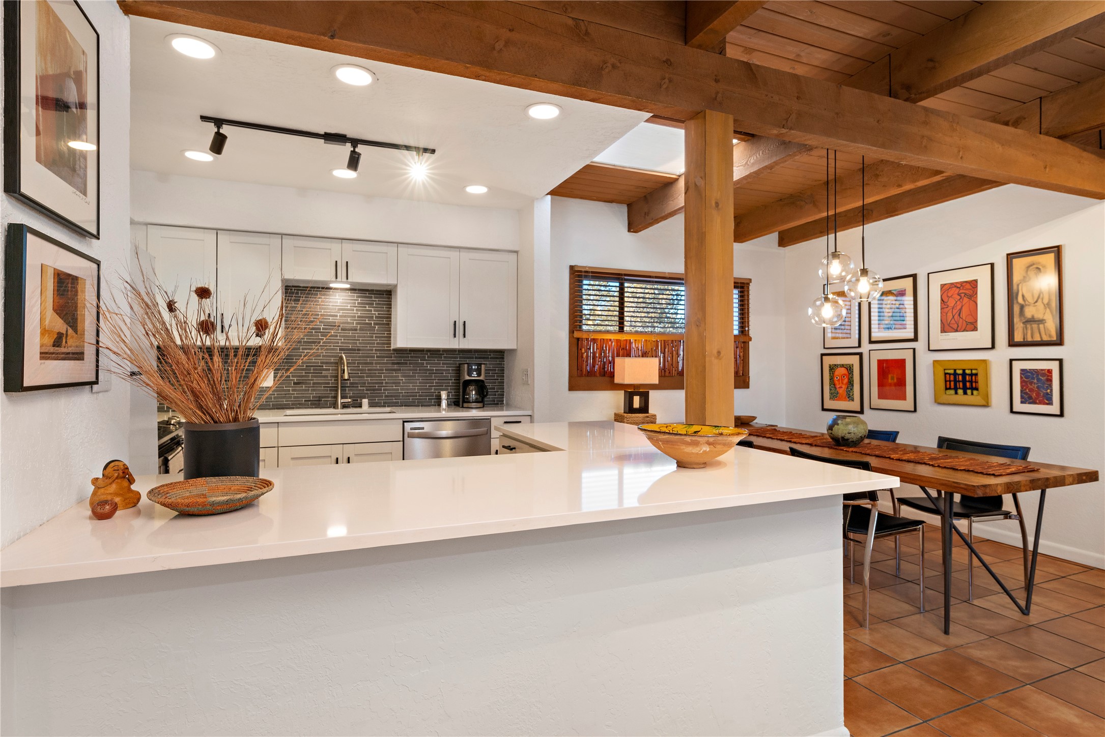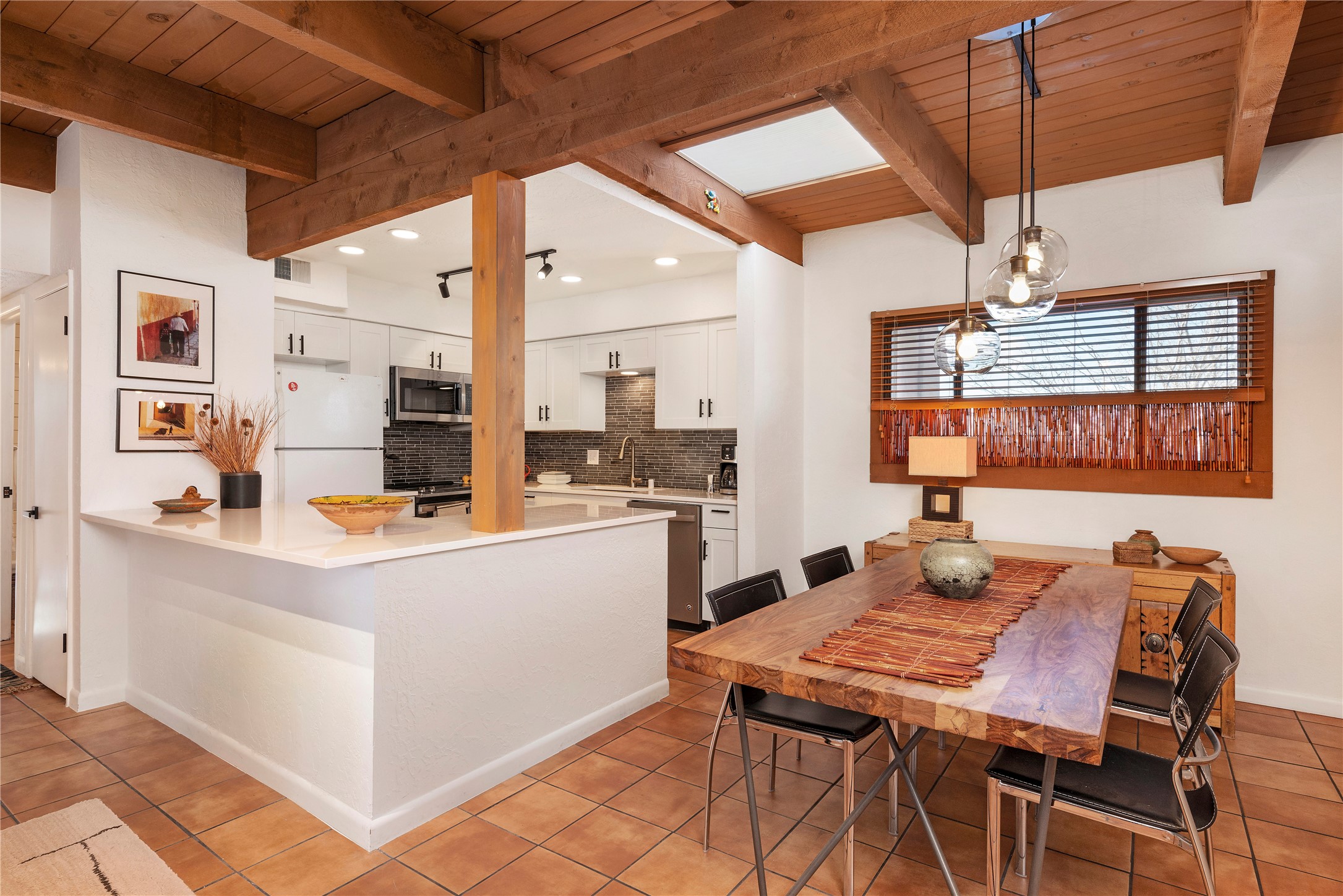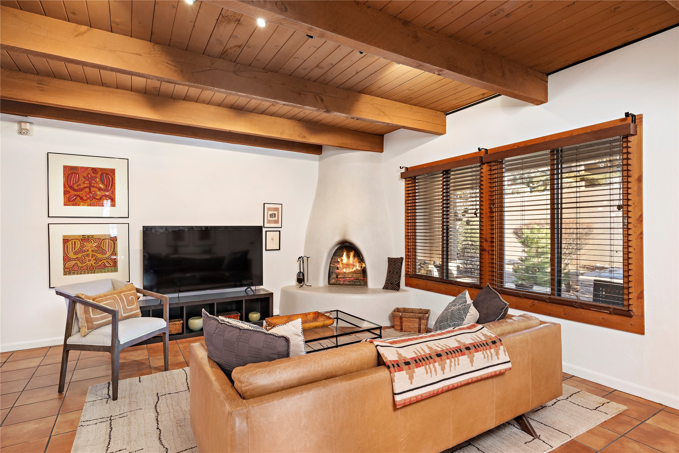 Walk to the Santa Fe historic plaza from this lovely condo. It has been refreshed, top to bottom, including beautiful tile flooring throughout, all new cabinetry with soft-close doors and drawers, new appliances, countertops and all new bathrooms. Single-level living made easy and comfortable, enjoy the central refrigerated air-conditioning in the warmer months, and the wood burning kiva fireplace on the cooler evening. Cental forced-air heating will keep you warm, no matter how cold it is outside. Offered with a limited furniture package, this condo is truly turn-key! On-site management offers a short-term rental program, specializing in short-term vacation rentals. Use as a full-time residence, part-time vacation home, long term rental, or short-term rental. The city's Short-term Rental Permit may not be required. Ask listing broker for details. To view CC & R's, go to https://allseasonshoa.com/associations/fort-marcy-hotel-suites/. Title is open with Greta at Prima/Stewart.