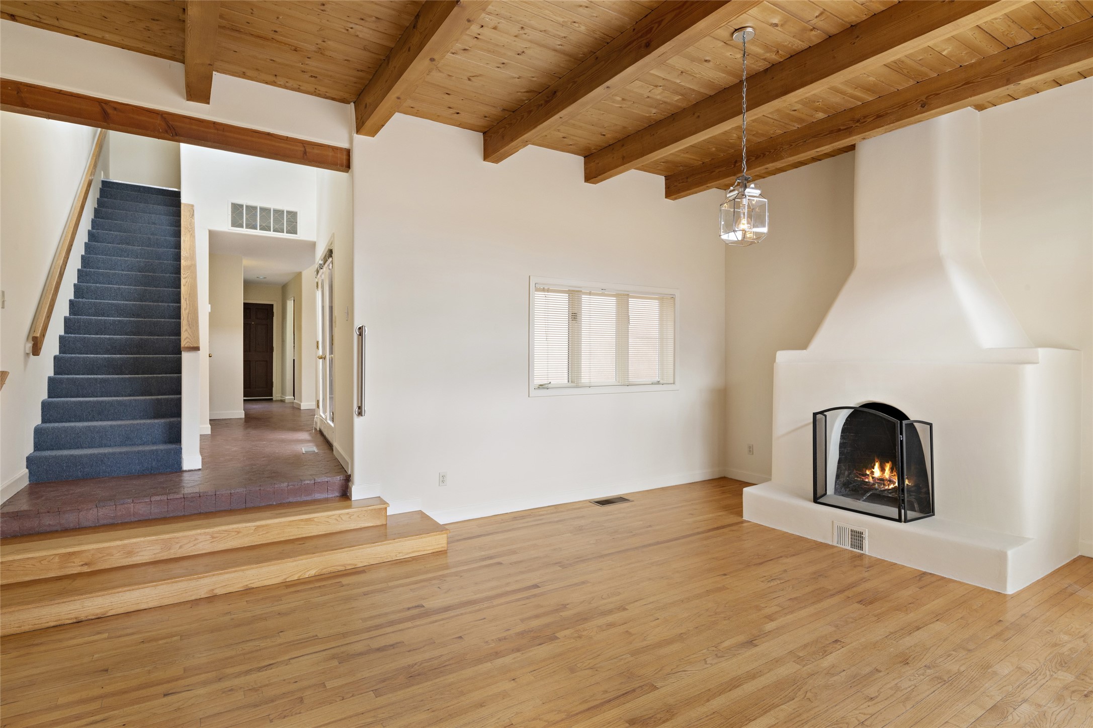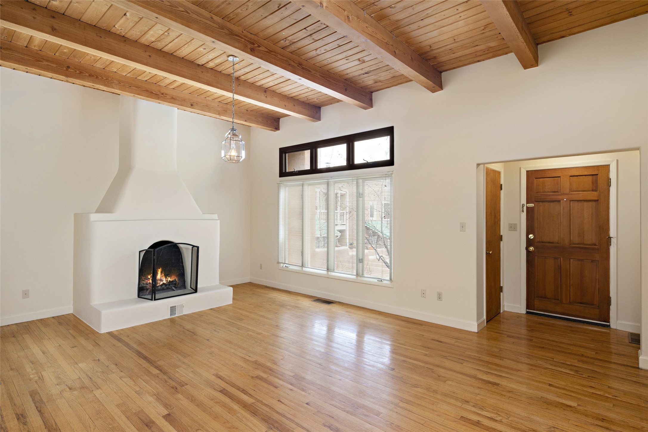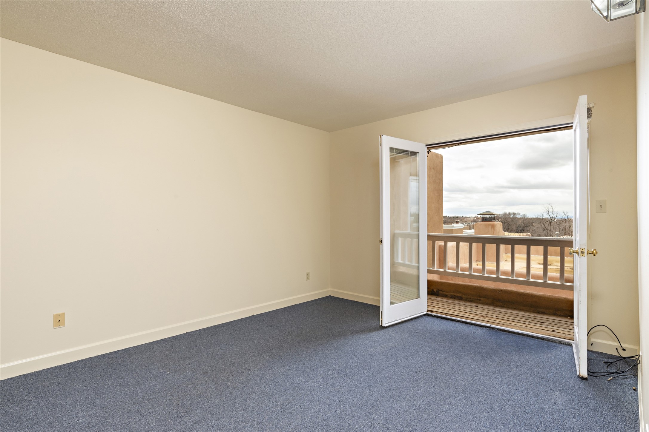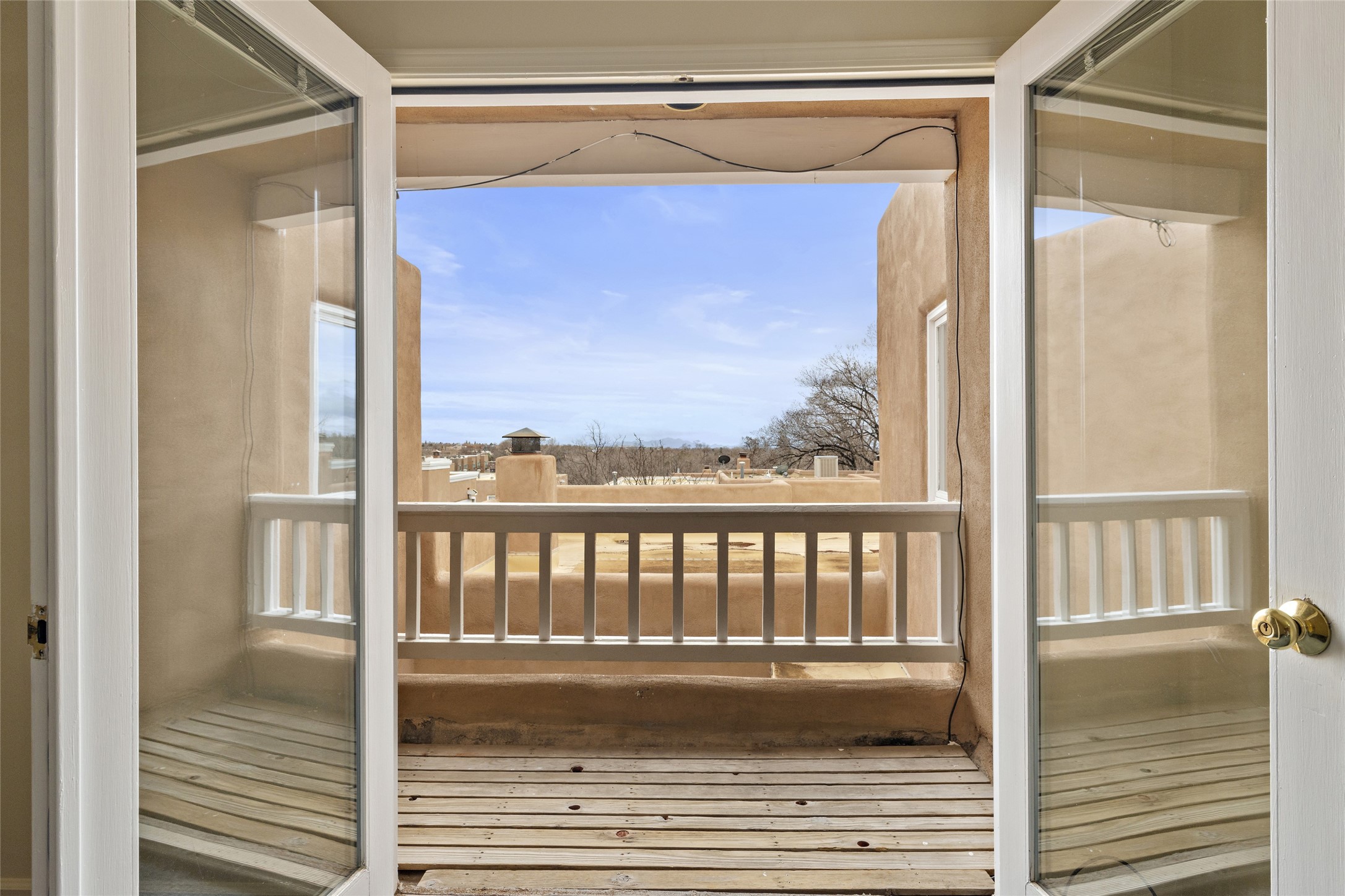 Ideally located in the Pueblo Del Rosario condo community near the swimming pool and community clubhouse, this 2- story, 2 bed-2 bath condo has a high walkability rating for convenience to downtown Santa Fe shopping, restaurants, galleries, museums and nearby parks. The main living area on the first floor includes the living and dining rooms, walled patio area, kitchen and bathroom. Two bedrooms, one with balcony providing over-city views of the Ortiz mountains, primary bathroom and laundry closet are upstairs. Included with the property is a large two-car attached garage with automatic door and direct entry near the kitchen area. Off street parking is also available. Additional features include a sizable walled, open patio area between the dining and living rooms; front patio area with crabapple tree off the living room, newer forced air furnace with high quality air filters, newer kitchen appliances and washer/dryer, and ample storage throughout.