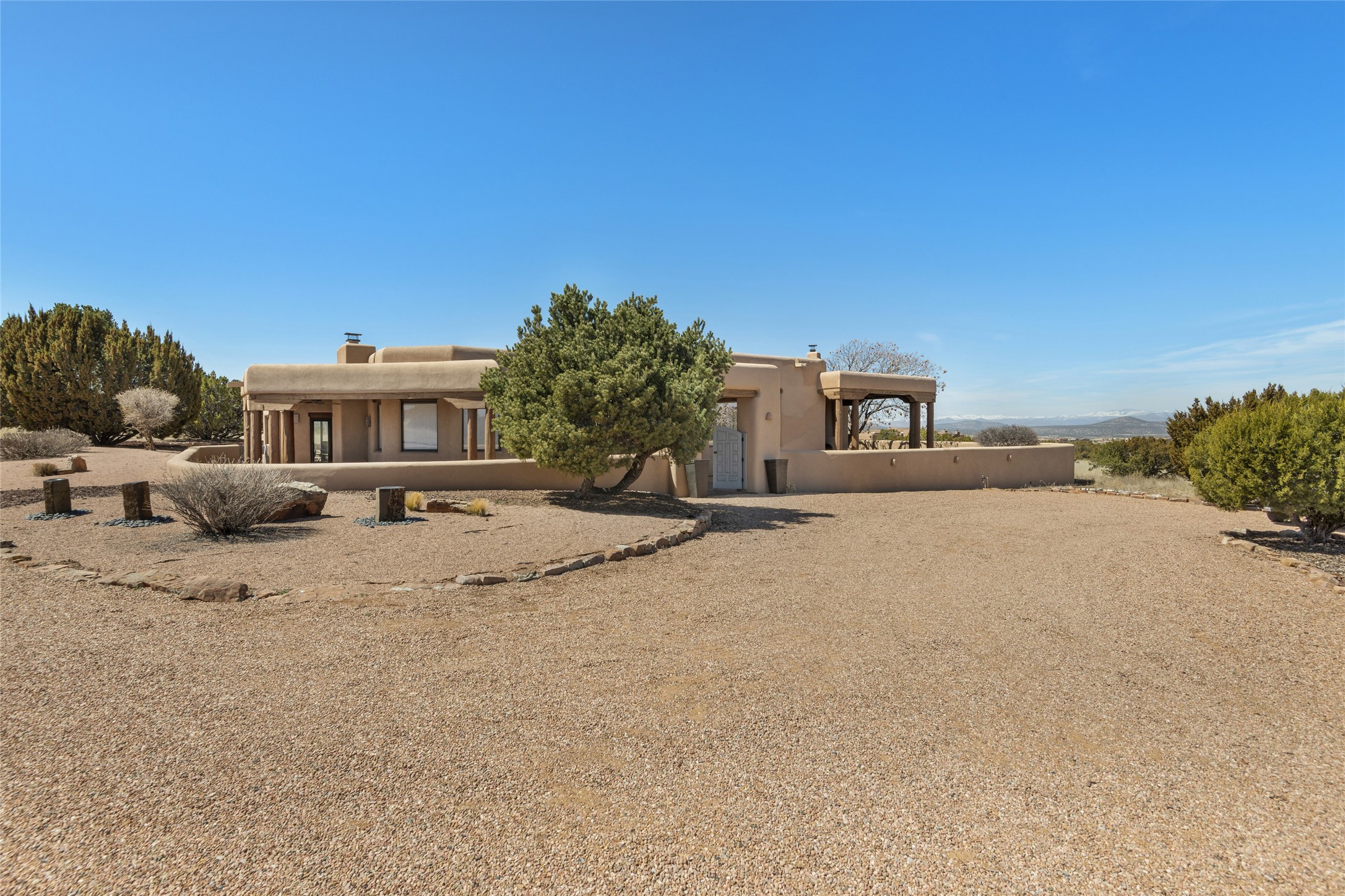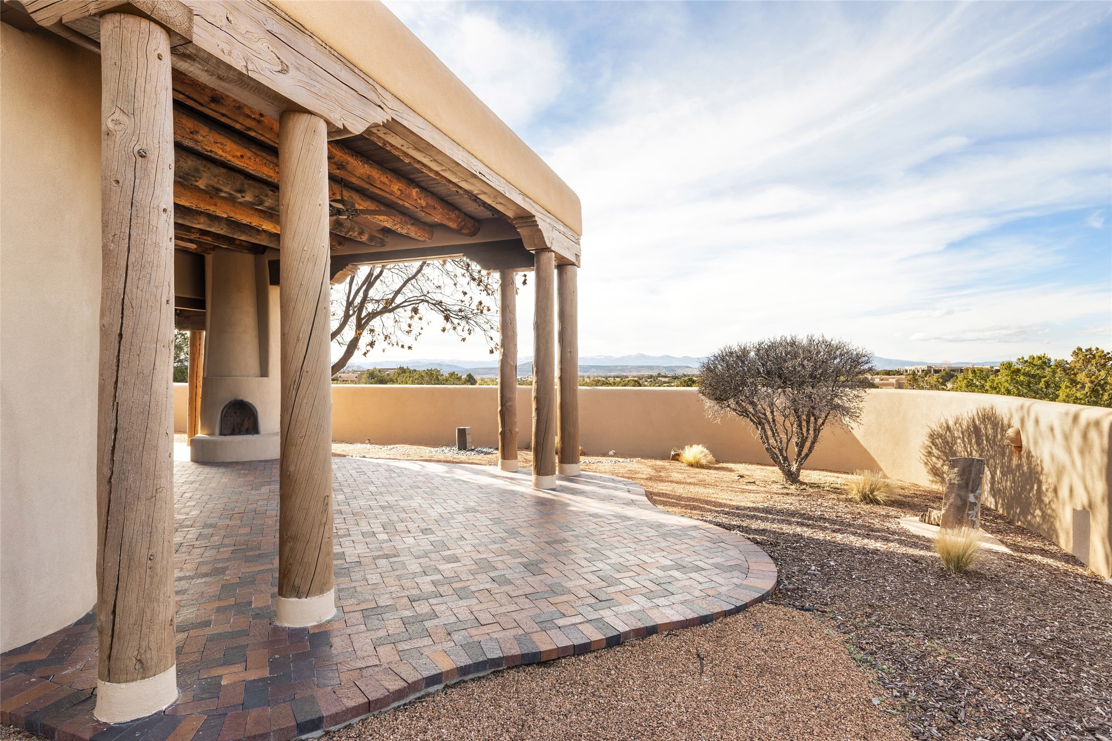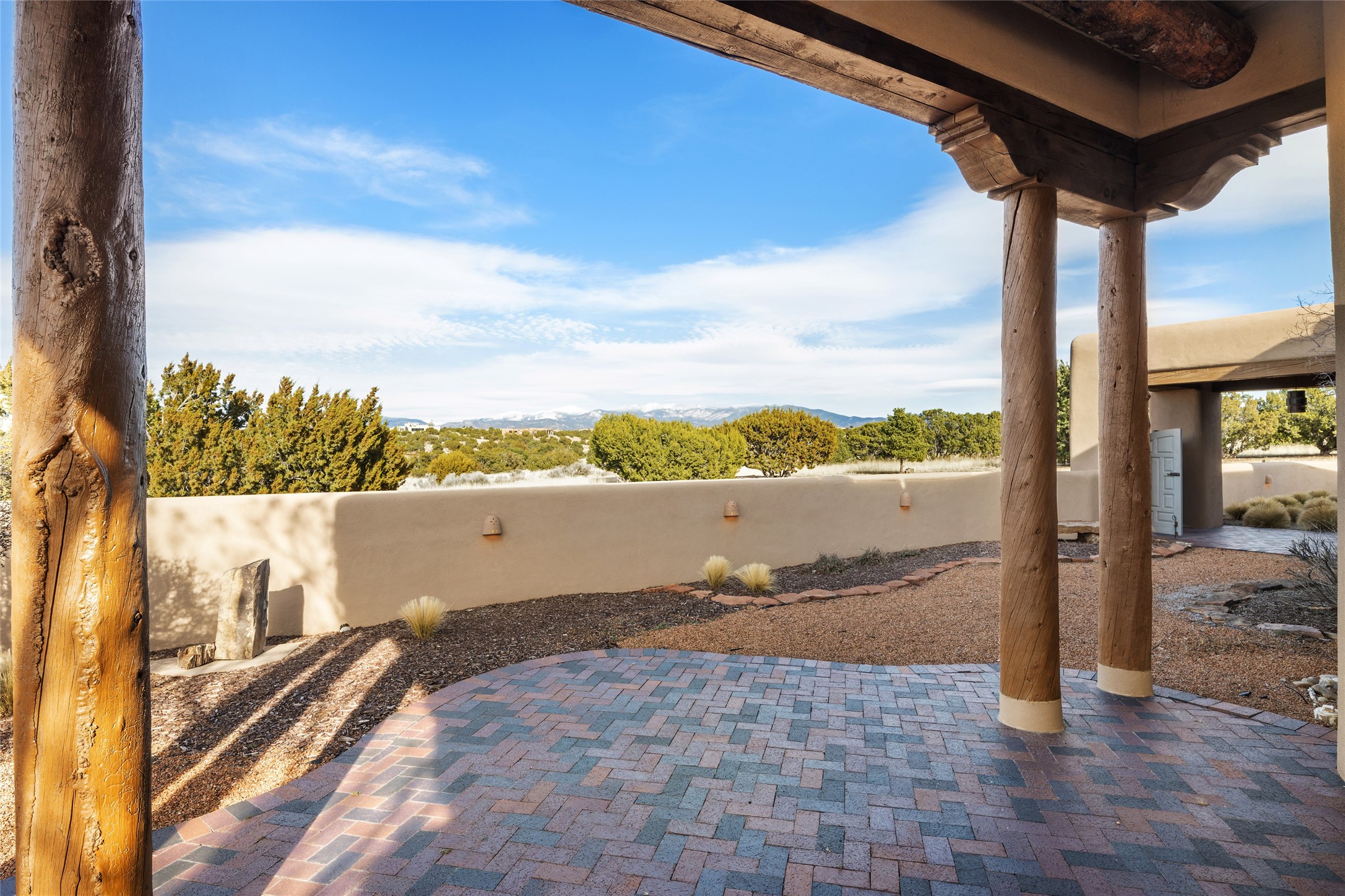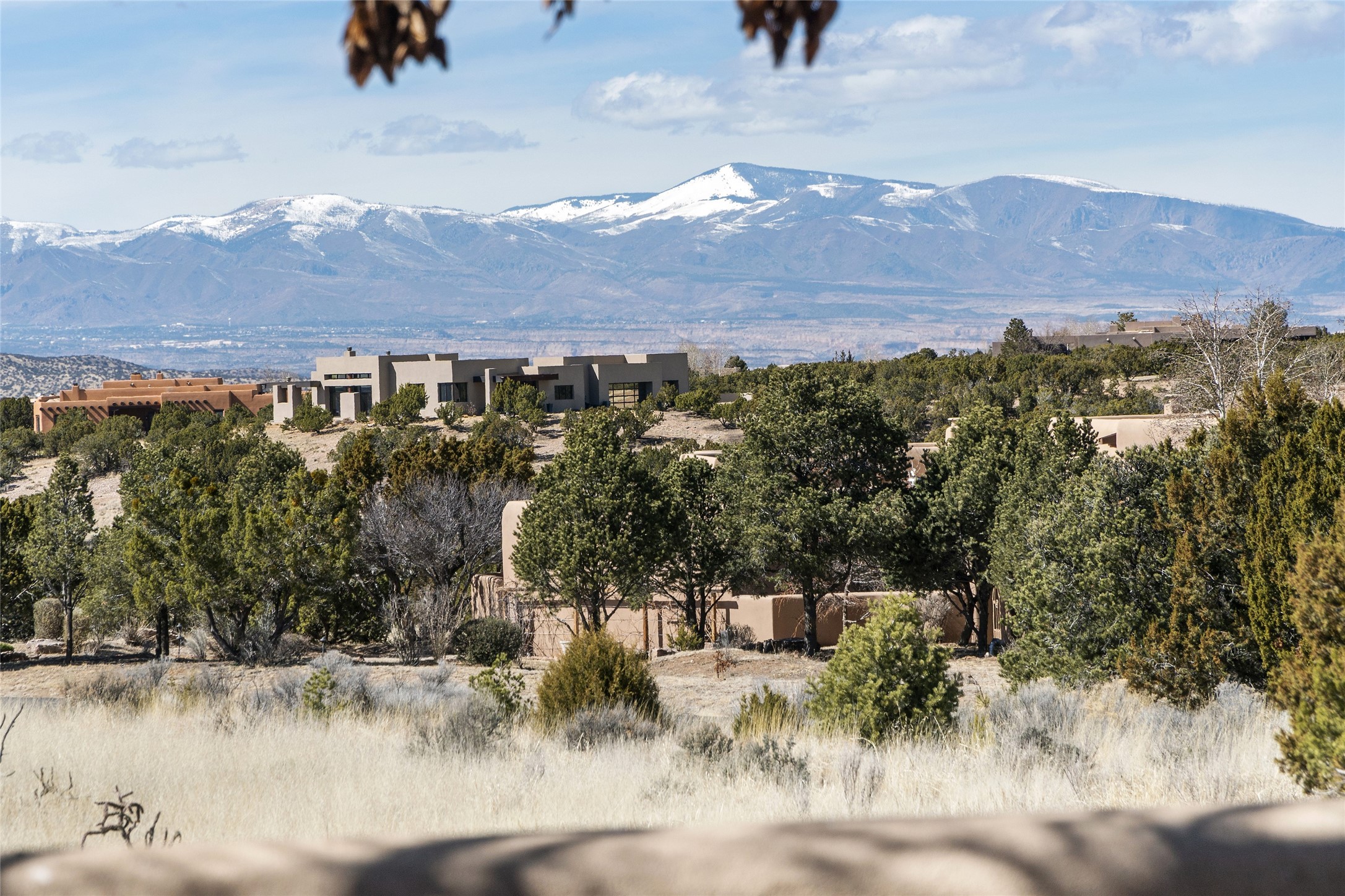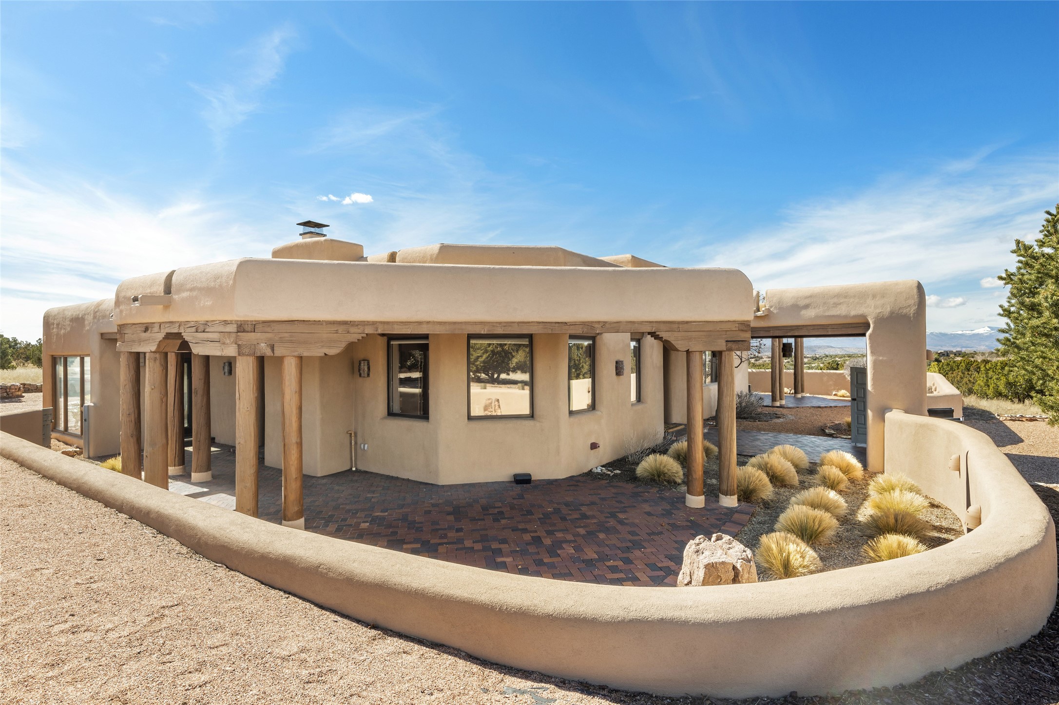 This Las Campanas Estates III property is not only located directly across from the lake and 3rd and 4th fairway of the Sunrise Golf Course but is situated to enjoy spectacular views of the Sangre de Cristo and Jemez Mountains. A 2-acre parcel allows for both privacy and plenty of green space around the 4,436 sq. ft. floor plan. Pumice Crete construction allows for massively thick walls and brings a stateliness to the overall design concept. 18 ft. diamond plaster walls support sweeping archways at the threshold of entries to the various living areas. Massive vigas form intervals between the variations in ceiling design used throughout the home - including latillas, coves and wood planks. Master tri-color brickwork inlaid in a herringbone pattern is one of several customizations influenced by regional architecture. Others include built-in Sombraje cabinetry, kiva fireplaces, and nicho-styled ledges and shelving. Numerous skylights, extra-large windows and glass-paneled doors facilitate the maximum absorption of the brilliant New Mexico light and the area's superb views. Recent upgrades include the installation of high-speed broadband cable, Smart home and Nexia remote-controlled features, a new roof with a 12 yr. warranty, new UV glass skylights, new Stucco work, a new aluminum and glass paneled garage door, recent high end appliances and extensive landscaping. Truly a showcase home offering comfort and luxury in a highly desirable and secure community.