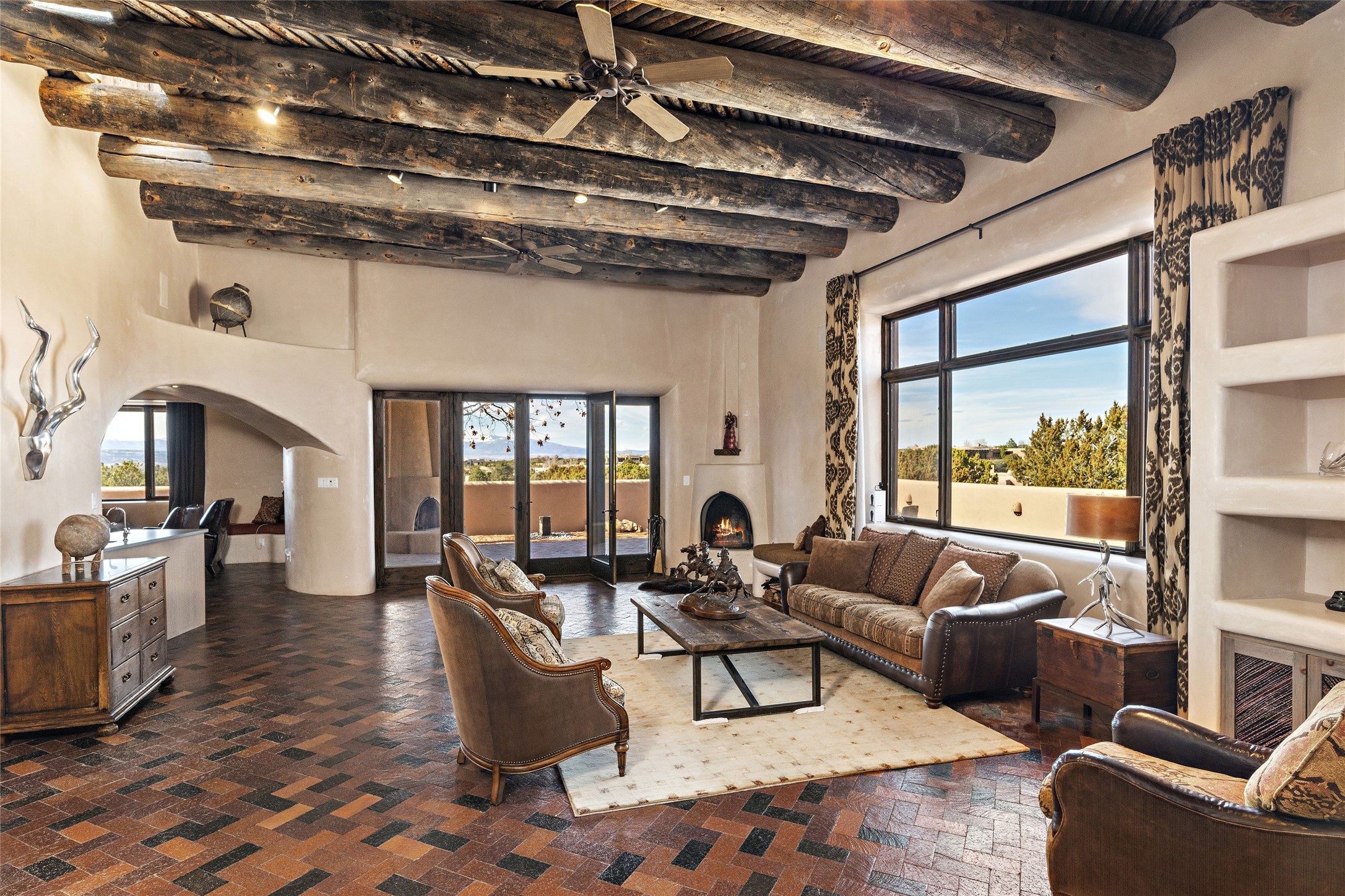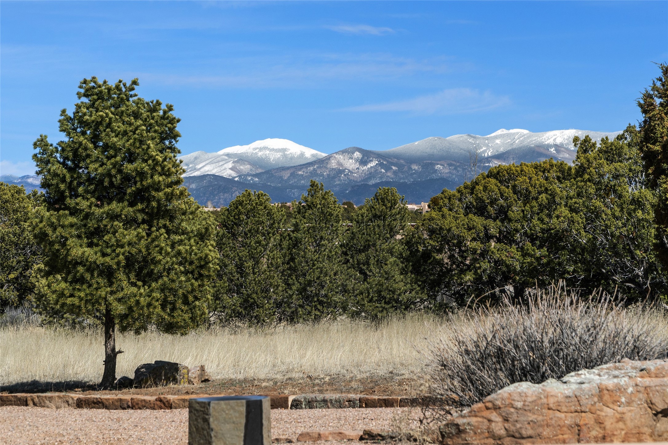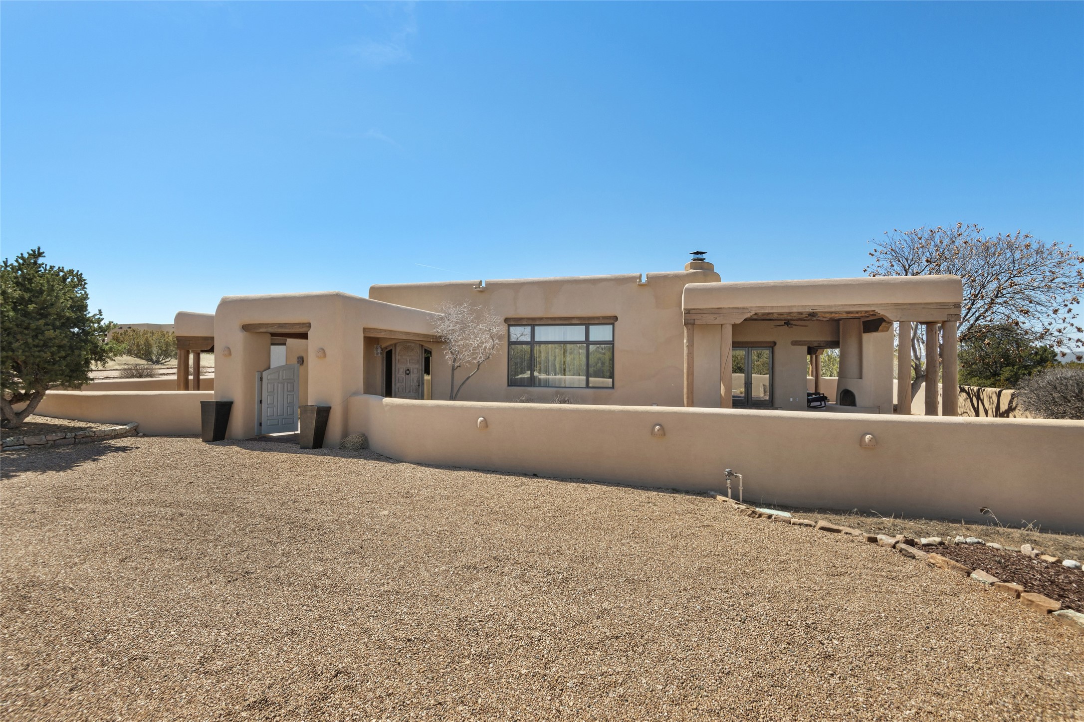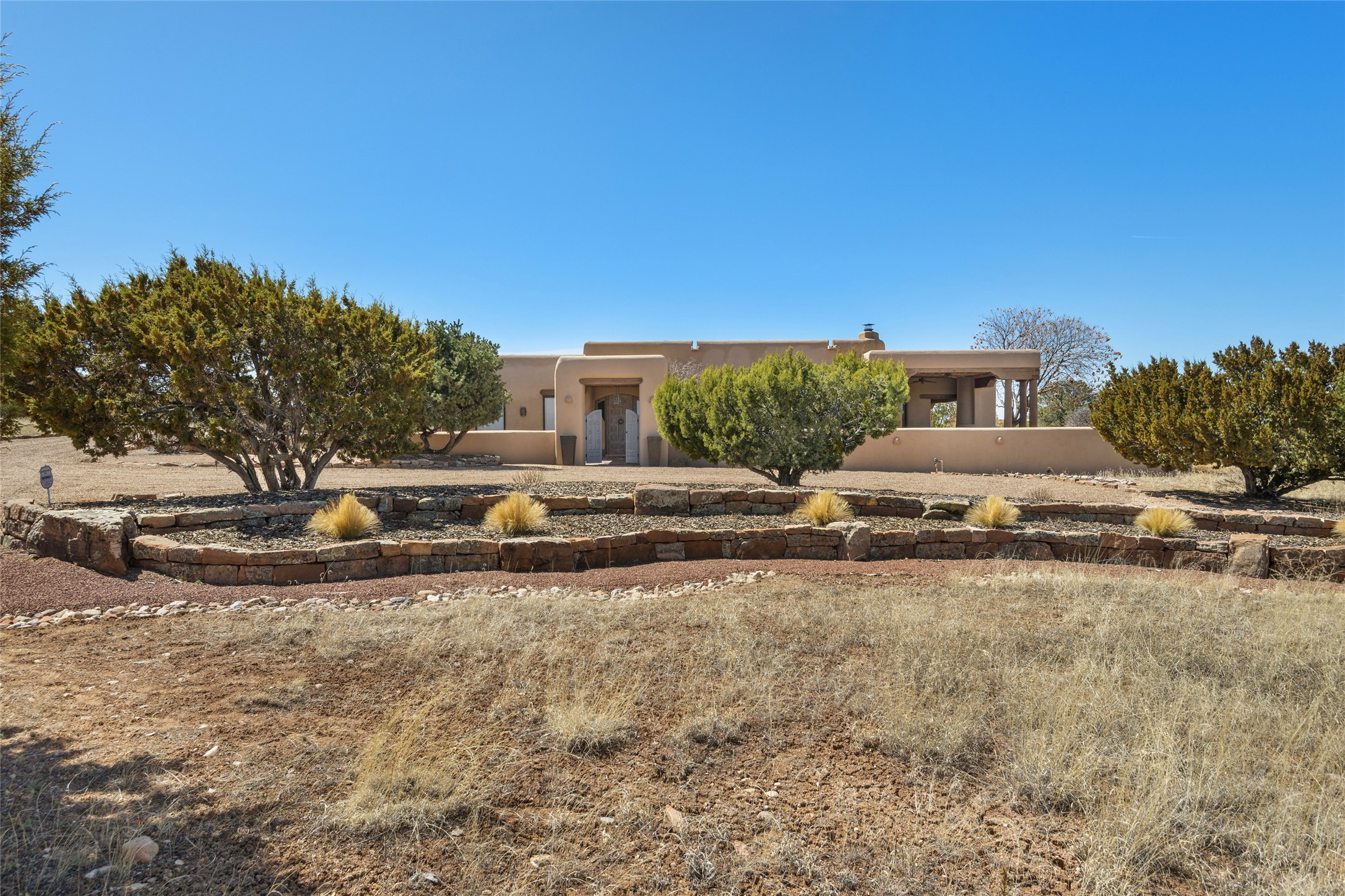 This Las Campanas Estates III property is not only located directly across from the lake and 3rd and 4th fairway of the Sunrise Golf Course but is situated to enjoy spectacular views of the Sangre de Cristo and Jemez Mountains. A 2-acre parcel allows for both privacy and plenty of green space around the 4,436 sq. ft. floor plan. Pumice Crete construction allows for massively thick walls and brings a stateliness to the overall design concept. 18 ft. diamond plaster walls support sweeping archways at the threshold of entries to the various living areas. Massive vigas form intervals between the variations in ceiling design used throughout the home - including latillas, coves and wood planks. Master tri-color brickwork inlaid in a herringbone pattern is one of several customizations influenced by regional architecture. Others include built-in Sombraje cabinetry, kiva fireplaces, and nicho-styled ledges and shelving. Numerous skylights, extra-large windows and glass-paneled doors facilitate the maximum absorption of the brilliant New Mexico light and the area's superb views. Recent upgrades include the installation of high-speed broadband cable, Smart home and Nexia remote-controlled features, a new roof with a 12 yr. warranty, new UV glass skylights, new Stucco work, a new aluminum and glass paneled garage door, recent high end appliances and extensive landscaping. Truly a showcase home offering comfort and luxury in a highly desirable and secure community.