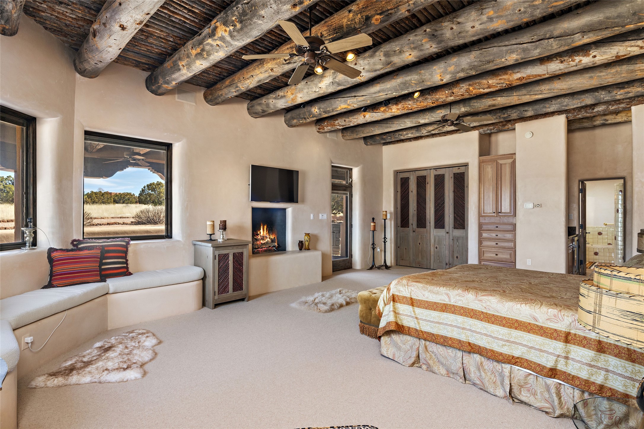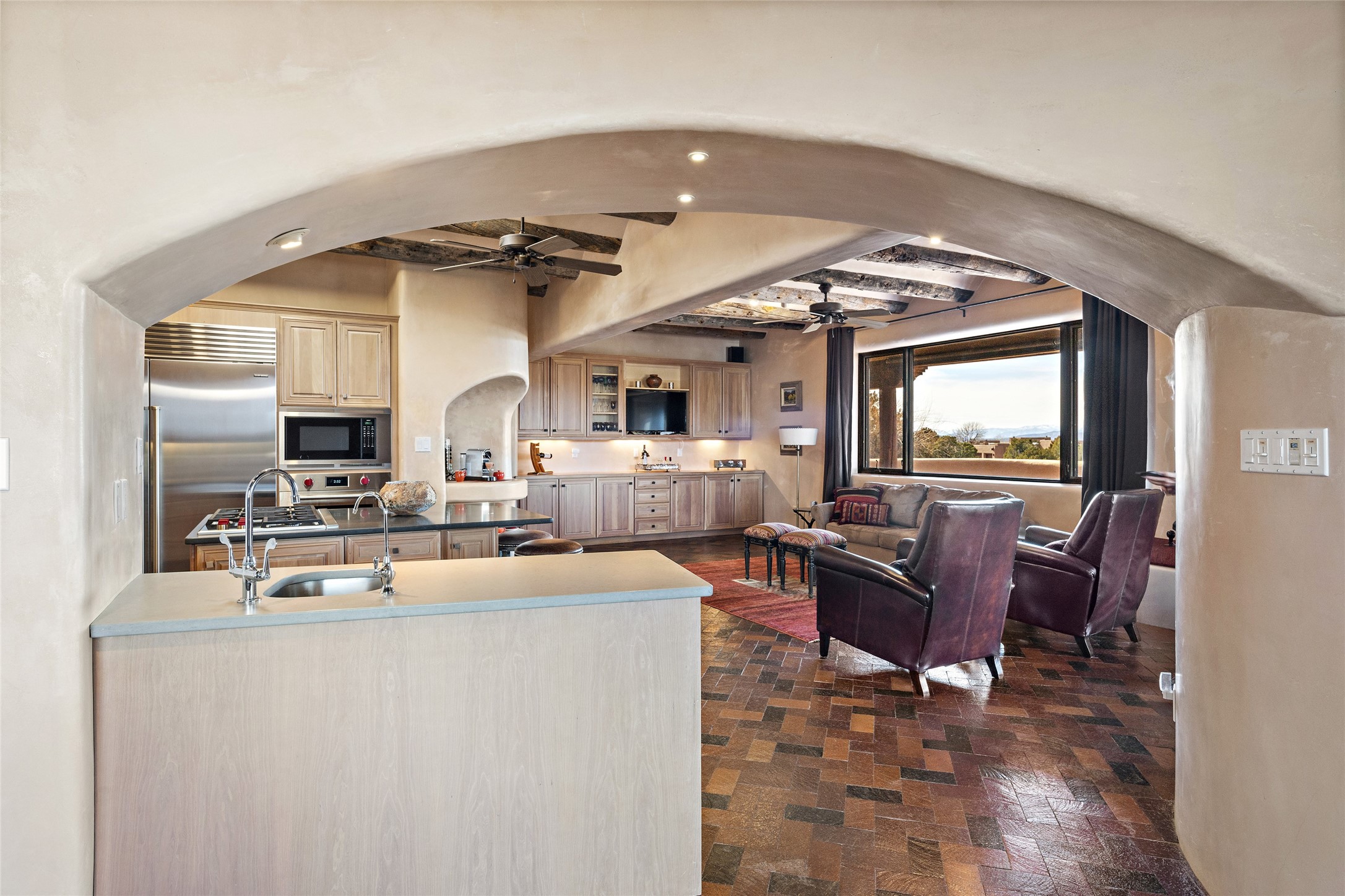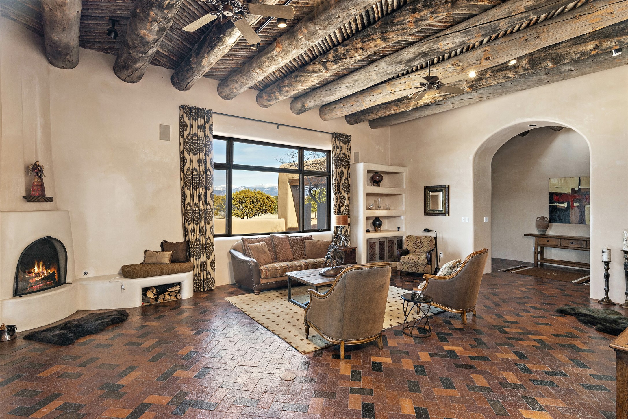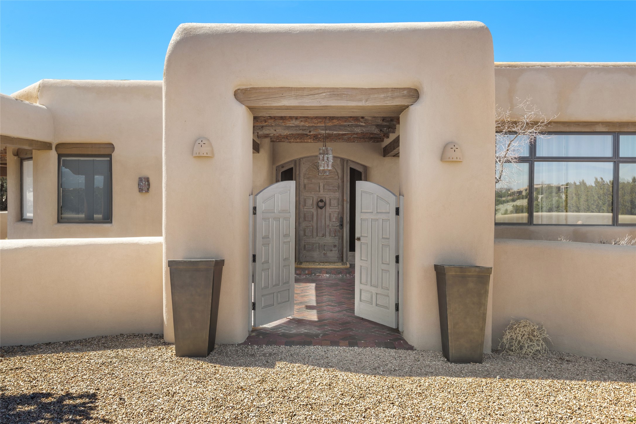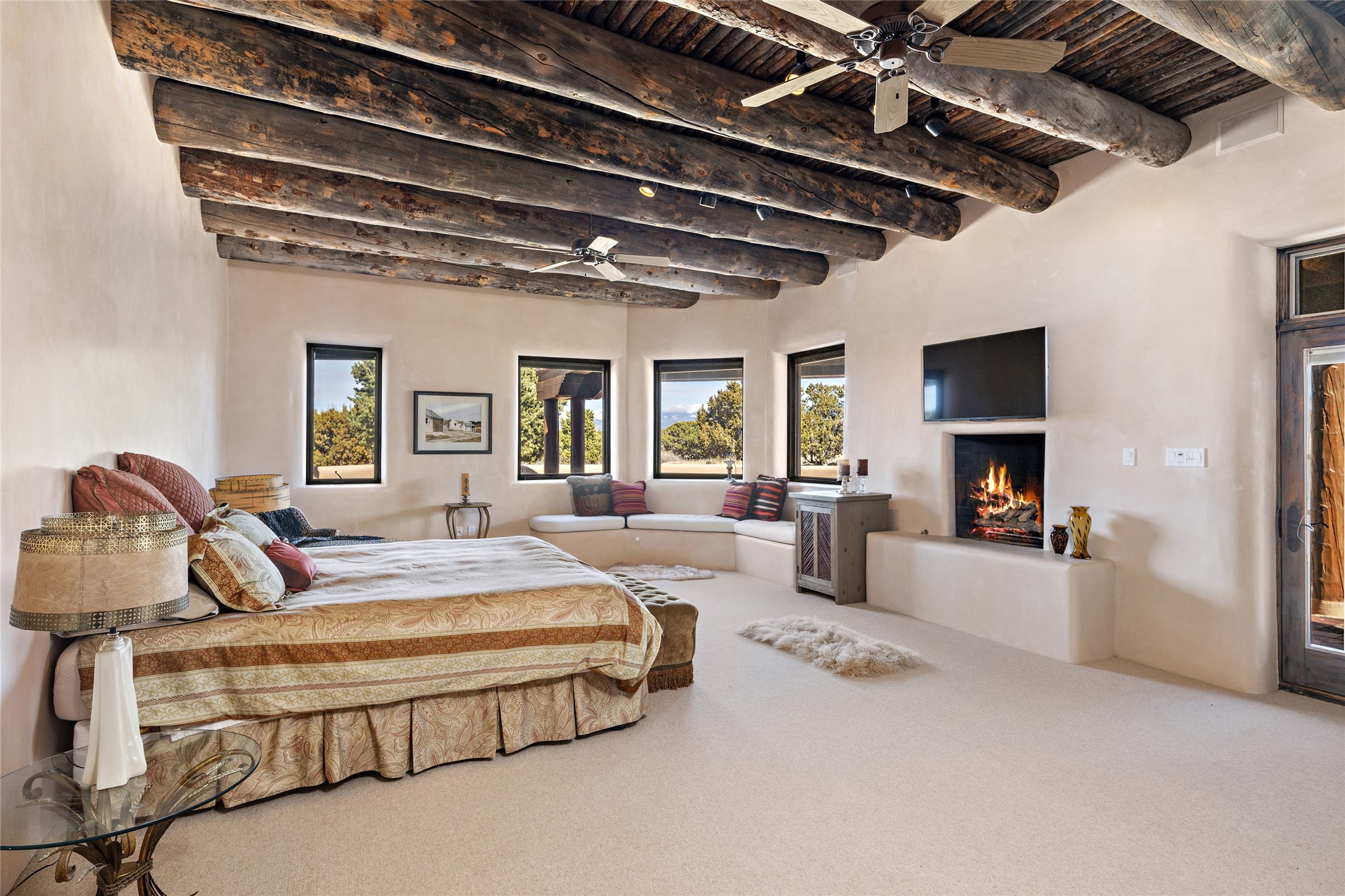 This Las Campanas Estates III property is not only located directly across from the lake and 3rd and 4th fairway of the Sunrise Golf Course but is situated to enjoy spectacular views of the Sangre de Cristo and Jemez Mountains. A 2-acre parcel allows for both privacy and plenty of green space around the 4,436 sq. ft. floor plan. Pumice Crete construction allows for massively thick walls and brings a stateliness to the overall design concept. 18 ft. diamond plaster walls support sweeping archways at the threshold of entries to the various living areas. Massive vigas form intervals between the variations in ceiling design used throughout the home - including latillas, coves and wood planks. Master tri-color brickwork inlaid in a herringbone pattern is one of several customizations influenced by regional architecture. Others include built-in Sombraje cabinetry, kiva fireplaces, and nicho-styled ledges and shelving. Numerous skylights, extra-large windows and glass-paneled doors facilitate the maximum absorption of the brilliant New Mexico light and the area's superb views. Recent upgrades include the installation of high-speed broadband cable, Smart home and Nexia remote-controlled features, a new roof with a 12 yr. warranty, new UV glass skylights, new Stucco work, a new aluminum and glass paneled garage door, recent high end appliances and extensive landscaping. Truly a showcase home offering comfort and luxury in a highly desirable and secure community.