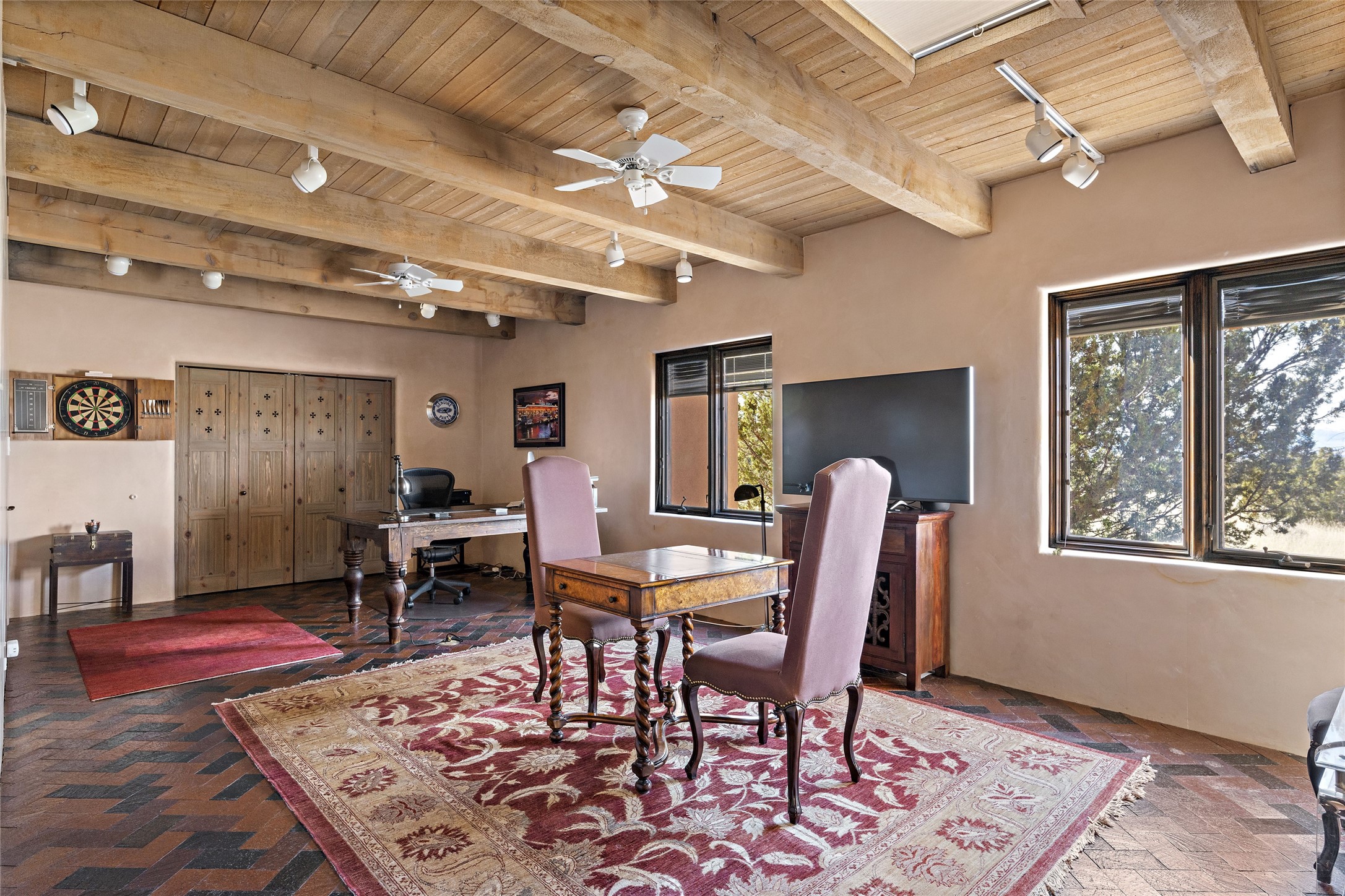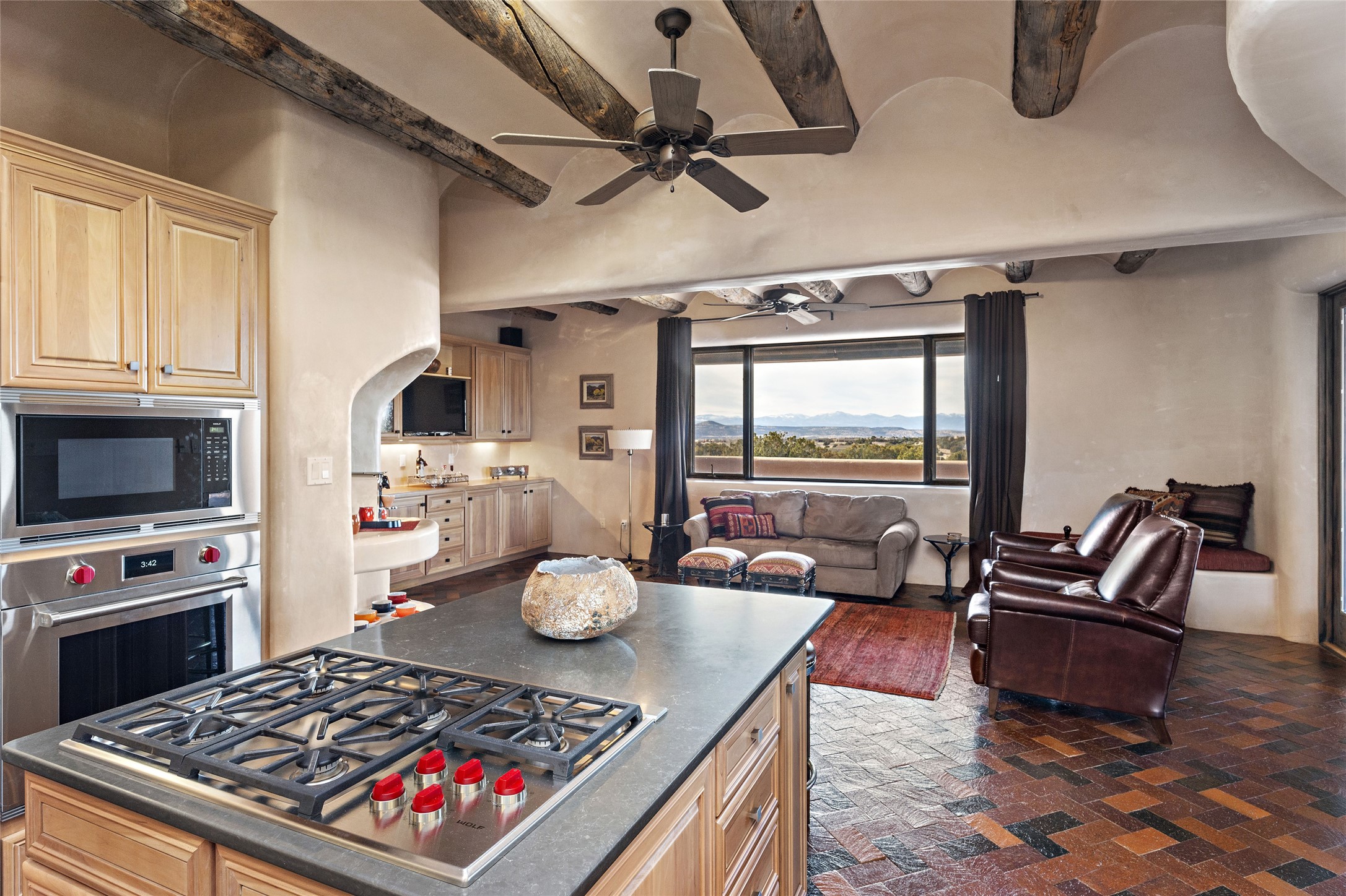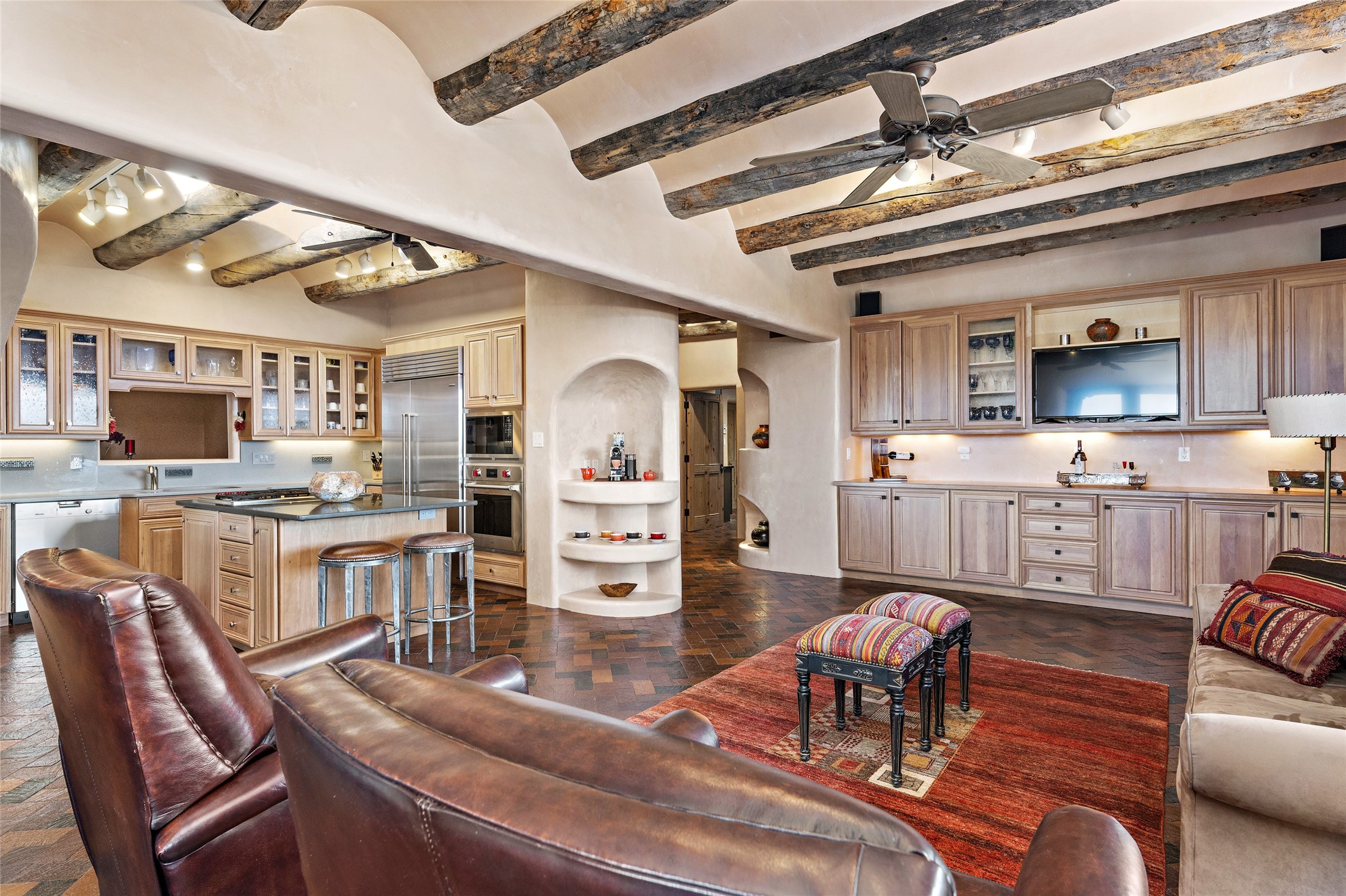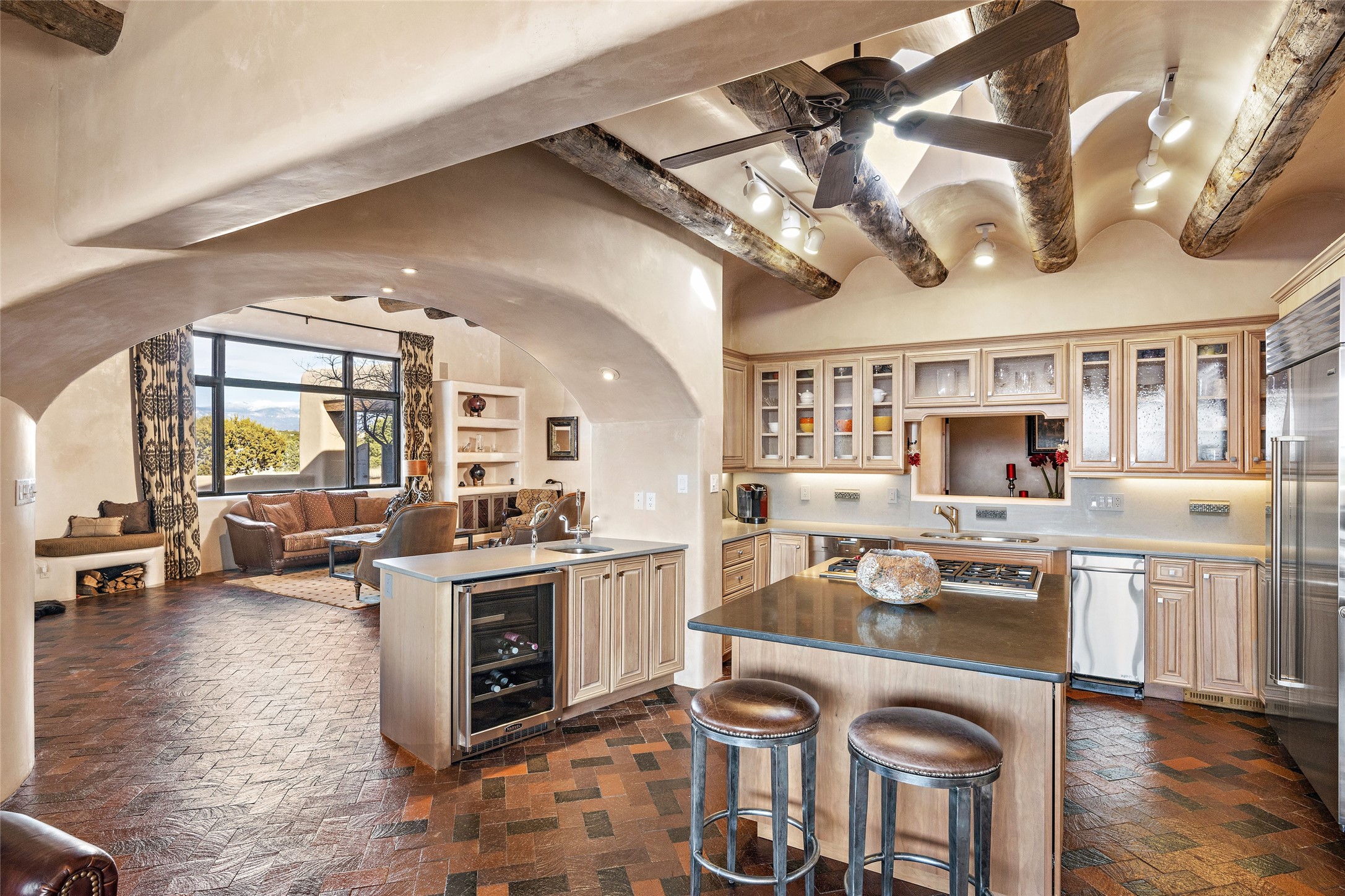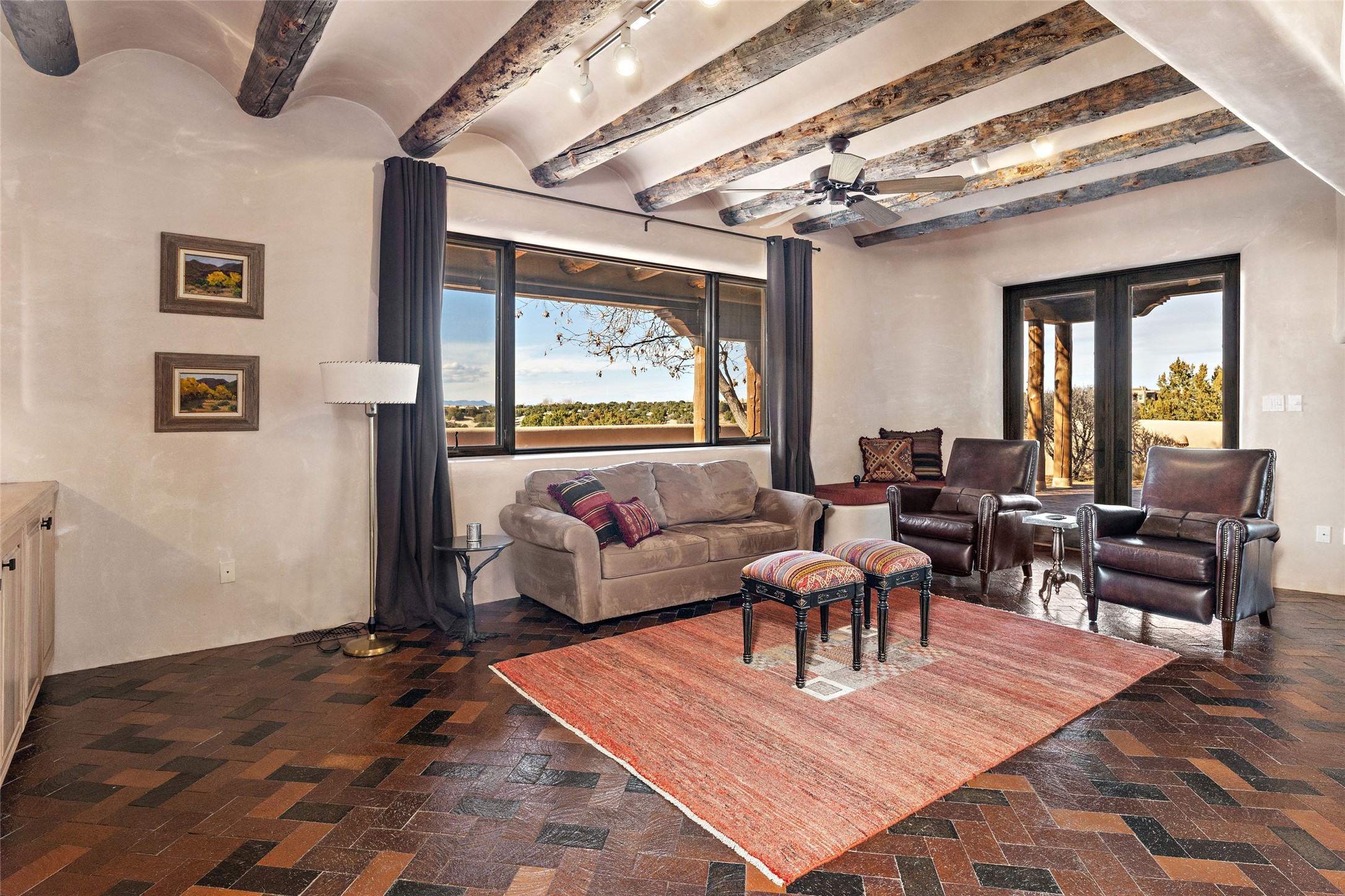 This Las Campanas Estates III property is not only located directly across from the lake and 3rd and 4th fairway of the Sunrise Golf Course but is situated to enjoy spectacular views of the Sangre de Cristo and Jemez Mountains. A 2-acre parcel allows for both privacy and plenty of green space around the 4,436 sq. ft. floor plan. Pumice Crete construction allows for massively thick walls and brings a stateliness to the overall design concept. 18 ft. diamond plaster walls support sweeping archways at the threshold of entries to the various living areas. Massive vigas form intervals between the variations in ceiling design used throughout the home - including latillas, coves and wood planks. Master tri-color brickwork inlaid in a herringbone pattern is one of several customizations influenced by regional architecture. Others include built-in Sombraje cabinetry, kiva fireplaces, and nicho-styled ledges and shelving. Numerous skylights, extra-large windows and glass-paneled doors facilitate the maximum absorption of the brilliant New Mexico light and the area's superb views. Recent upgrades include the installation of high-speed broadband cable, Smart home and Nexia remote-controlled features, a new roof with a 12 yr. warranty, new UV glass skylights, new Stucco work, a new aluminum and glass paneled garage door, recent high end appliances and extensive landscaping. Truly a showcase home offering comfort and luxury in a highly desirable and secure community.