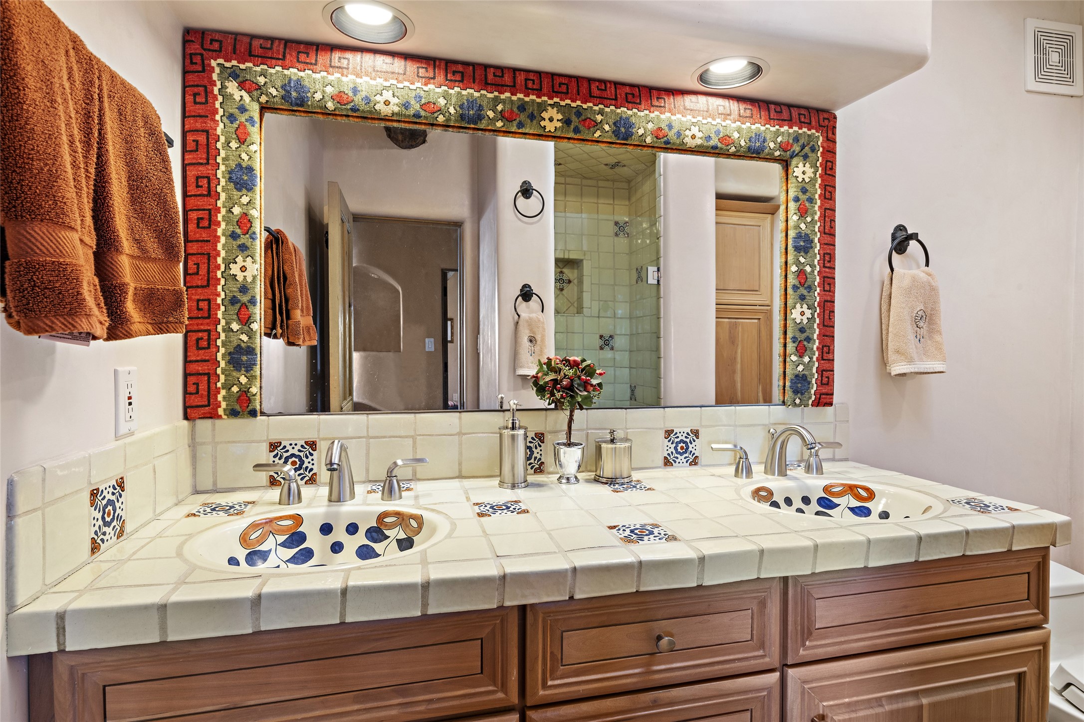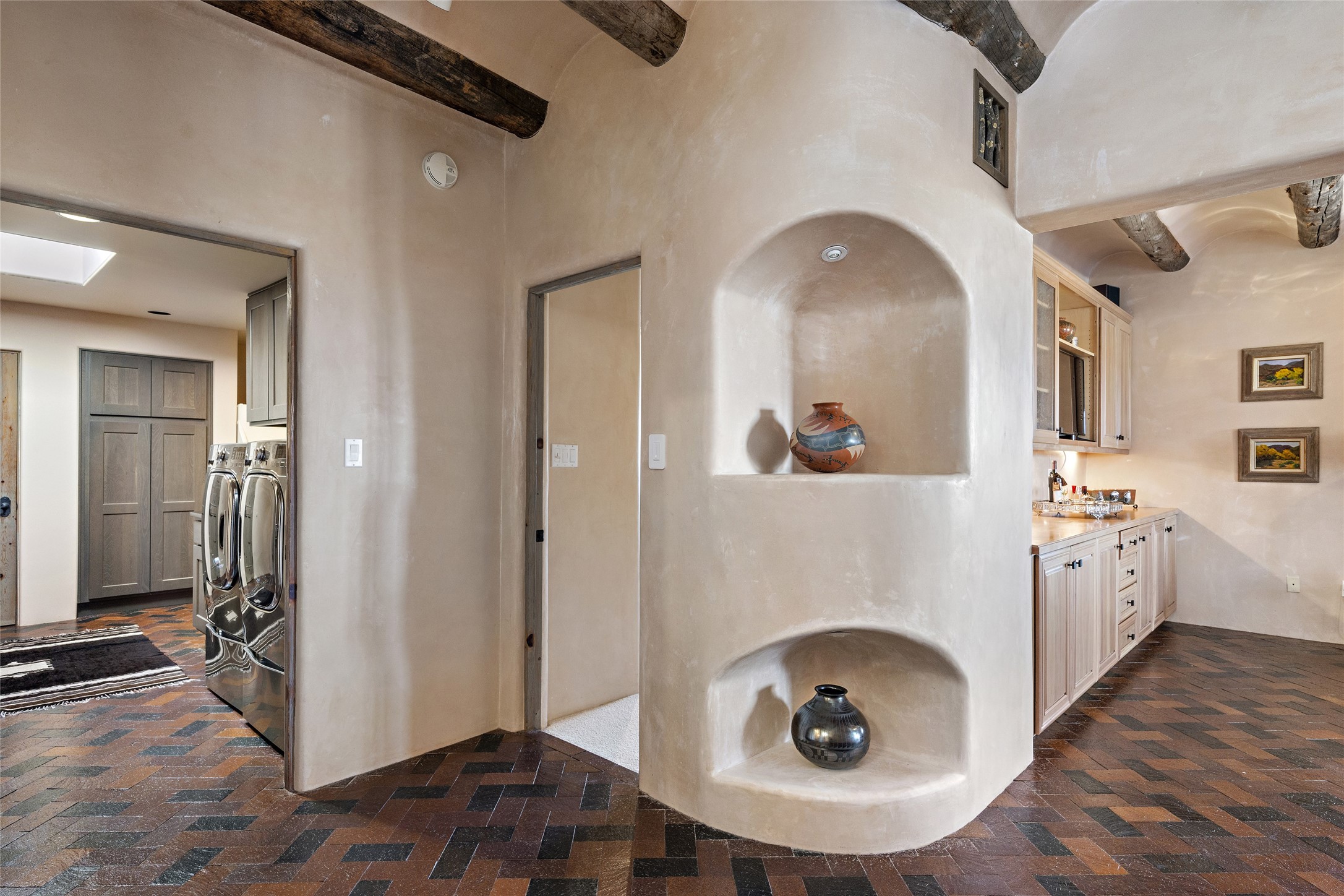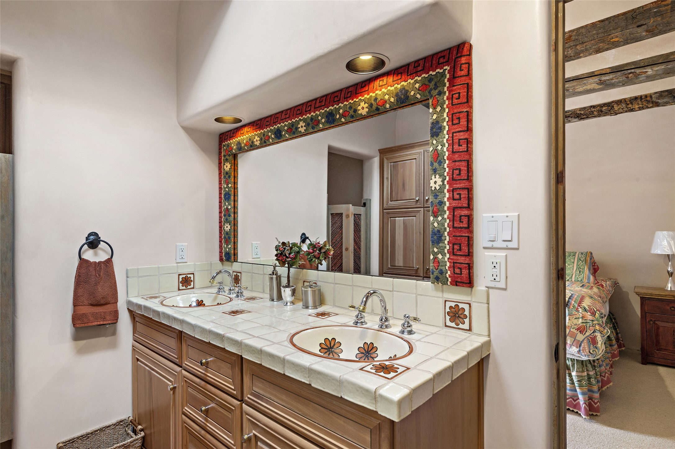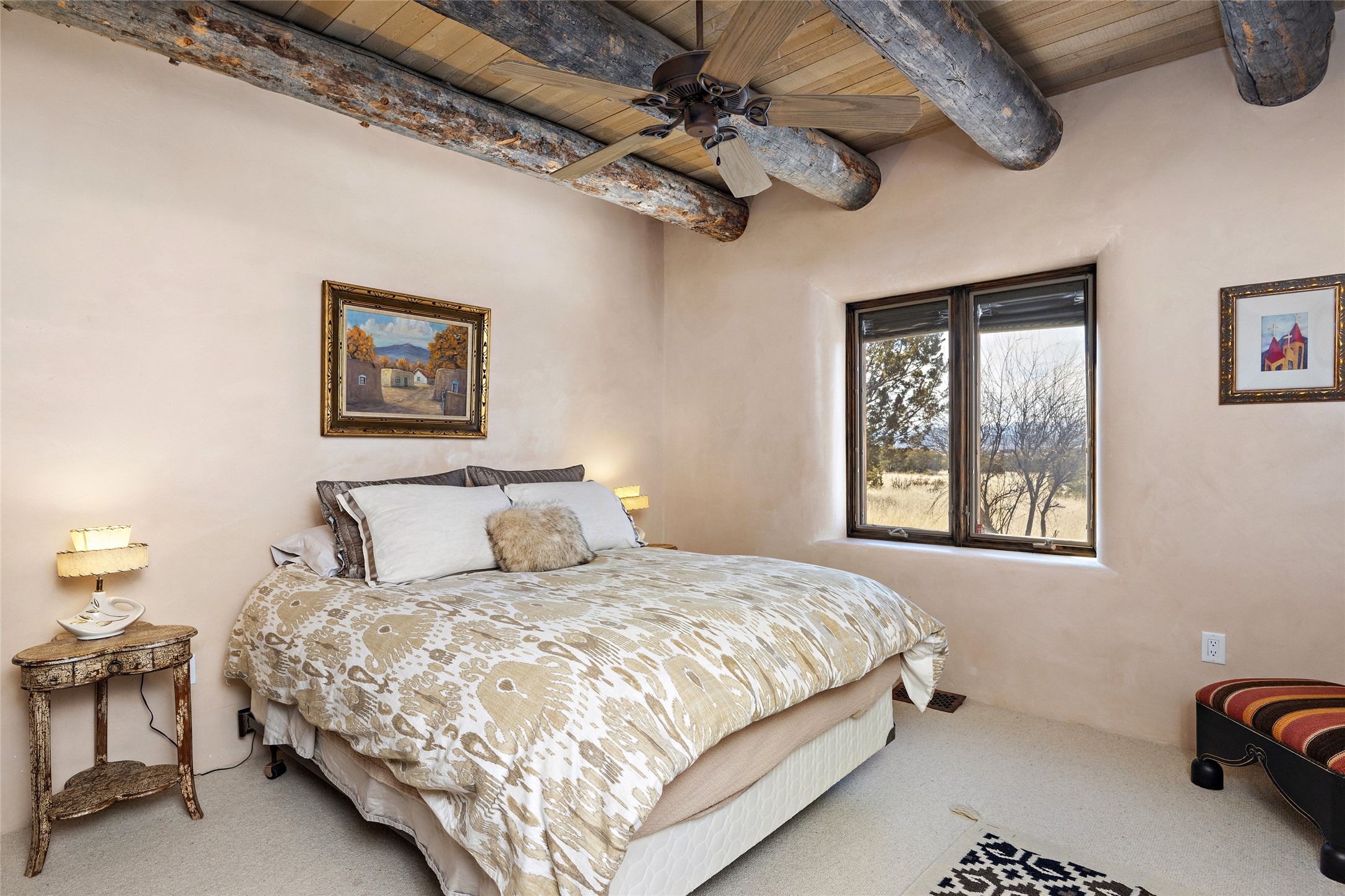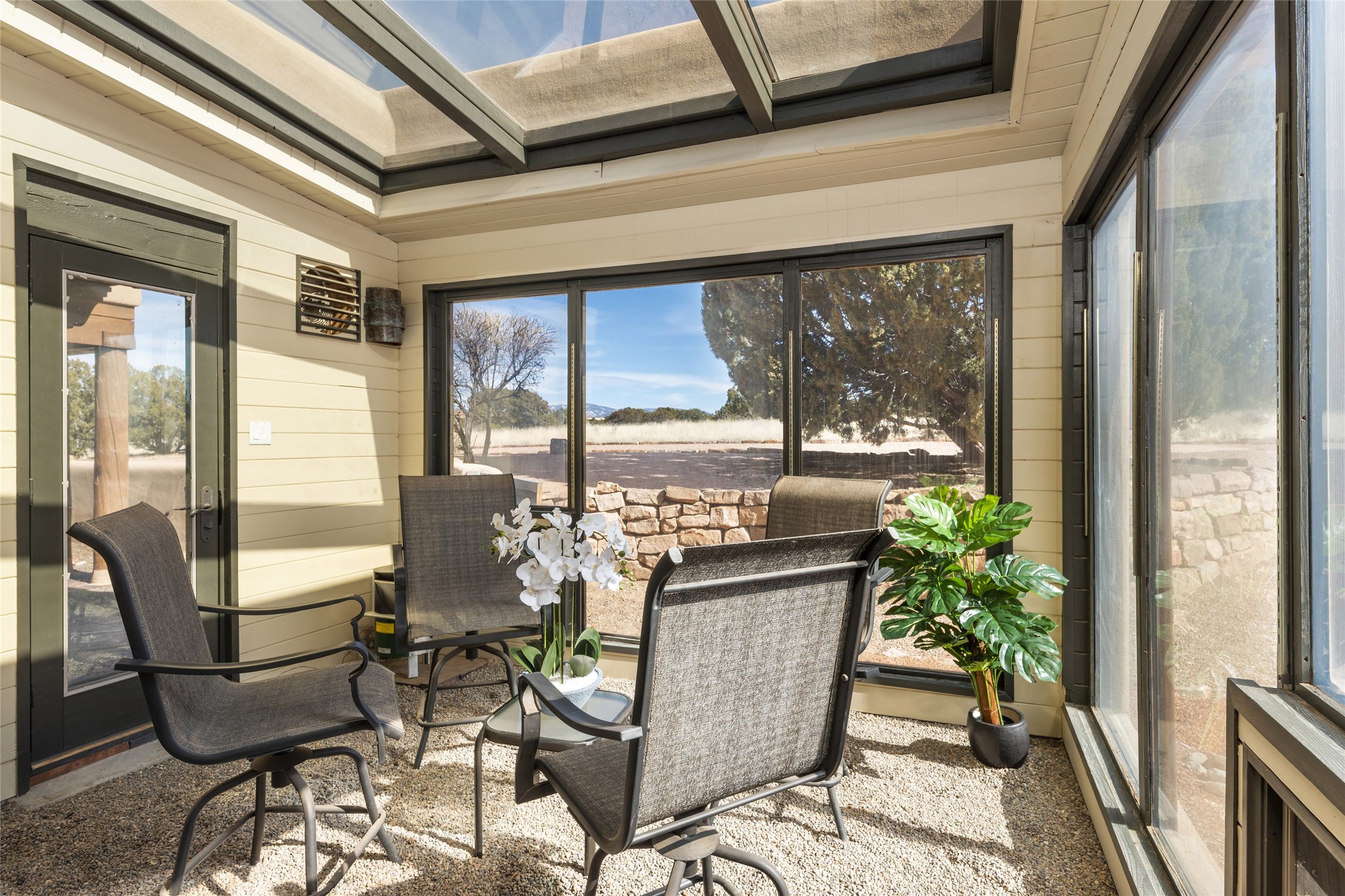 This Las Campanas Estates III property is not only located directly across from the lake and 3rd and 4th fairway of the Sunrise Golf Course but is situated to enjoy spectacular views of the Sangre de Cristo and Jemez Mountains. A 2-acre parcel allows for both privacy and plenty of green space around the 4,436 sq. ft. floor plan. Pumice Crete construction allows for massively thick walls and brings a stateliness to the overall design concept. 18 ft. diamond plaster walls support sweeping archways at the threshold of entries to the various living areas. Massive vigas form intervals between the variations in ceiling design used throughout the home - including latillas, coves and wood planks. Master tri-color brickwork inlaid in a herringbone pattern is one of several customizations influenced by regional architecture. Others include built-in Sombraje cabinetry, kiva fireplaces, and nicho-styled ledges and shelving. Numerous skylights, extra-large windows and glass-paneled doors facilitate the maximum absorption of the brilliant New Mexico light and the area's superb views. Recent upgrades include the installation of high-speed broadband cable, Smart home and Nexia remote-controlled features, a new roof with a 12 yr. warranty, new UV glass skylights, new Stucco work, a new aluminum and glass paneled garage door, recent high end appliances and extensive landscaping. Truly a showcase home offering comfort and luxury in a highly desirable and secure community.